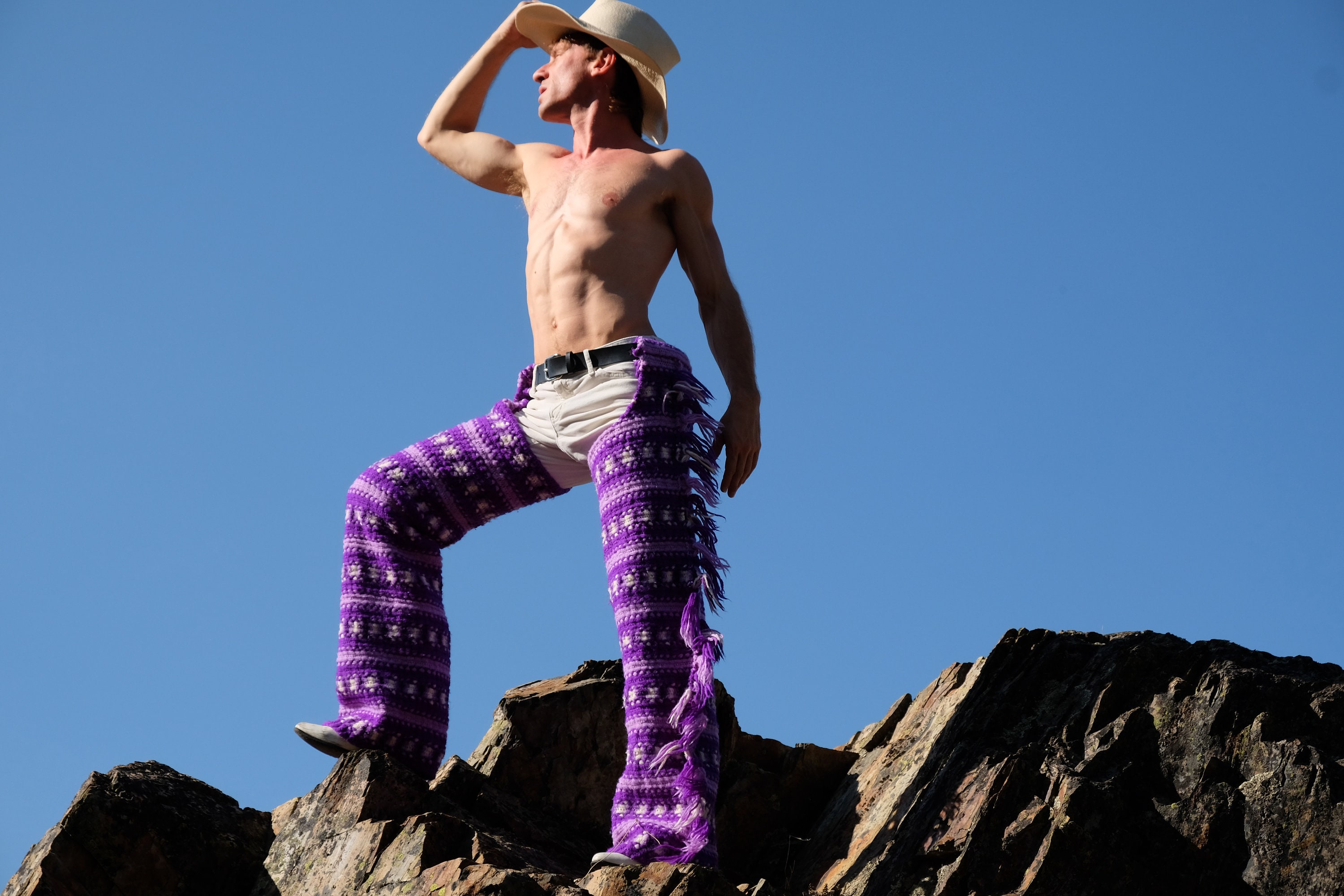 These are crochet chaps with purple and white stripes and fringe down the sides. Fashioned from a vintage afghan blanket crocheted in 100% felted wool.