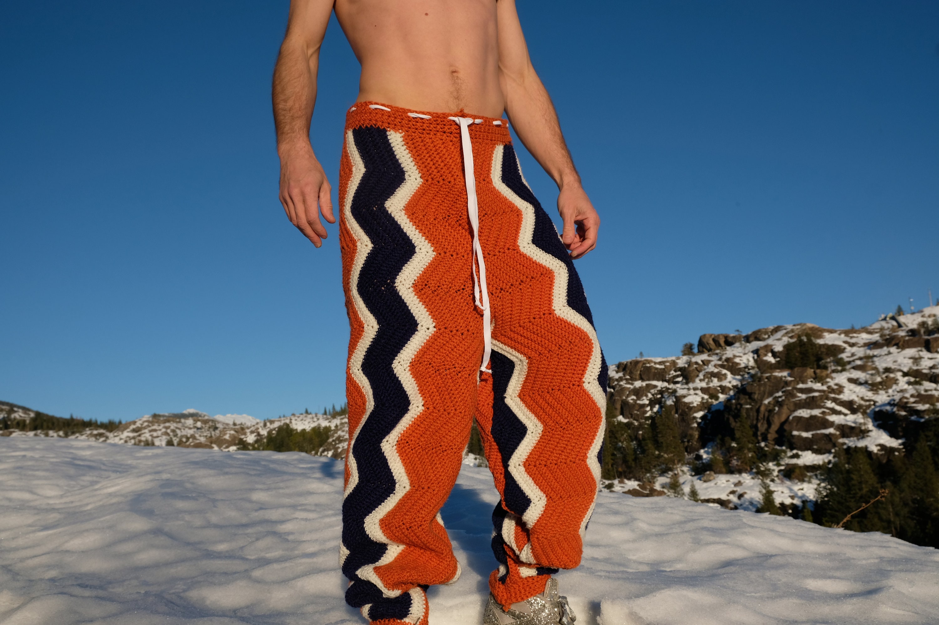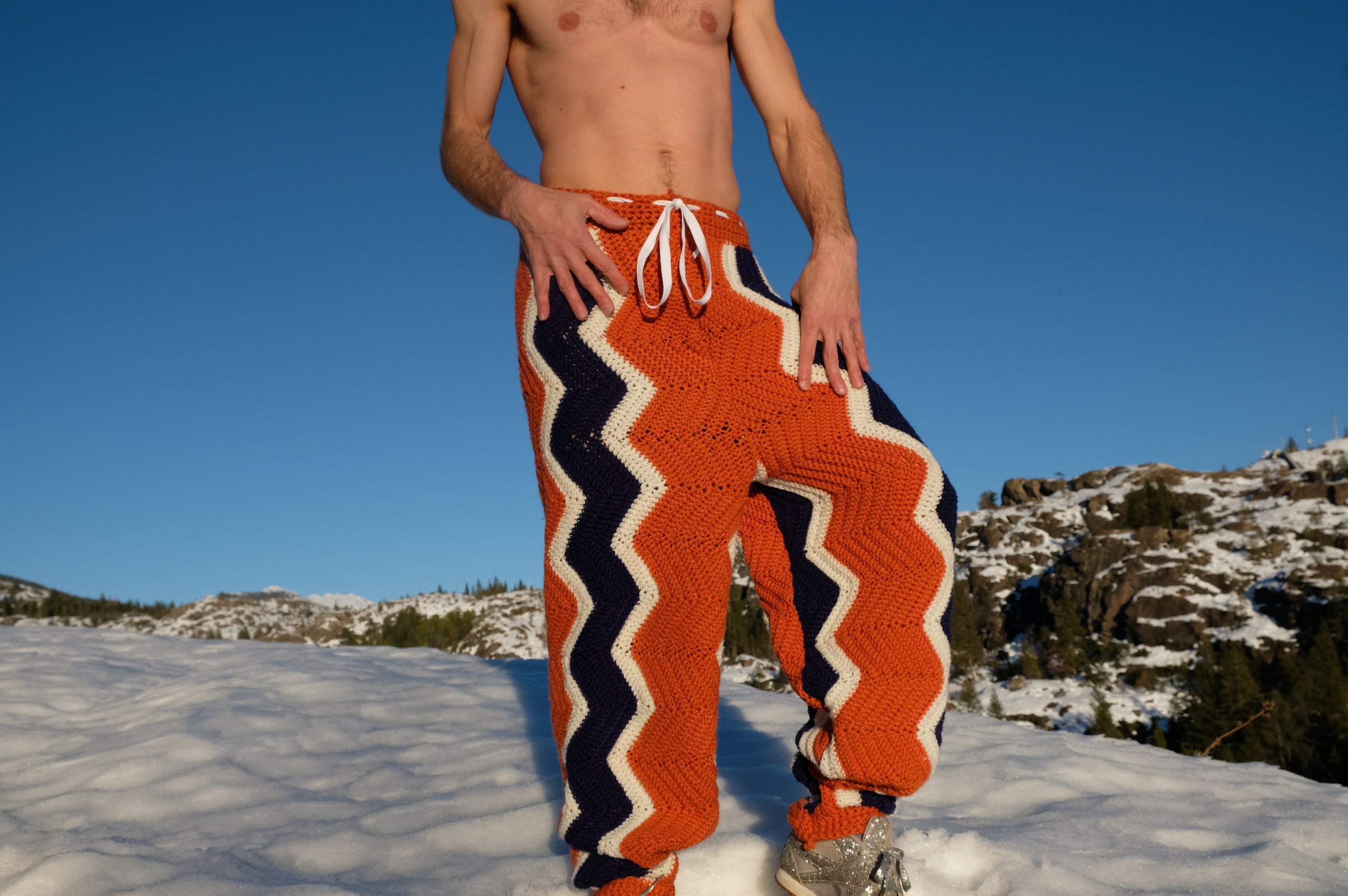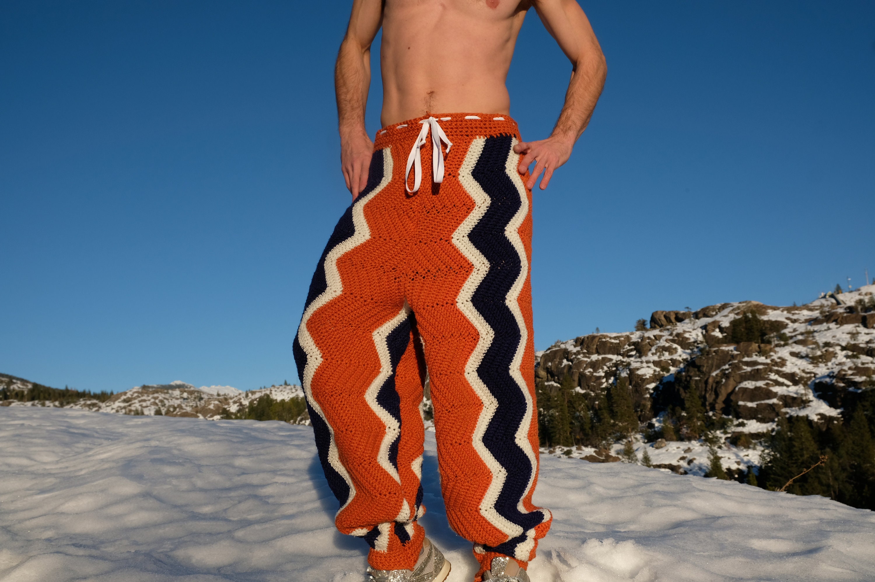 These are crochet pants with blue zigzag stripes on rust. Made from a vintage afghan blanket crocheted in 100% acrylic yarn.