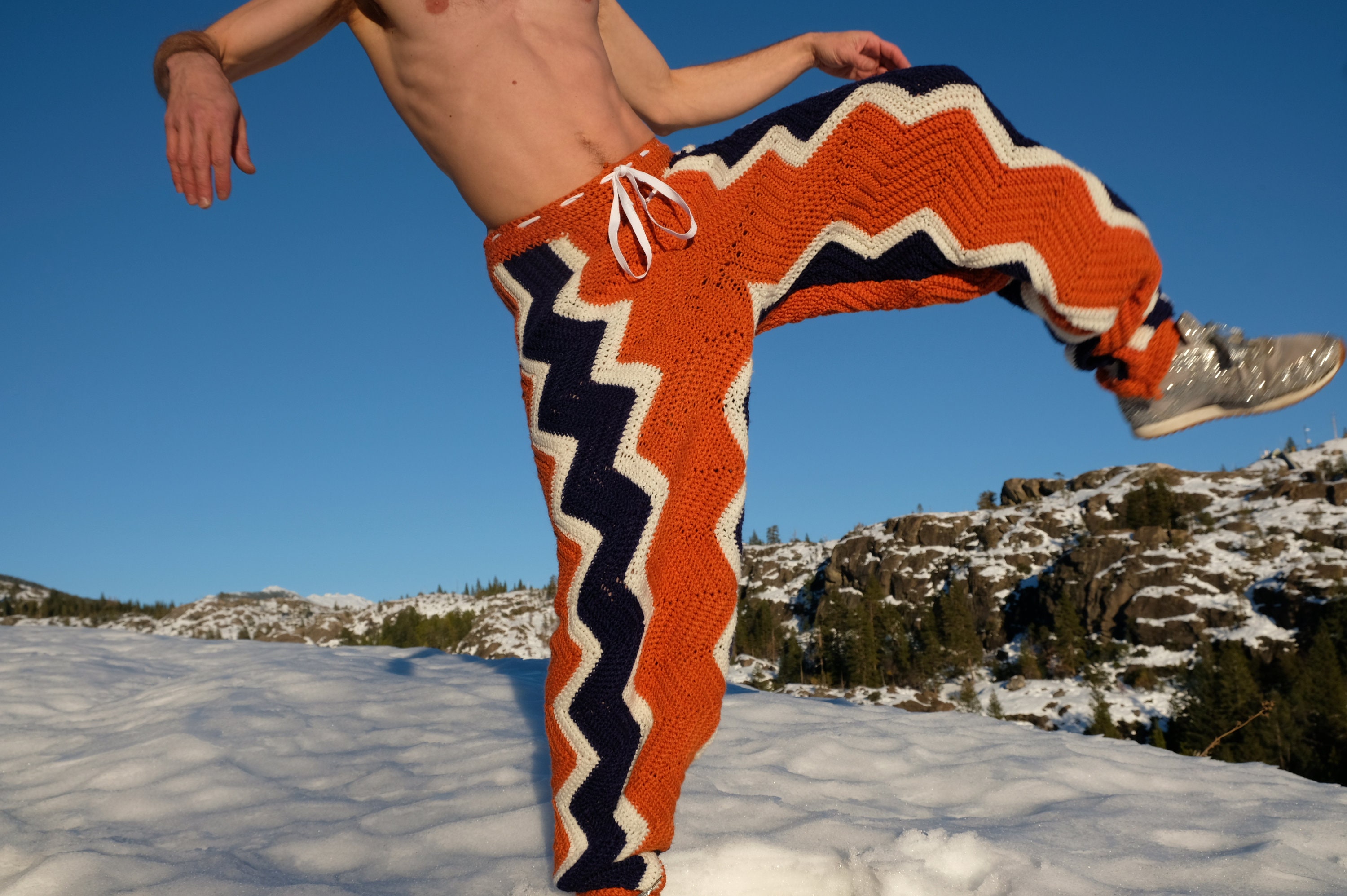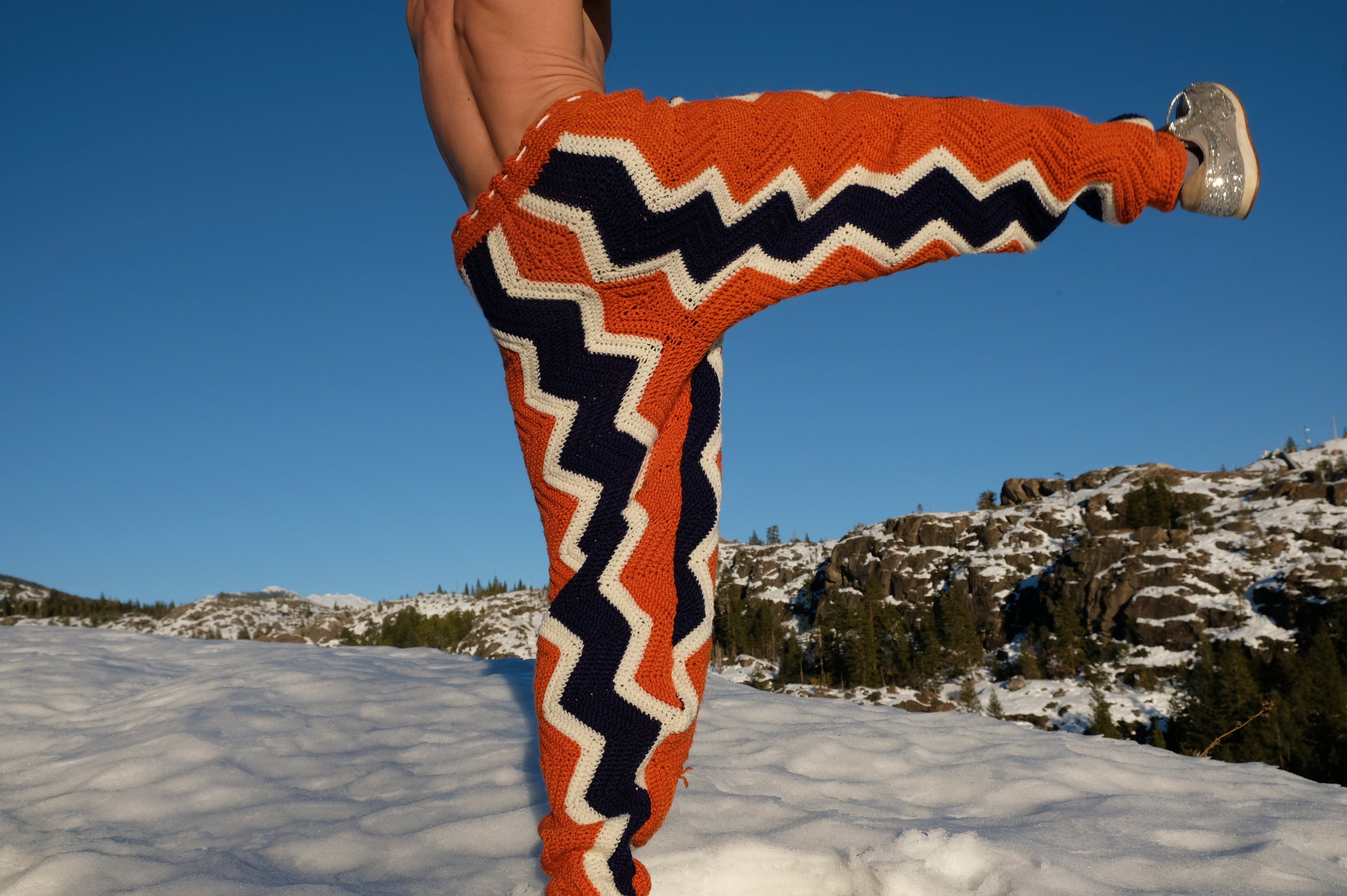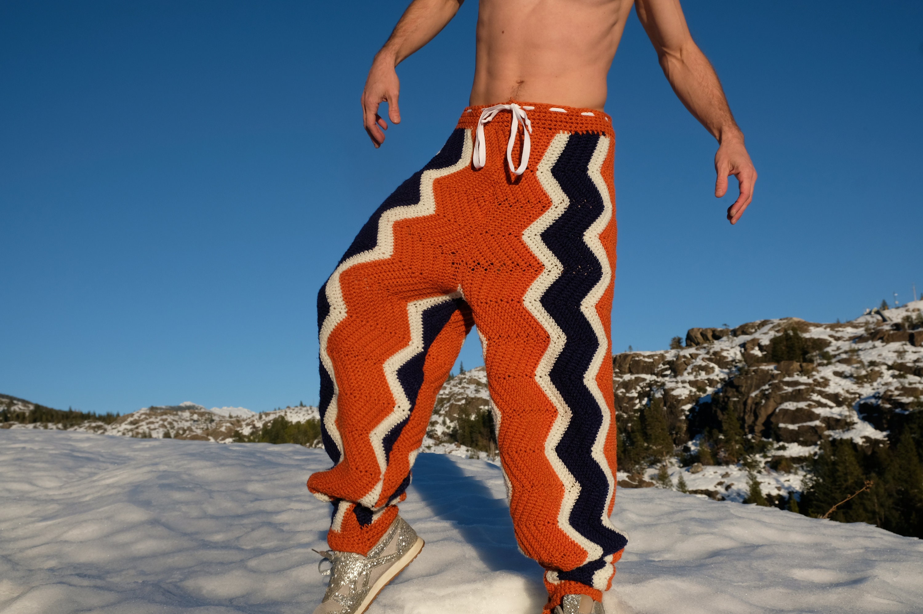 These are crochet pants with blue zigzag stripes on rust. Made from a vintage afghan blanket crocheted in 100% acrylic yarn.
