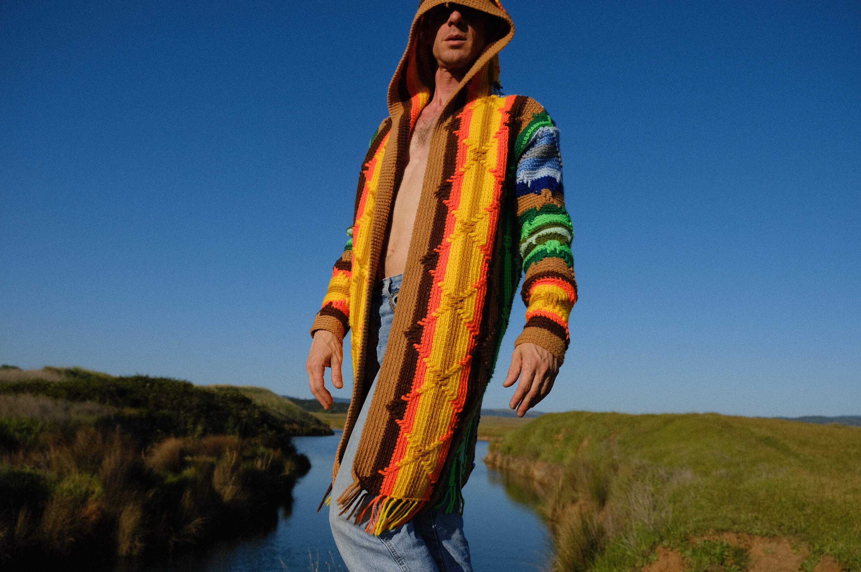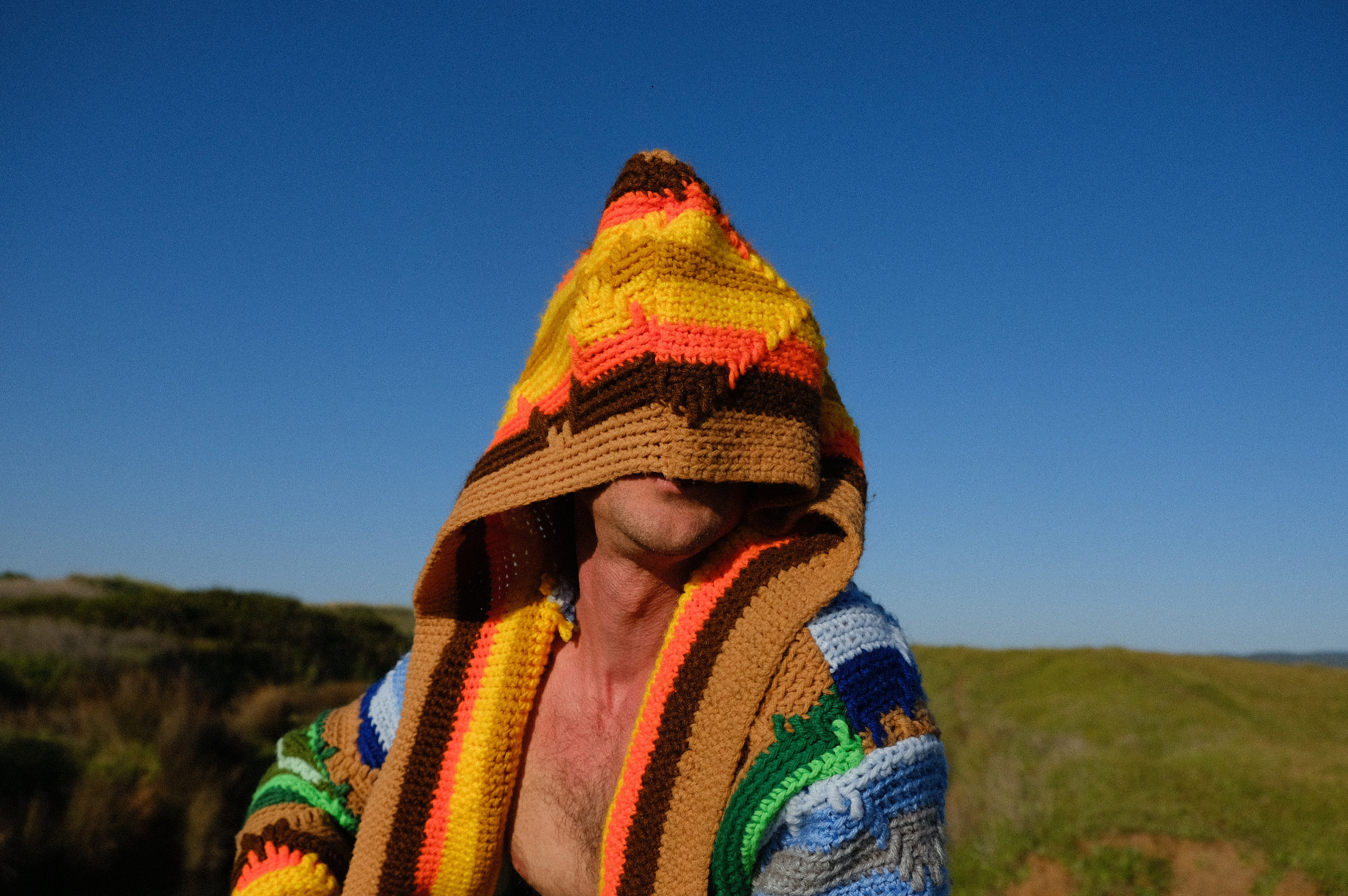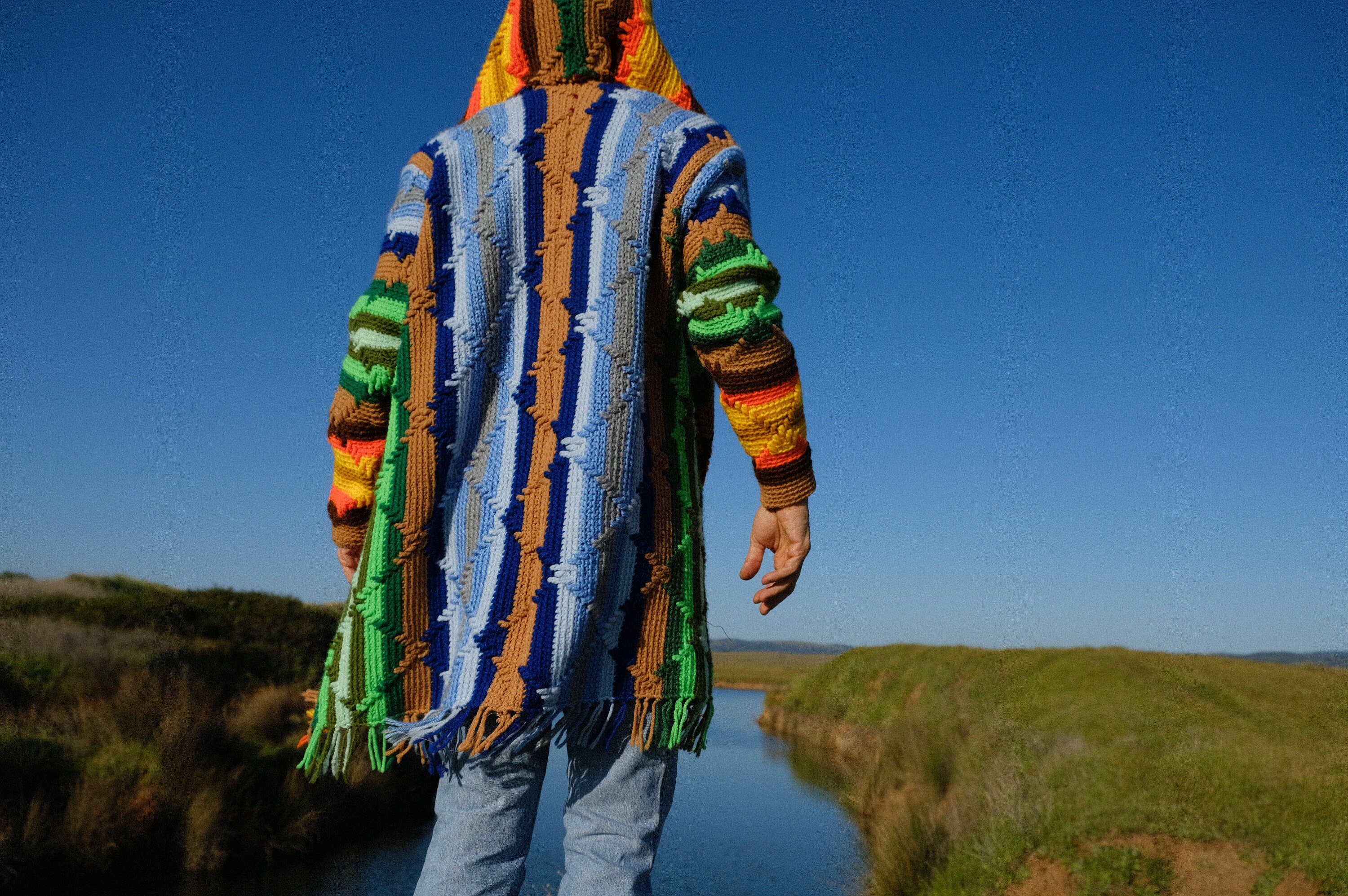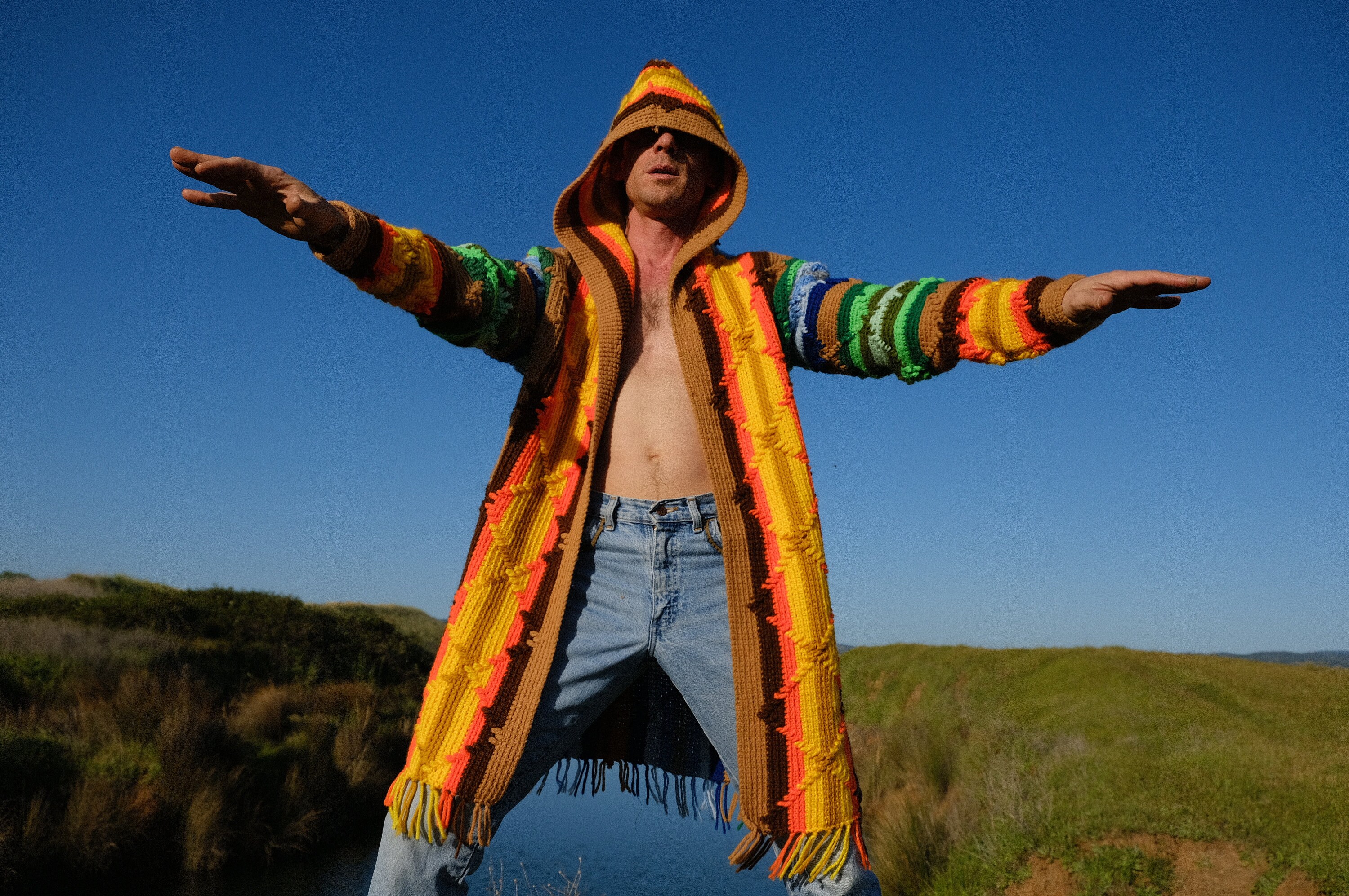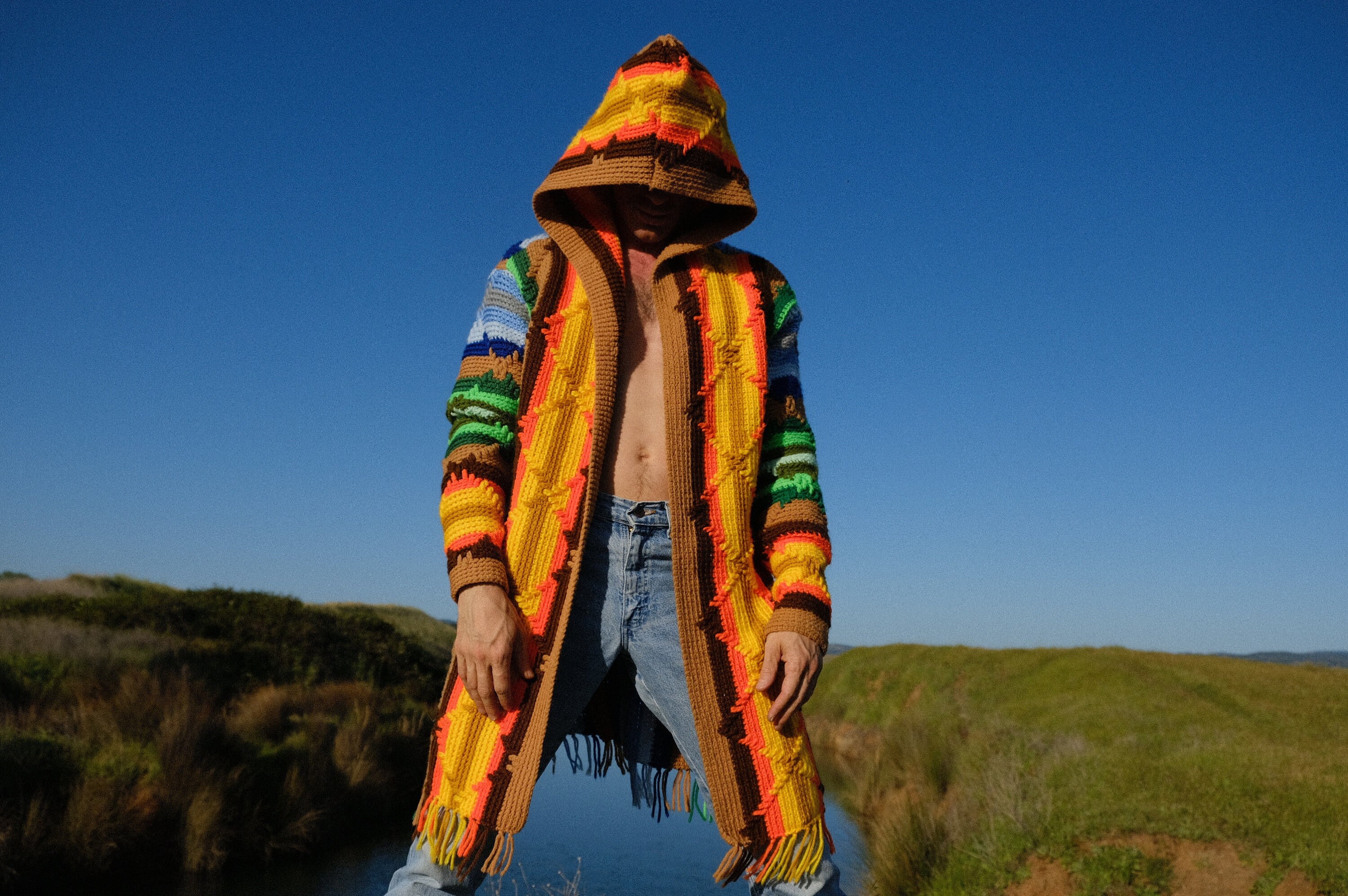 This is a crochet sweater-robe with rainbow stars and tassels at the sleeve. Beautifully up-cycled from an afghan blanket in 100% vintage wool, and hand tailored by yours truly, Lord von Schmitt.