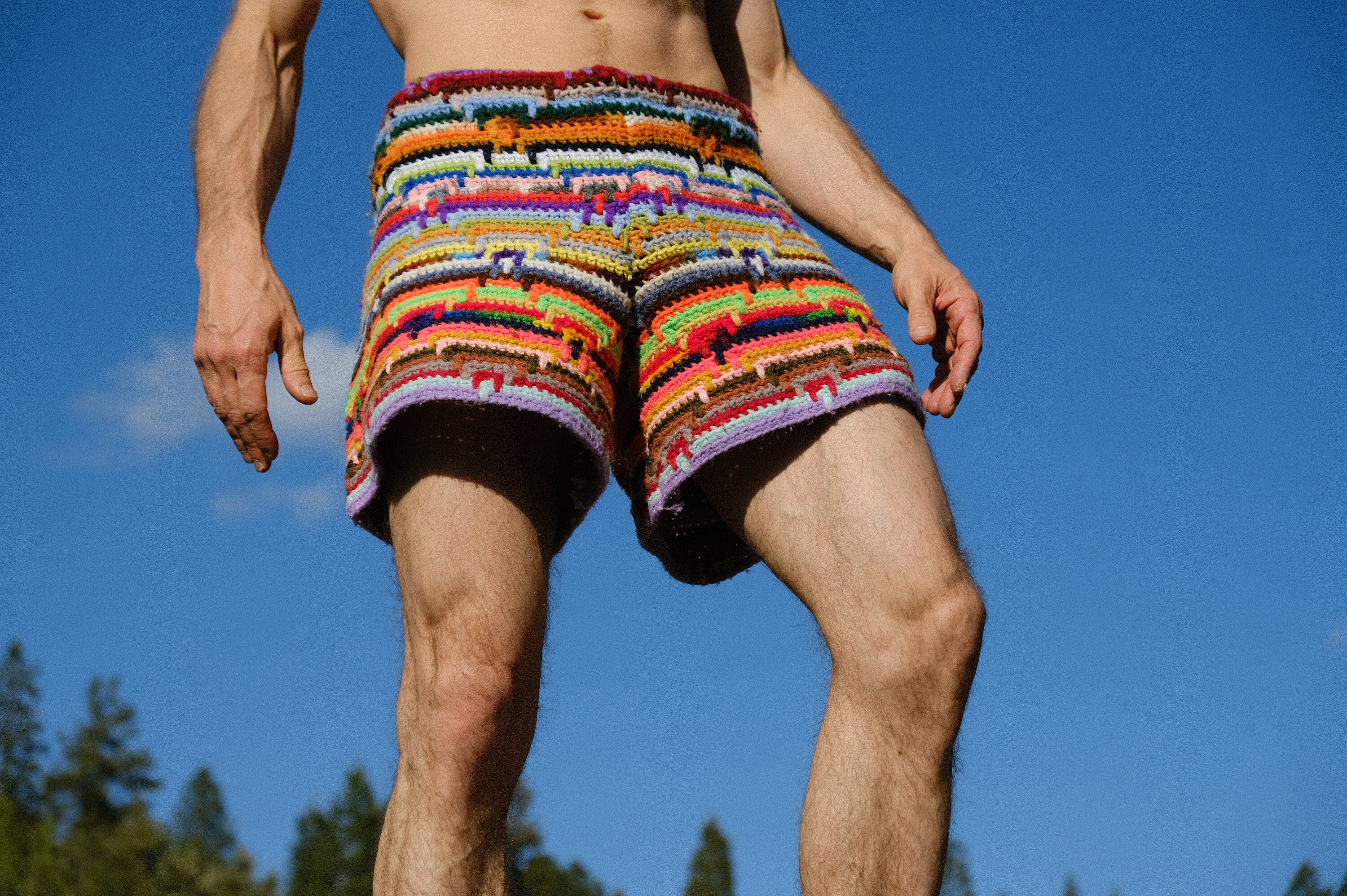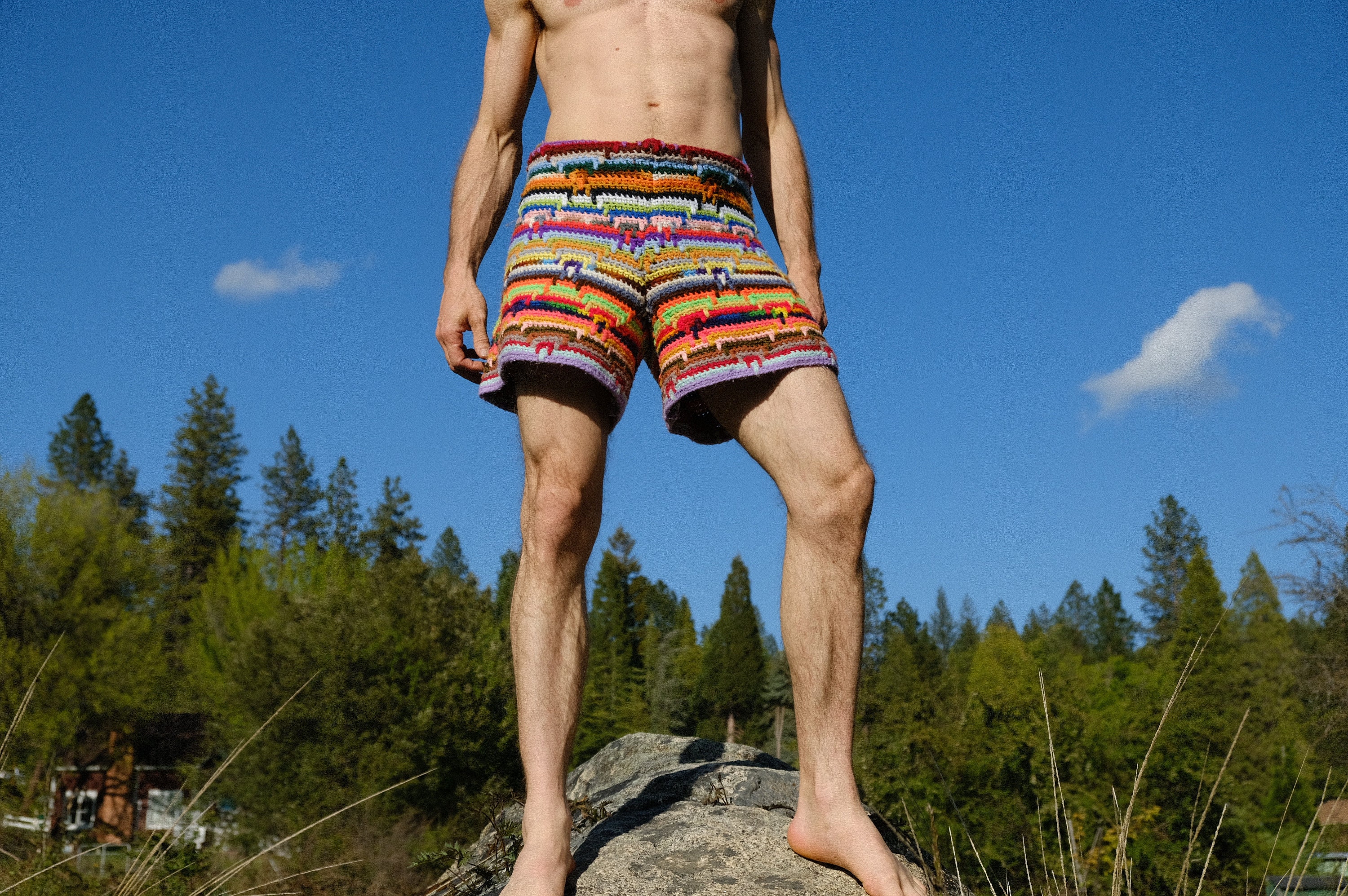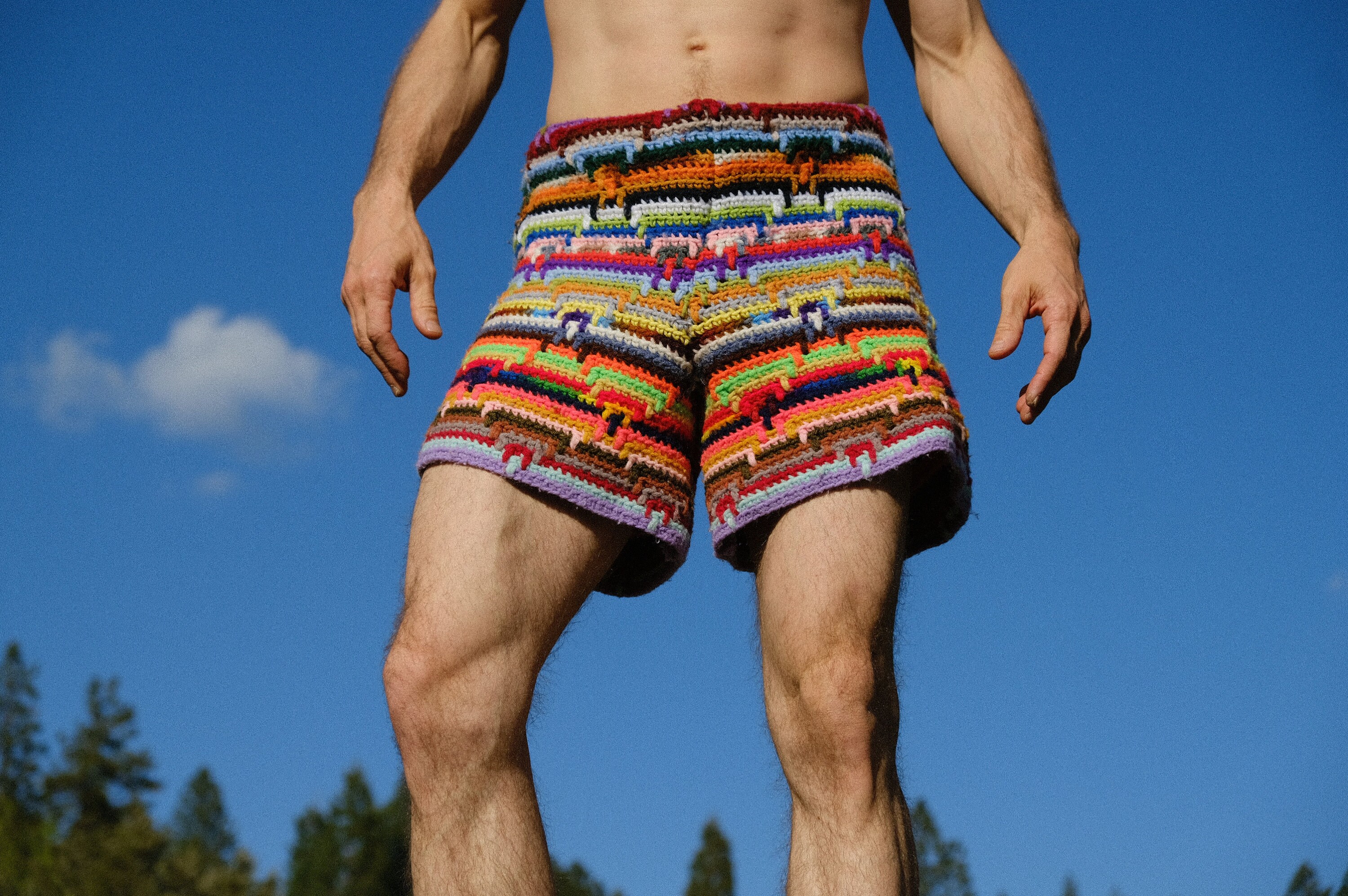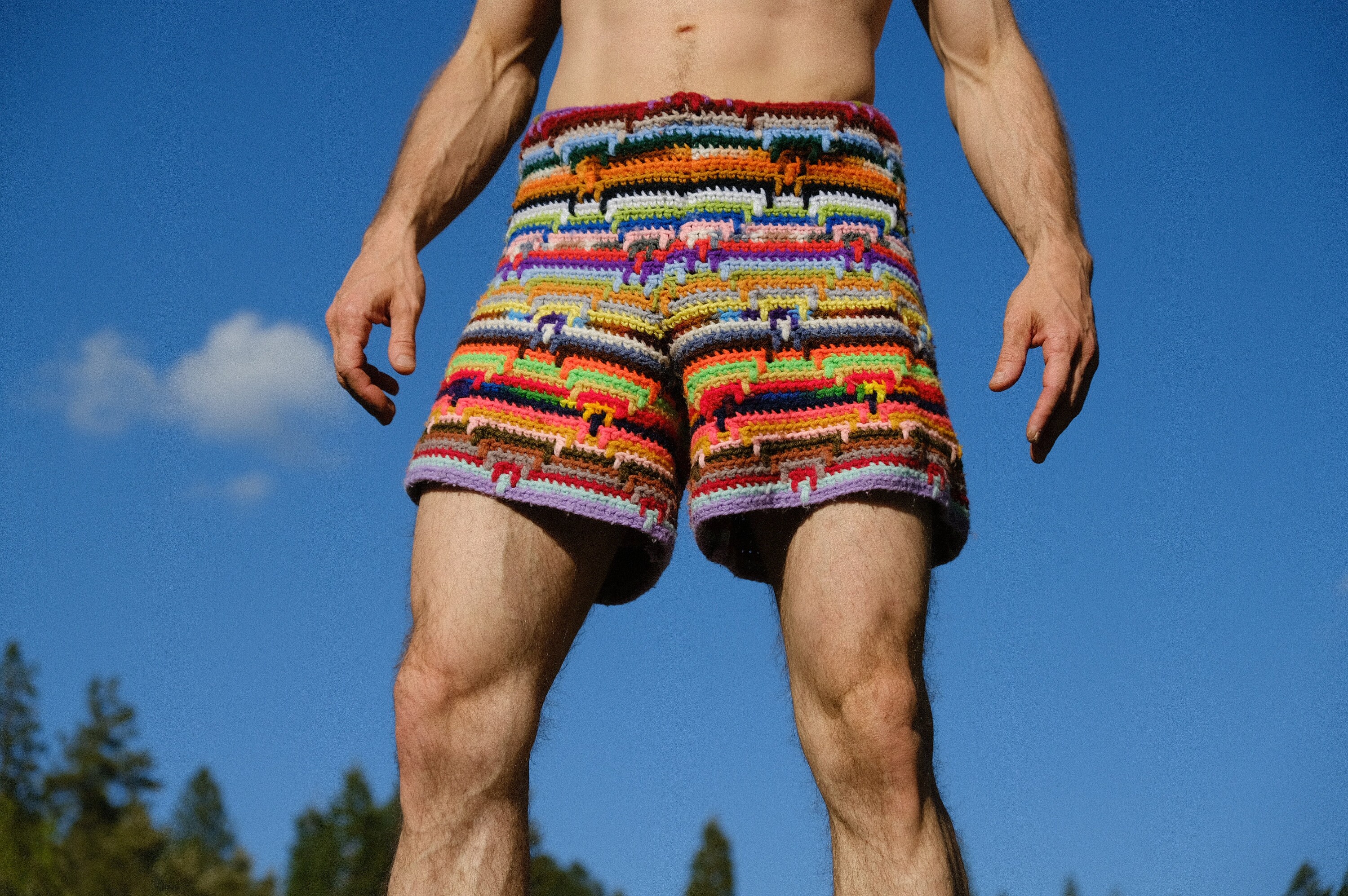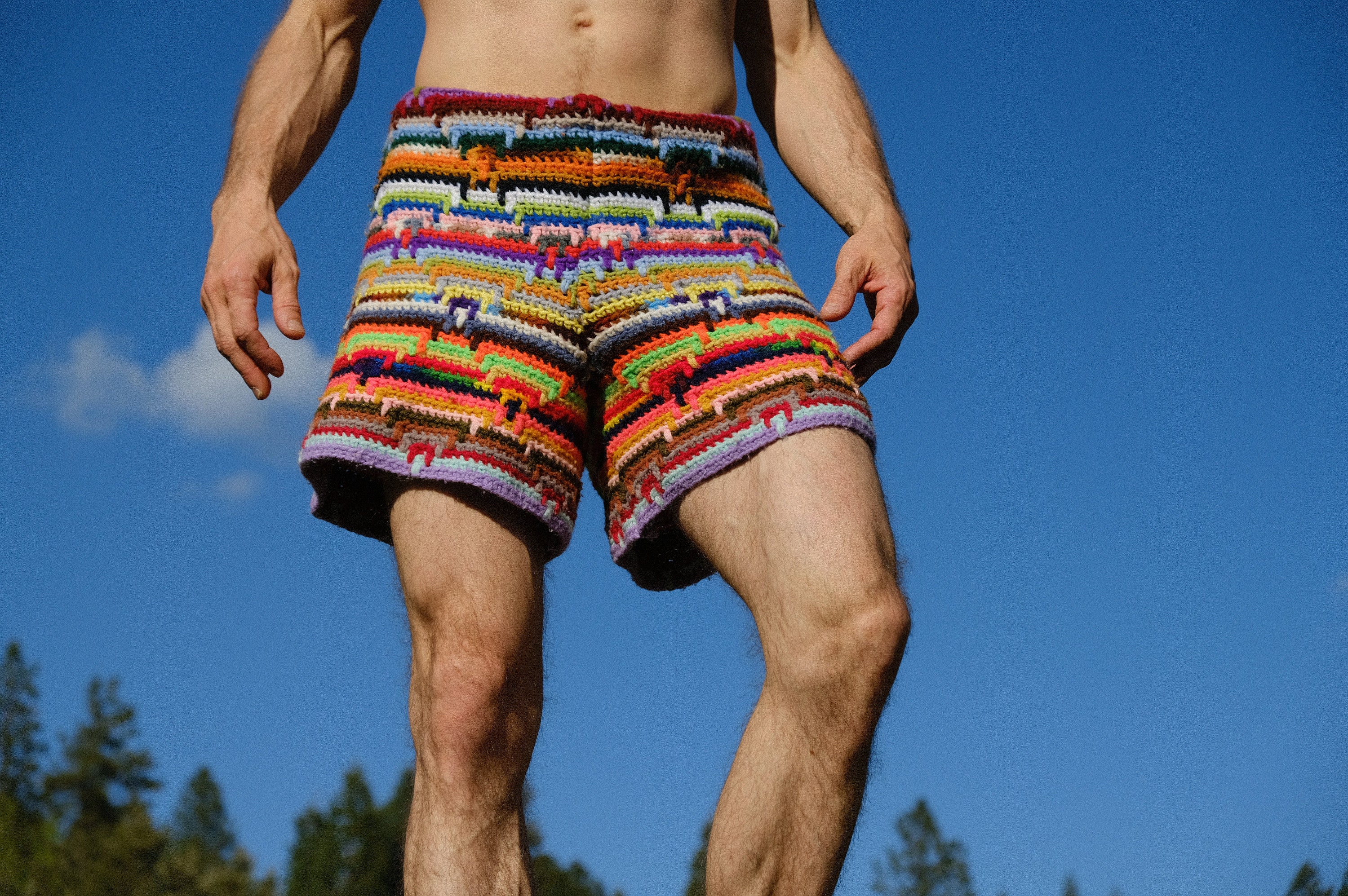 These are crochet shorts with multicolor stripes. Made from a vintage afghan blanket crocheted in in 100% acrylic yarn.