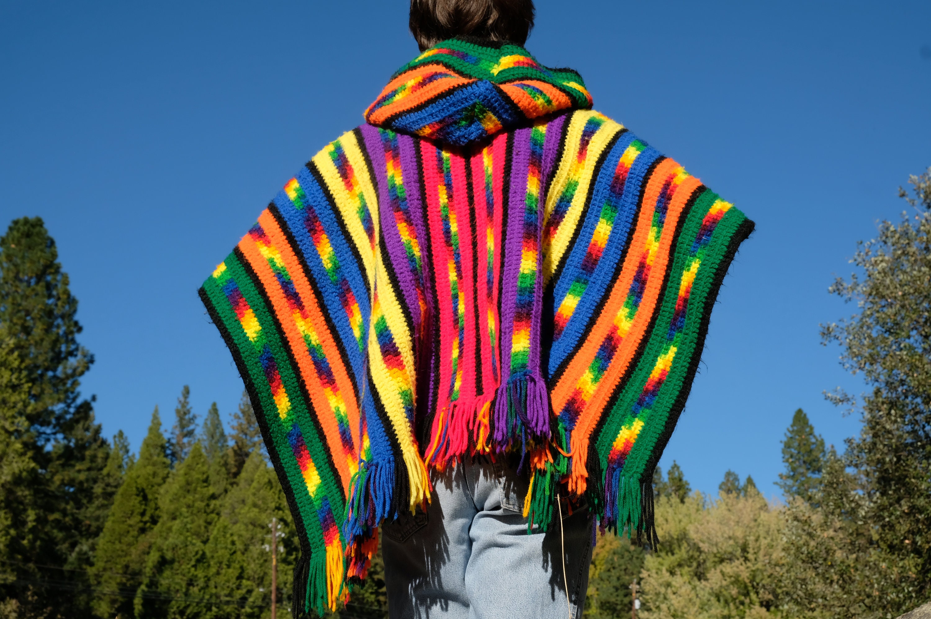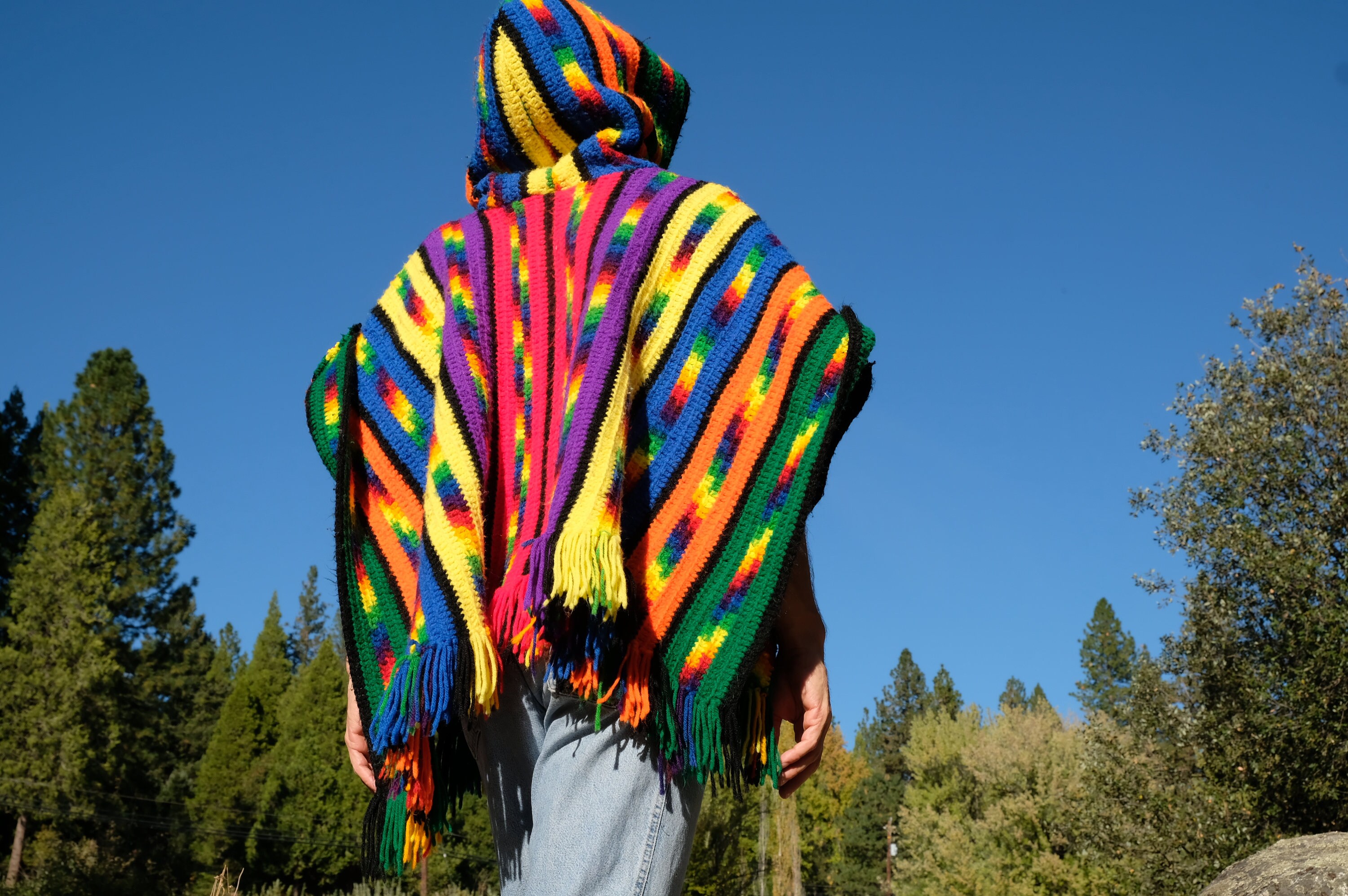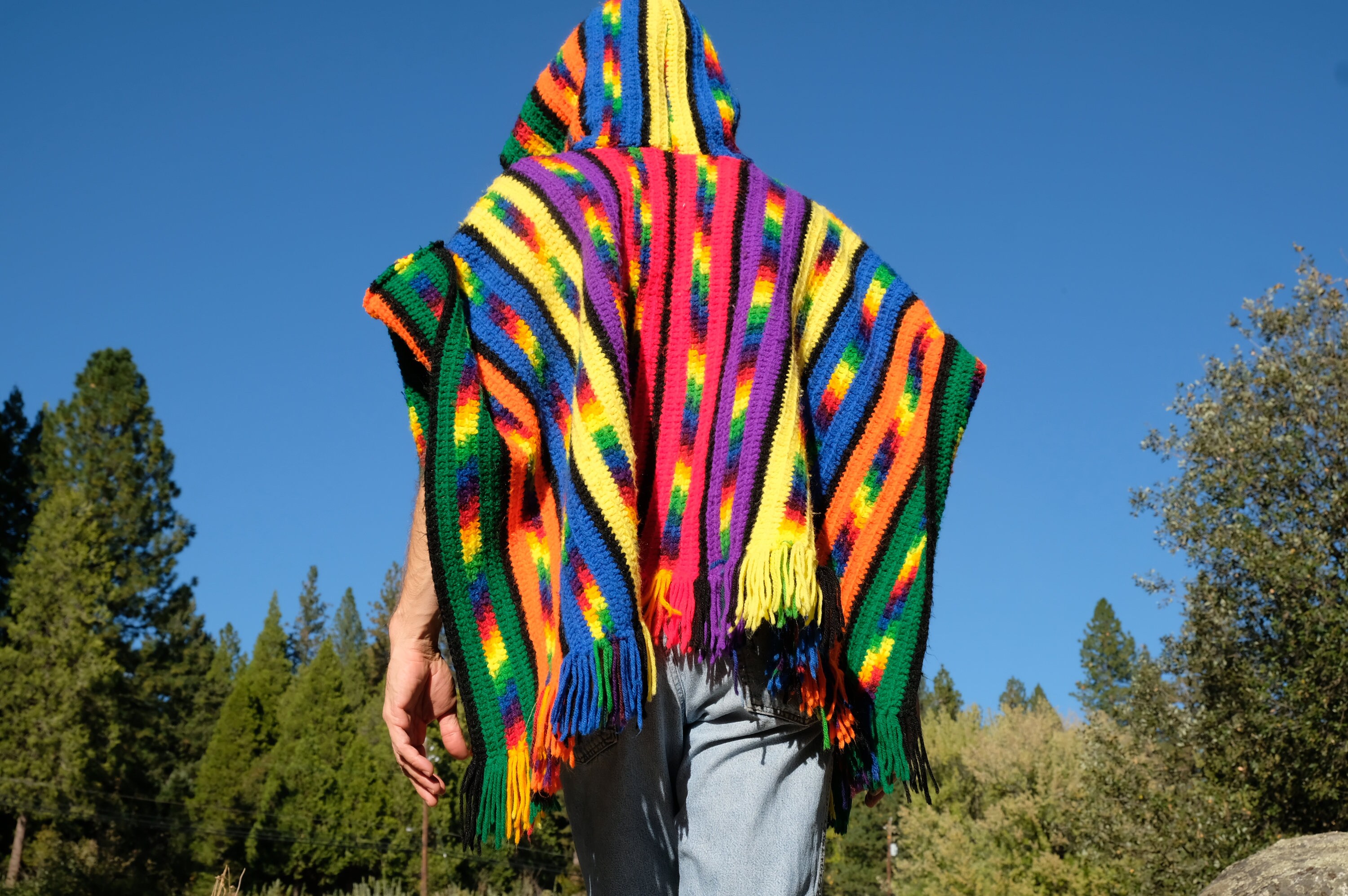 This is a soft and comfortable crochet poncho hoodie with rainbow stripes. Beautifully up-cycled from a vintage afghan blanket in 100% acrylic yarn, and exquisitely tailored by yours truly, Lord von Schmitt.