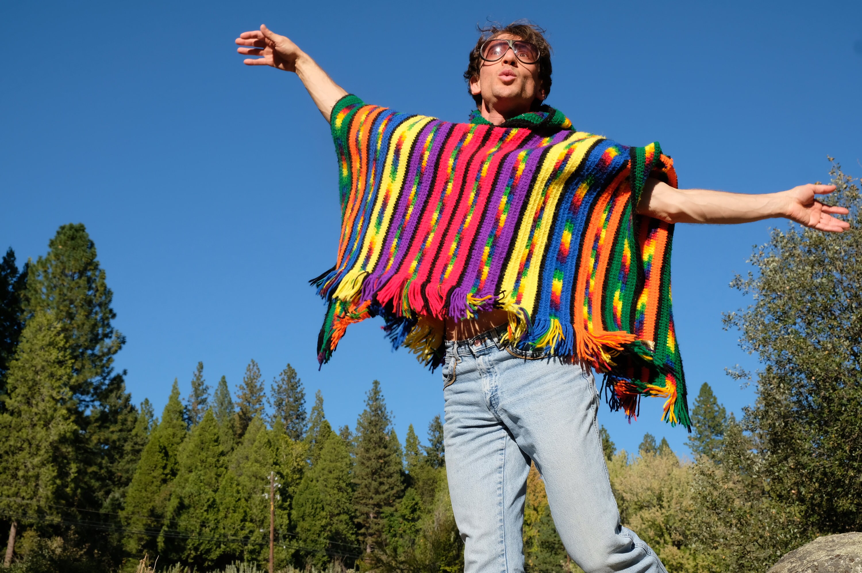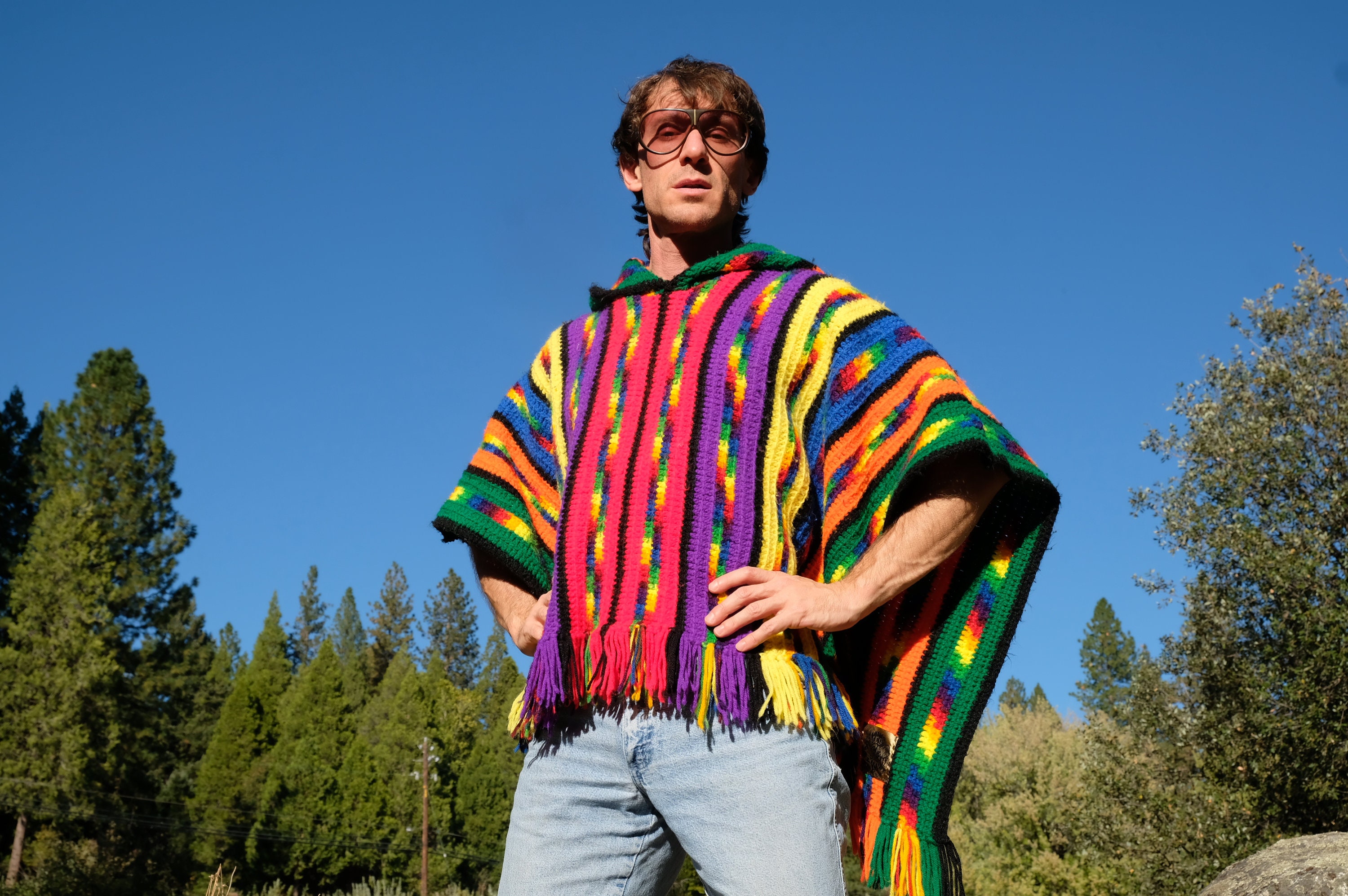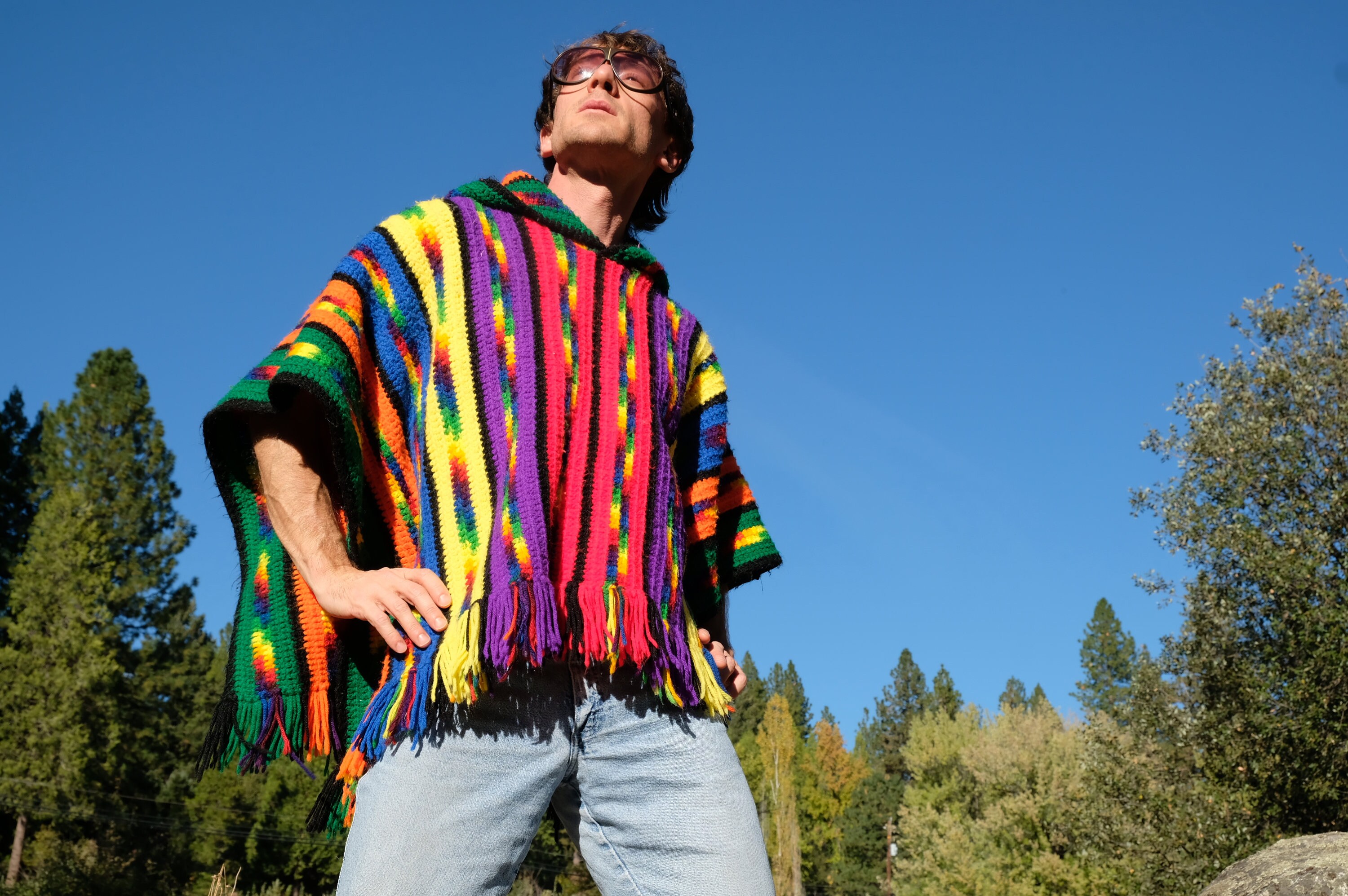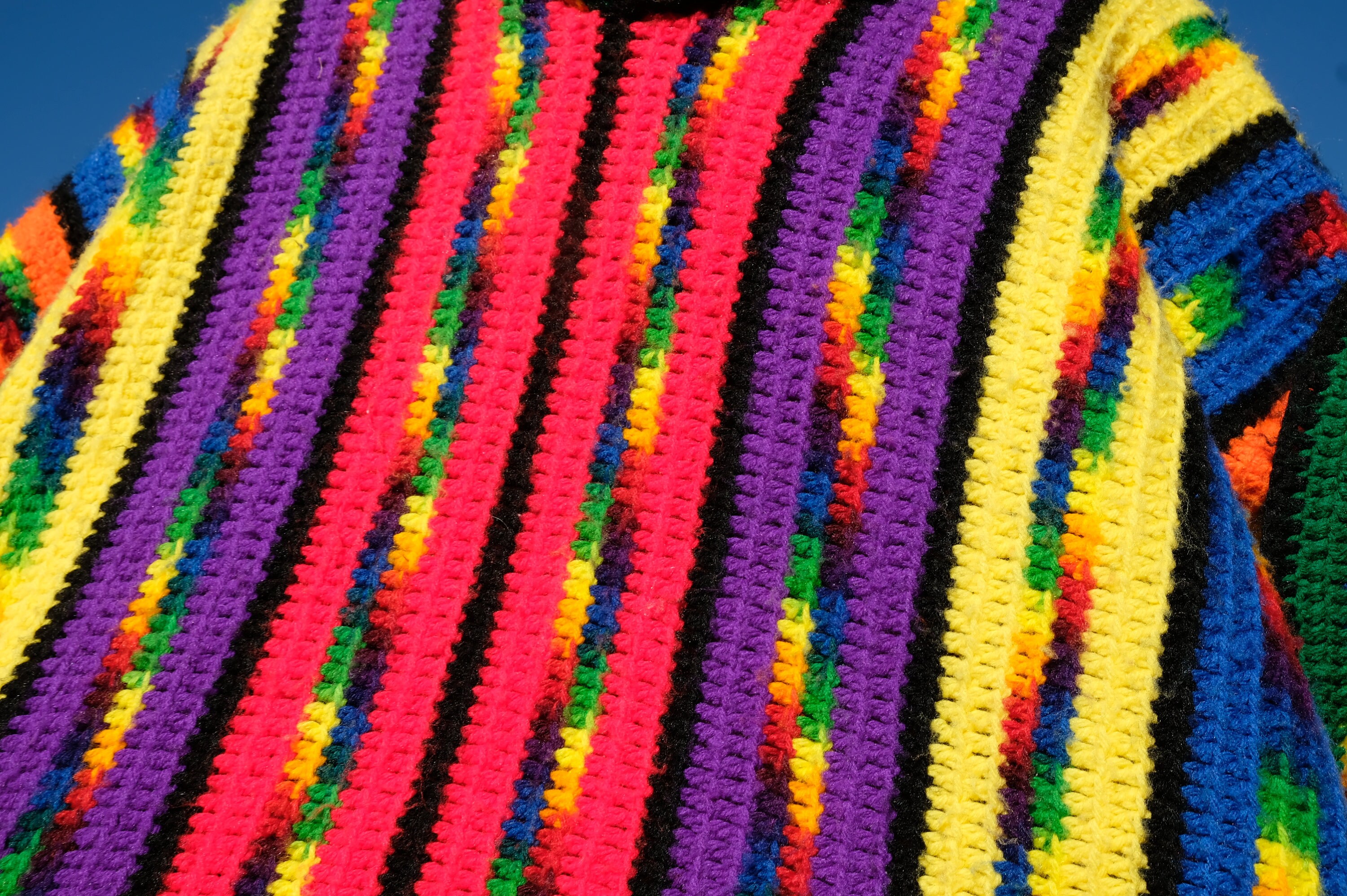 This is a soft and comfortable crochet poncho hoodie with rainbow stripes. Beautifully up-cycled from a vintage afghan blanket in 100% acrylic yarn, and exquisitely tailored by yours truly, Lord von Schmitt.