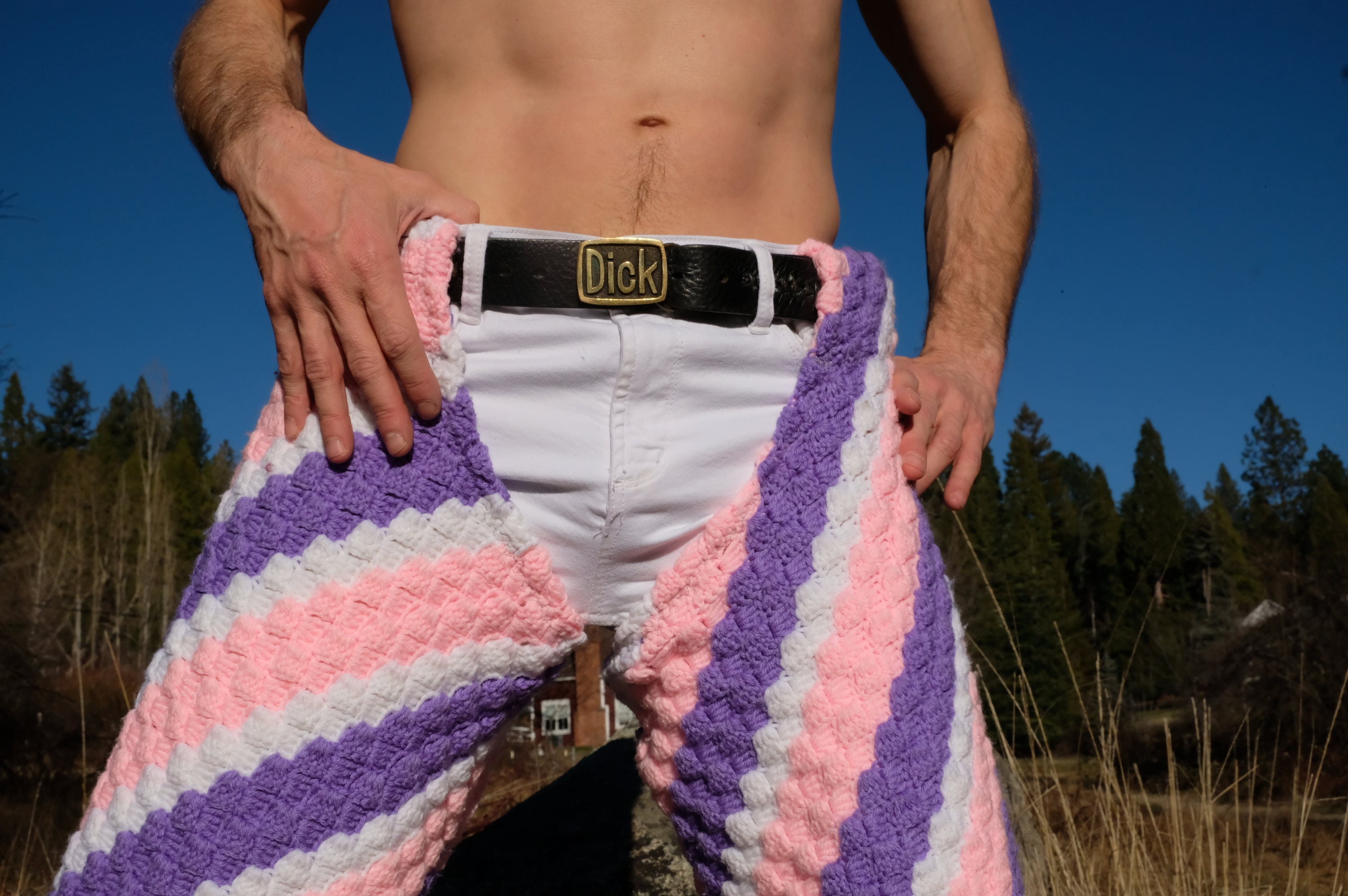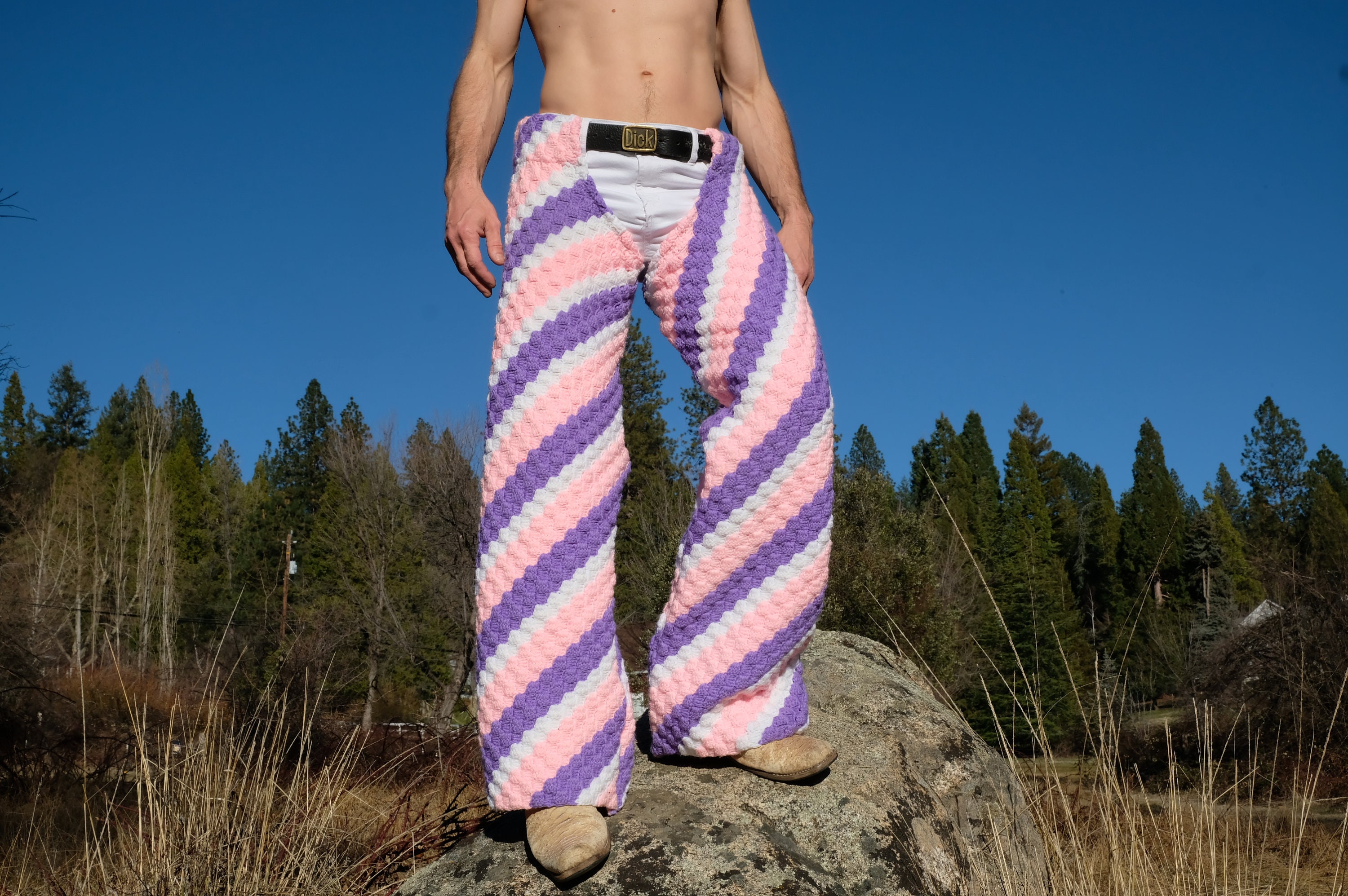 These are crochet chaps with diagonal stripes. Fashioned from a vintage afghan blanket crocheted in 100% acrylic yarn.