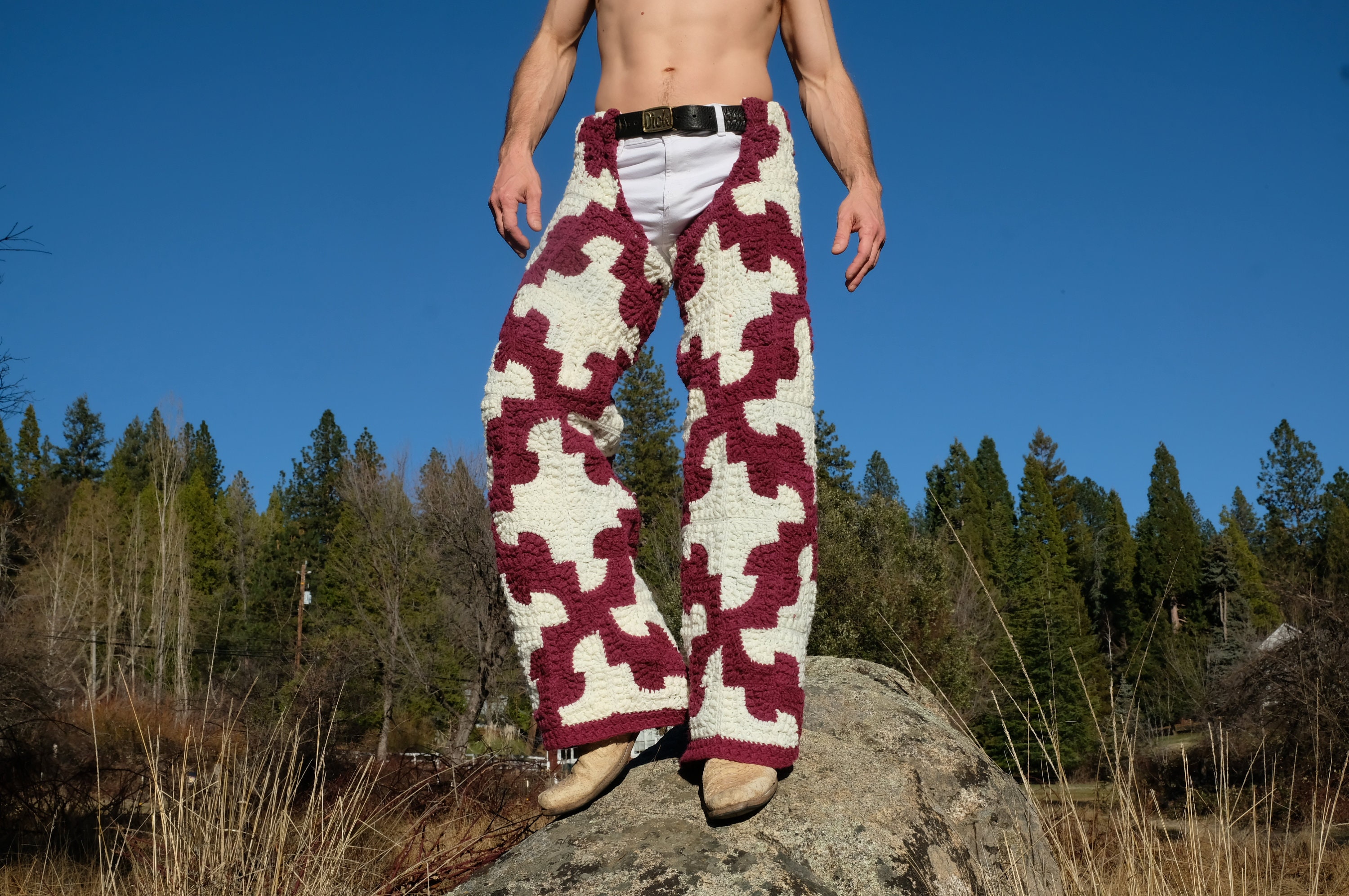 These are crochet chaps in a burgundy and white tesseract pattern, like a puzzle. Fashioned from a vintage afghan blanket crocheted in 100% acrylic yarn.