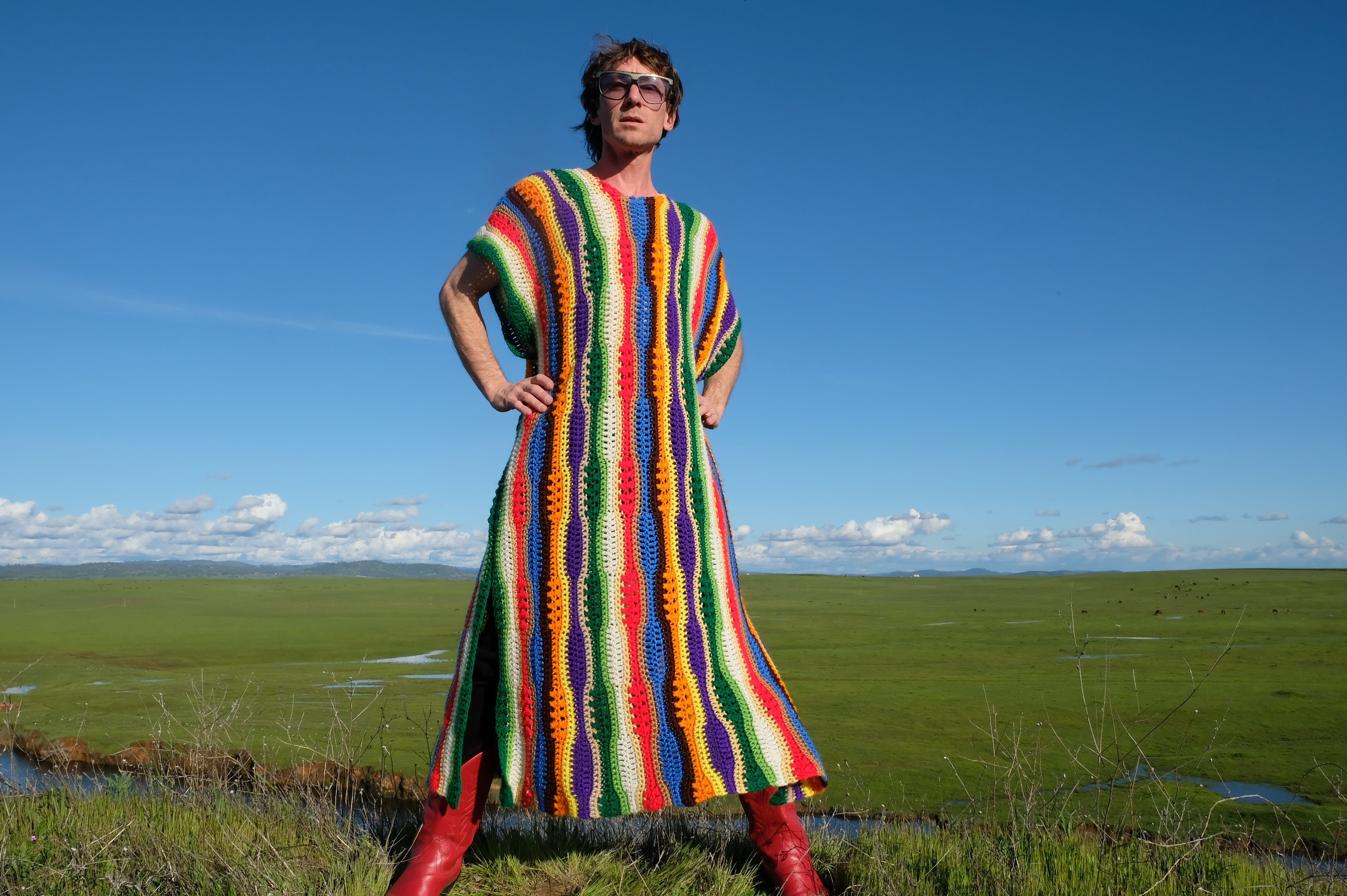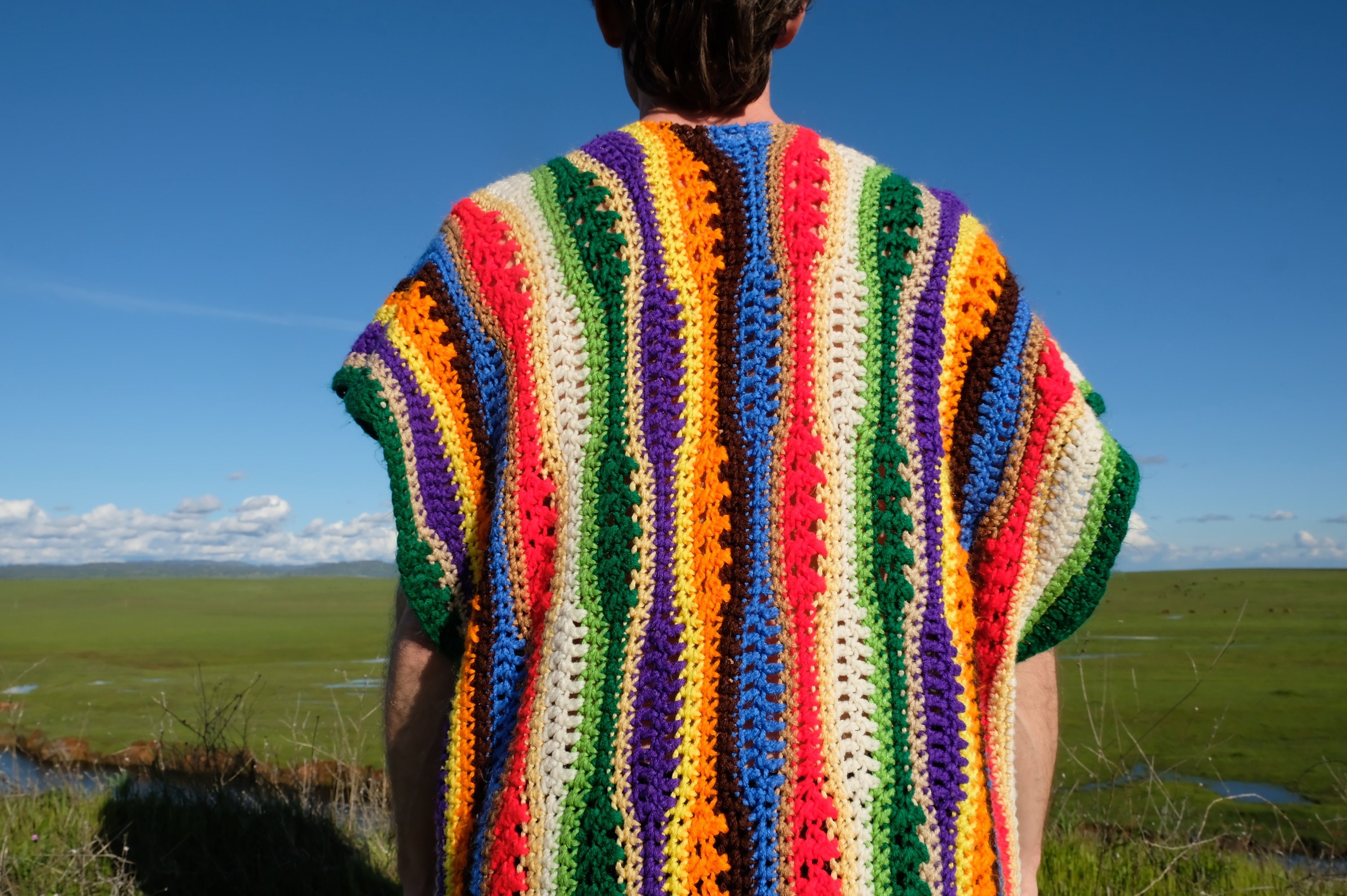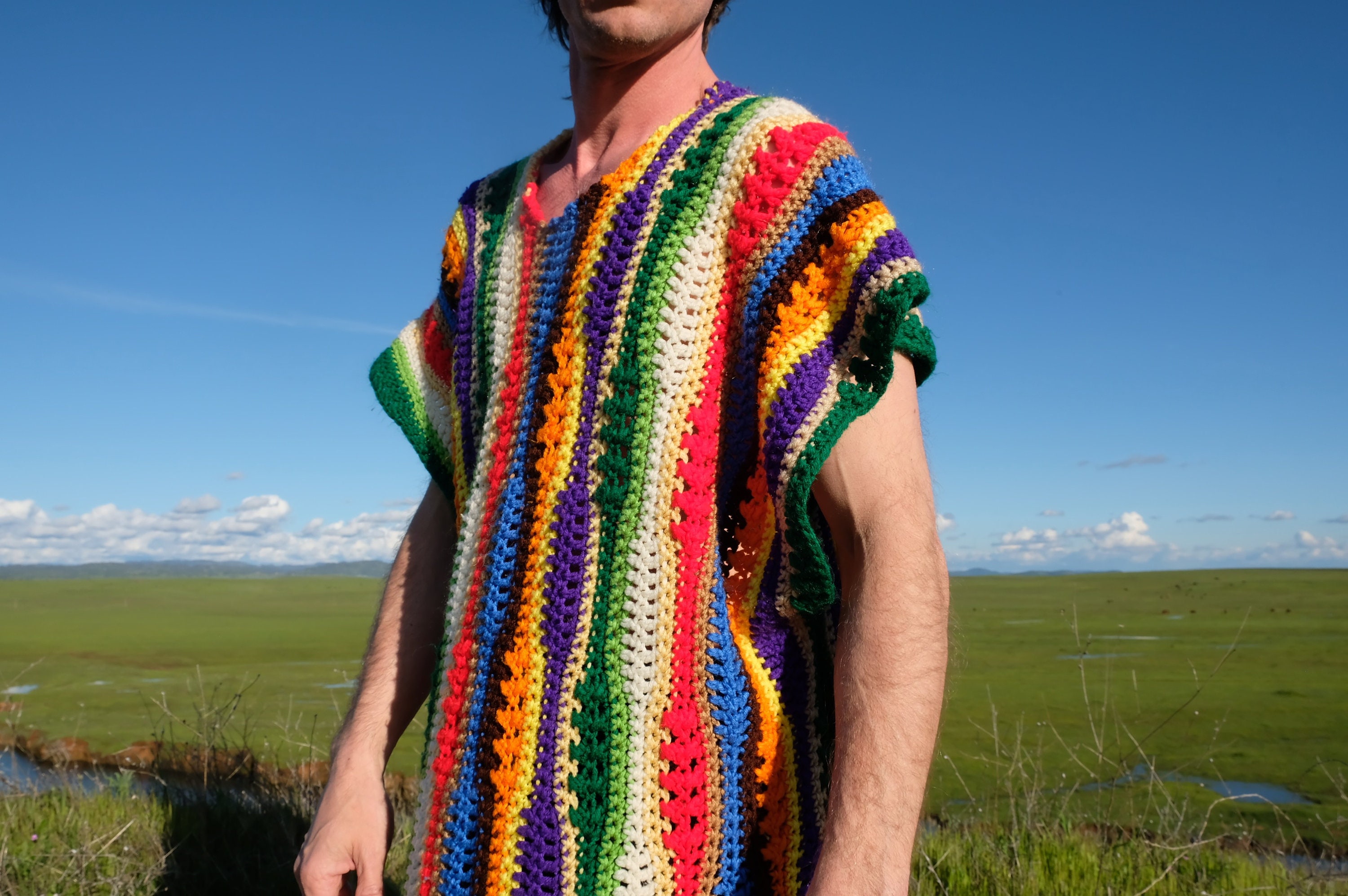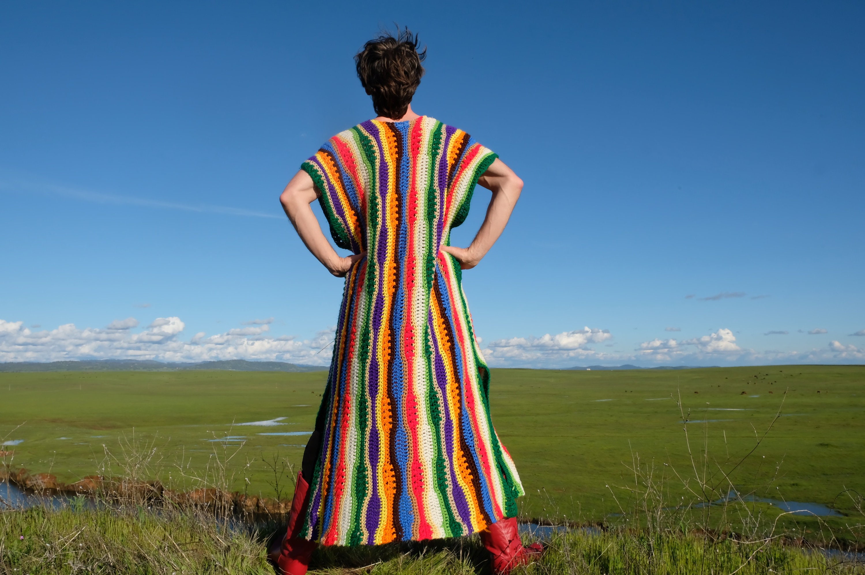 This is a crochet muumuu with multicolor stripes. Beautifully up-cycled from a crocheted afghan blanket in 100% soft acrylic yarn and exquisitely tailored by yours truly, Lord von Schmitt.