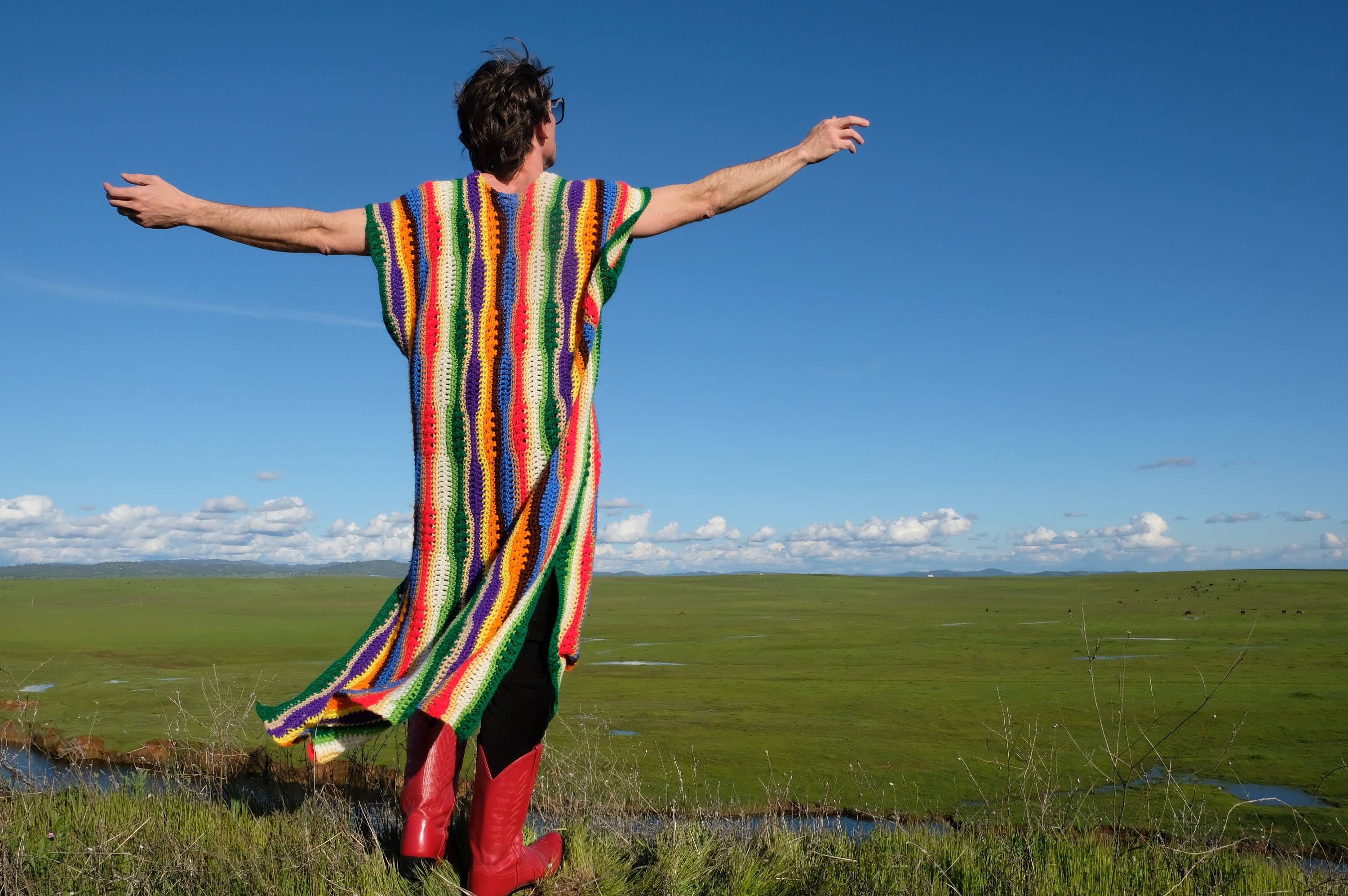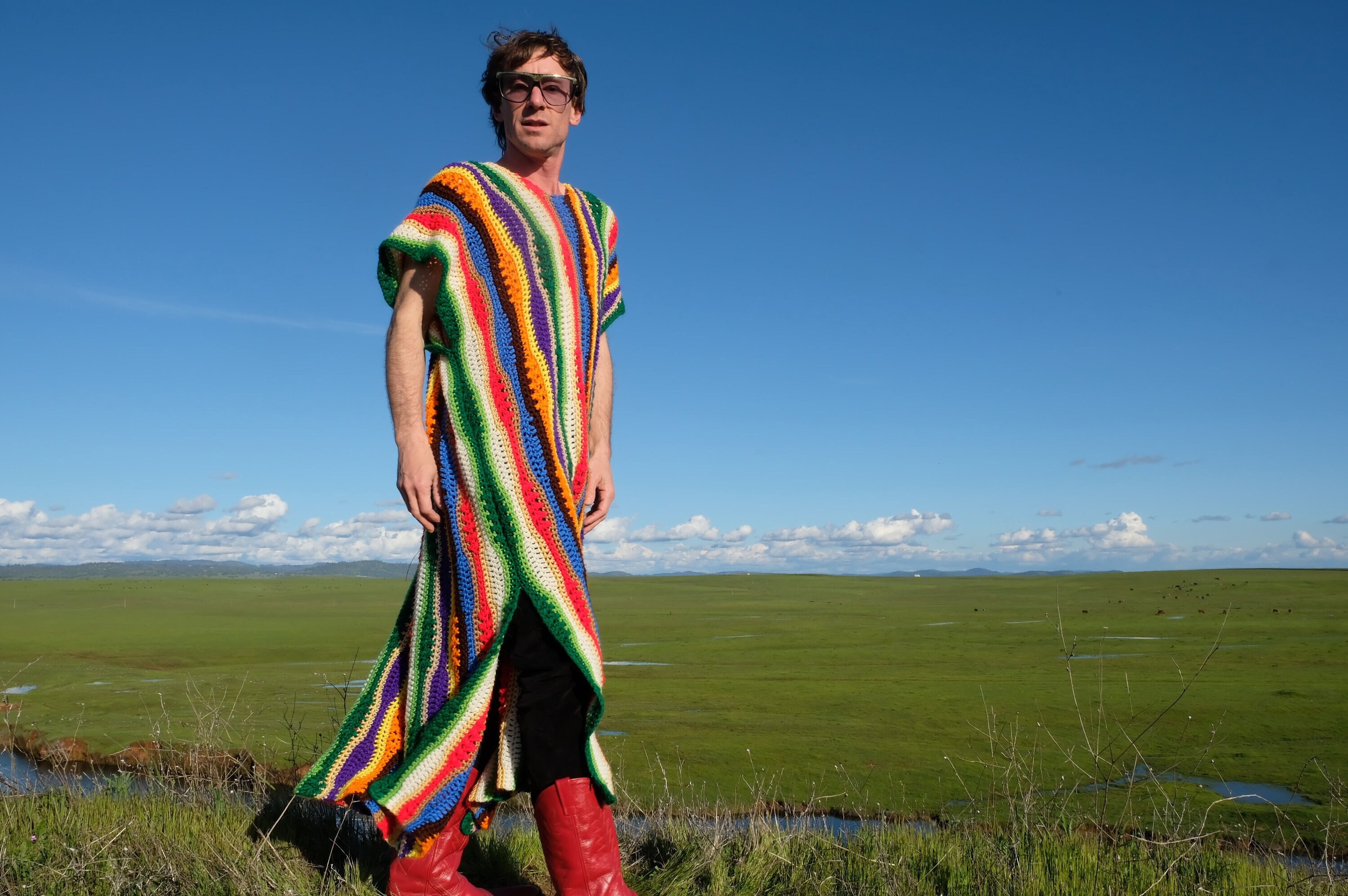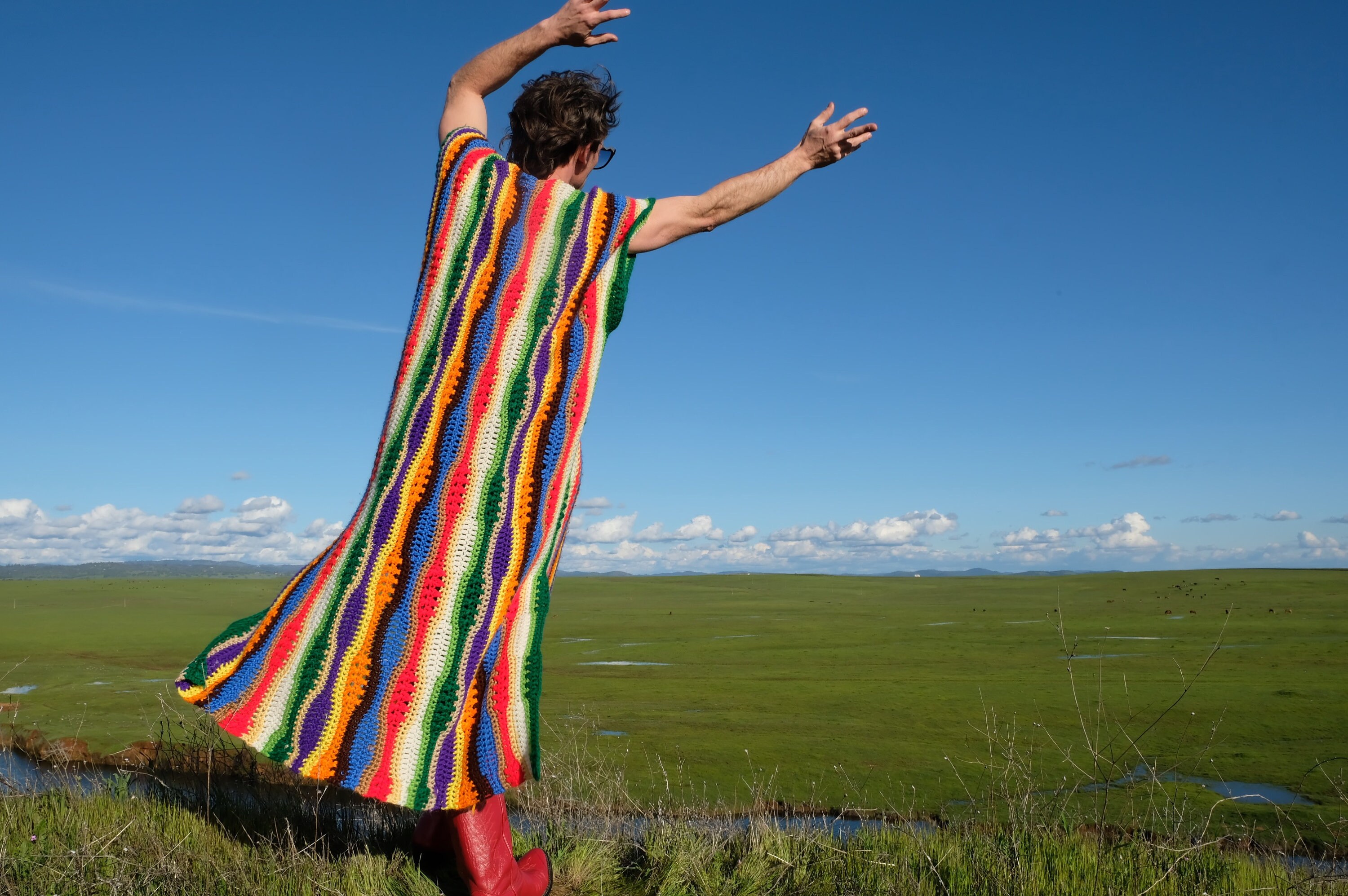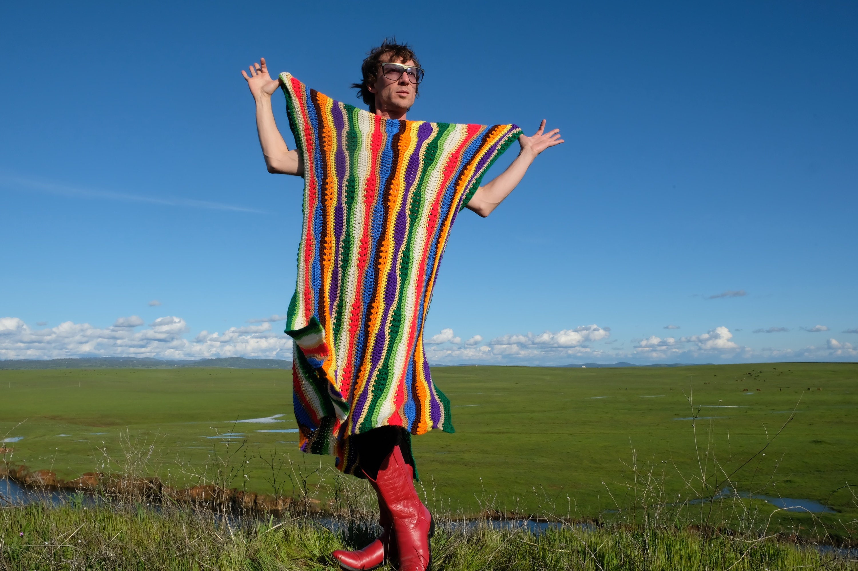 This is a crochet muumuu with multicolor stripes. Beautifully up-cycled from a crocheted afghan blanket in 100% soft acrylic yarn and exquisitely tailored by yours truly, Lord von Schmitt.