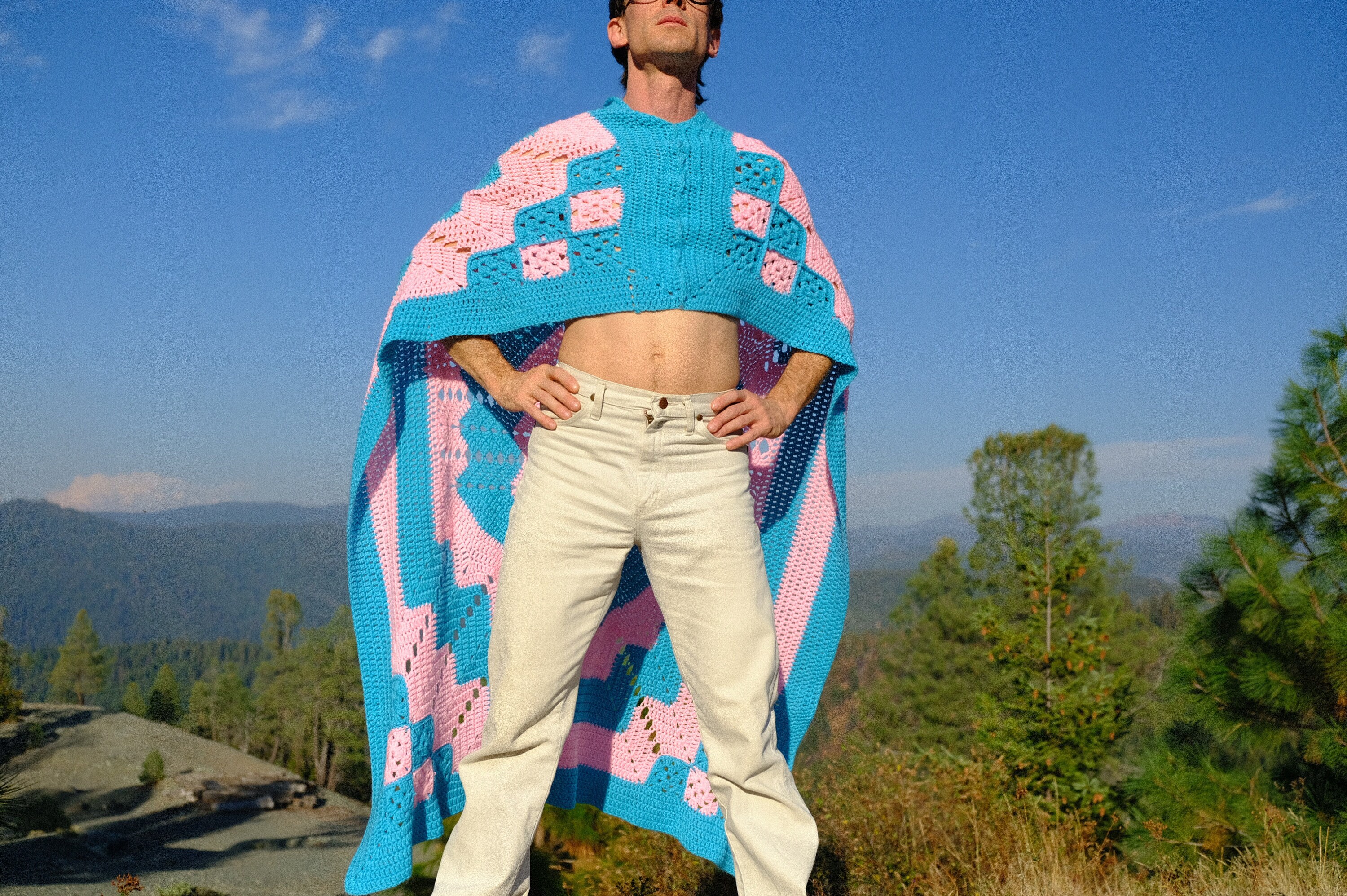 This is a crochet cape in brightly colored turquoise blue and pink squares. Beautifully up-cycled from a crocheted afghan blanket in 100% soft acrylic yarn and exquisitely tailored by yours truly, Lord von Schmitt.