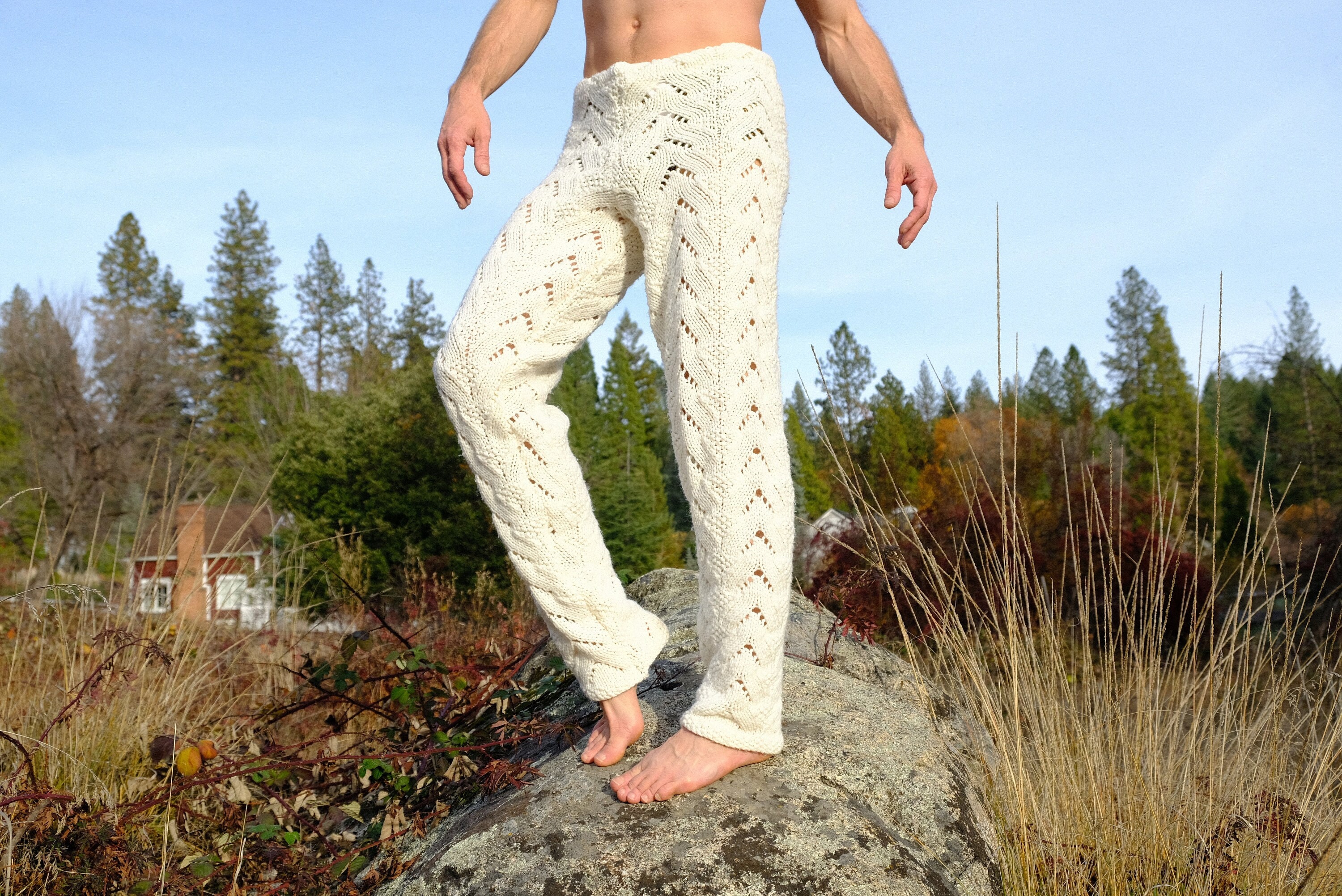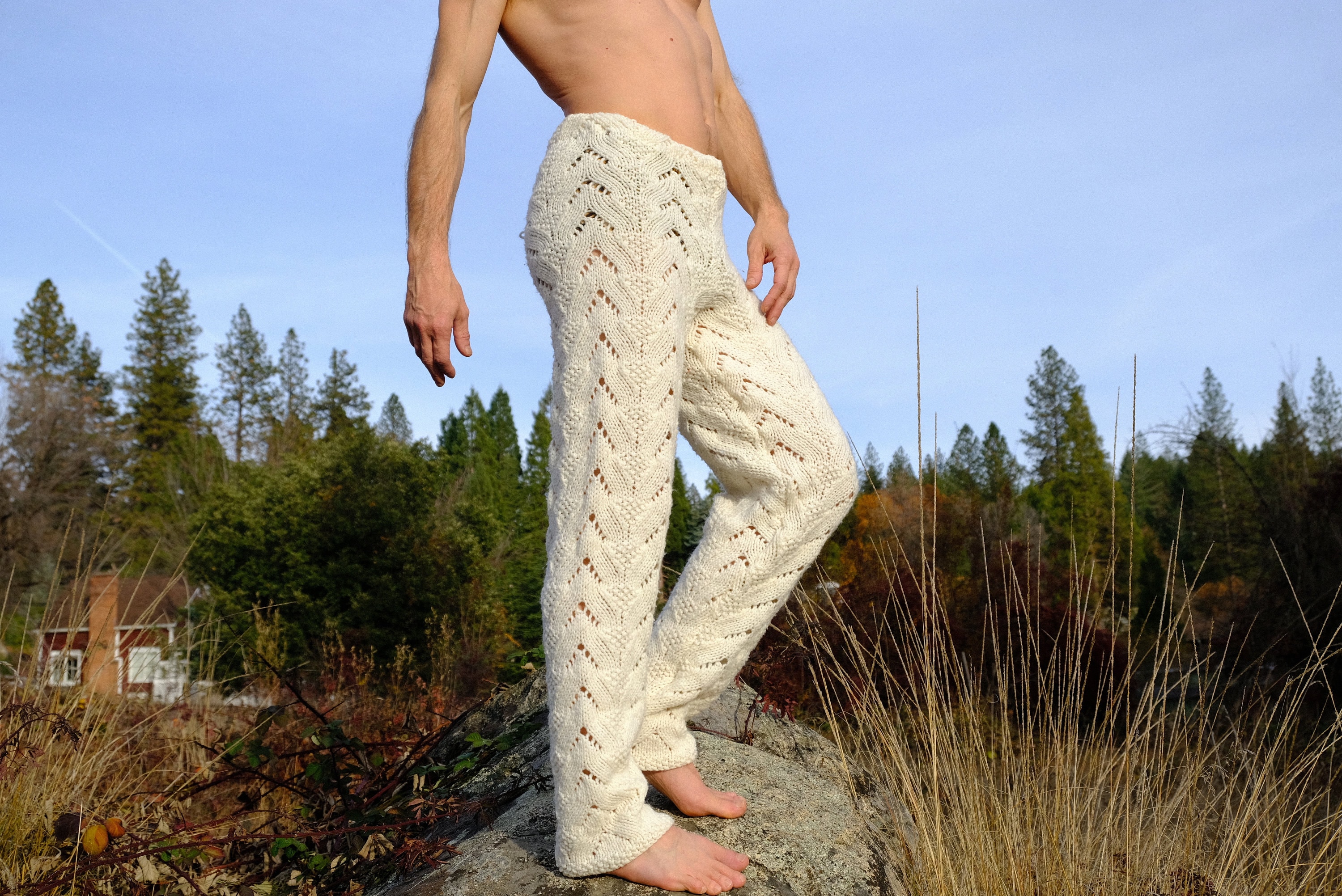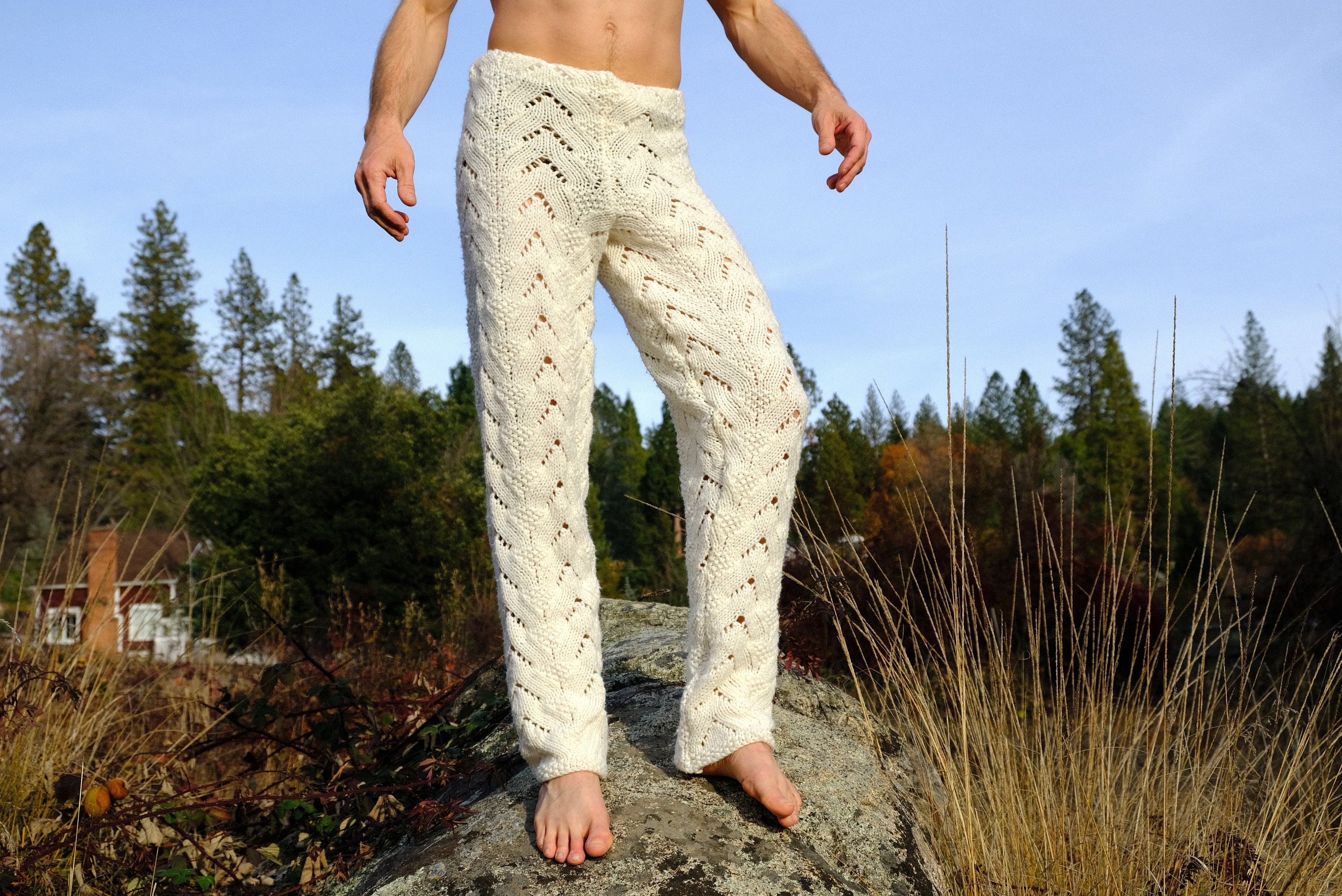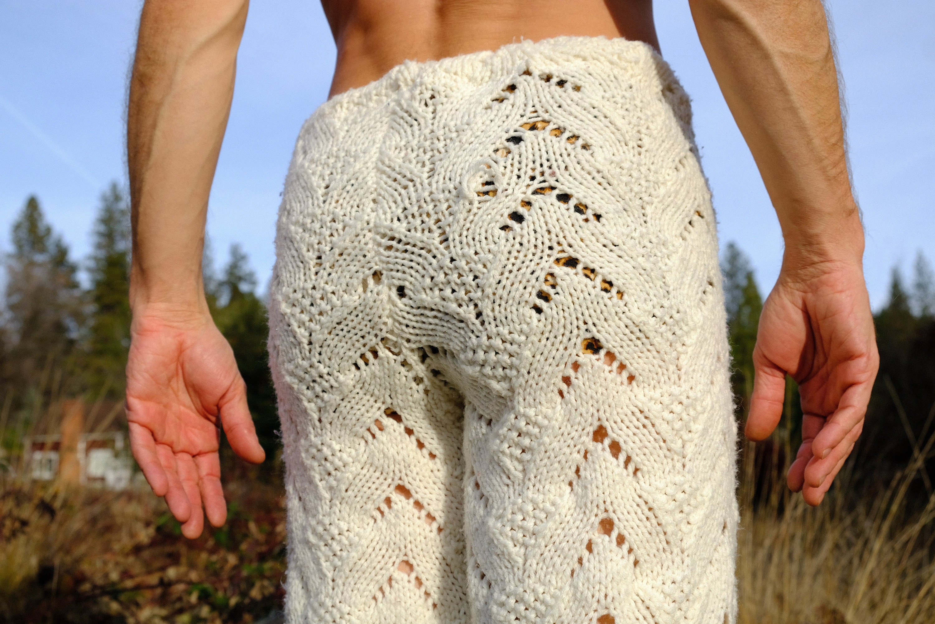 These are soft snuggly knit pants with v-shaped patterns. Hand knit from an afghan crocheted in 100% acrylic yarn and fashioned into pants by yours truly.
