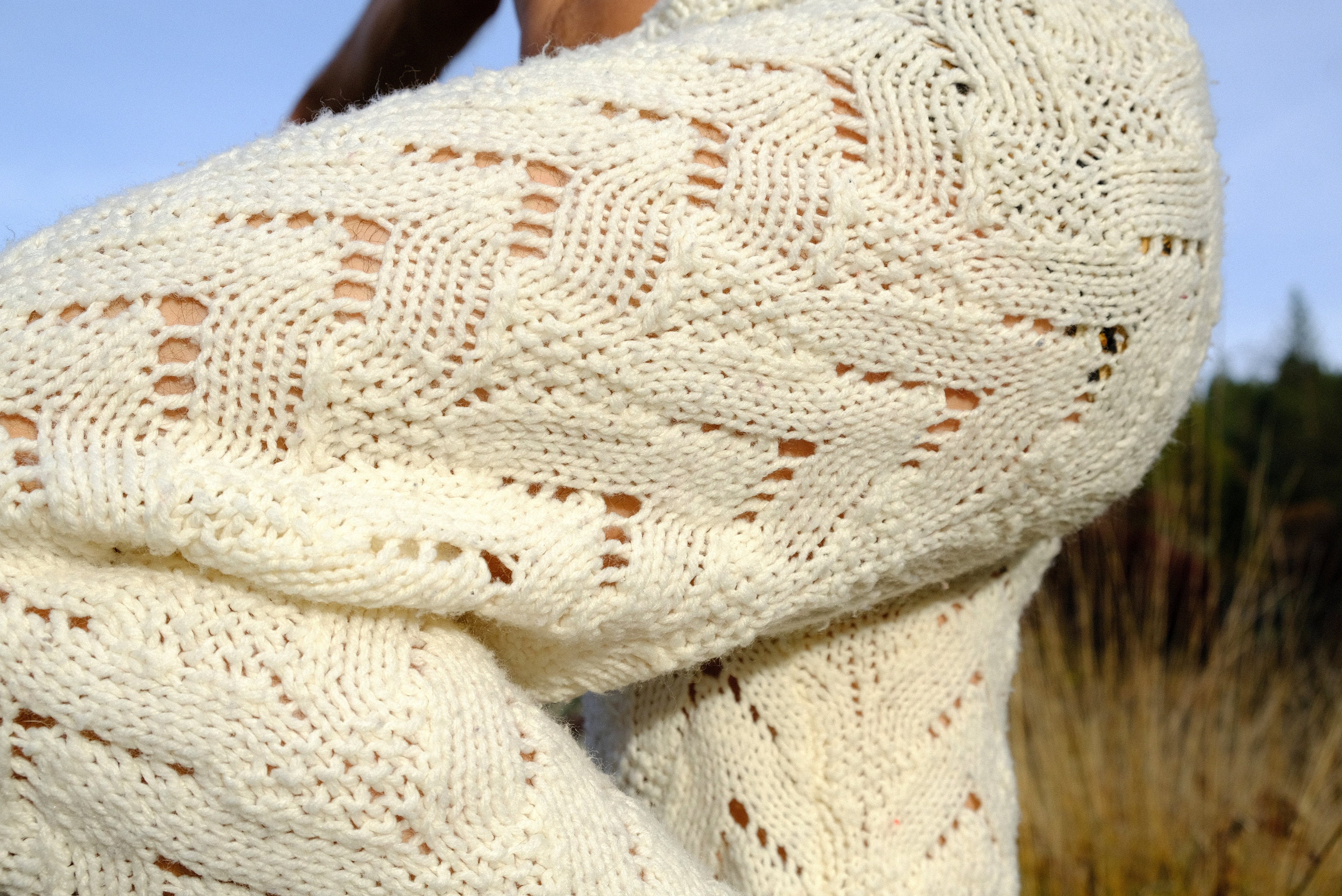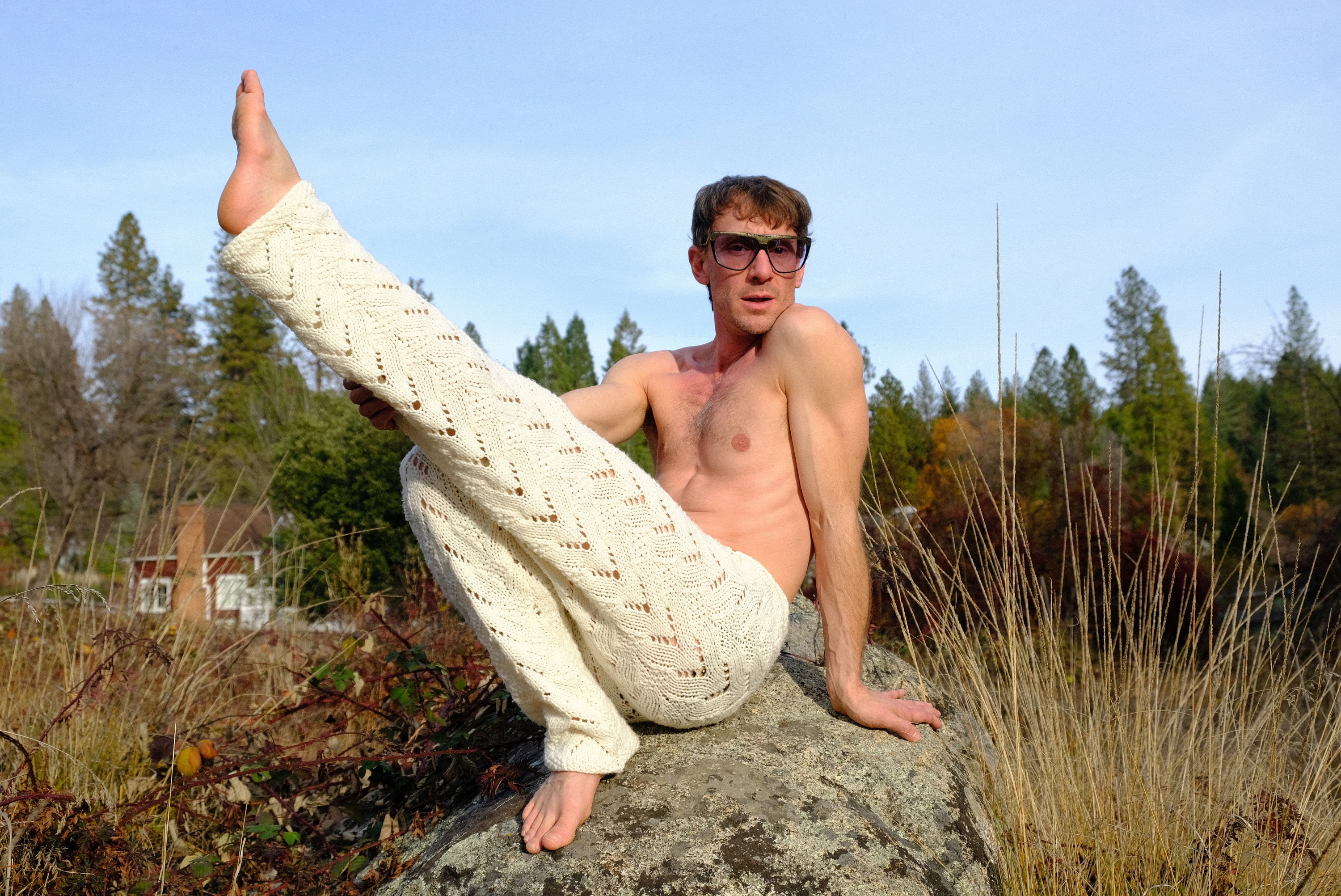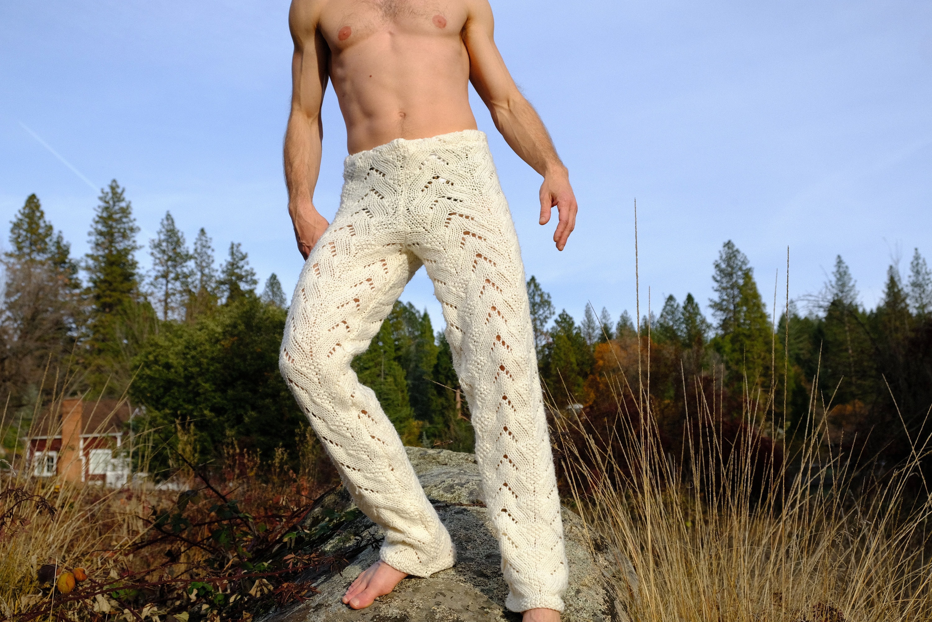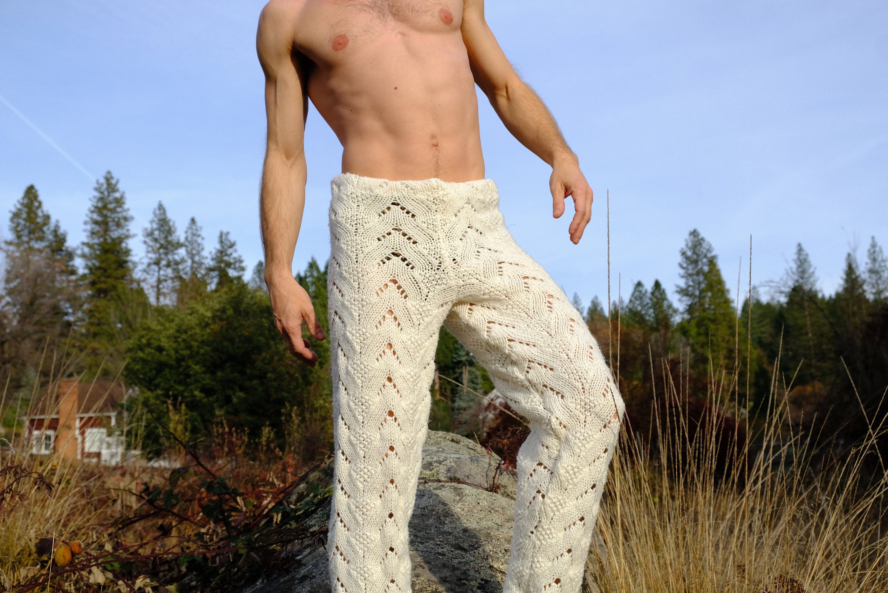 These are soft snuggly knit pants with v-shaped patterns. Hand knit from an afghan crocheted in 100% acrylic yarn and fashioned into pants by yours truly.