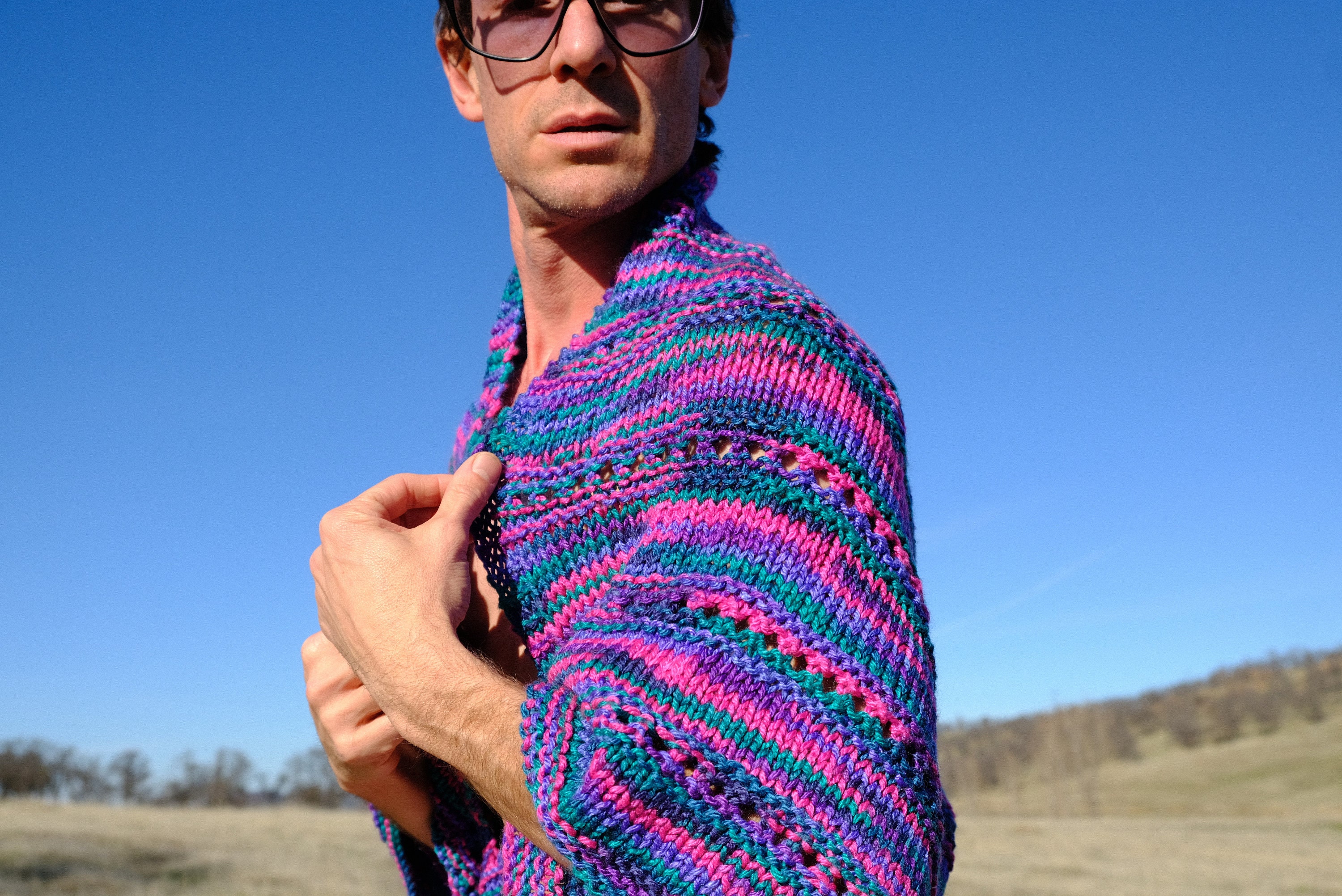 This is a hand knit shrug in pink to green variegated stripes. Beautifully up-cycled from a knit afghan blanket in 100% soft acrylic yarn and exquisitely tailored by yours truly, Lord von Schmitt.