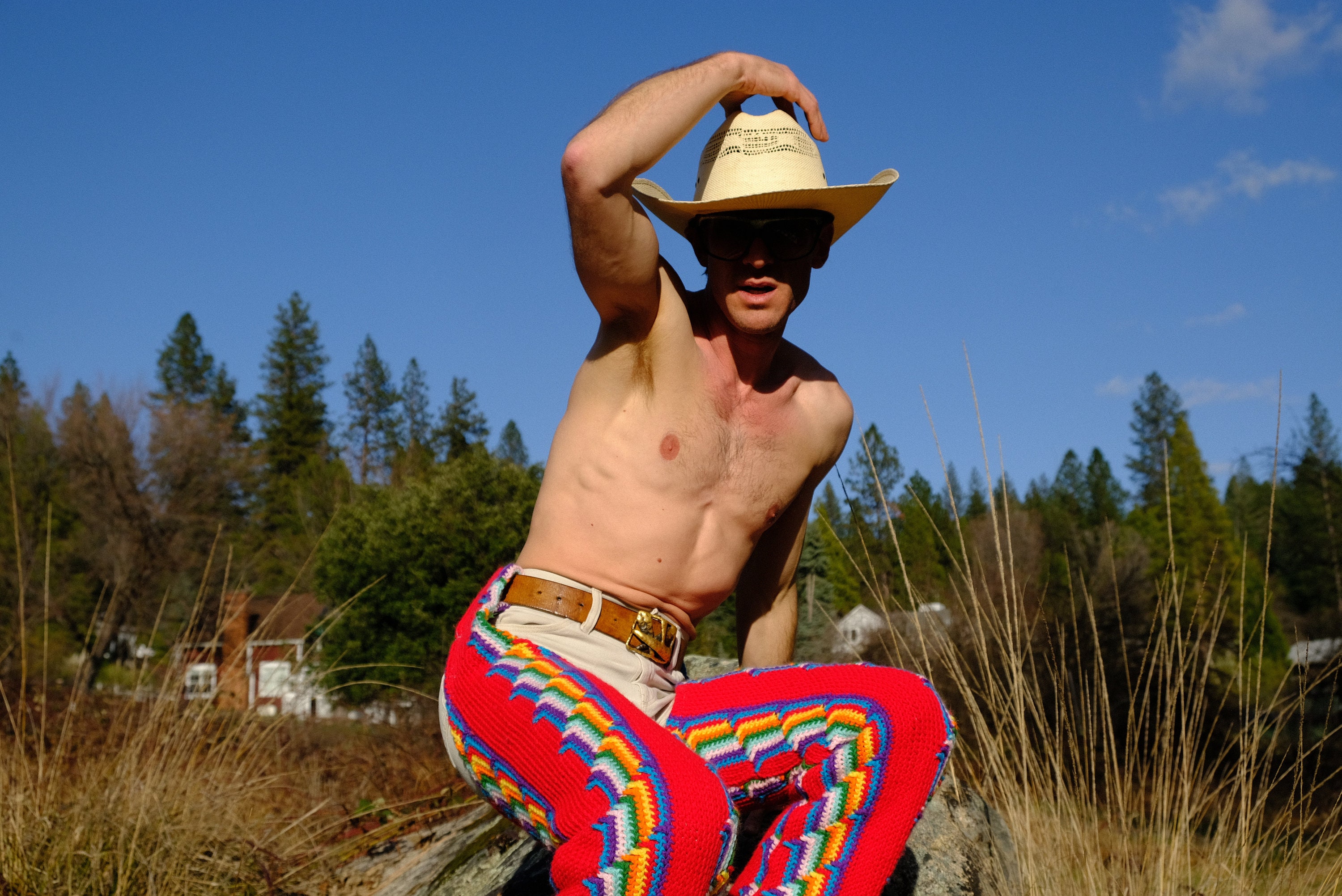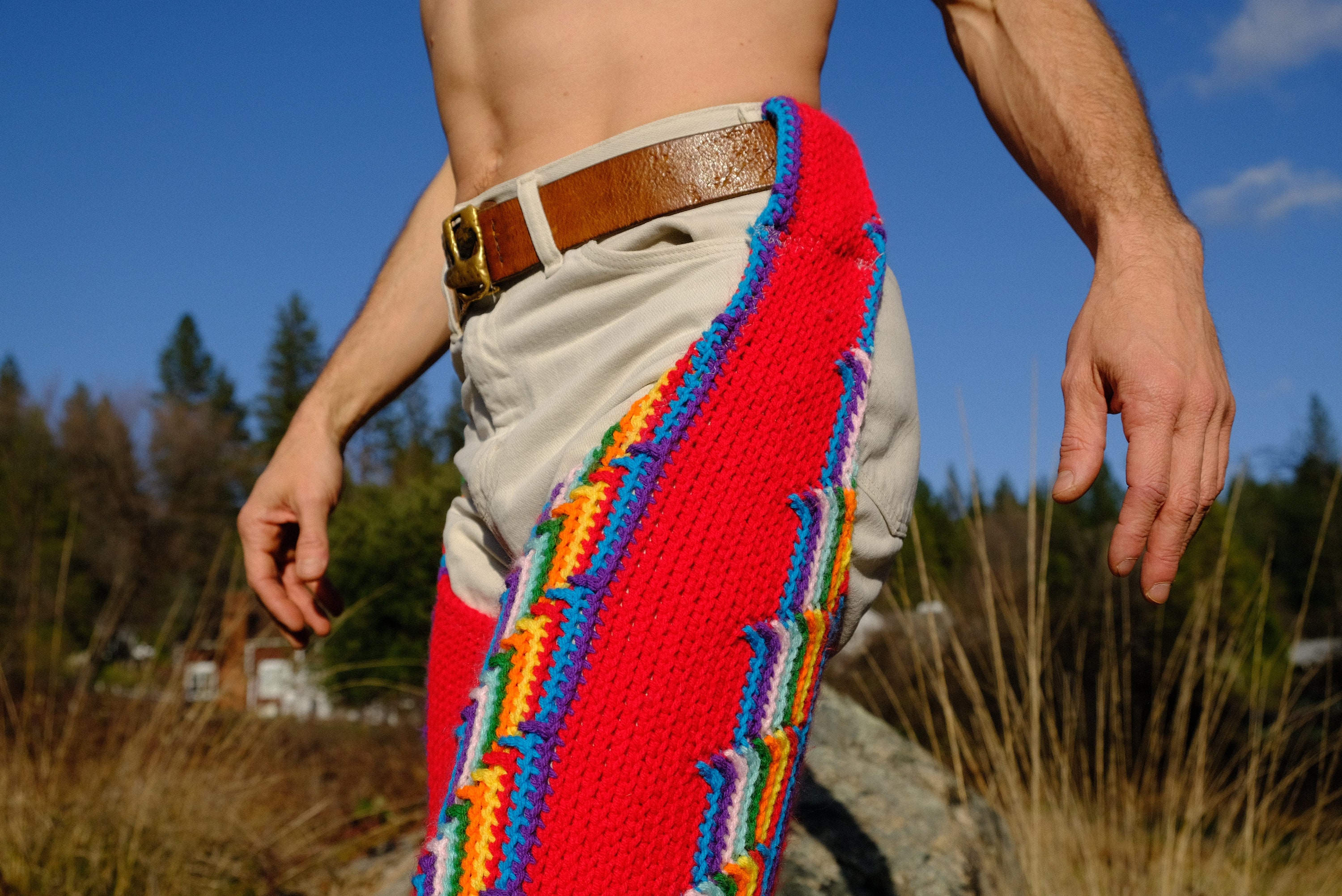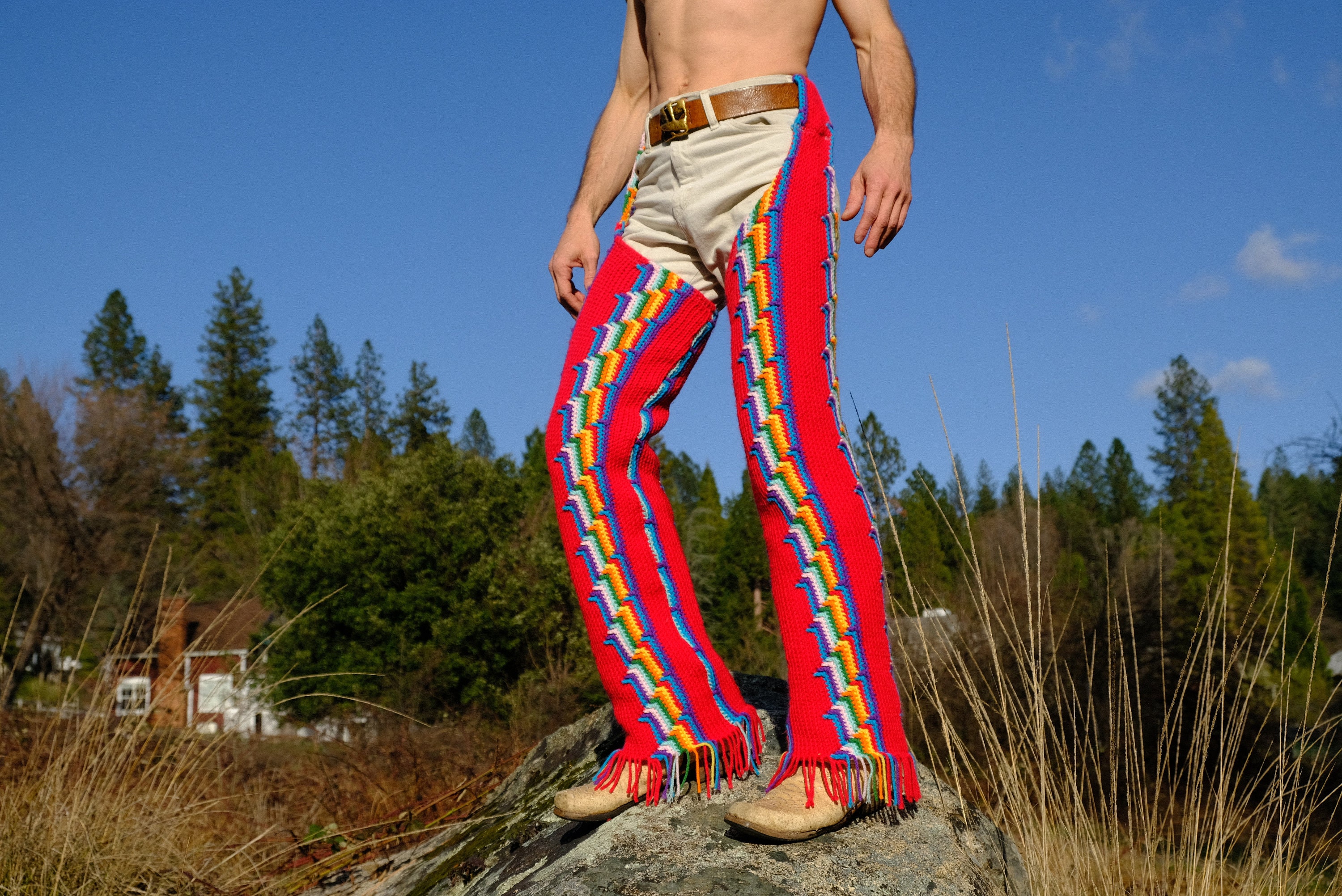 These are crochet chaps with rainbow vertical stripes on red. Fashioned from a vintage afghan blanket crocheted in 100% acrylic yarn.