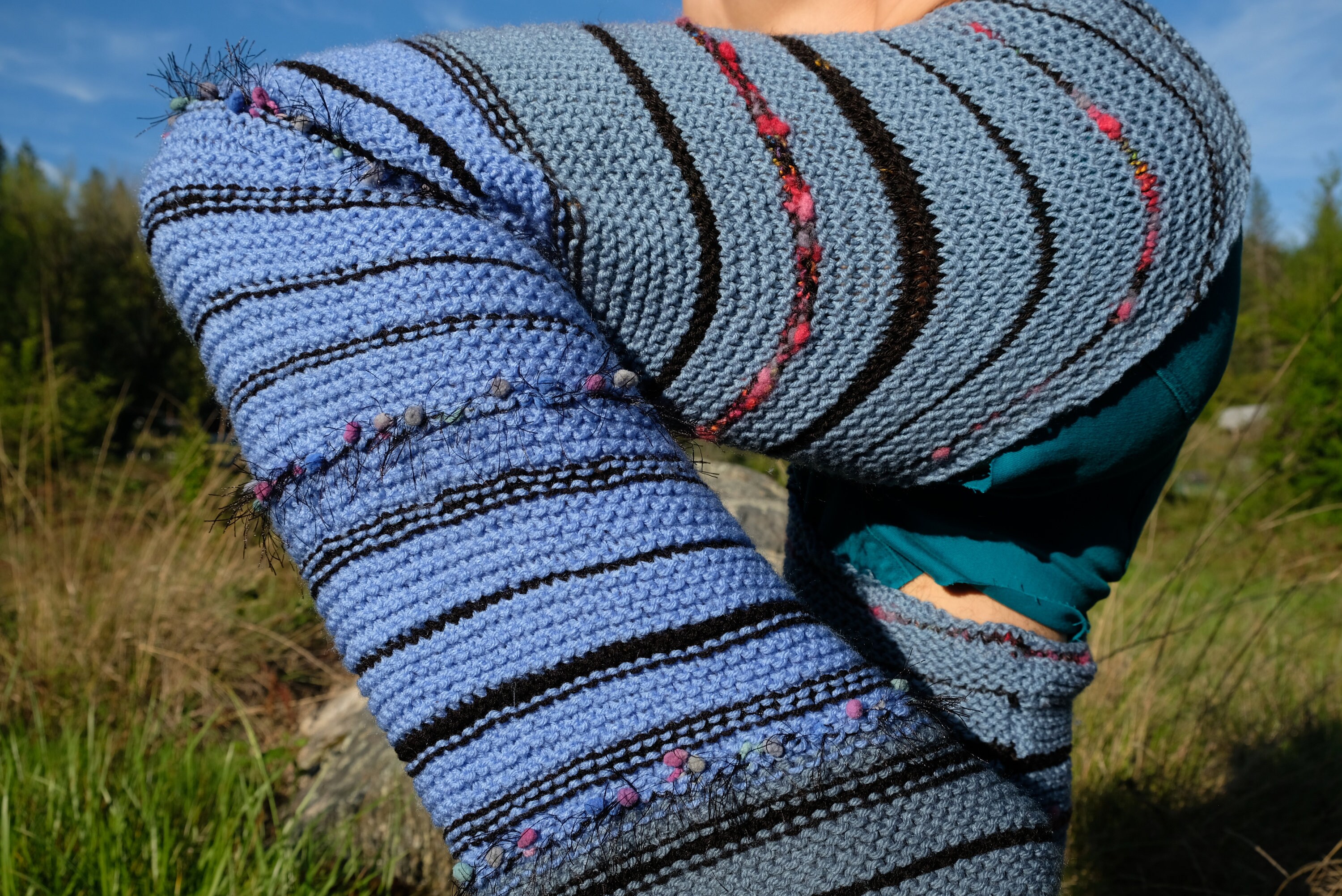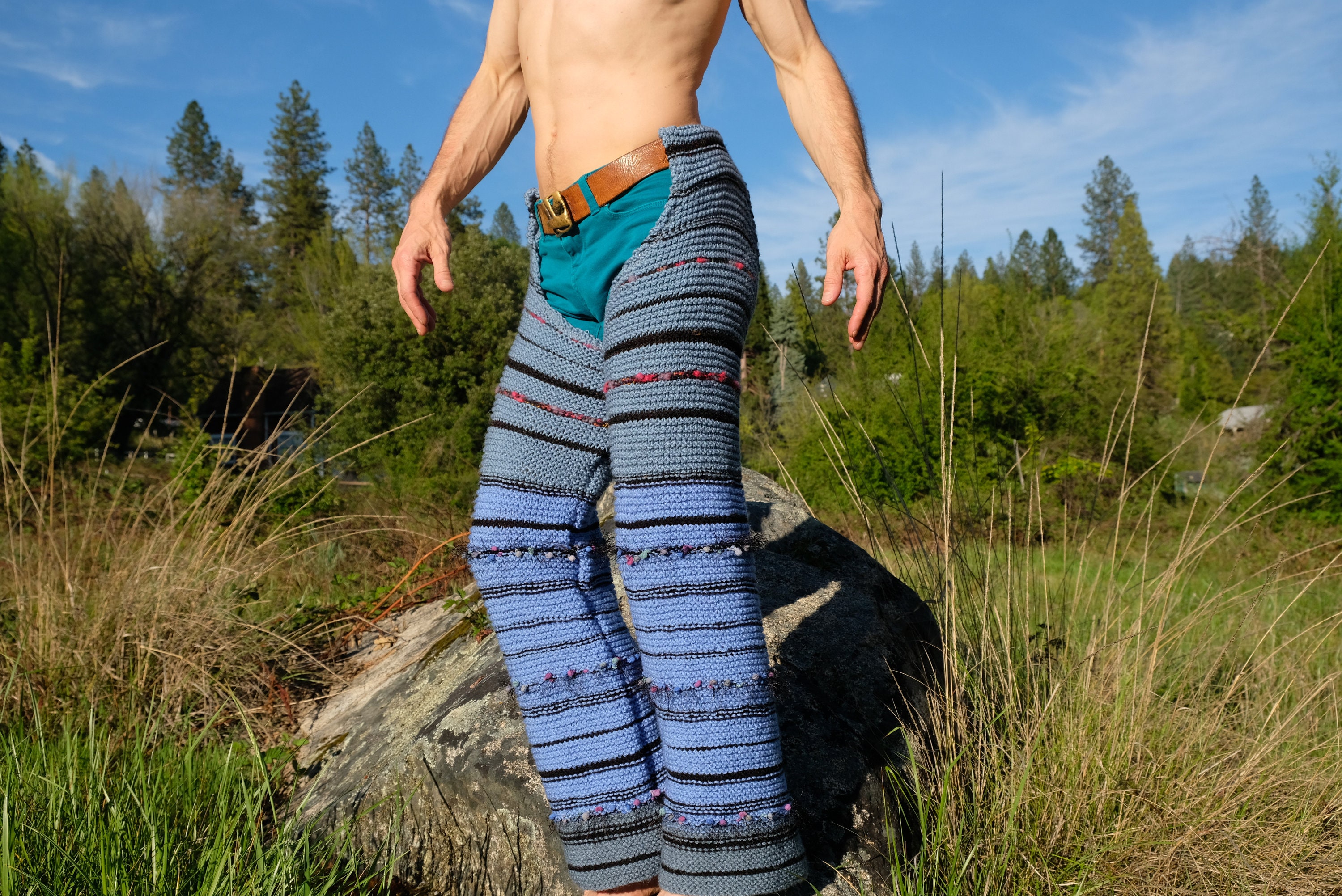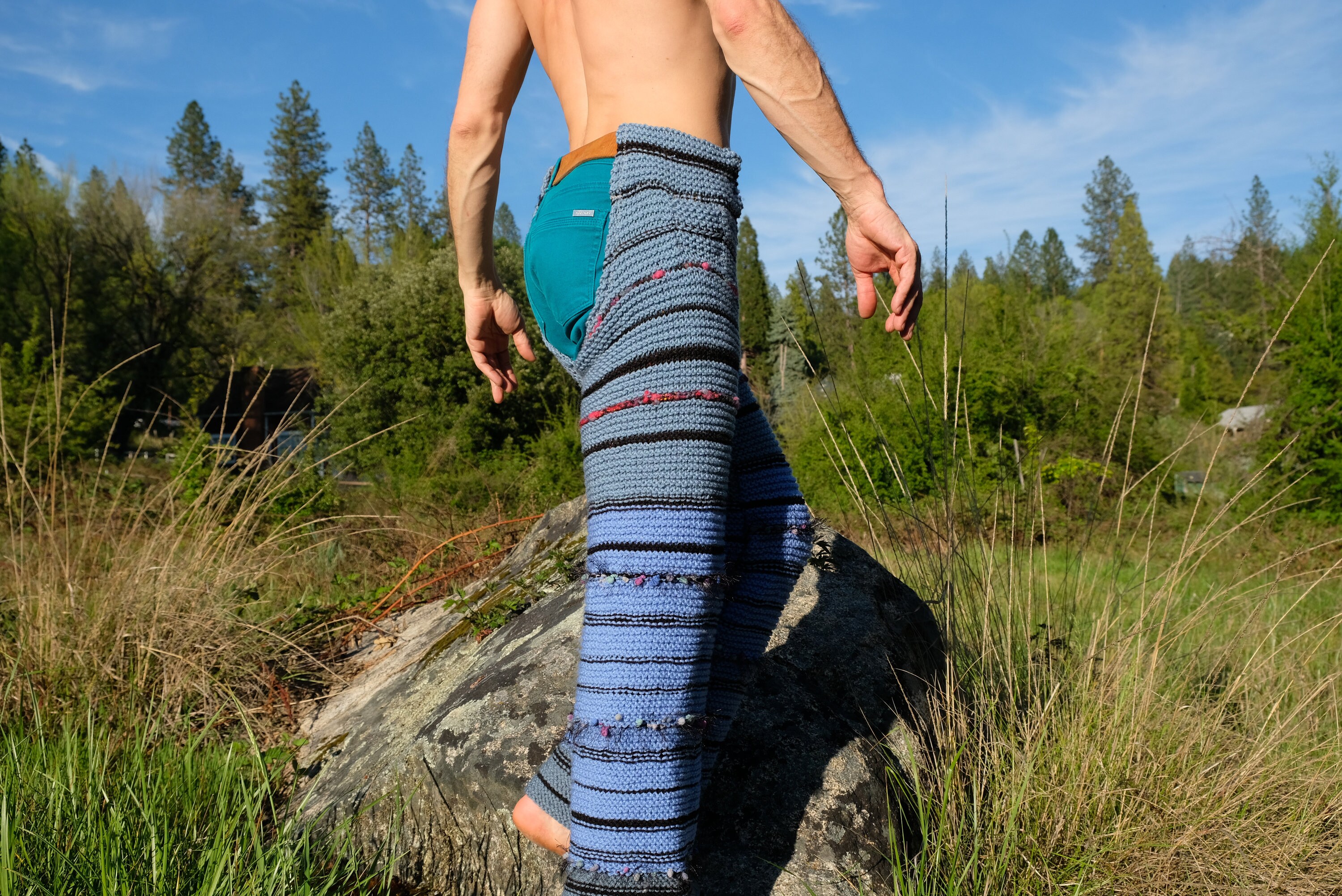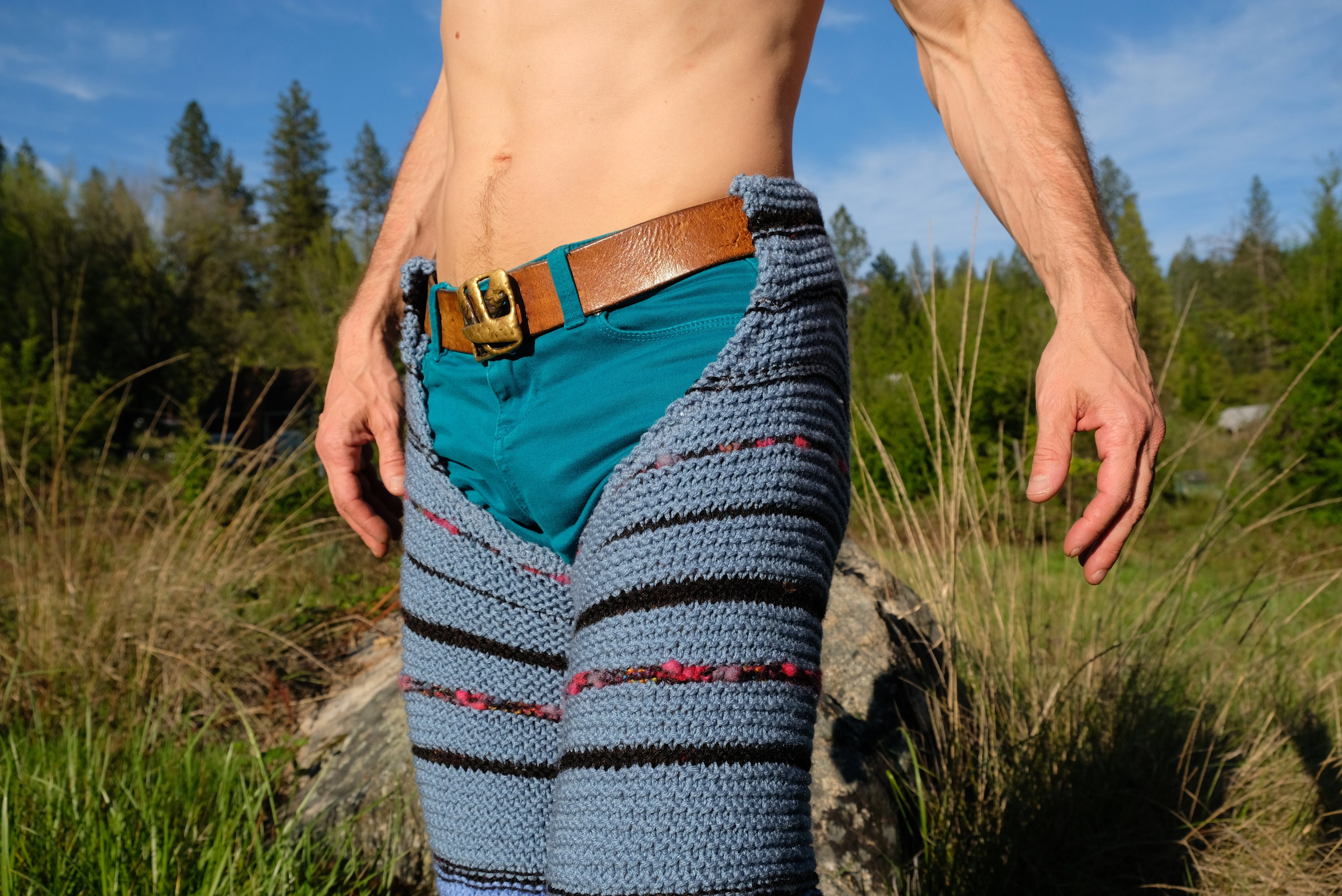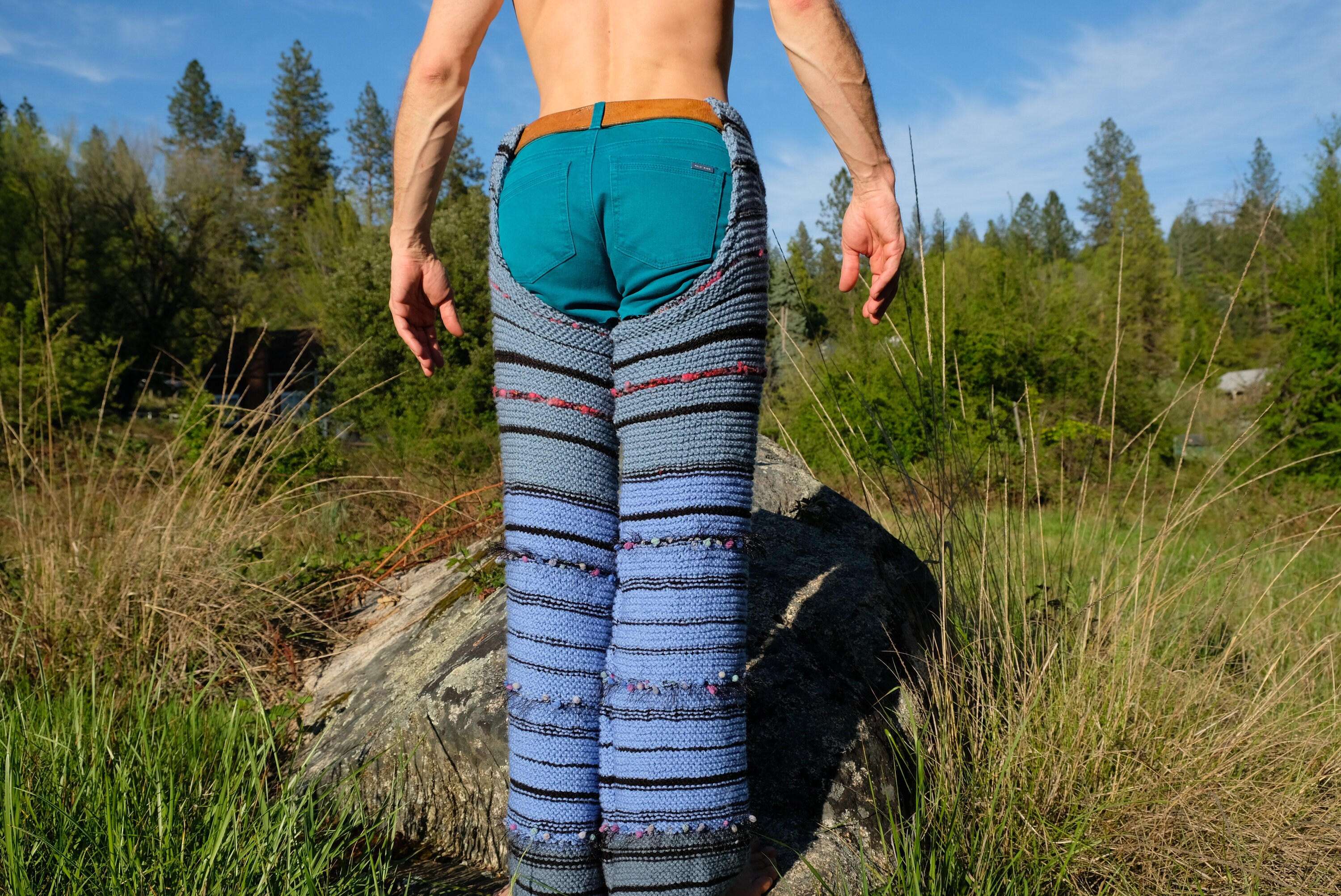 These are knit chaps with gray and black stripes. Fashioned from a vintage afghan blanket crocheted in 100% acrylic yarn.