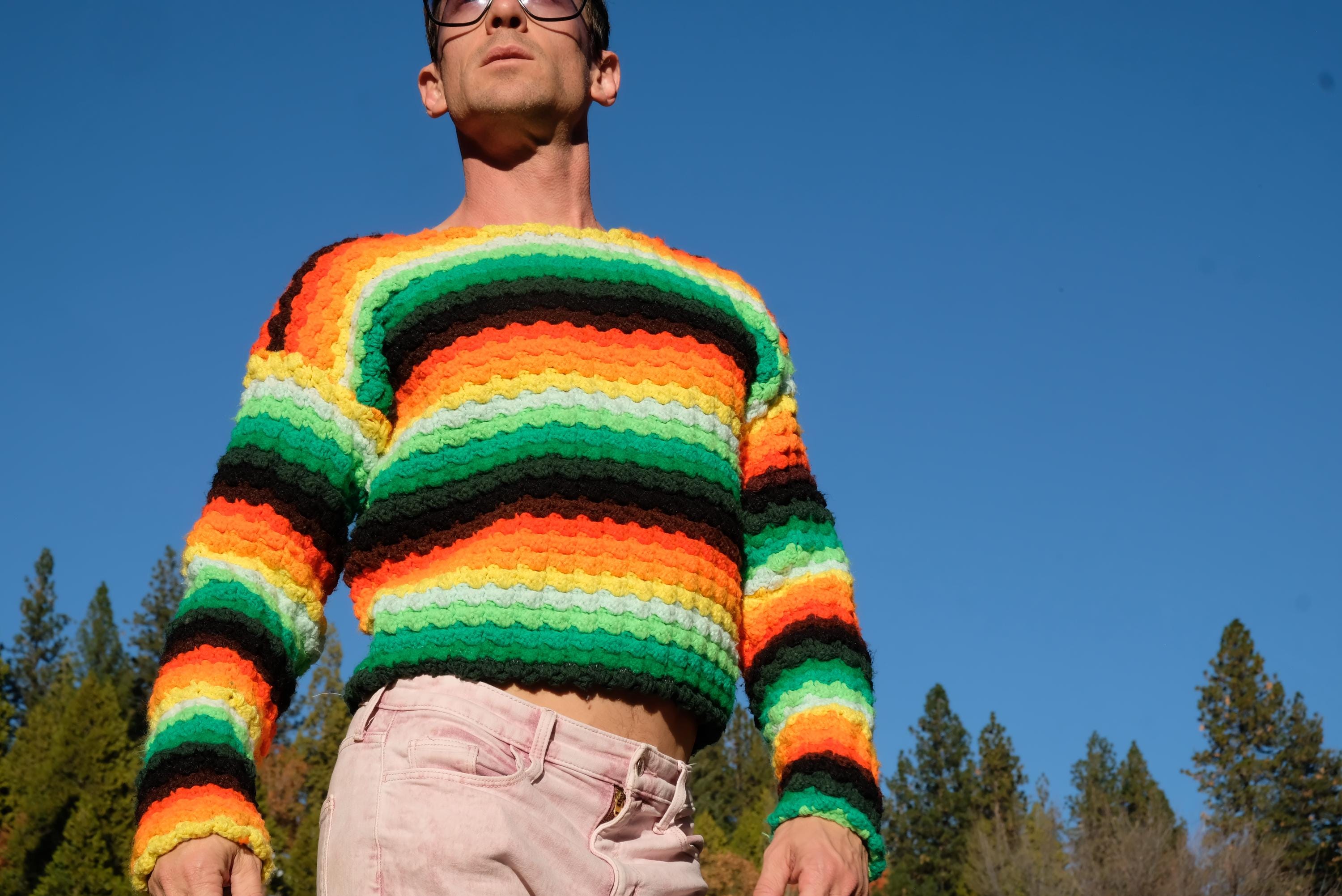 This is a crochet sweater in neon orange to neon green. Repurposed from a crochet afghan blanket in 100 % acrylic yarn and hand stitched by yours truly, Lord von Schmitt.