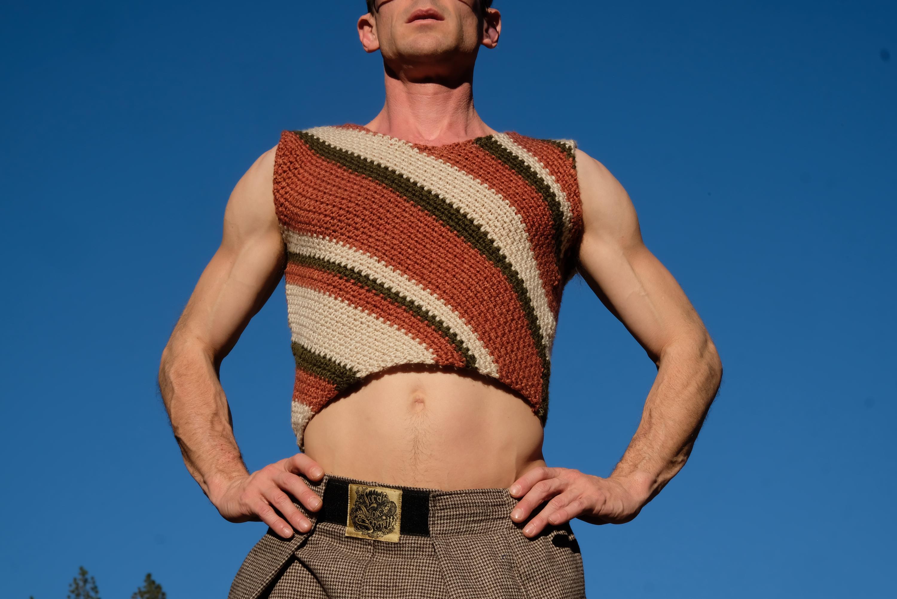 This is a crochet vest in diagonal lines Beautifully up-cycled from a vintage afghan blanket in 100% acrylic yarn, and exquisitely tailored by yours truly, Lord von Schmitt.