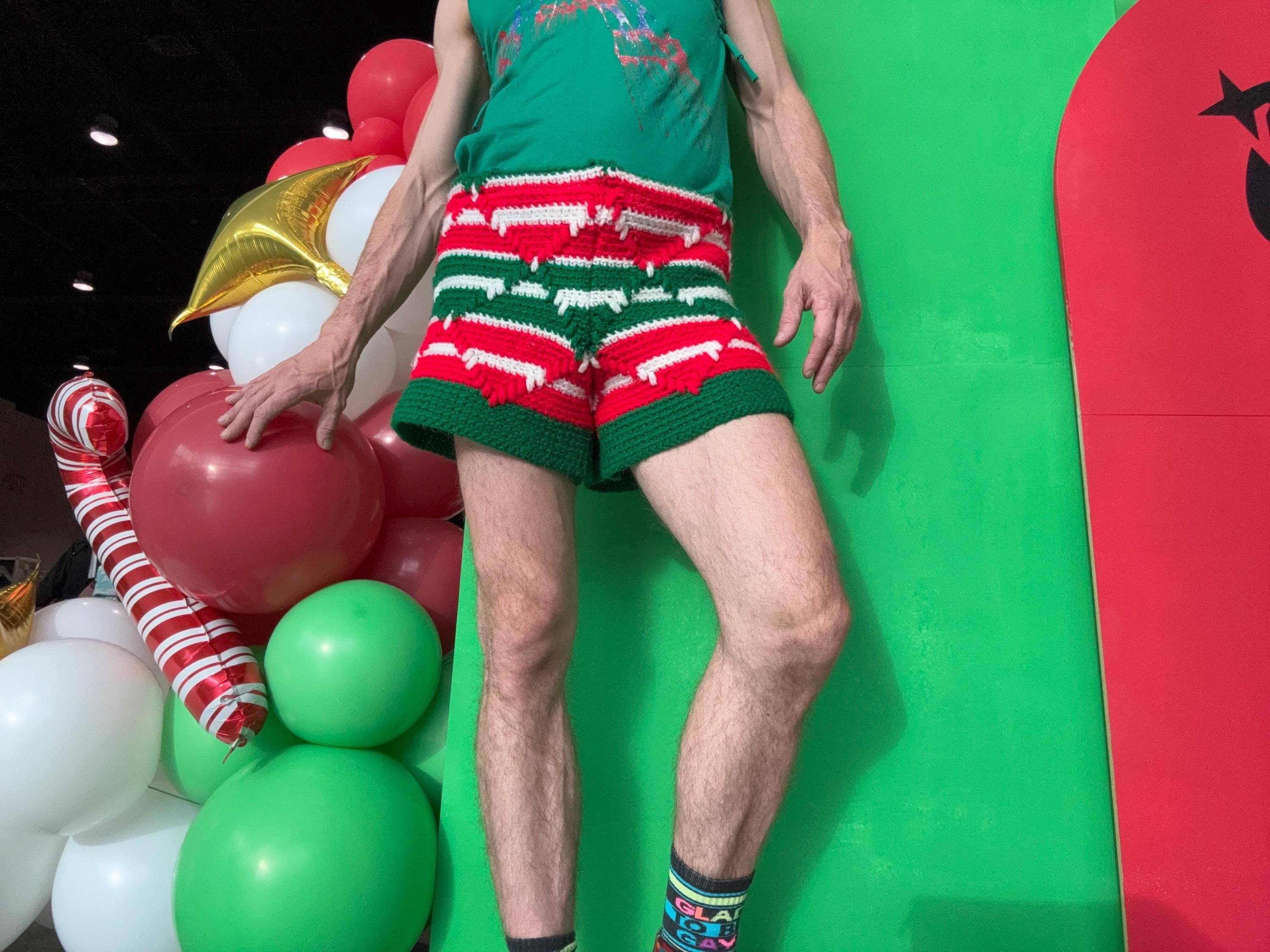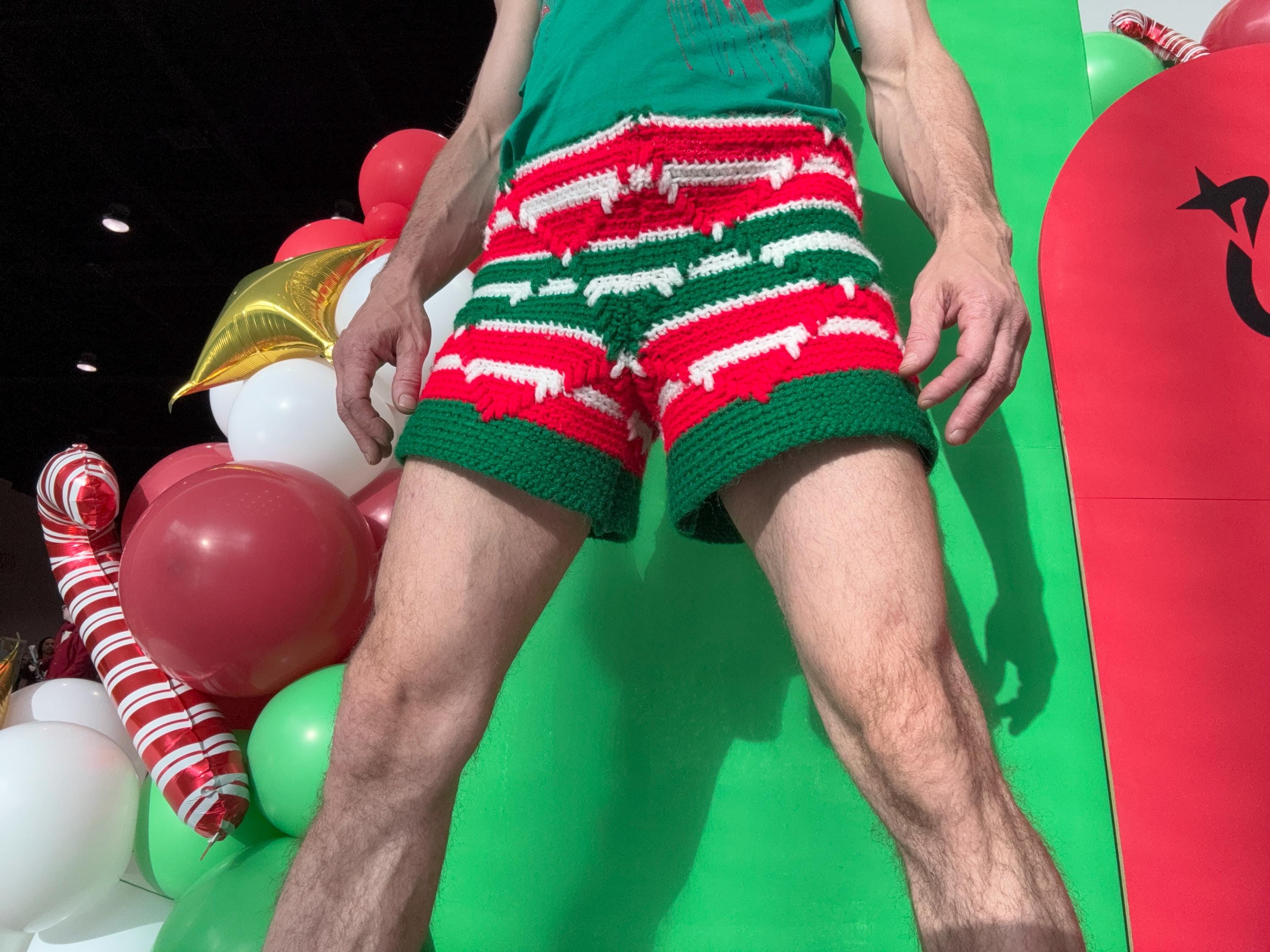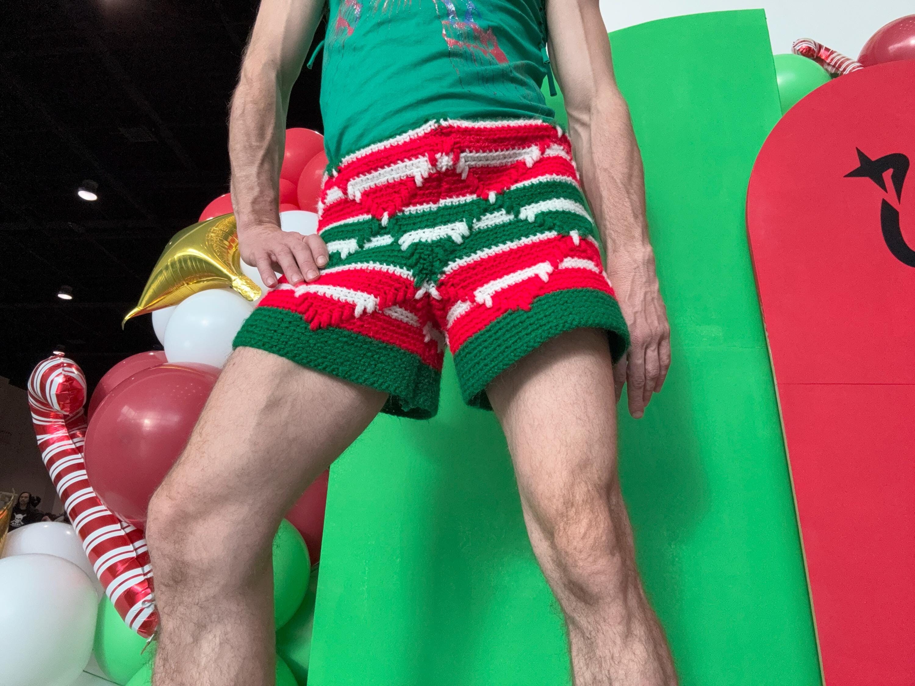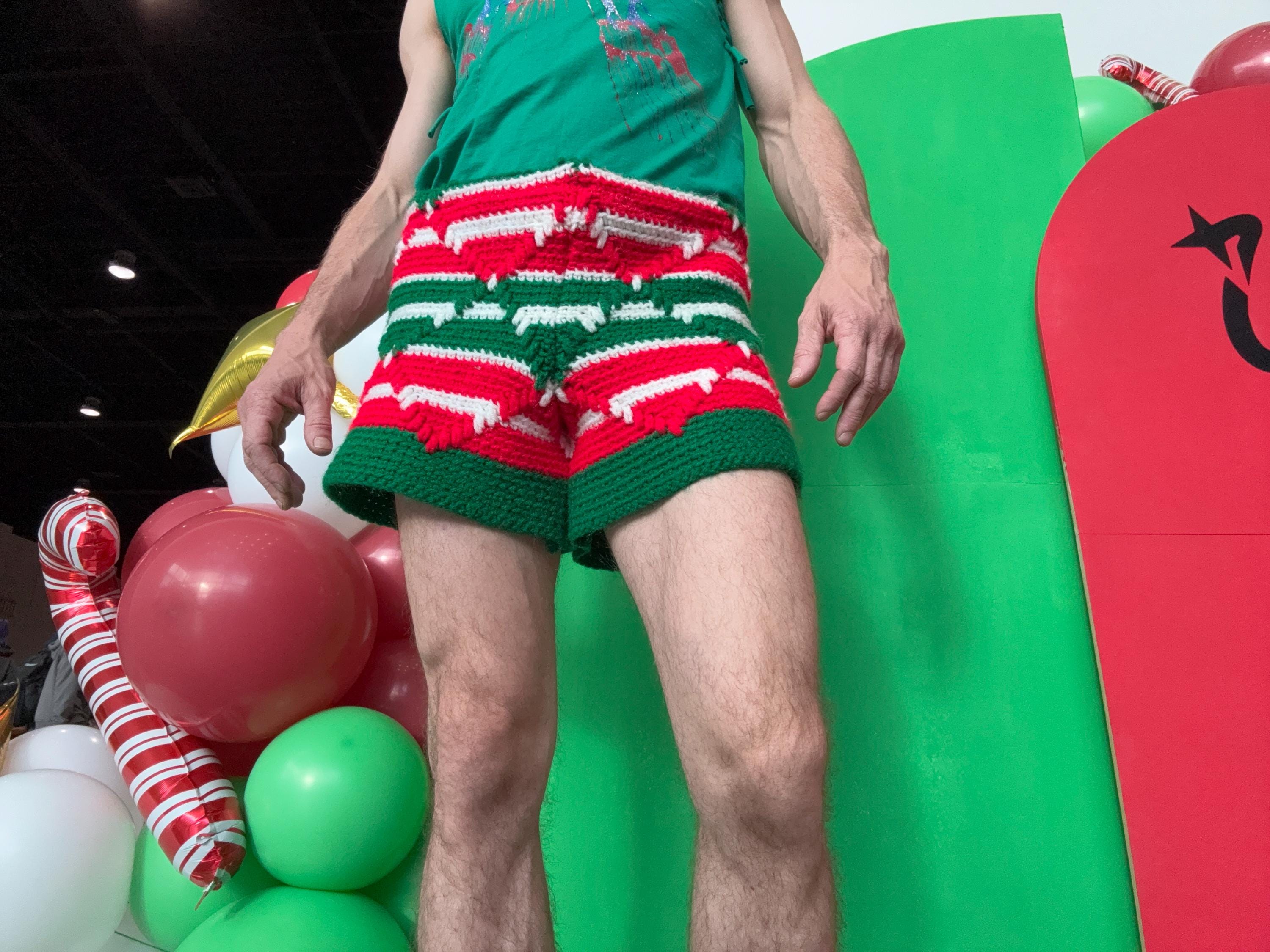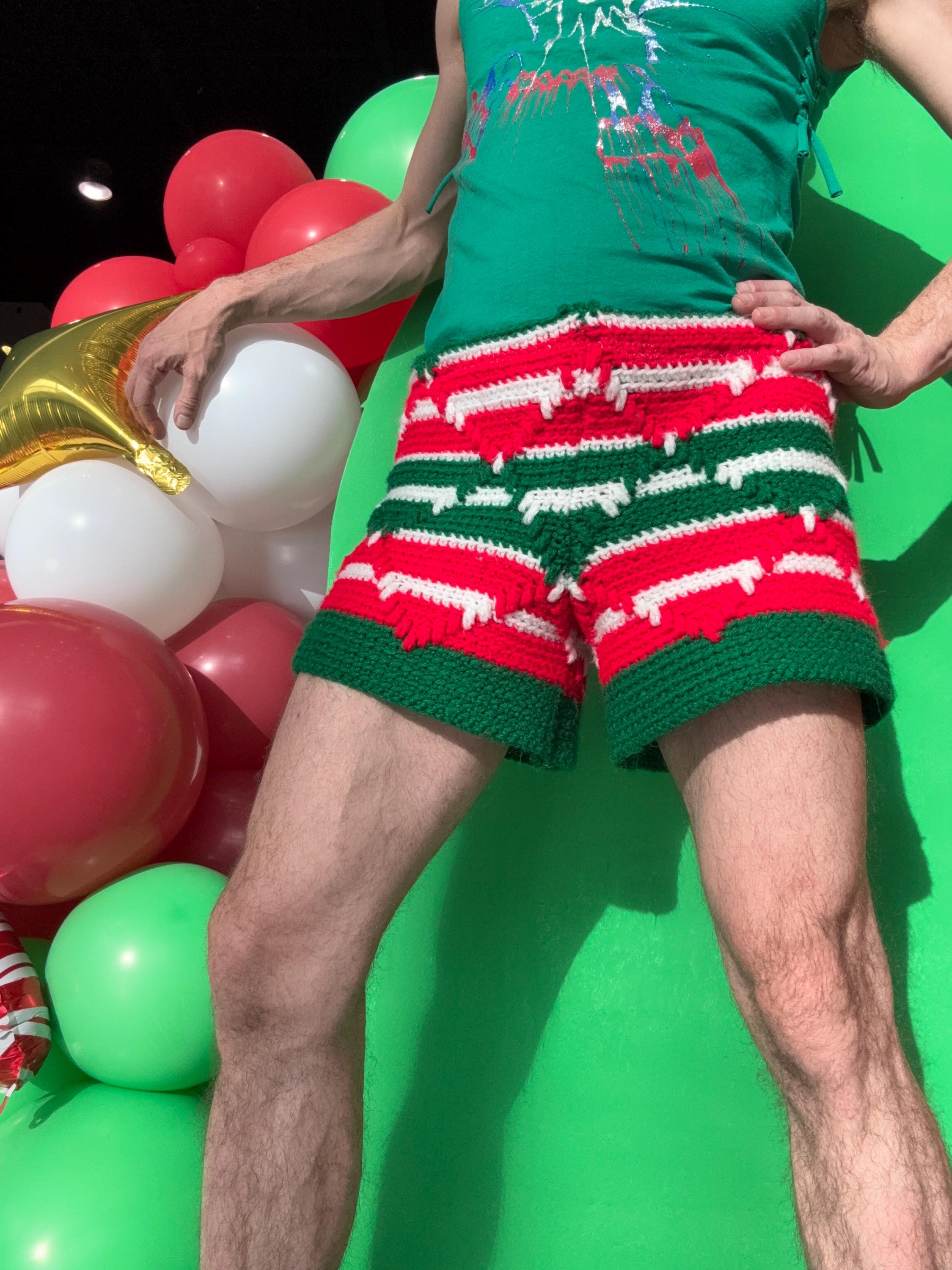 These are crochet shorts with holiday stripes. Made from a vintage afghan blanket crocheted in 100% acrylic yarn.