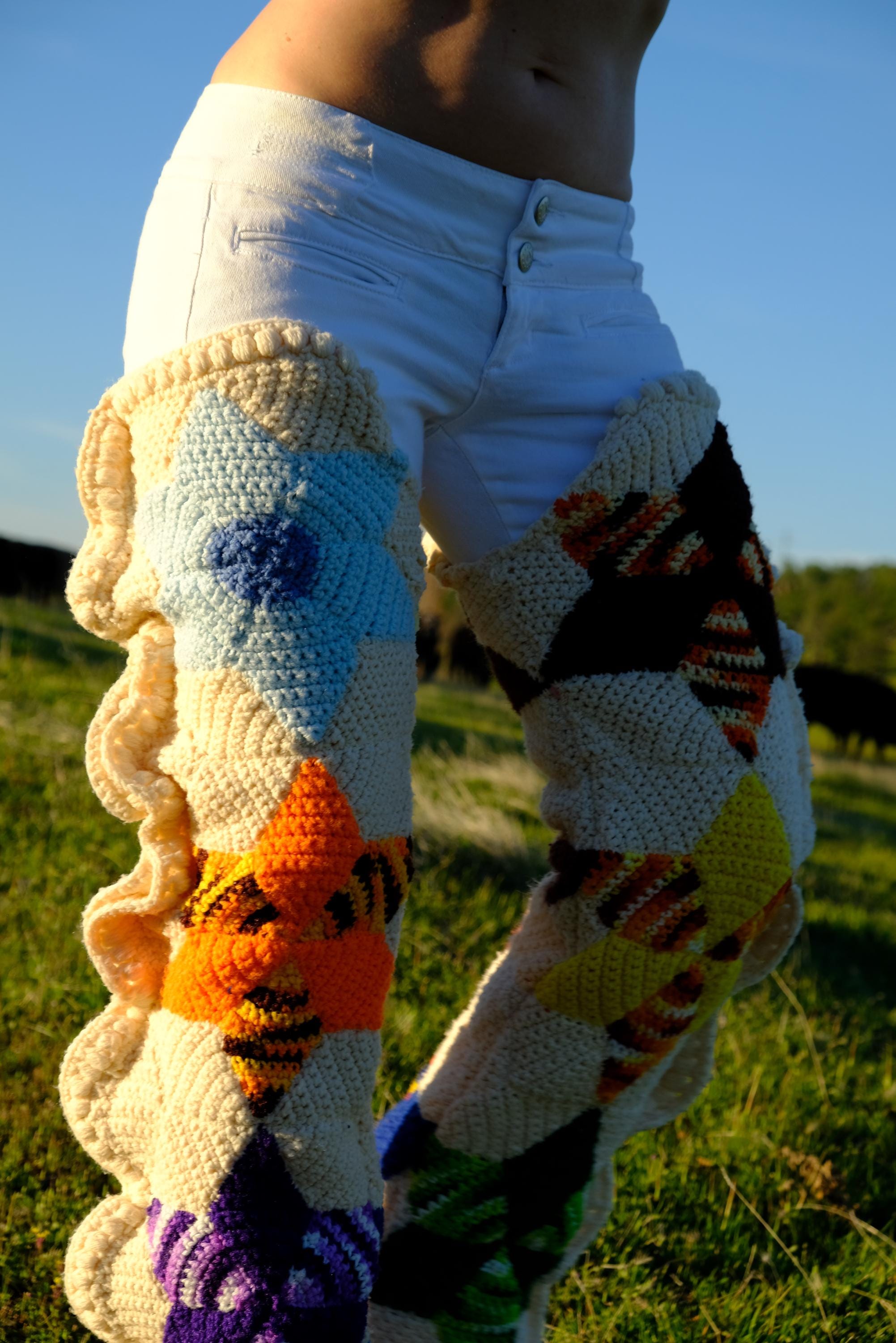 These are crochet chaps with multicolor stars on an ivory white background, with side ruffles. Fashioned from a vintage afghan blanket crocheted in 100% acrylic yarn.