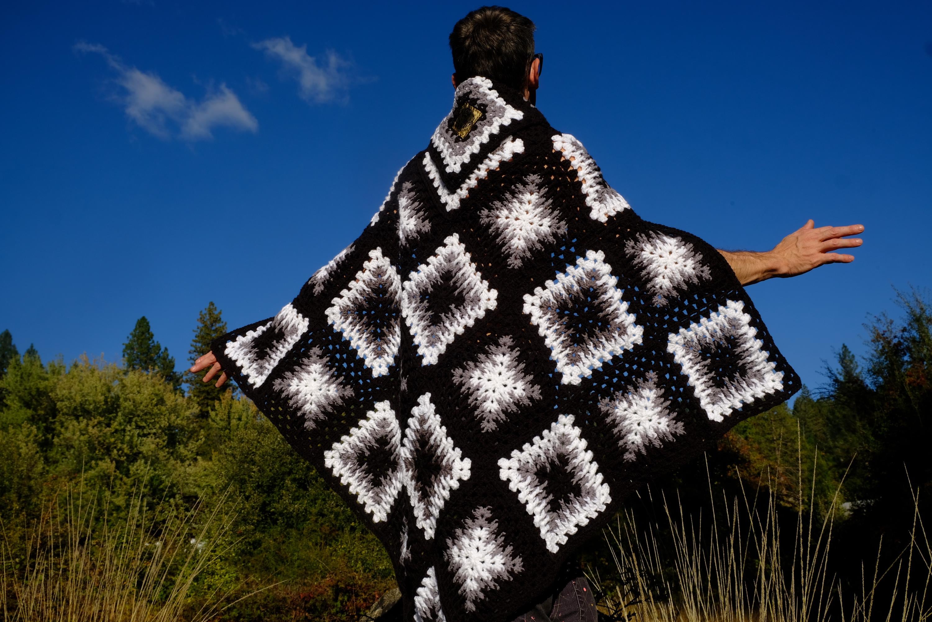 This is a crochet cape in black and white checkered squares. Beautifully up-cycled from a crocheted afghan blanket in 100% soft acrylic yarn and exquisitely tailored by yours truly, Lord von Schmitt, however this was never used as a blanket and is in new condition.