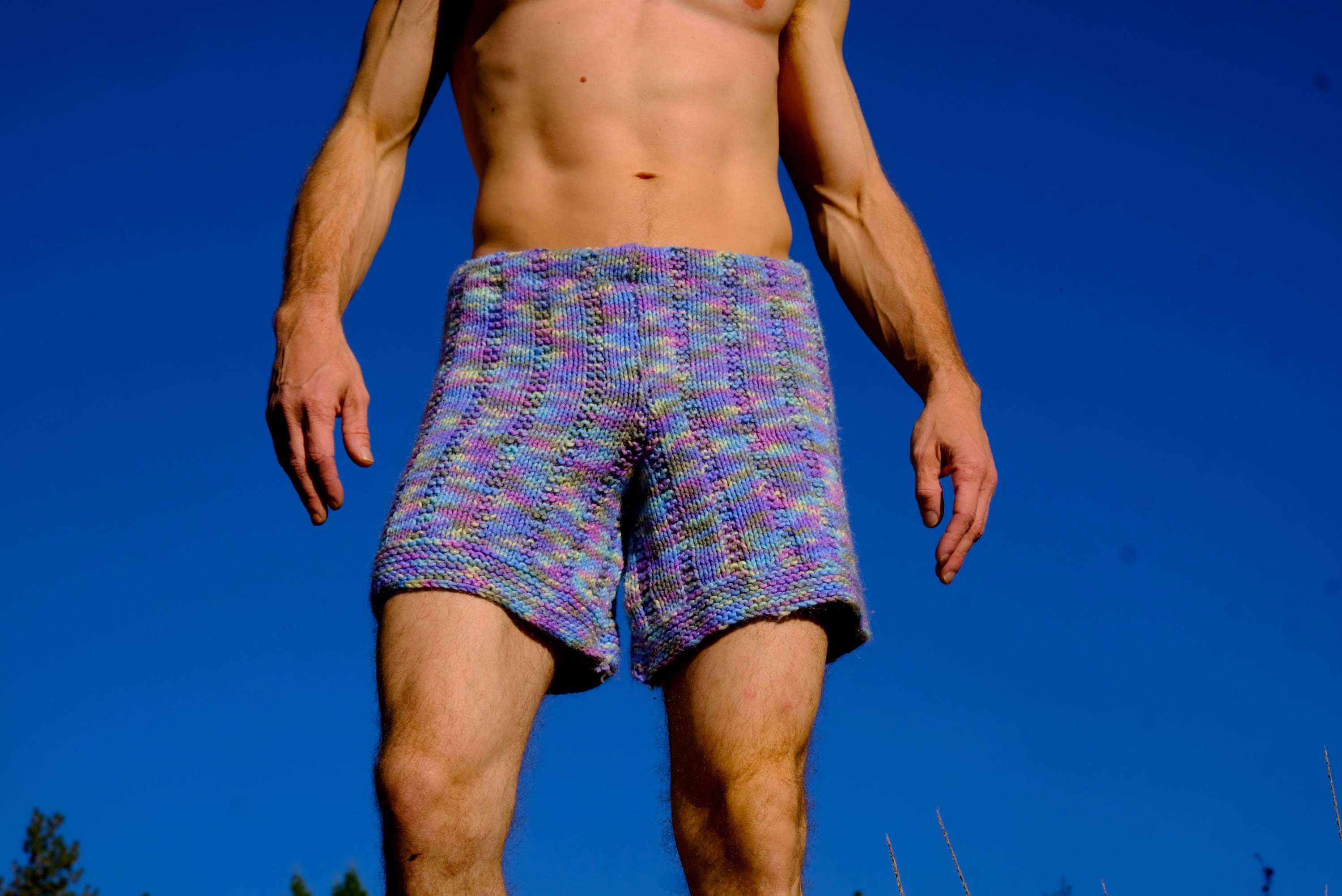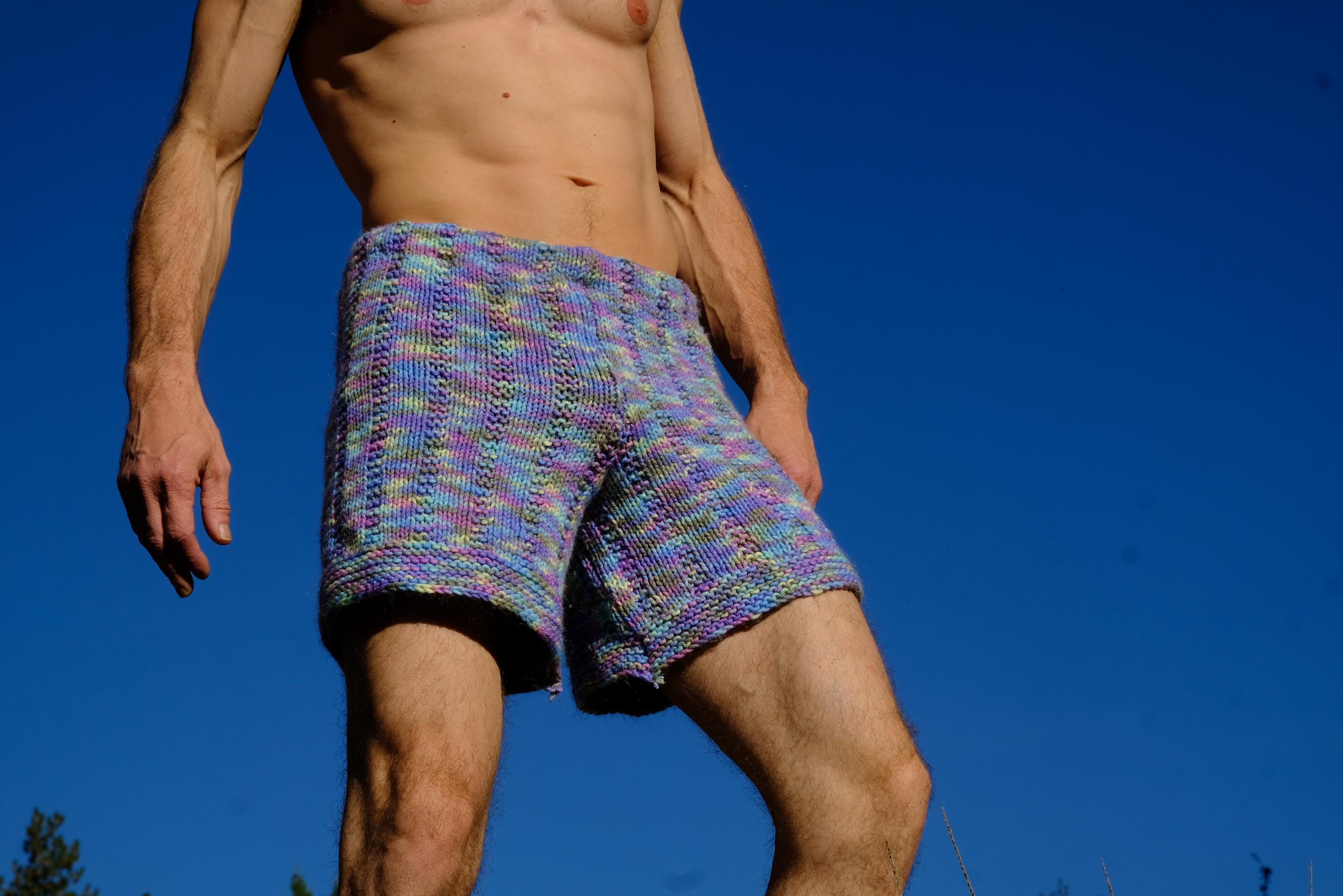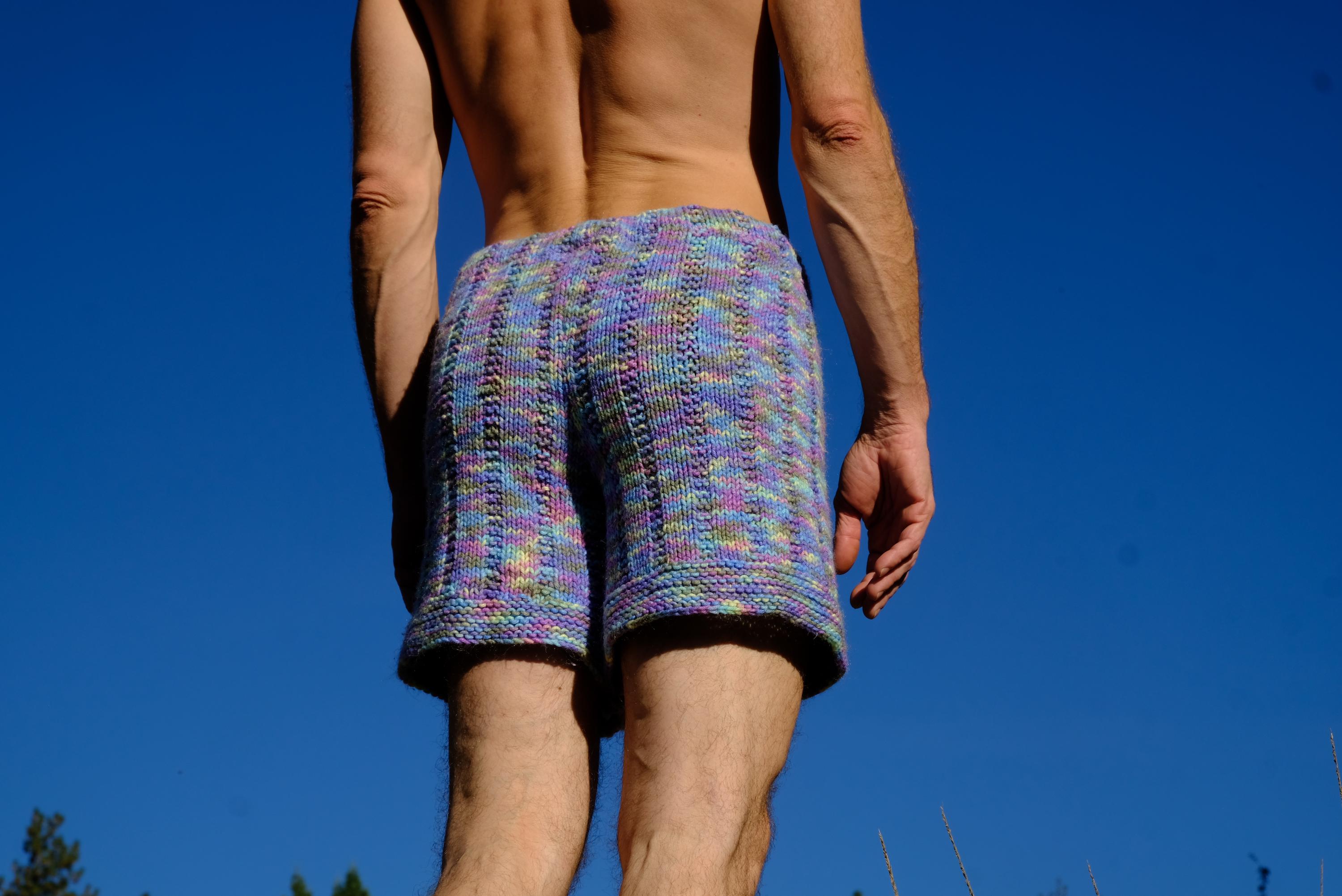 These are knit shorts in variegated shades of purple and turquoise. Repurposed from a vintage afghan blanket knitted in 100% acrylic yarn.