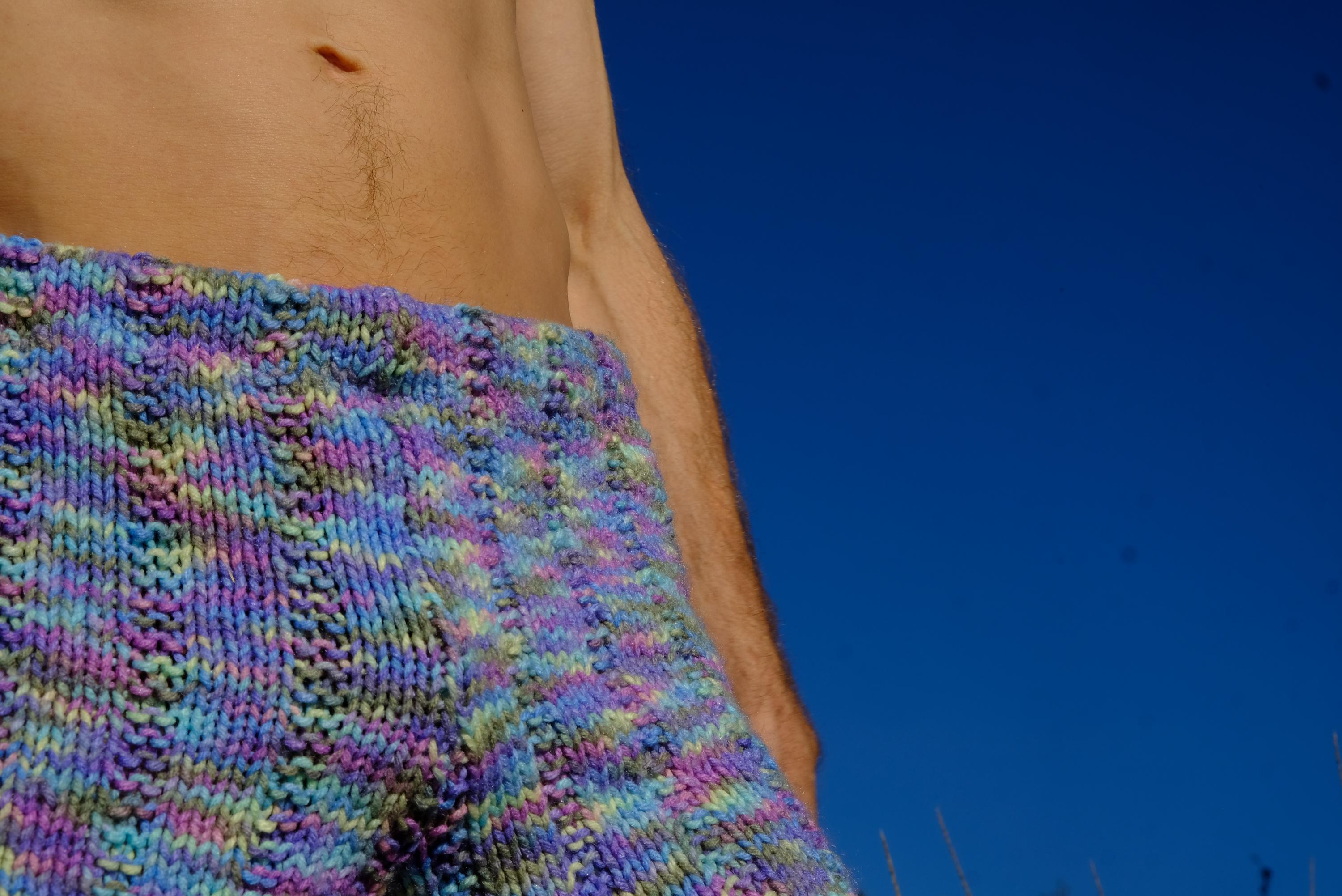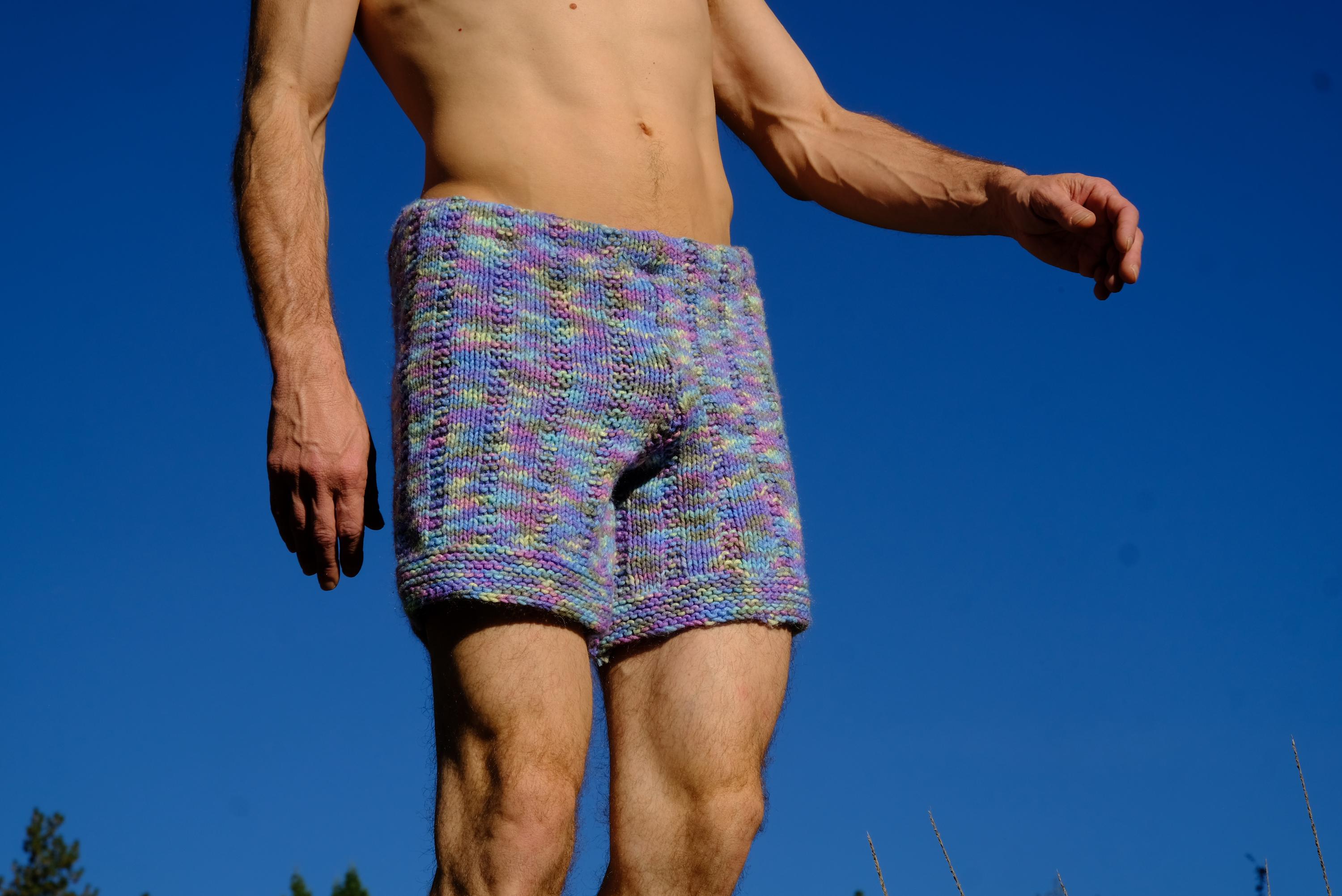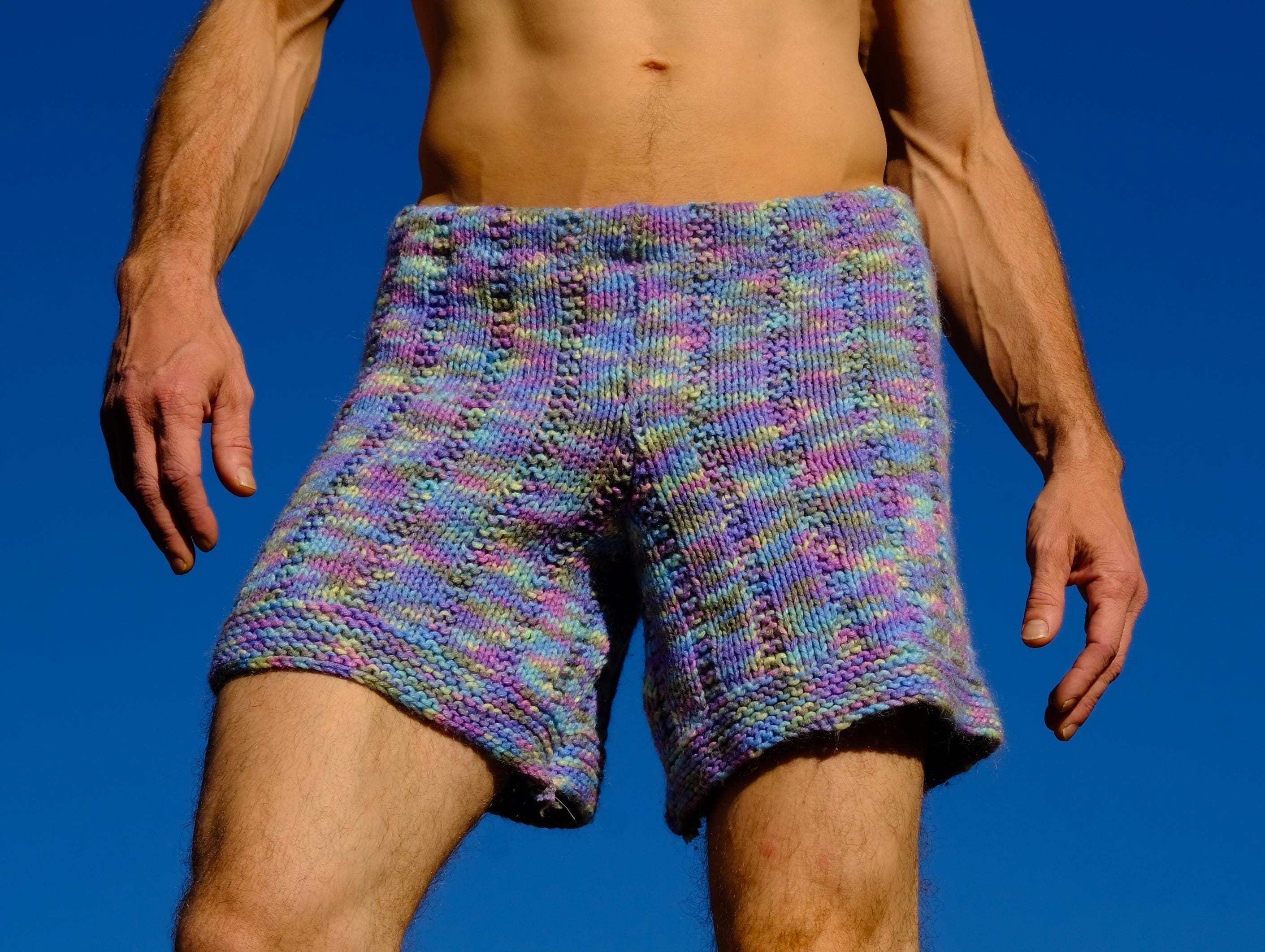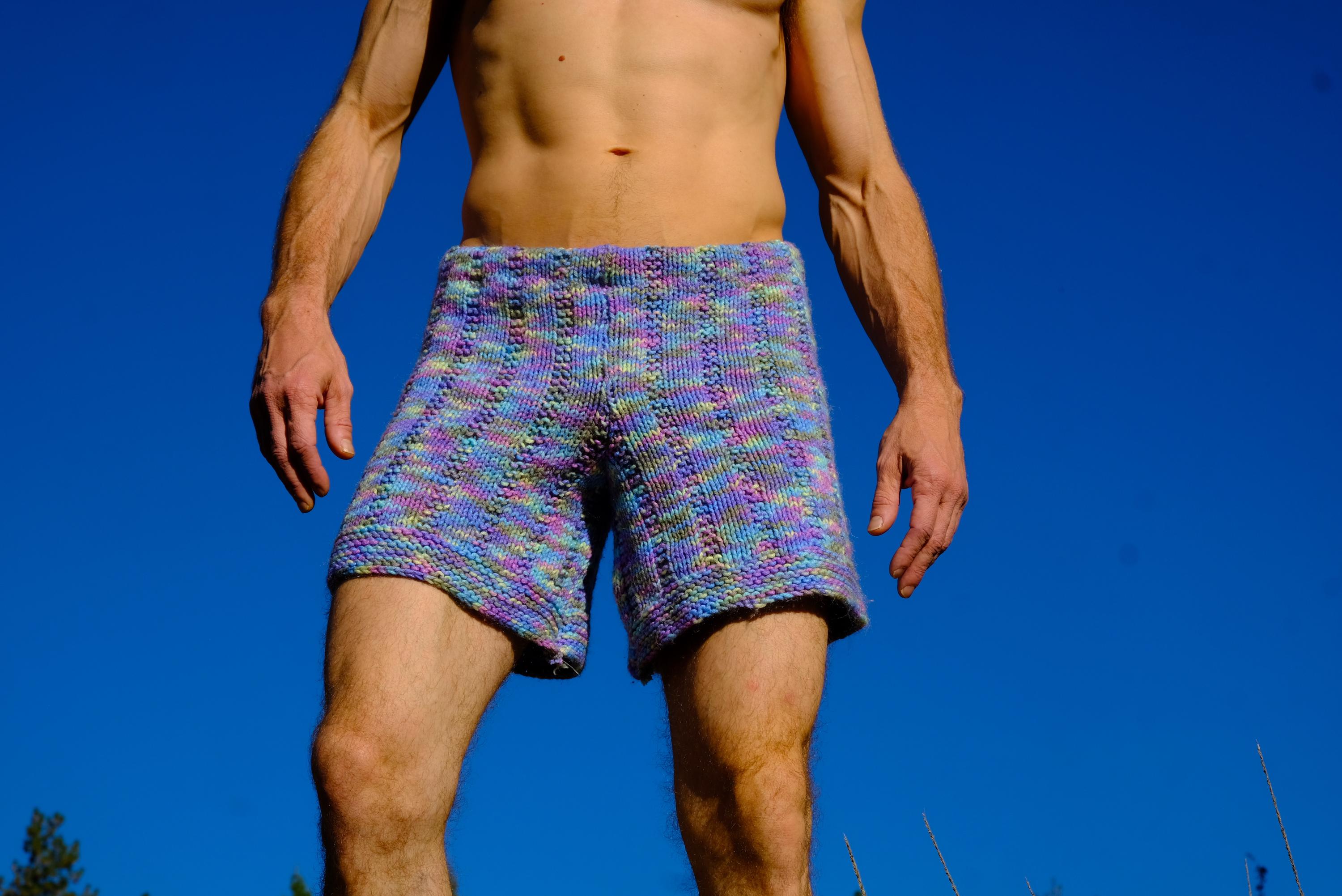 These are knit shorts in variegated shades of purple and turquoise. Repurposed from a vintage afghan blanket knitted in 100% acrylic yarn.