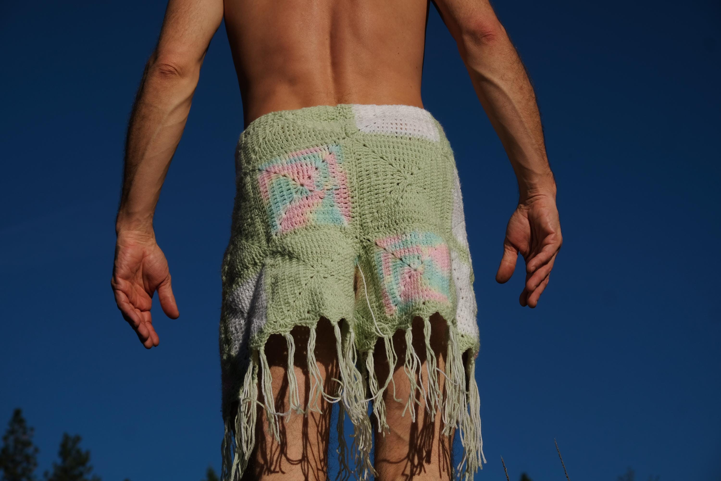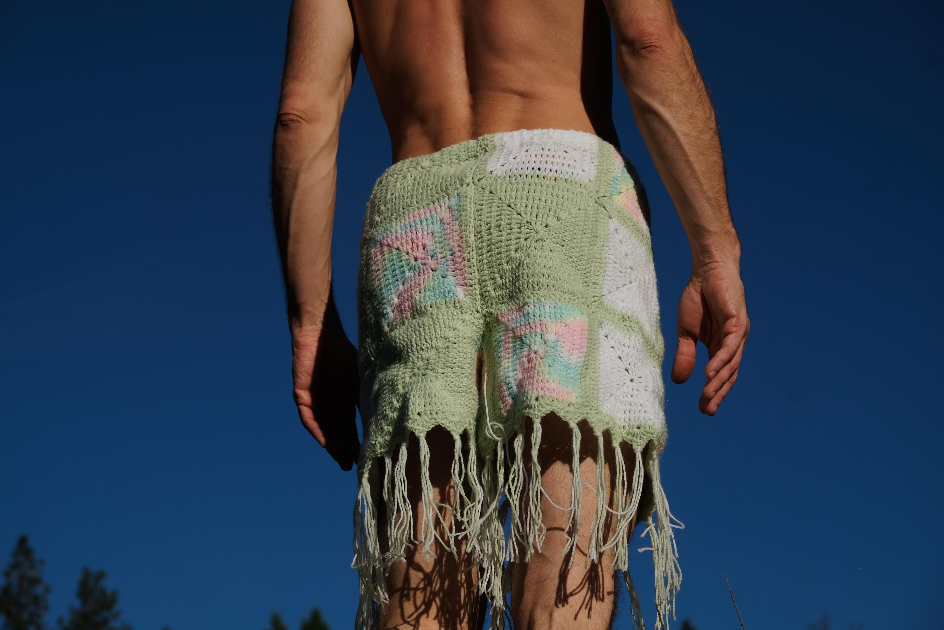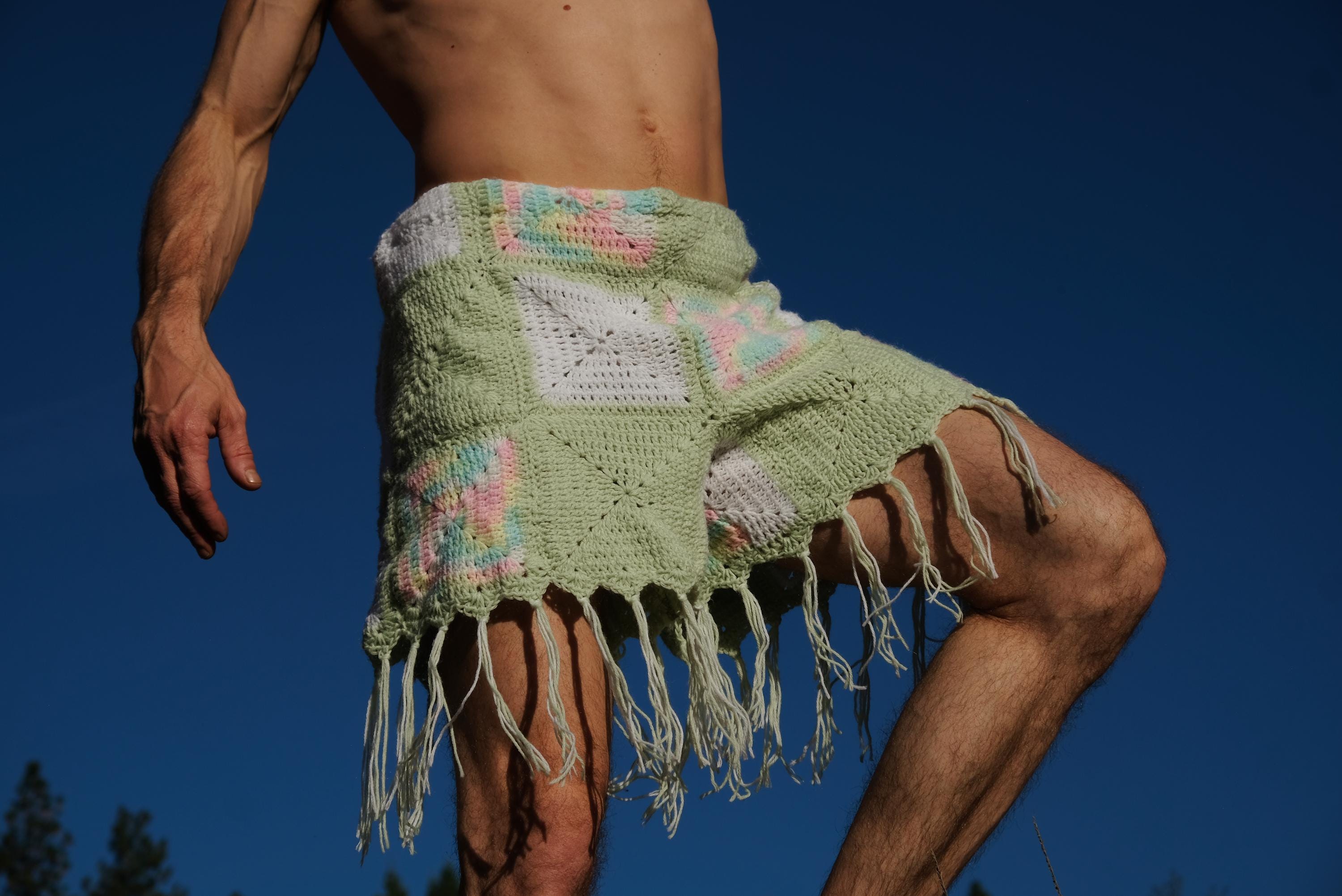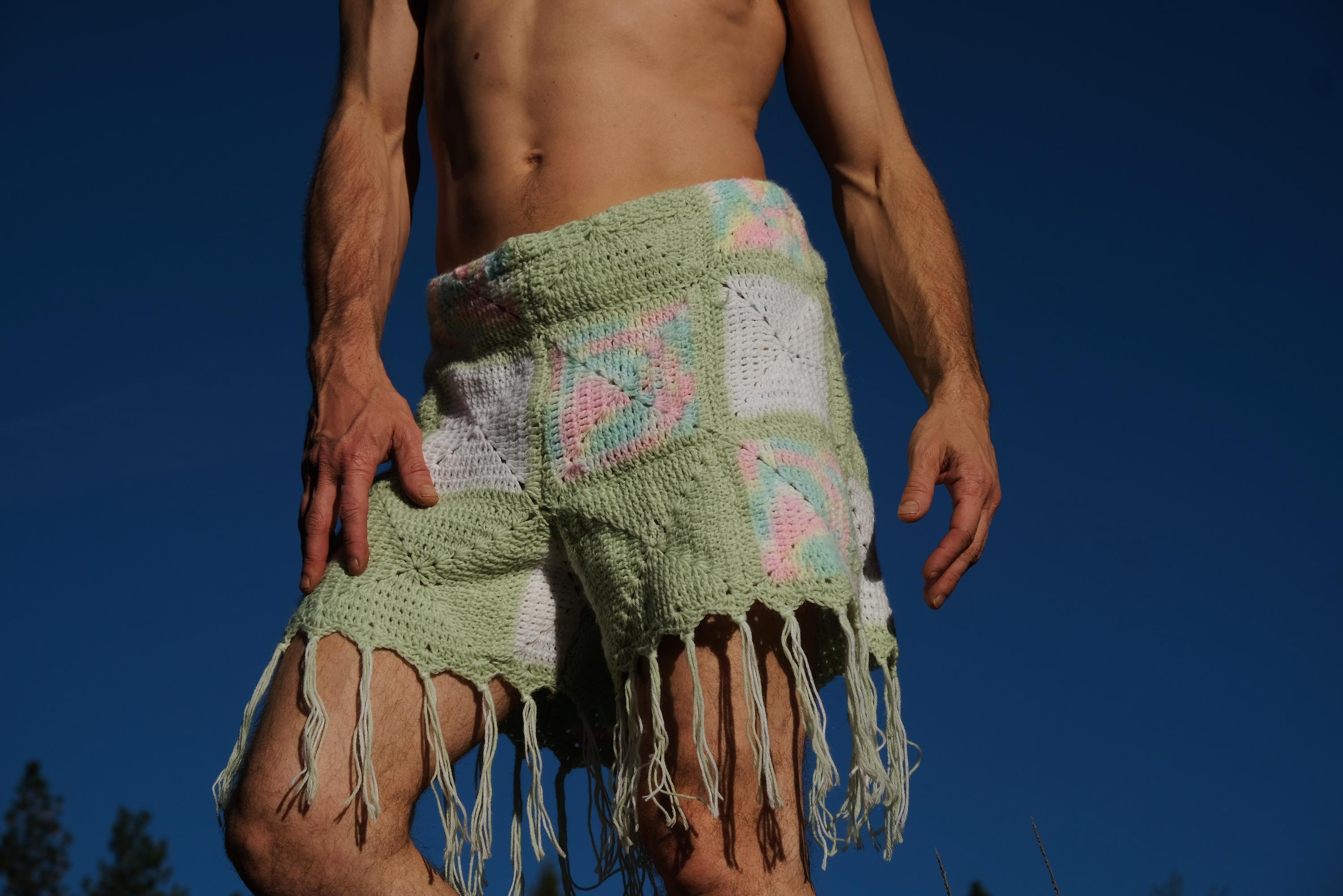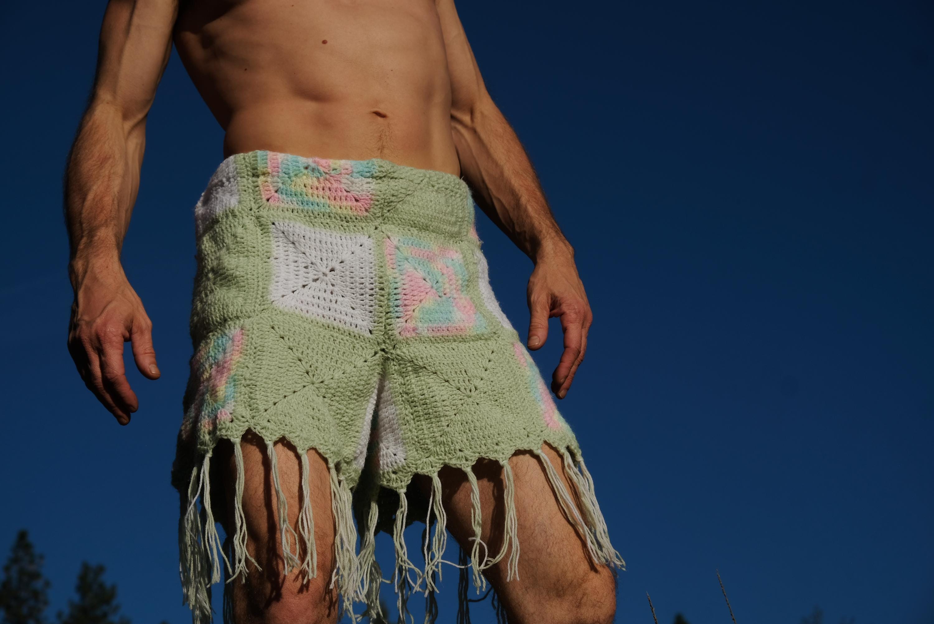 These are crochet shorts in pastel squares with fringe. Repurposed from a vintage afghan blanket crocheted in 100% acrylic yarn.