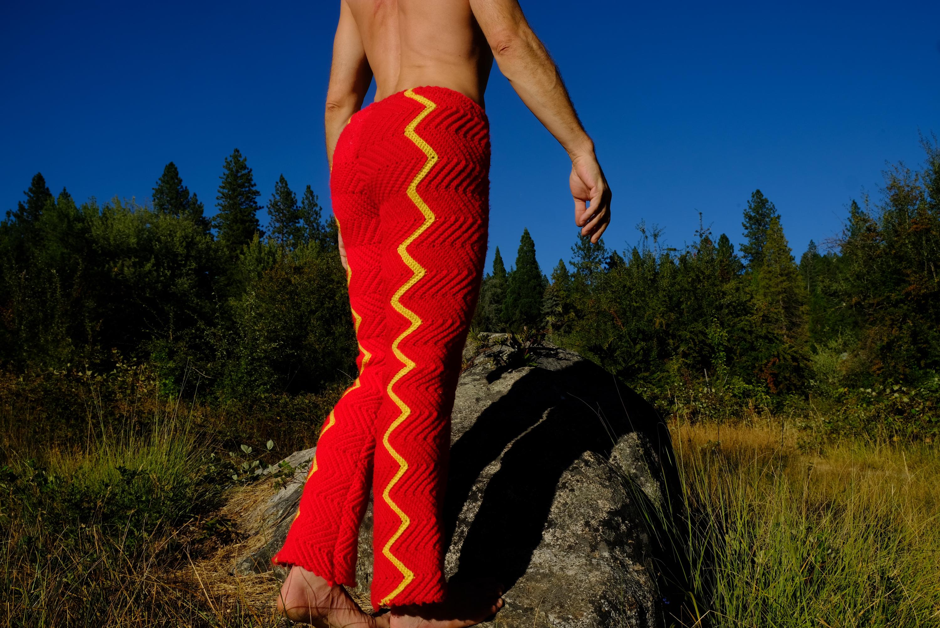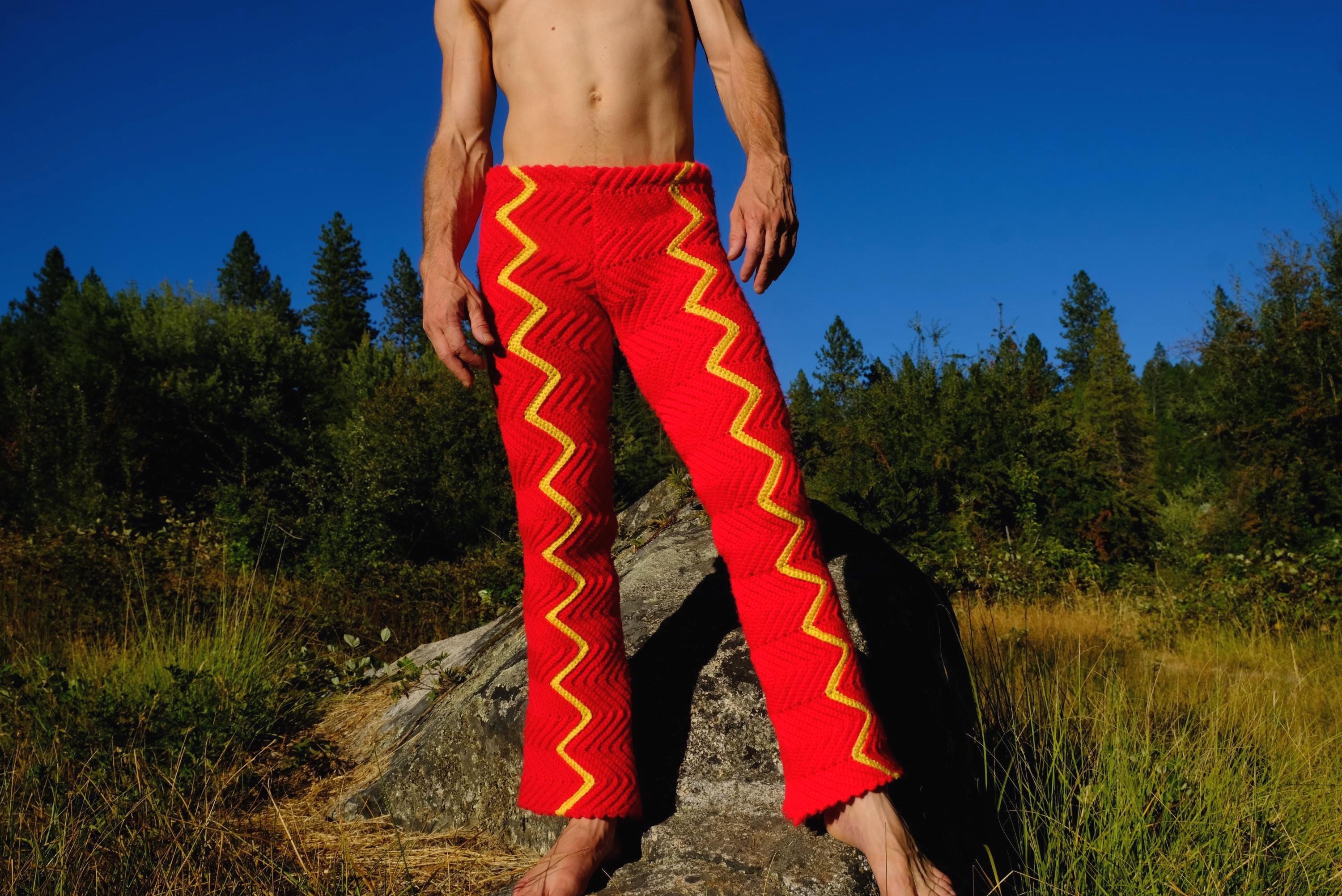 These are crochet pants with yellow lightning bolts on red. Fashioned from a vintage afghan blanket crocheted in 100% acrylic yarn.