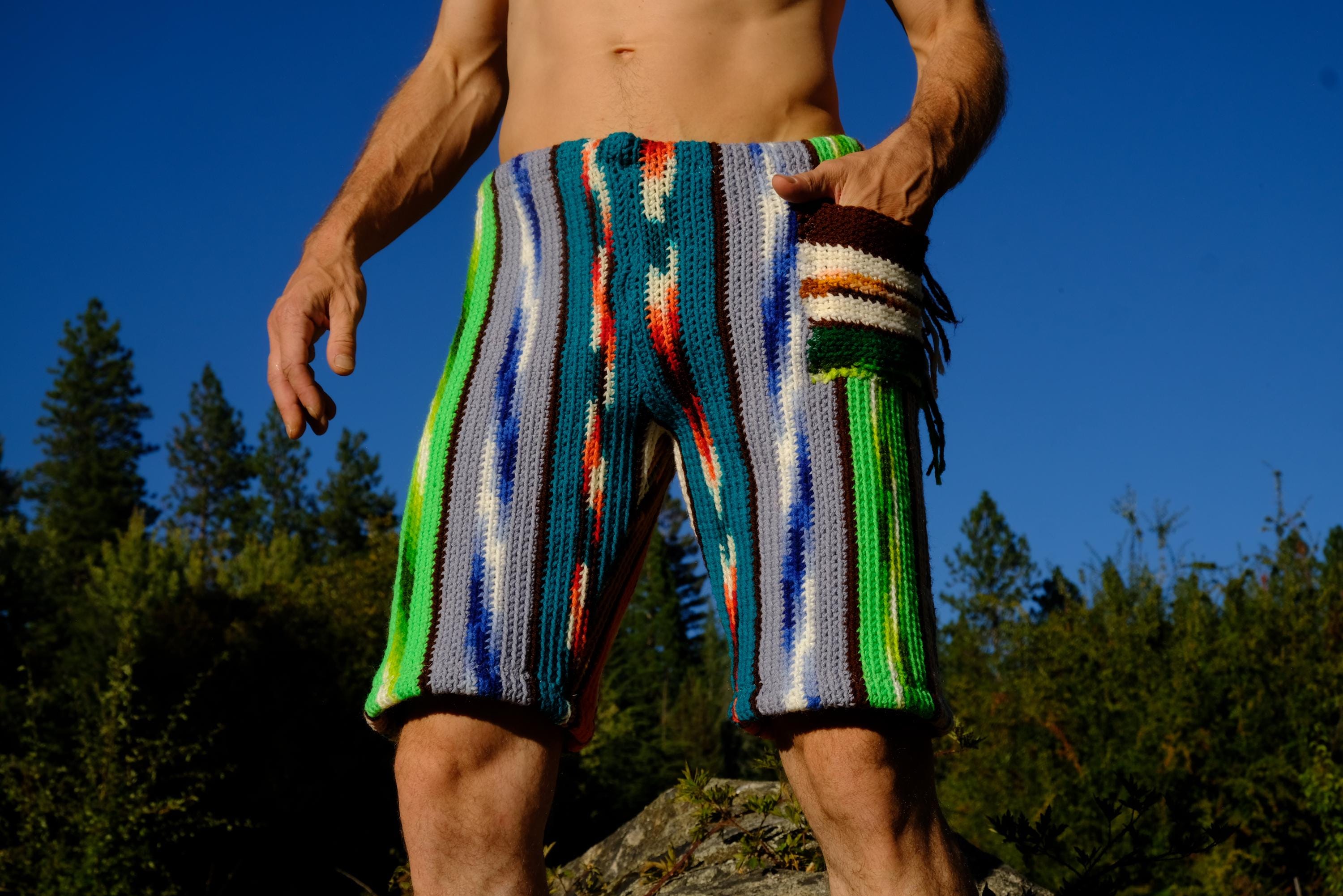 These are crochet shorts with southwest stripes and fringe. Repurposed from a vintage afghan blanket crocheted in 100% acrylic yarn.