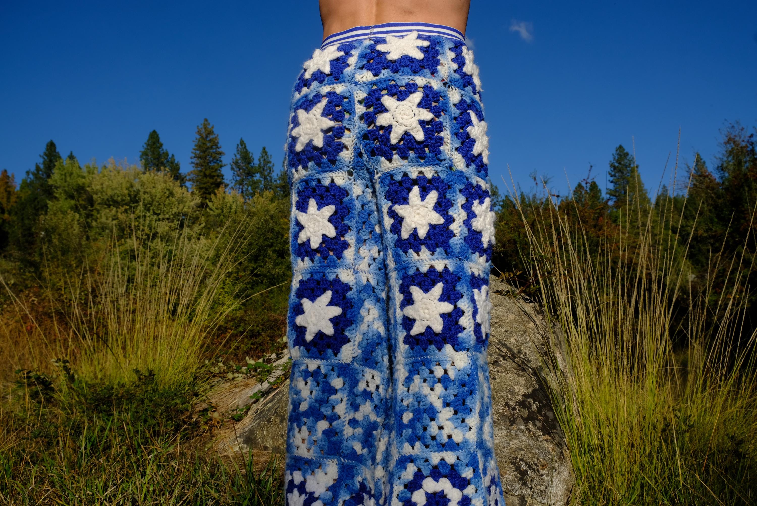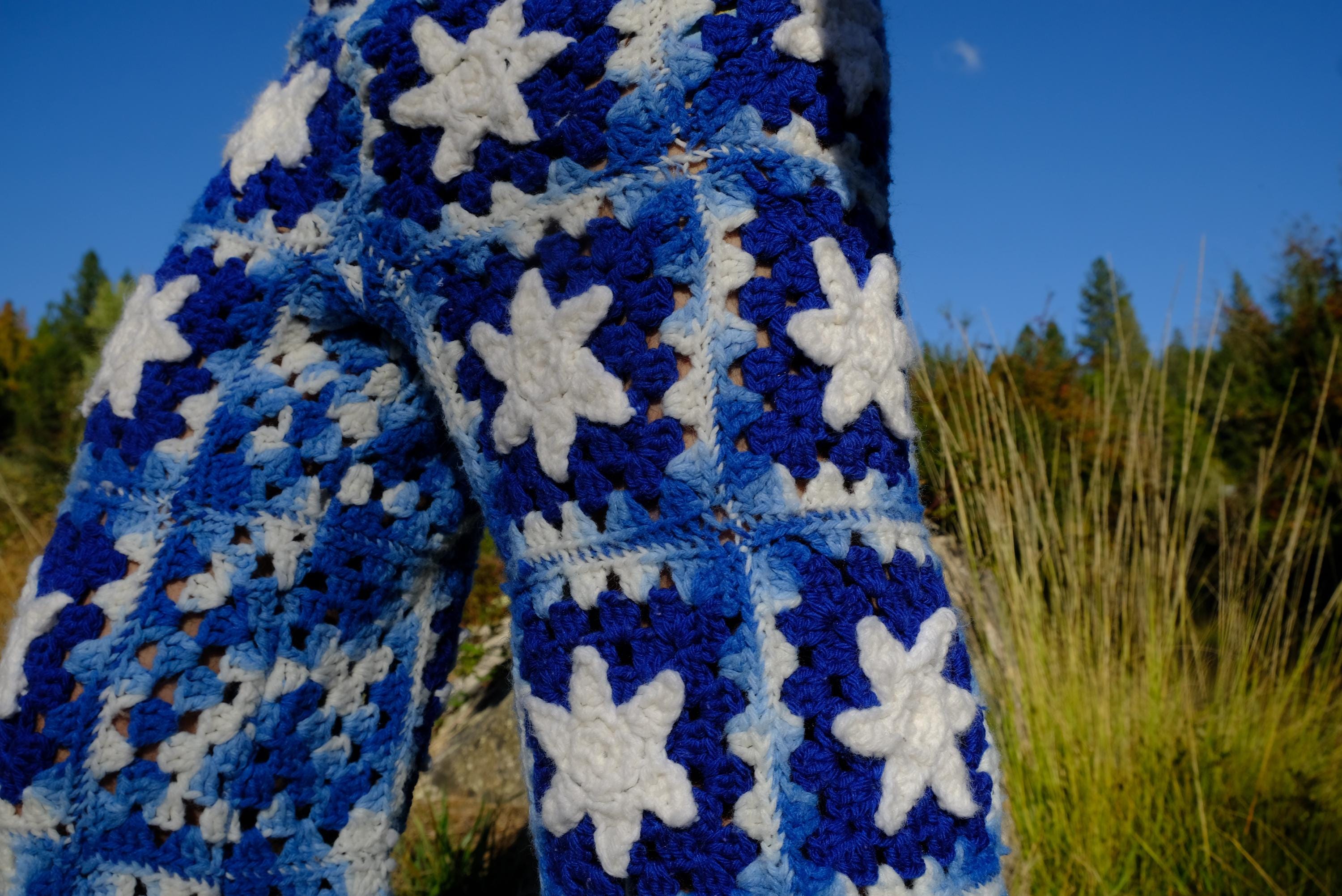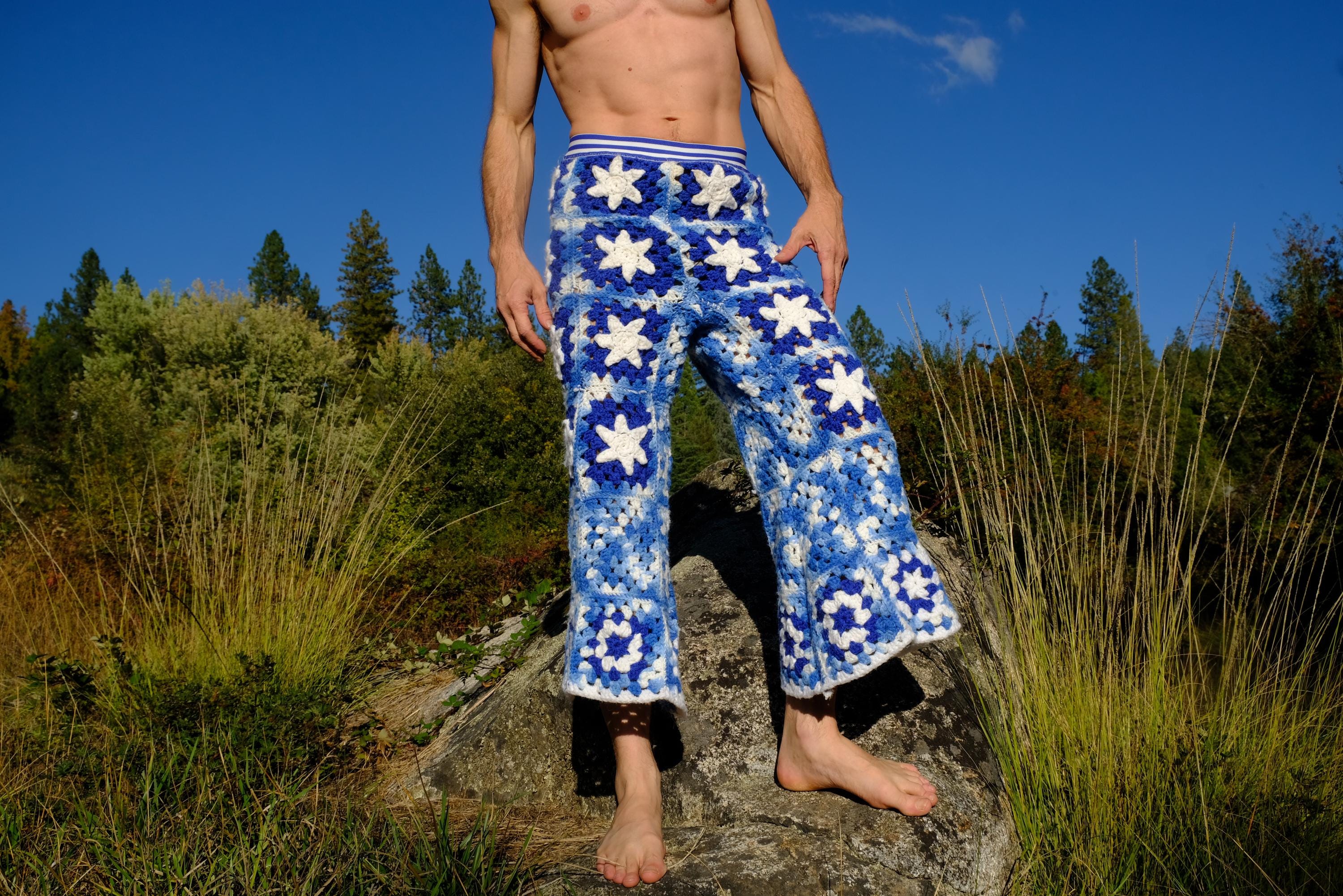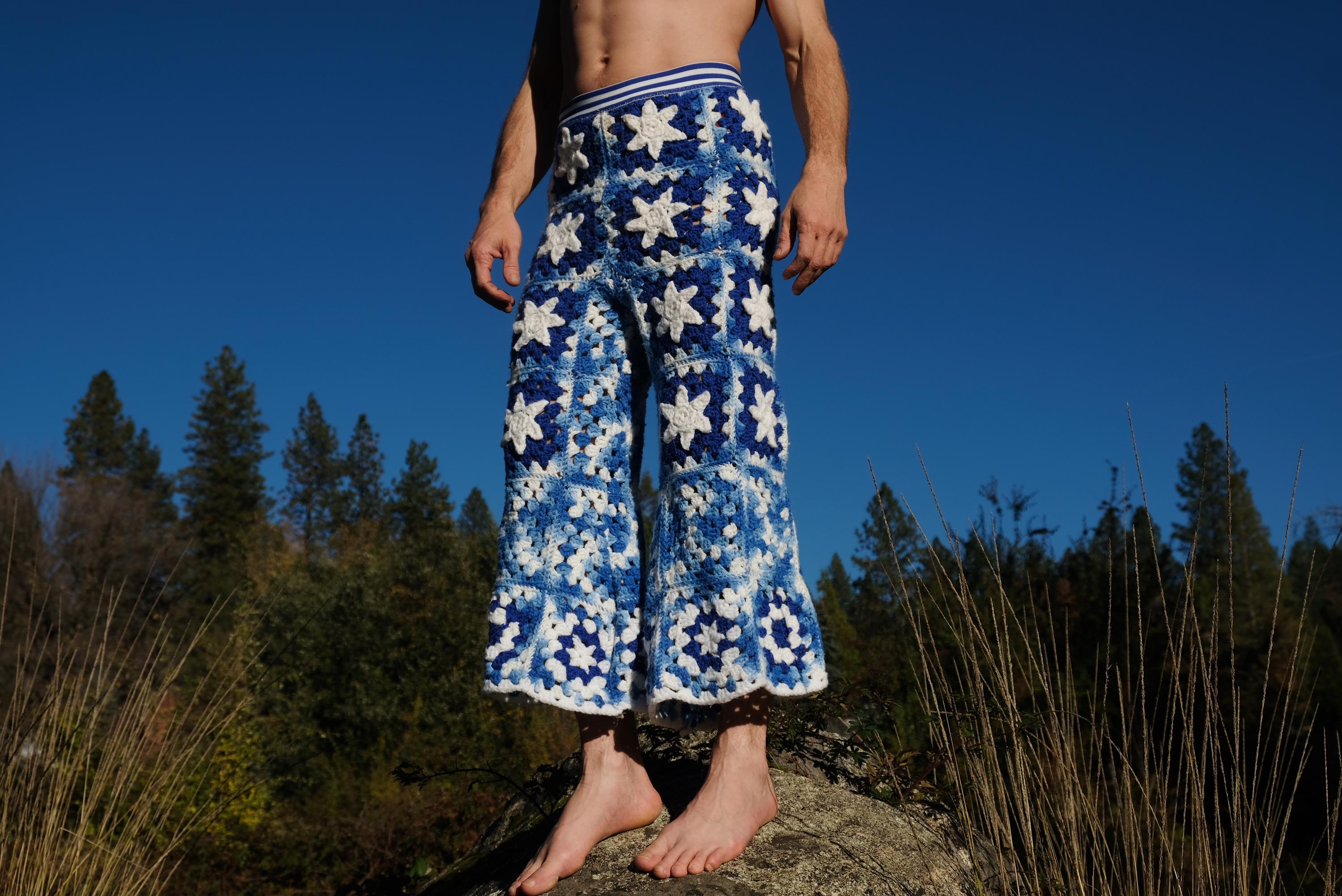 These are crochet pants with crochet squares and stars. Fashioned from a vintage afghan blanket crocheted in 100% acrylic yarn.