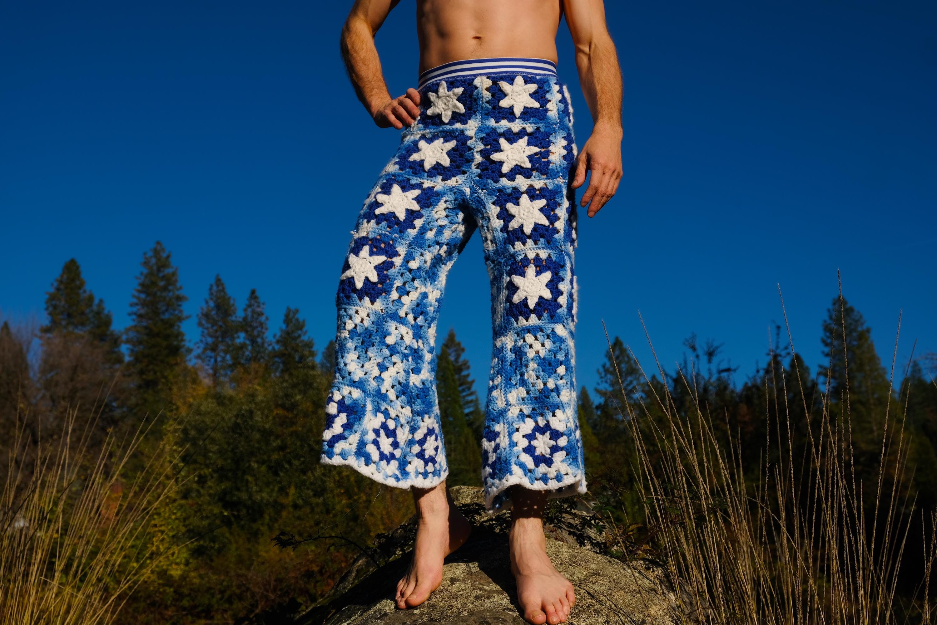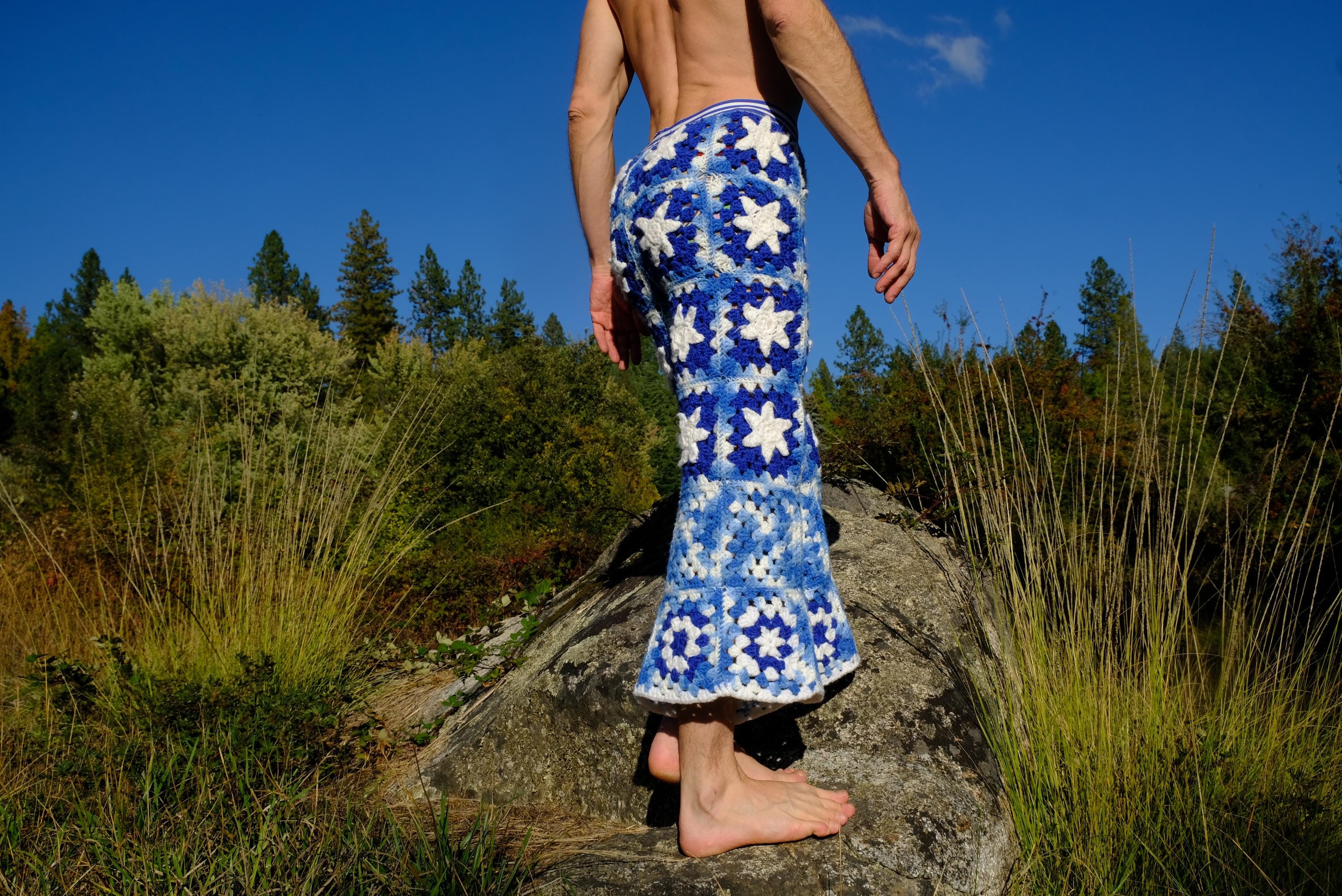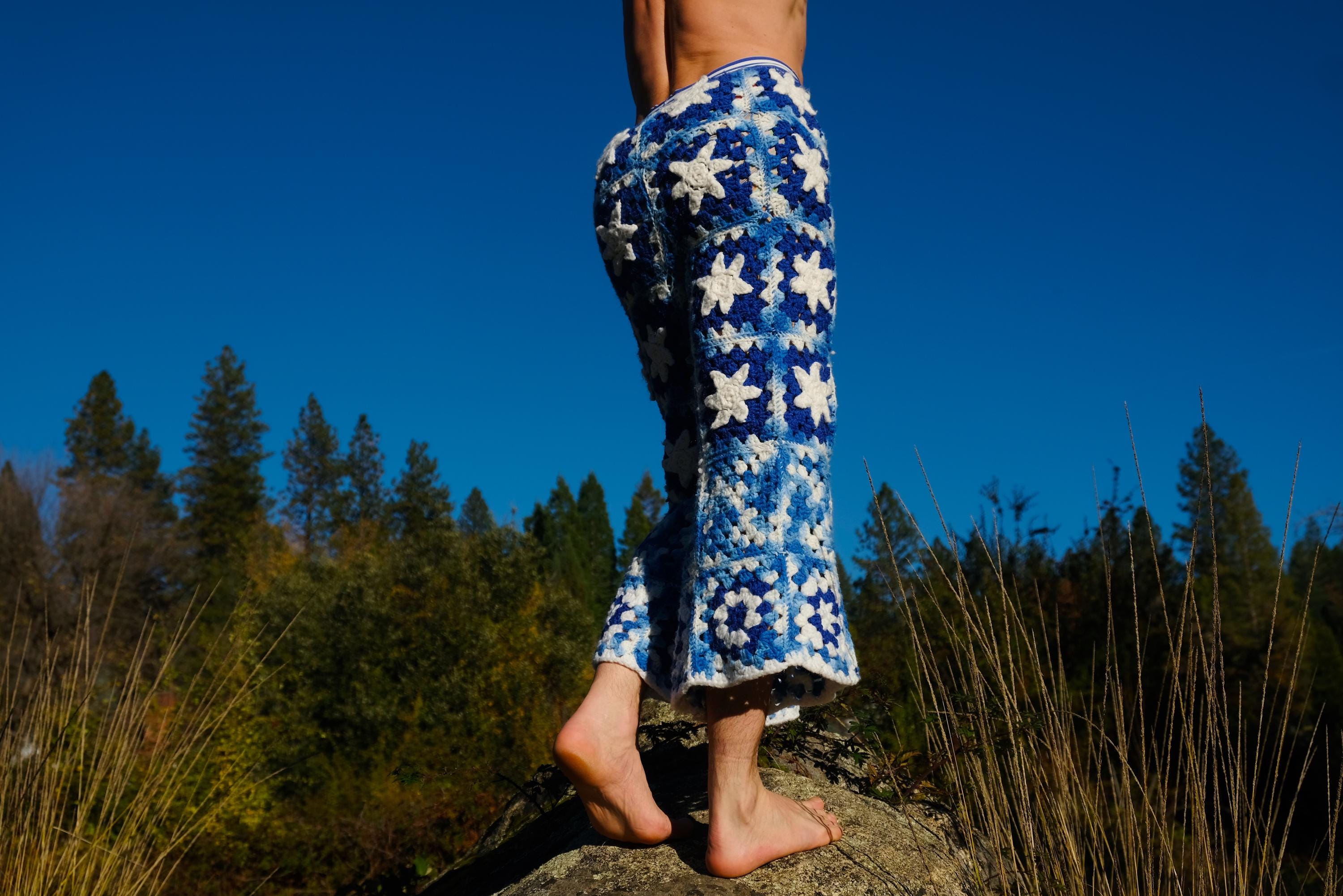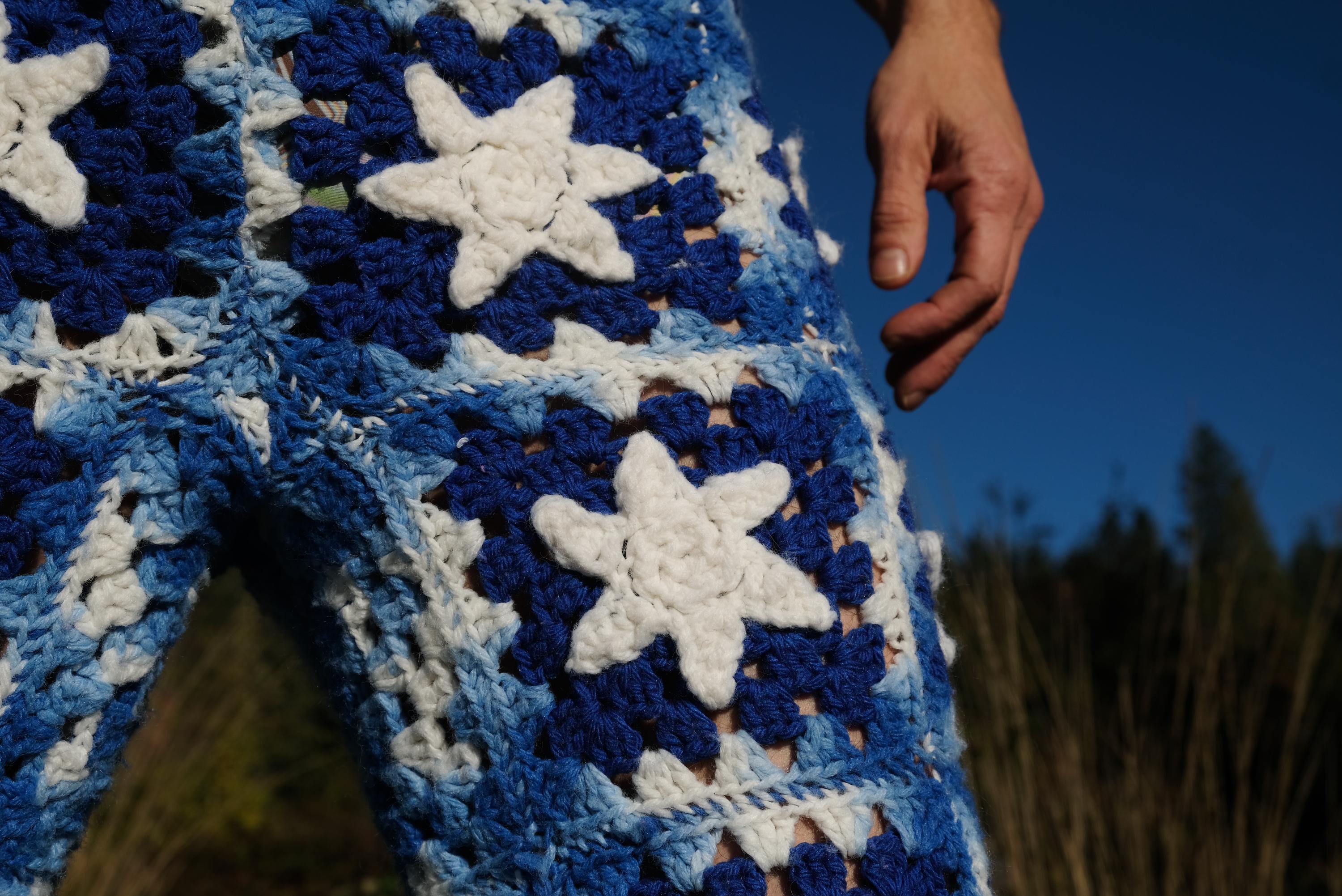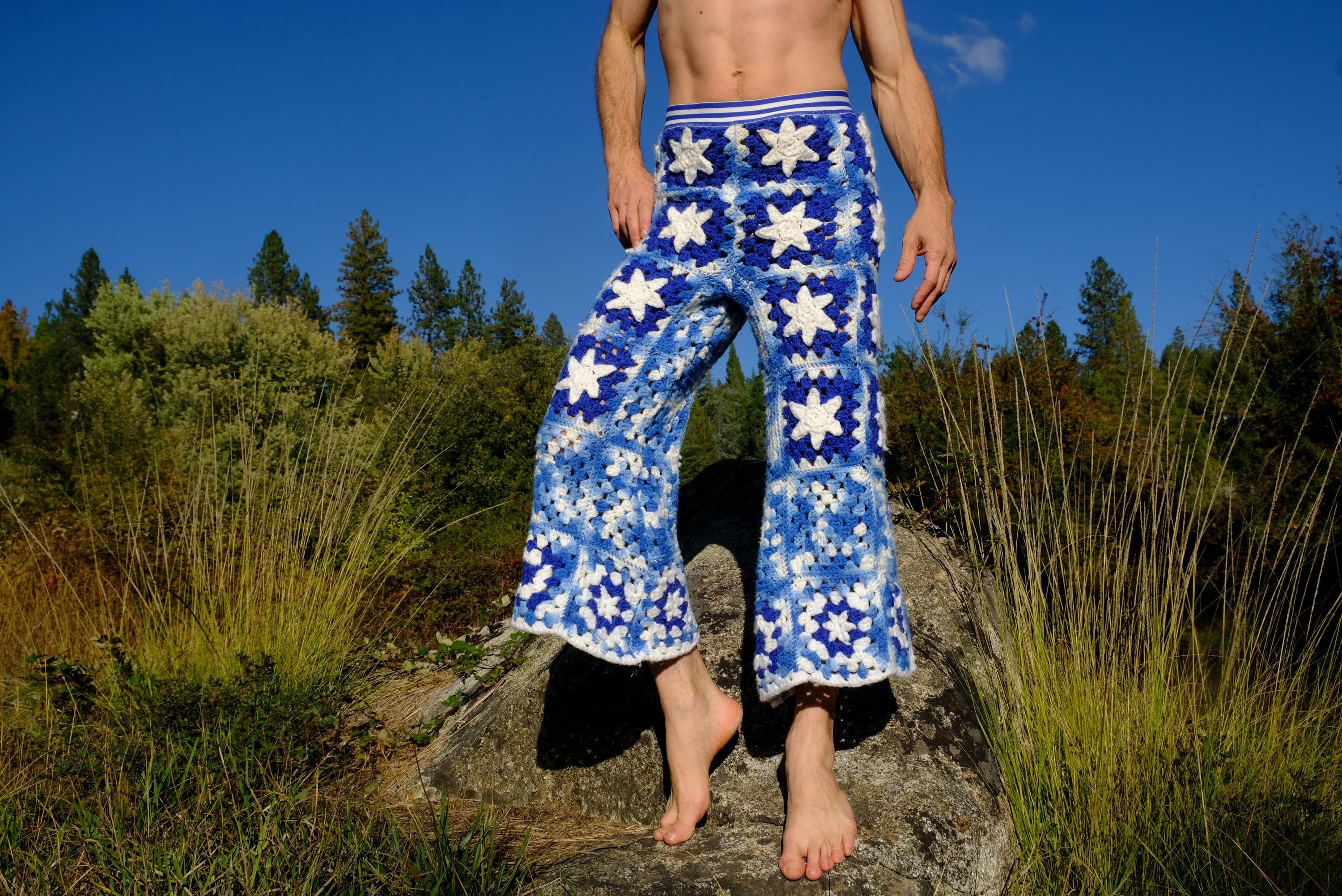 These are crochet pants with crochet squares and stars. Fashioned from a vintage afghan blanket crocheted in 100% acrylic yarn.