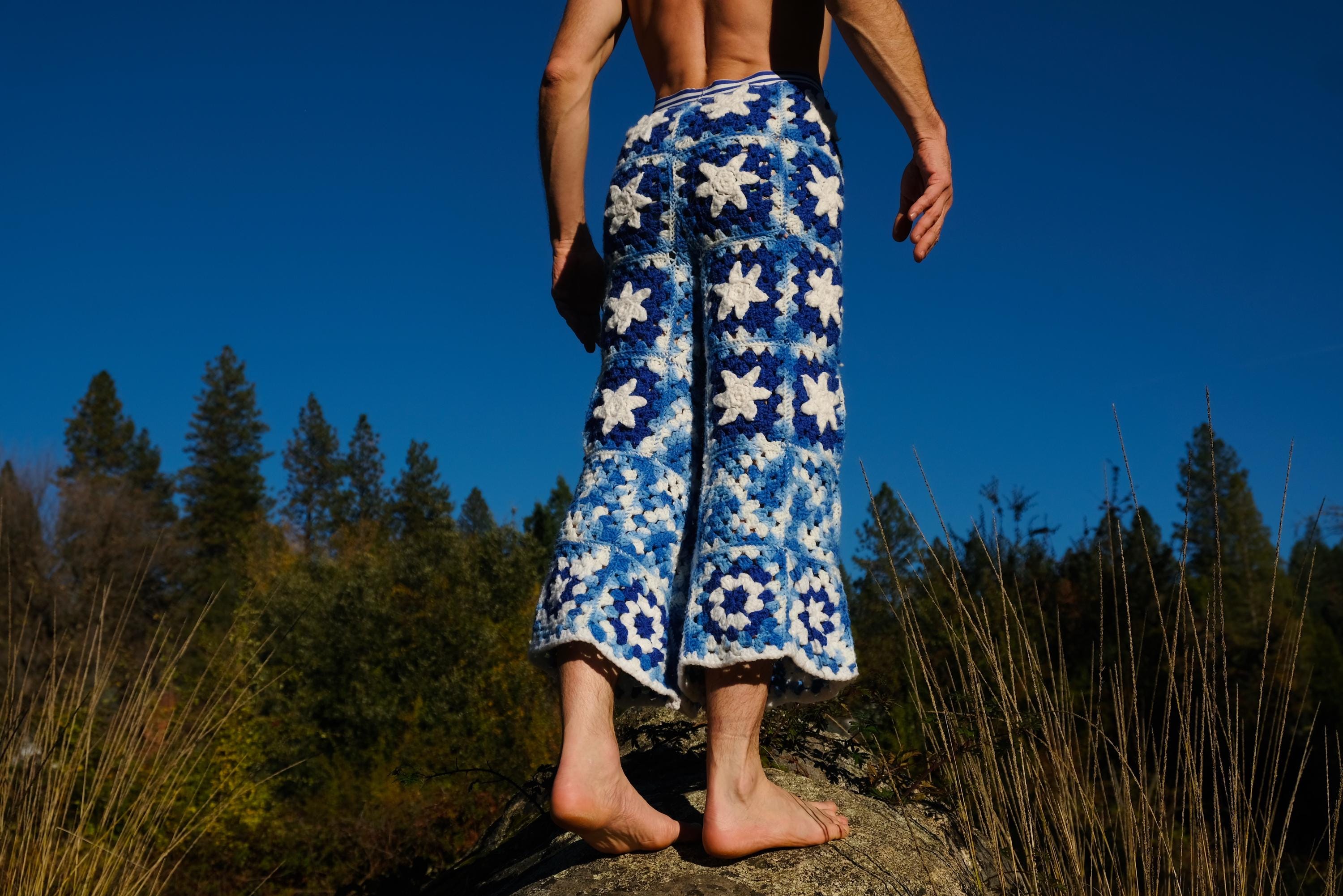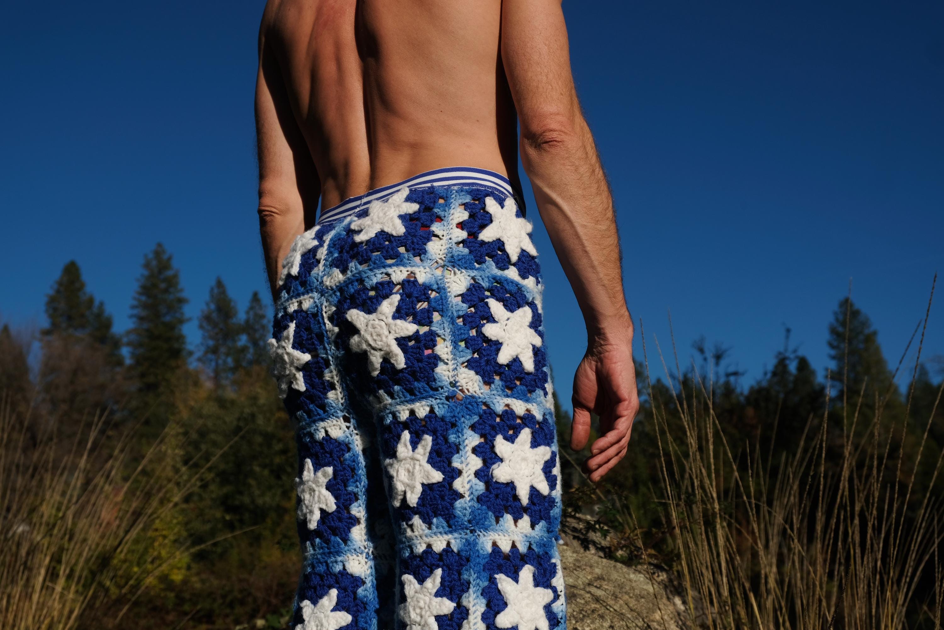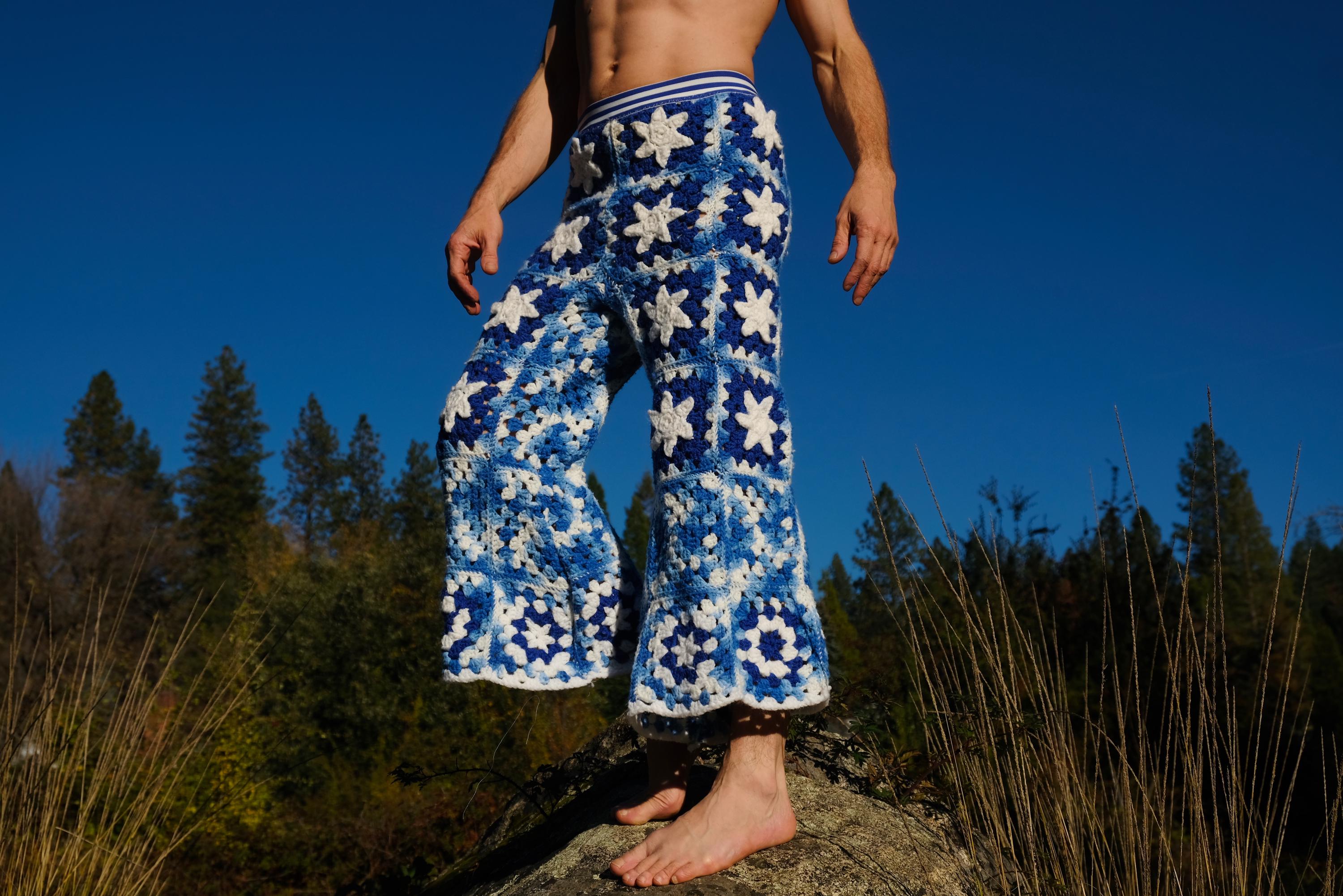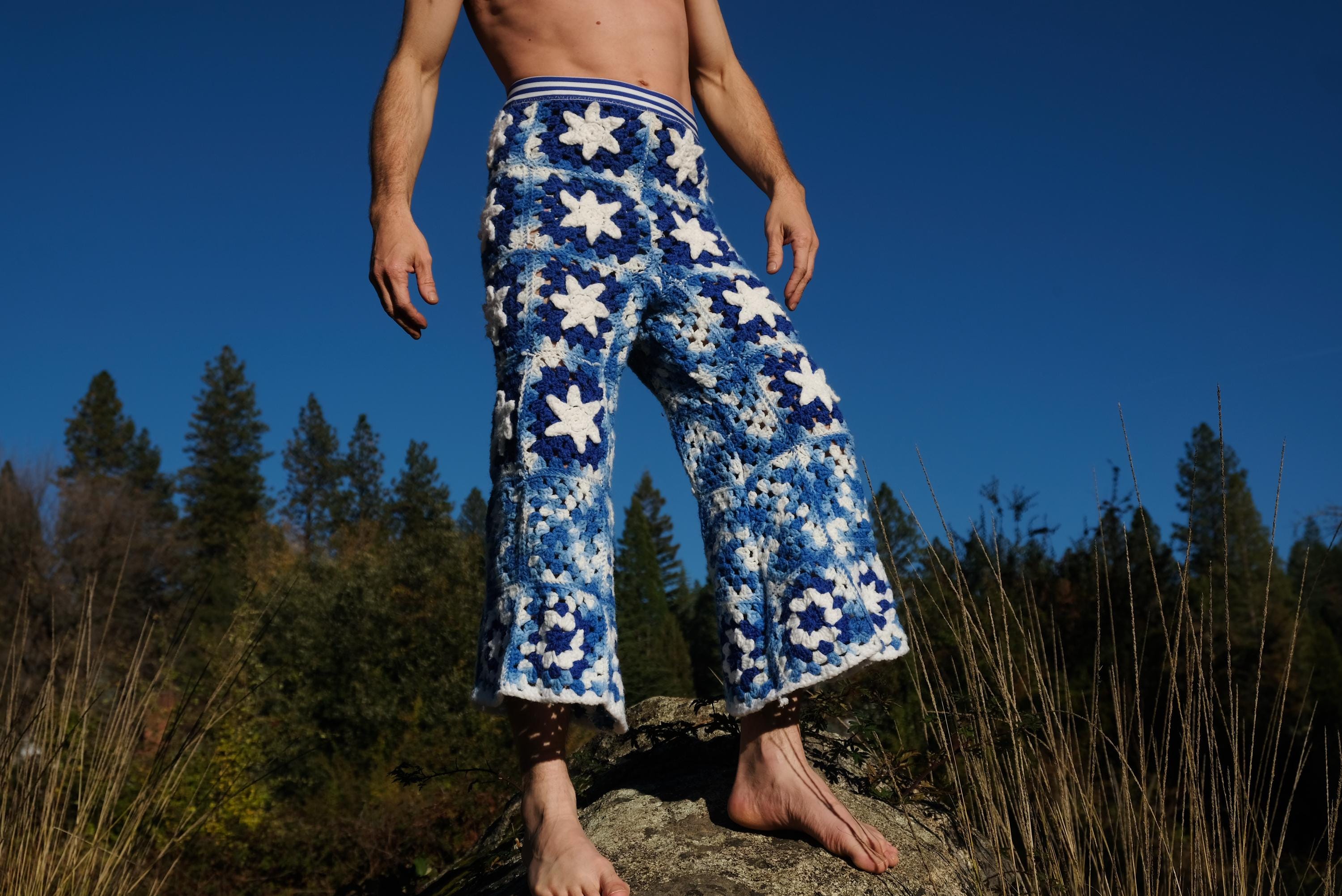 These are crochet pants with crochet squares and stars. Fashioned from a vintage afghan blanket crocheted in 100% acrylic yarn.
