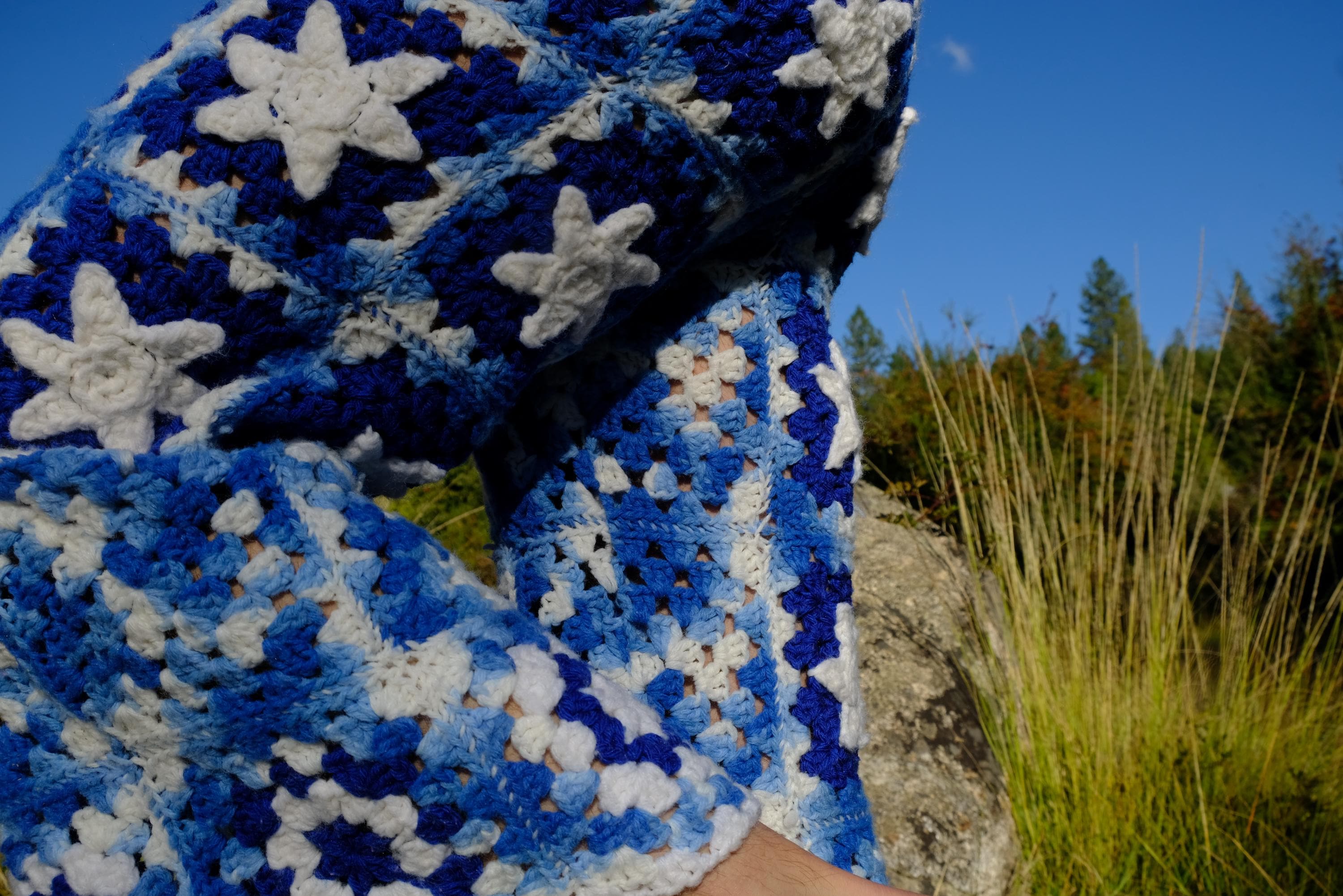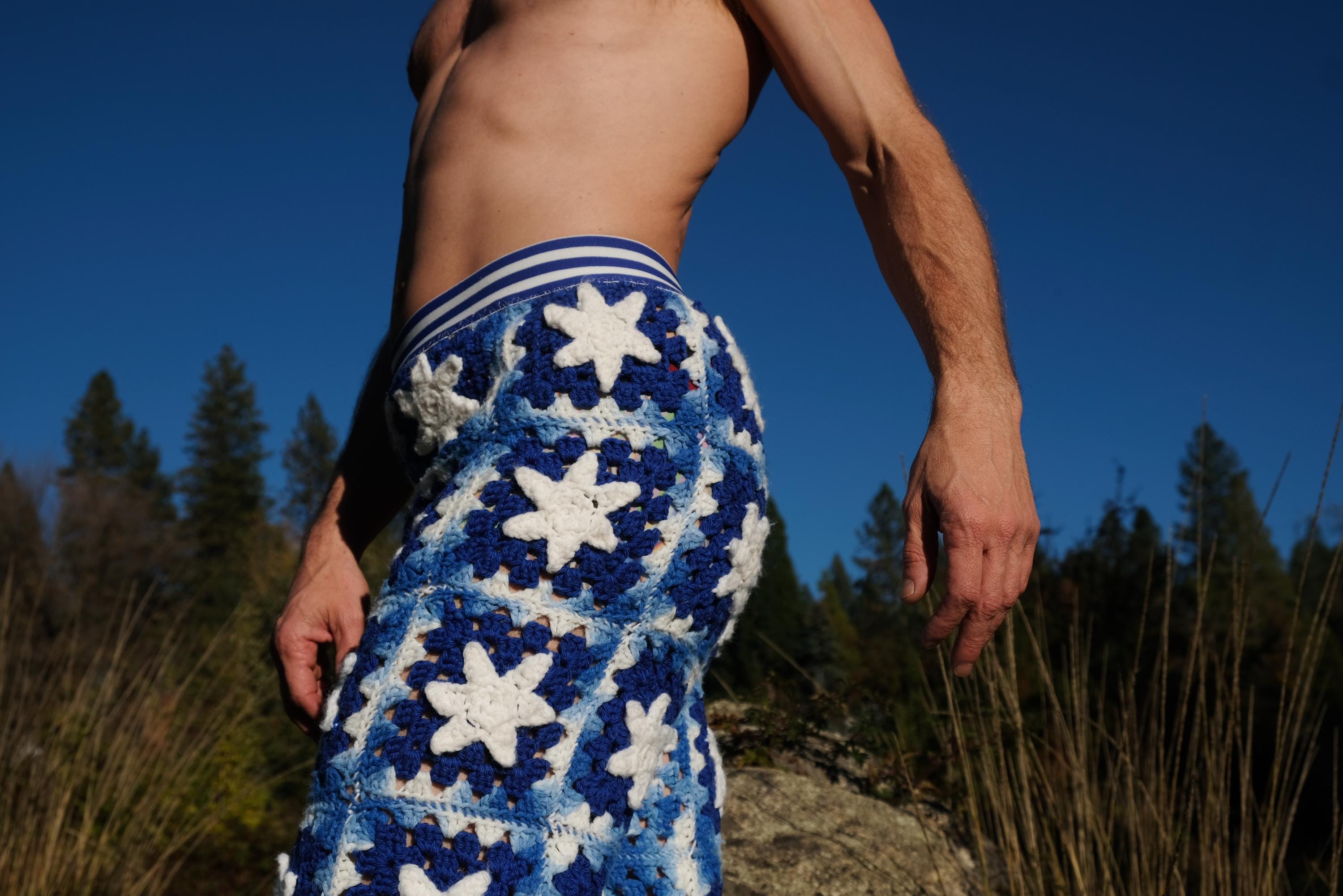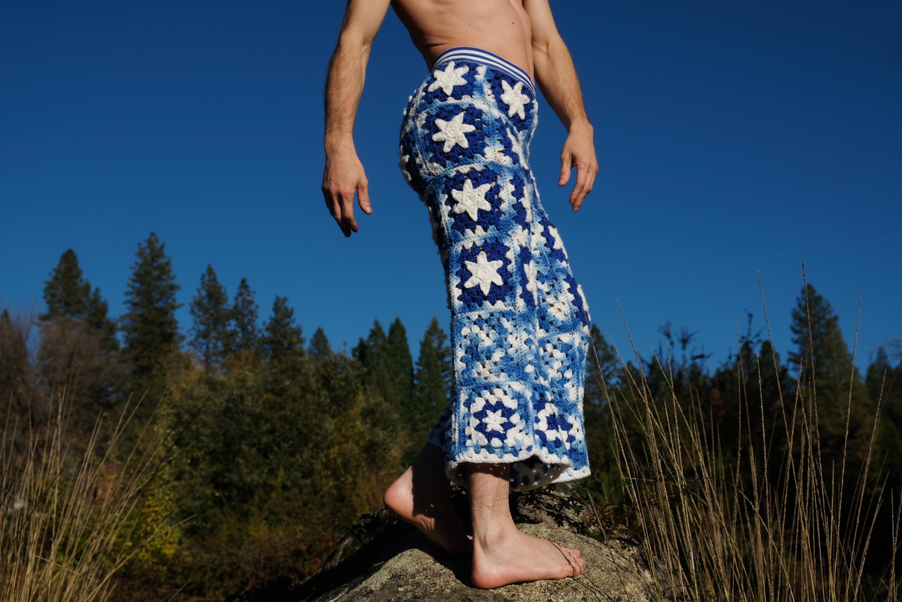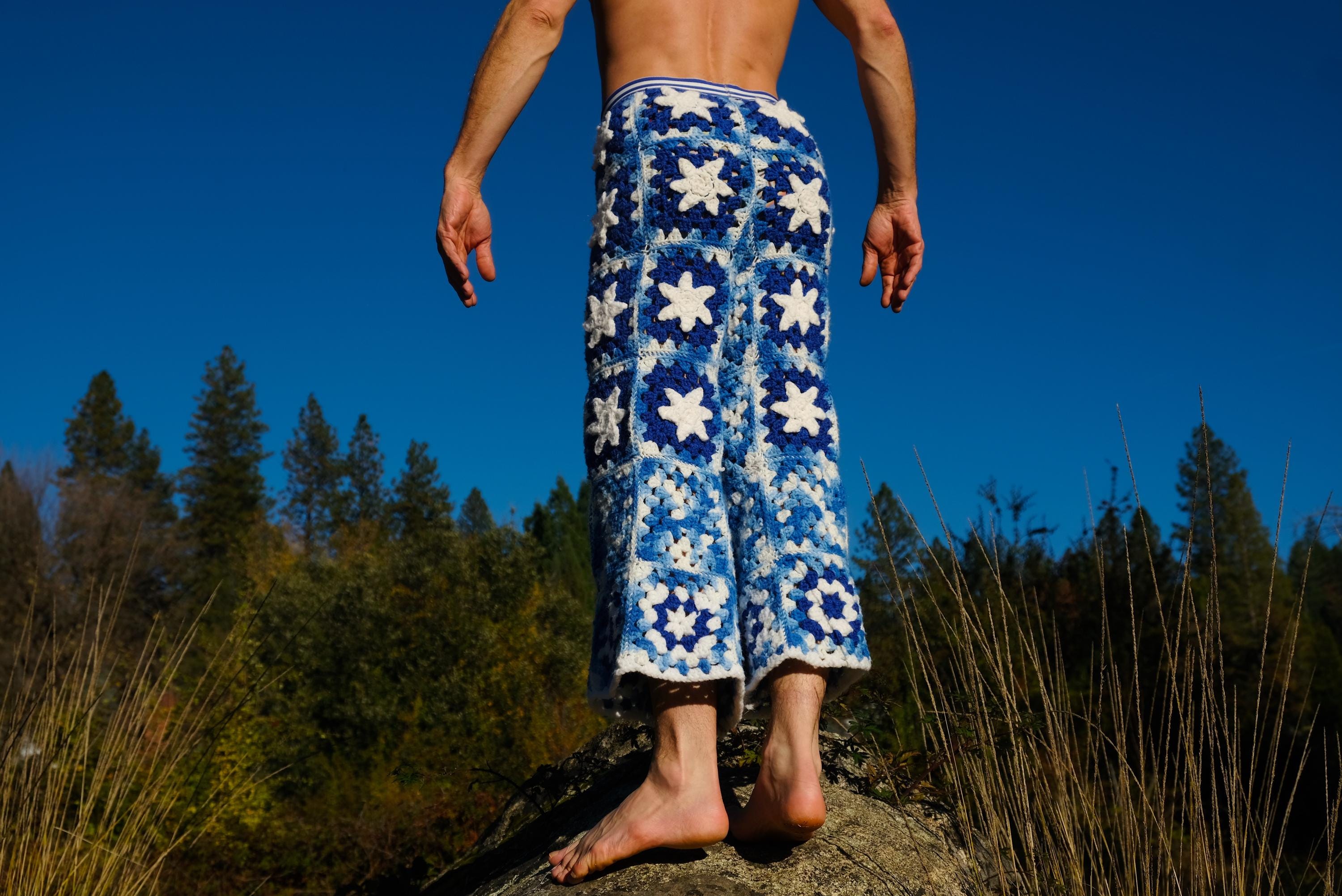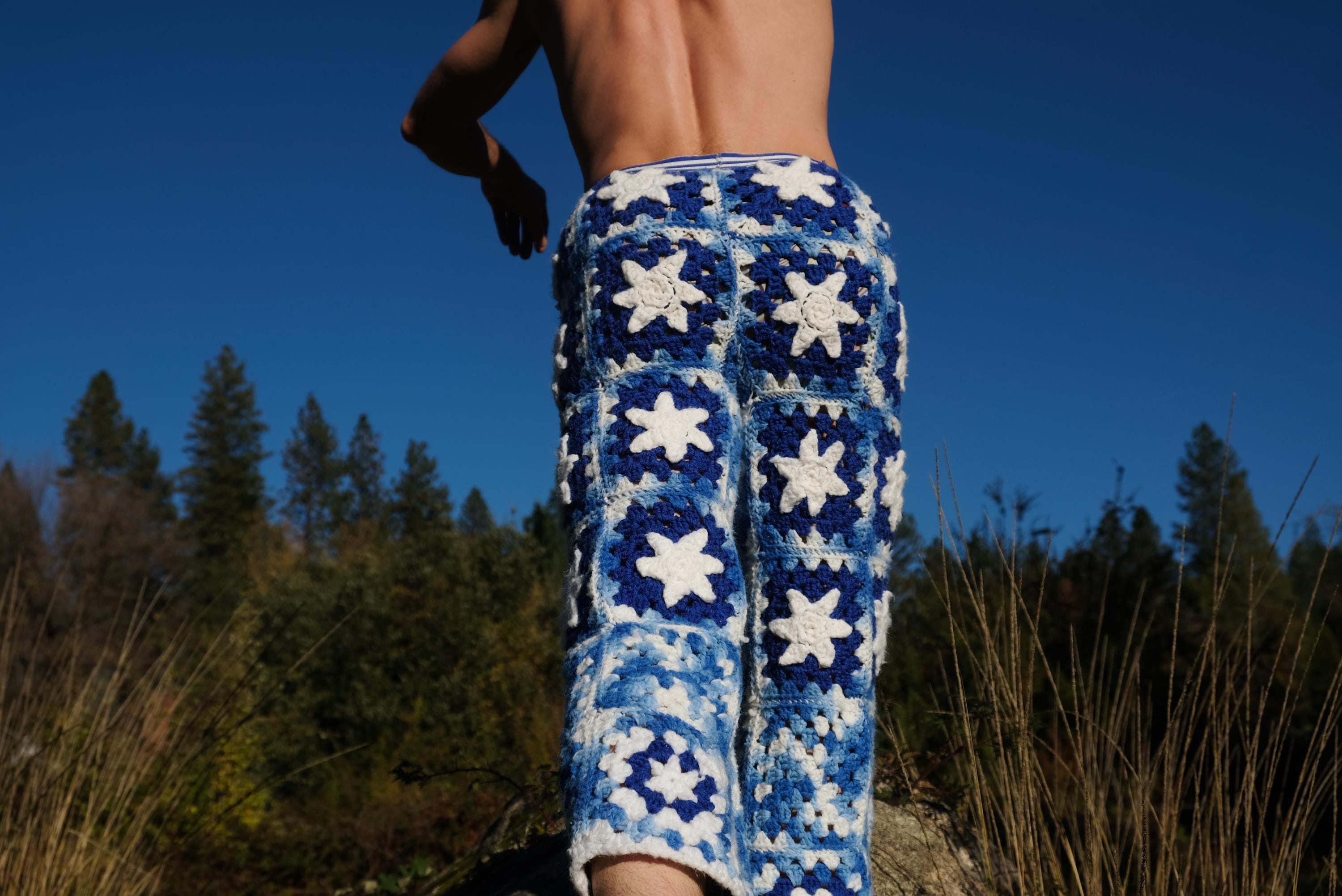These are crochet pants with crochet squares and stars. Fashioned from a vintage afghan blanket crocheted in 100% acrylic yarn.