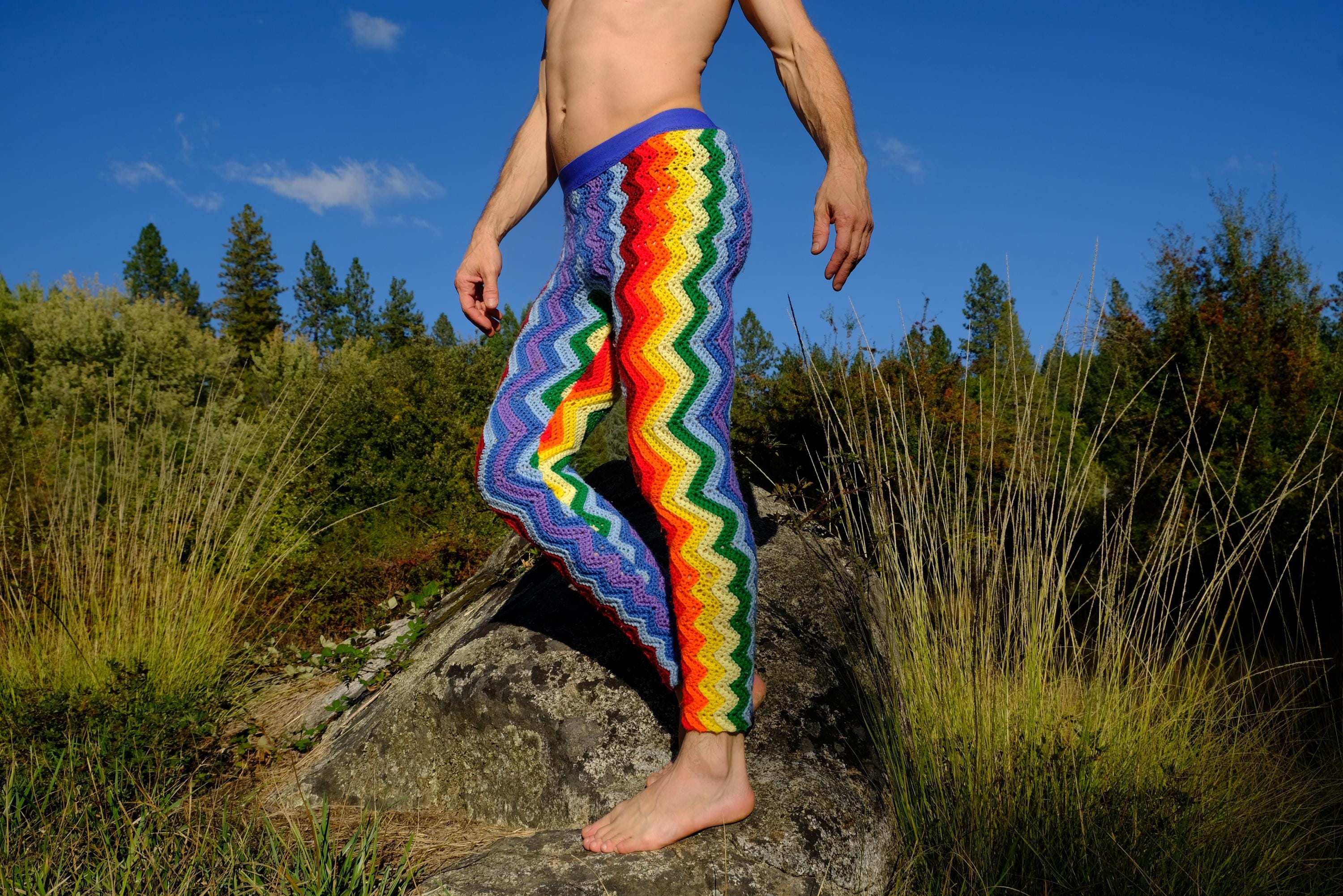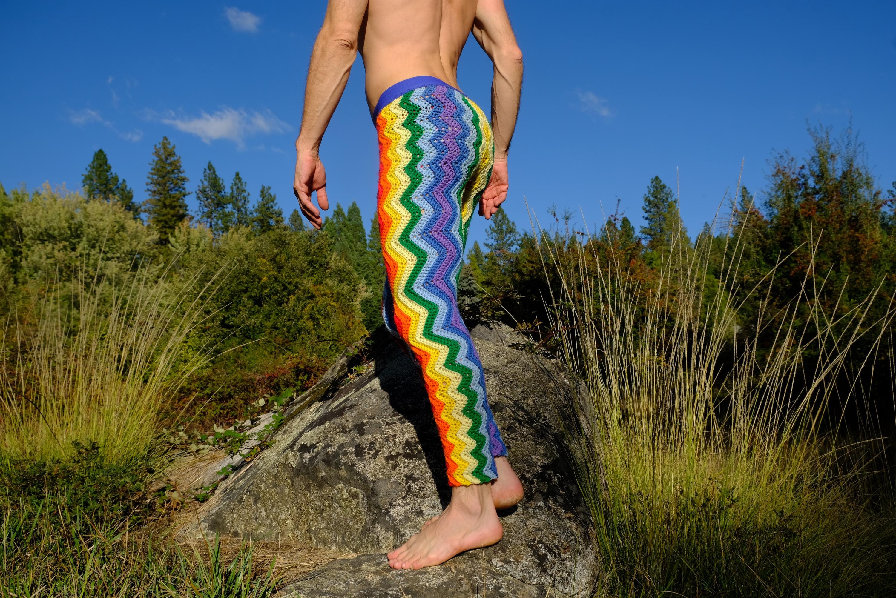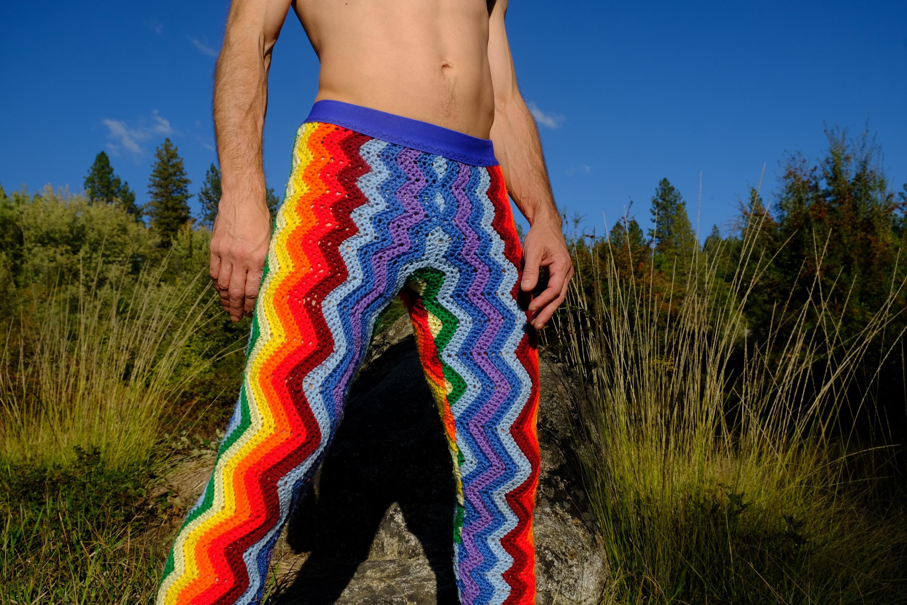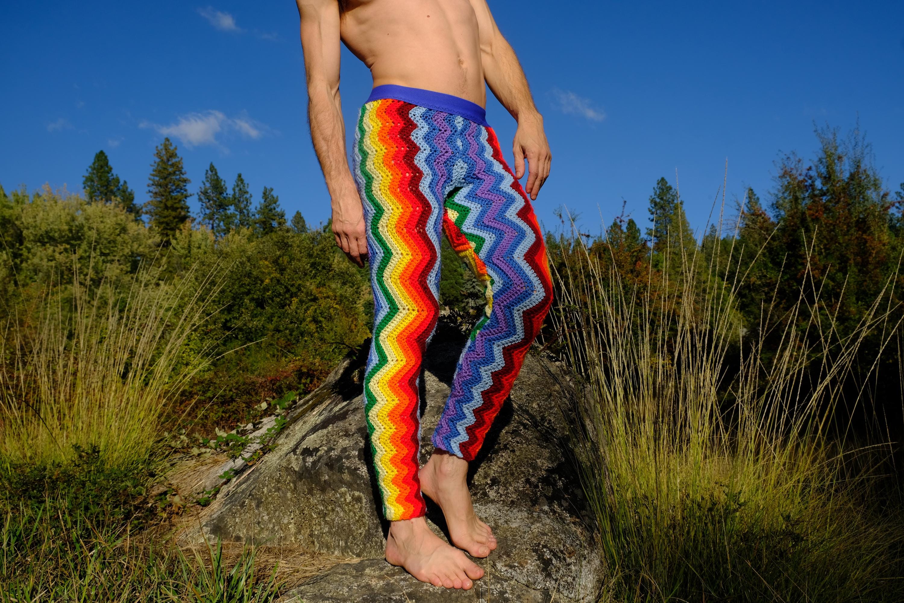 These are crochet pants with rainbow stripes. Fashioned from a vintage afghan blanket crocheted in 100% acrylic yarn.