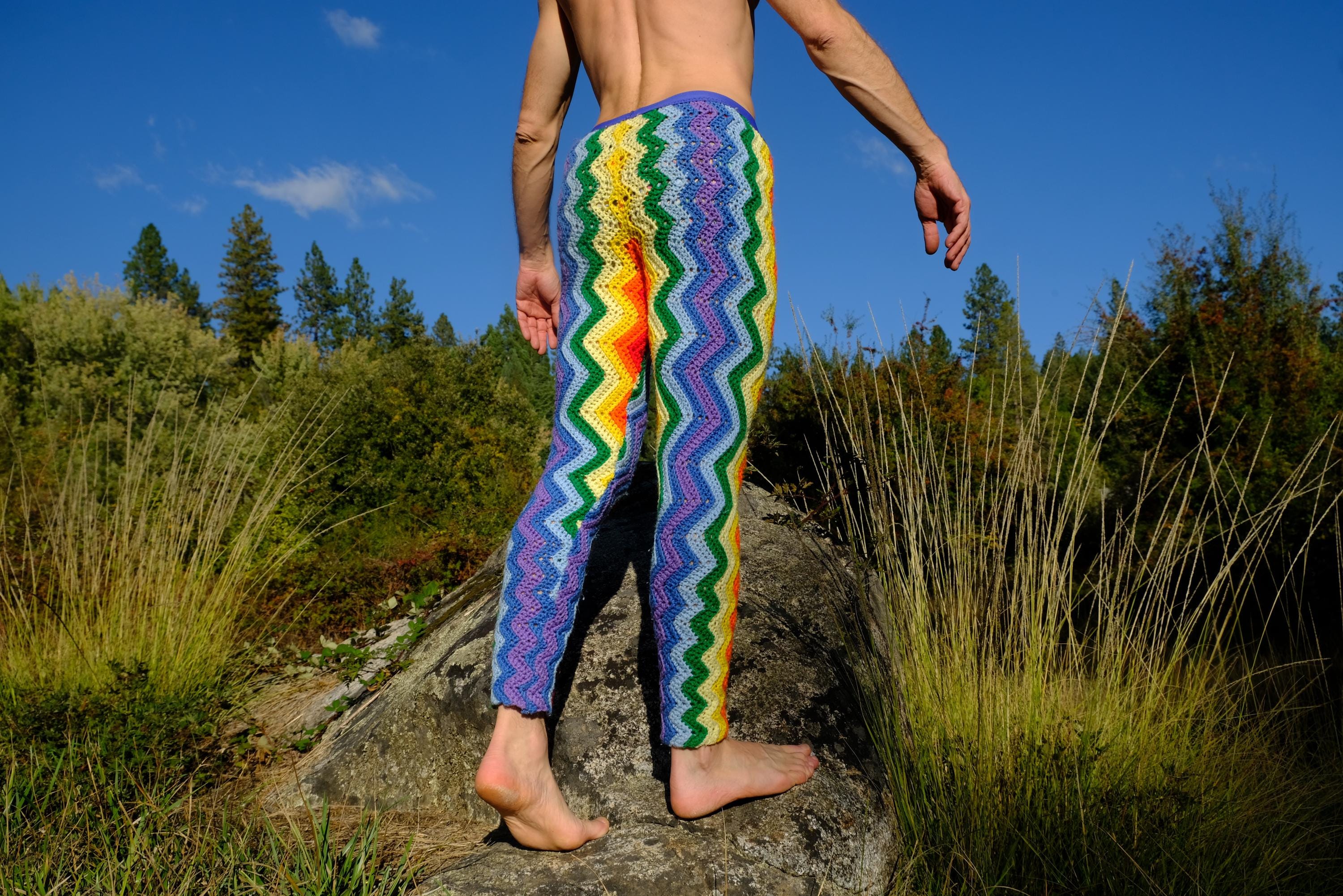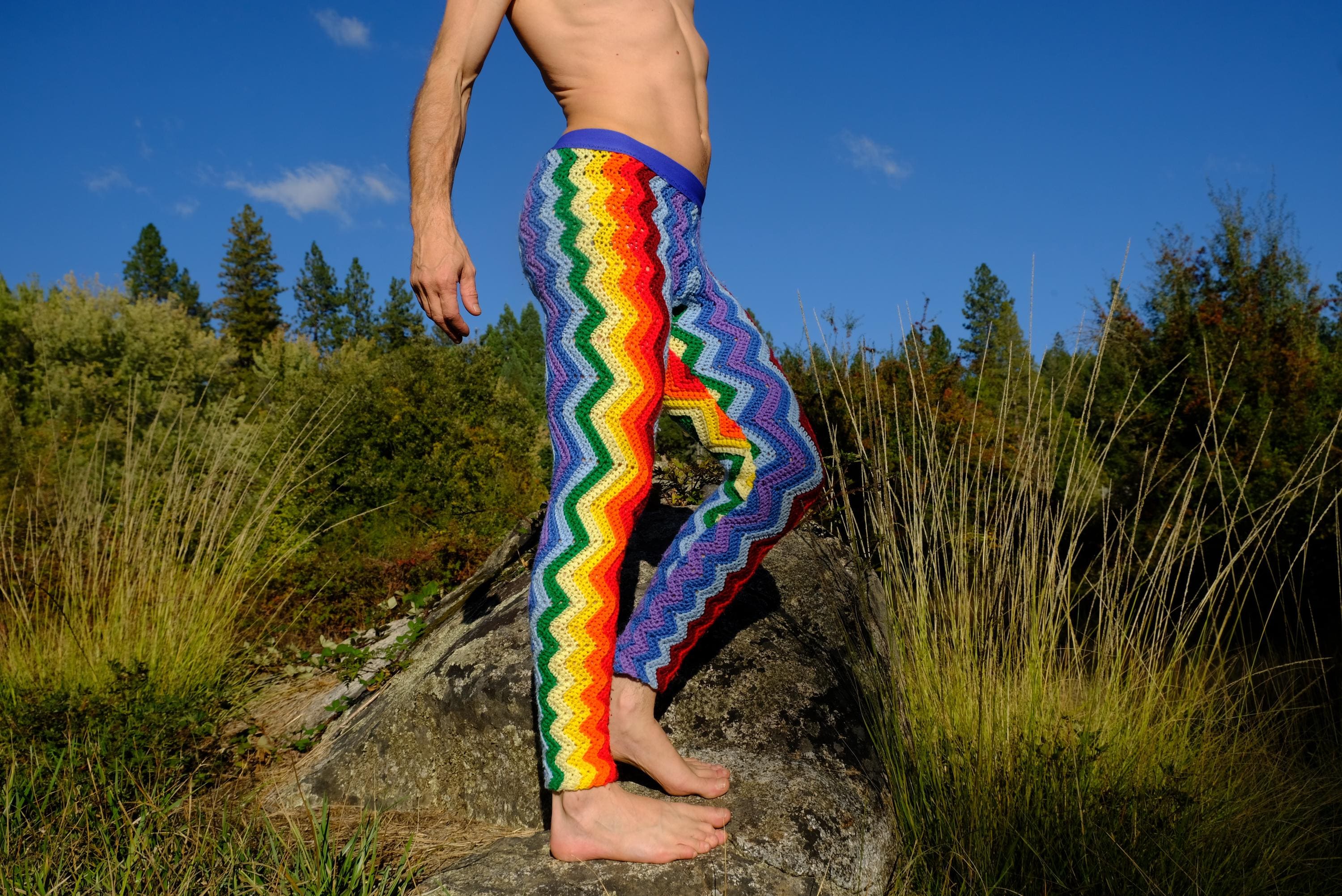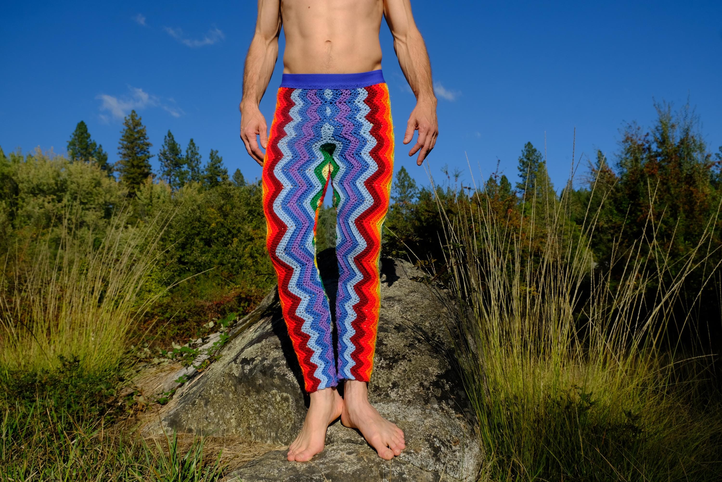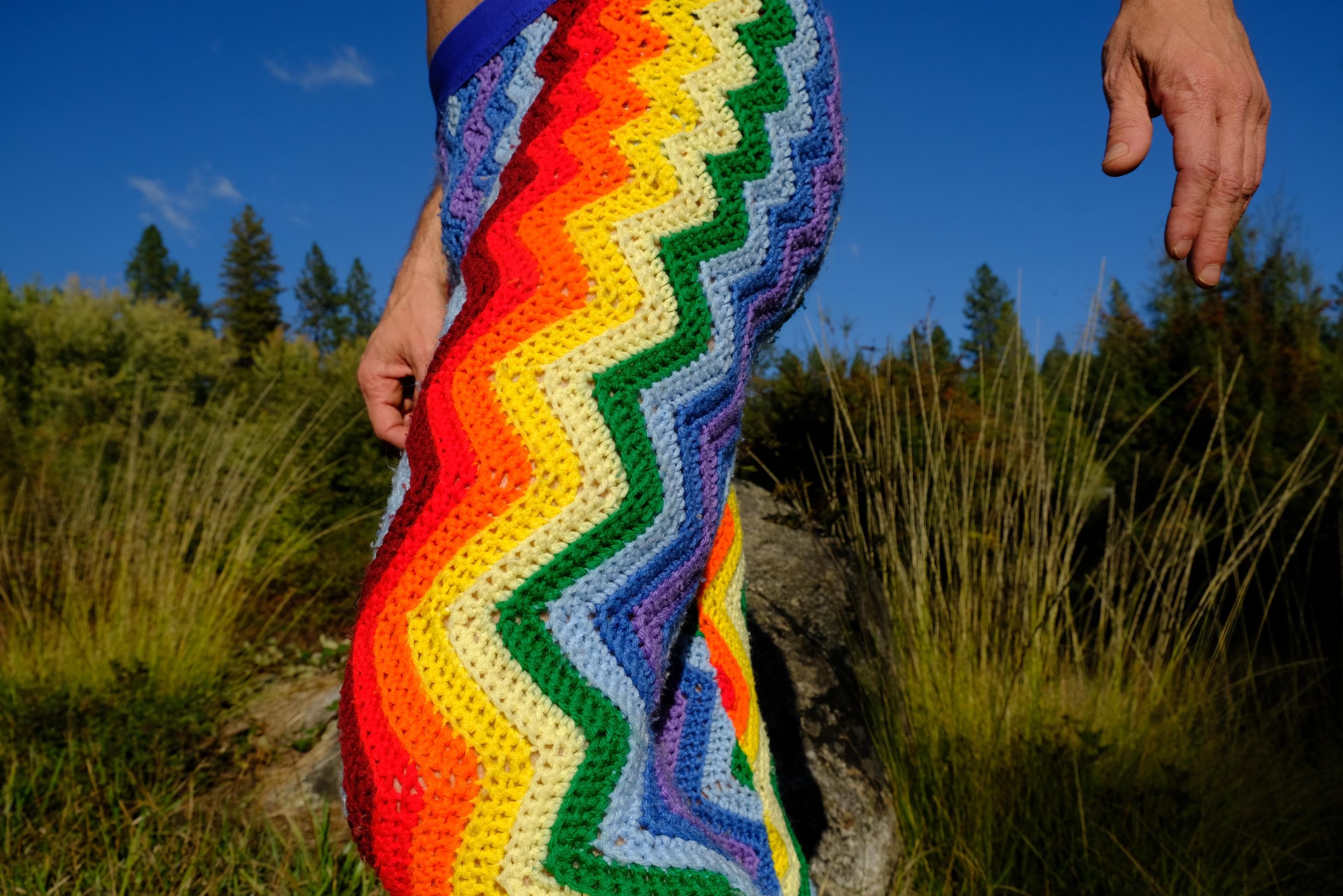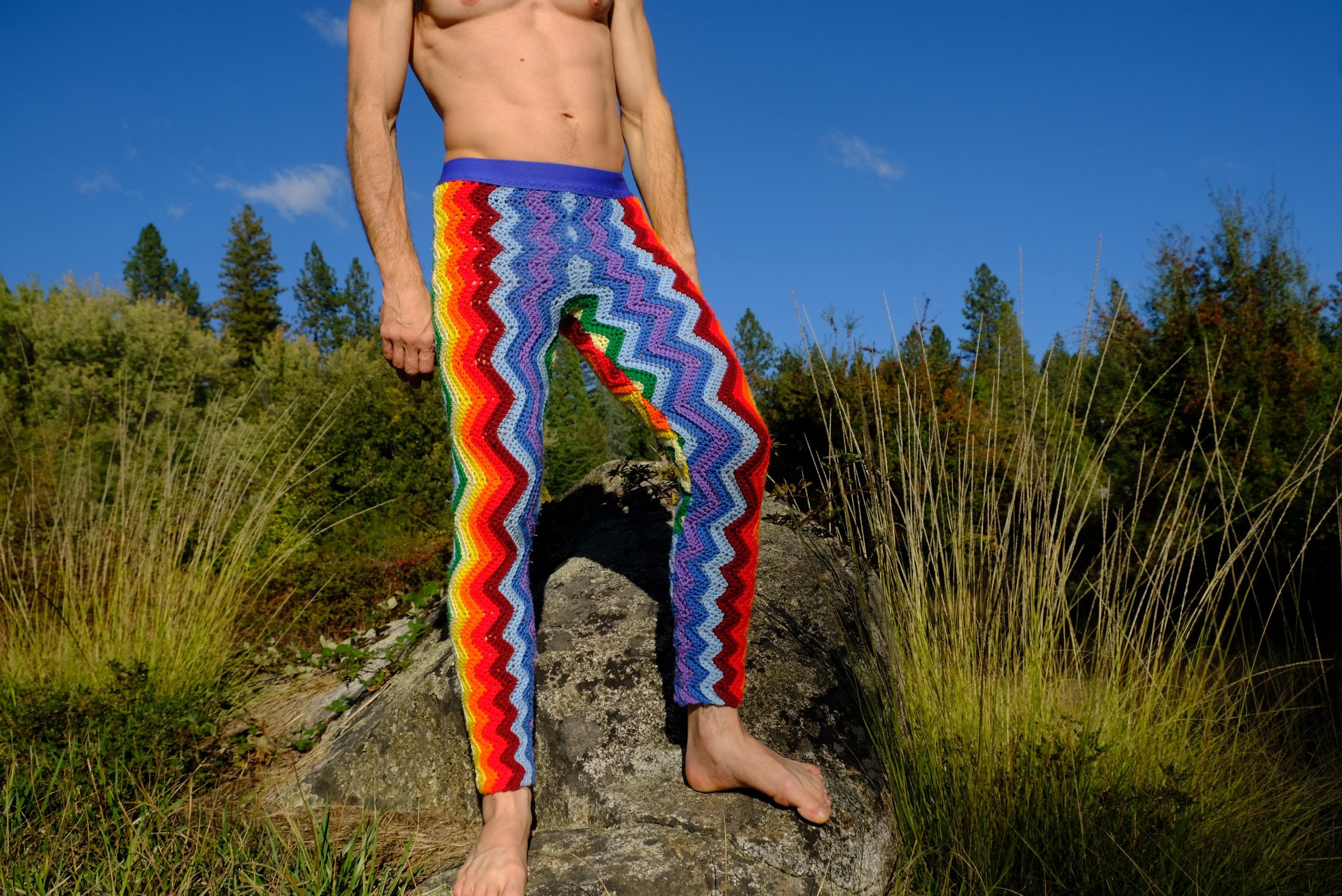 These are crochet pants with rainbow stripes. Fashioned from a vintage afghan blanket crocheted in 100% acrylic yarn.