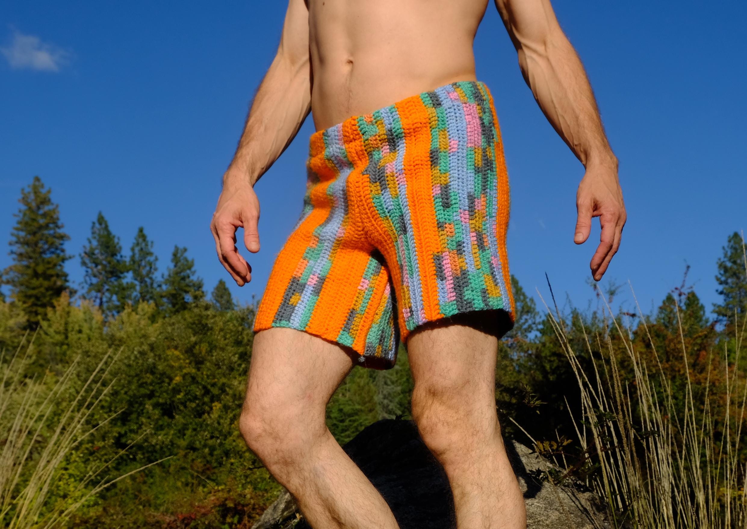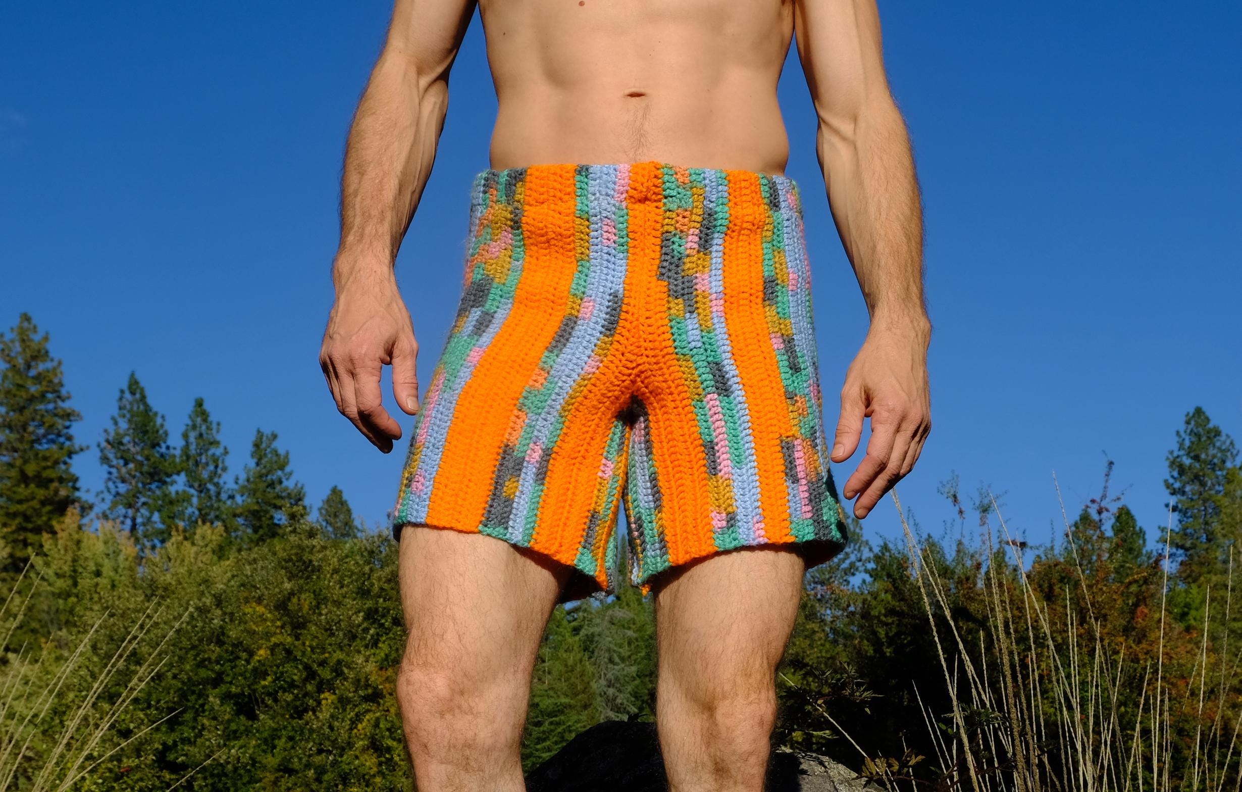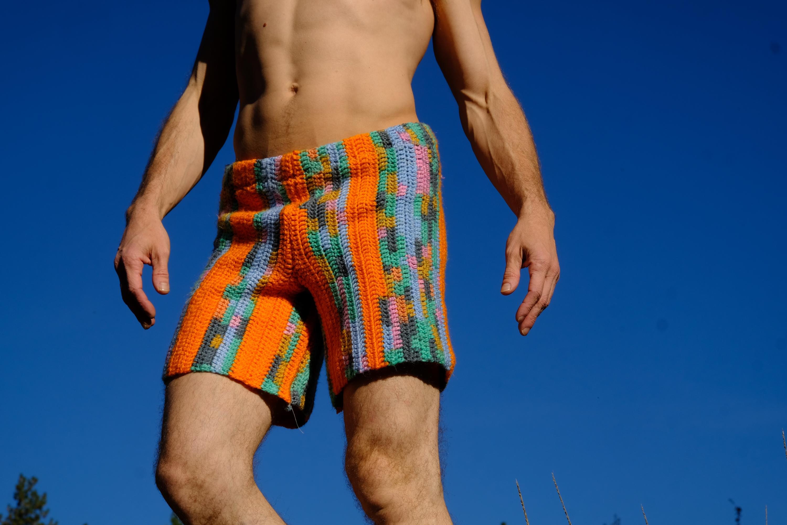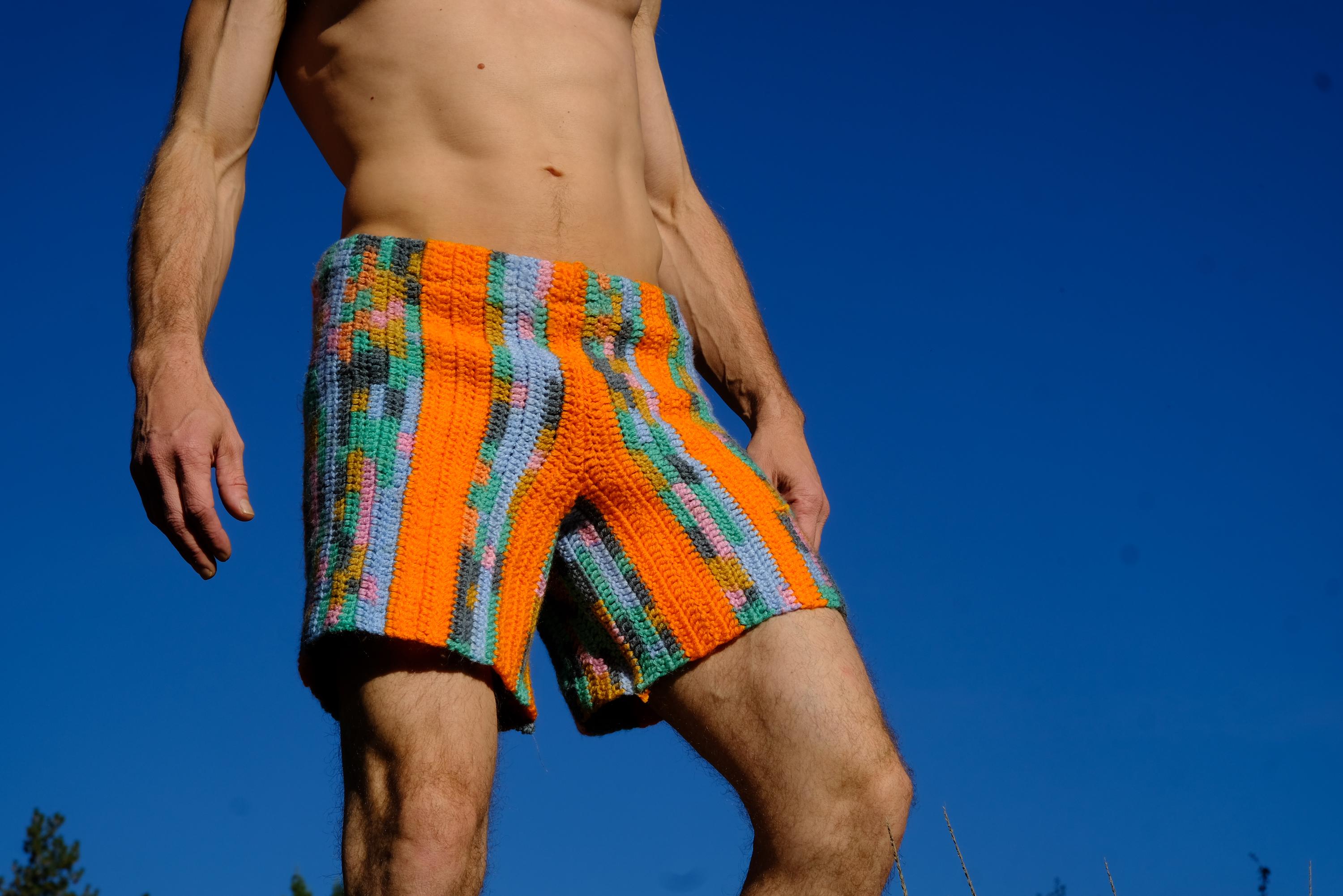 These are crochet shorts with orange stripes. Repurposed from a vintage afghan blanket crocheted in 100% acrylic yarn.