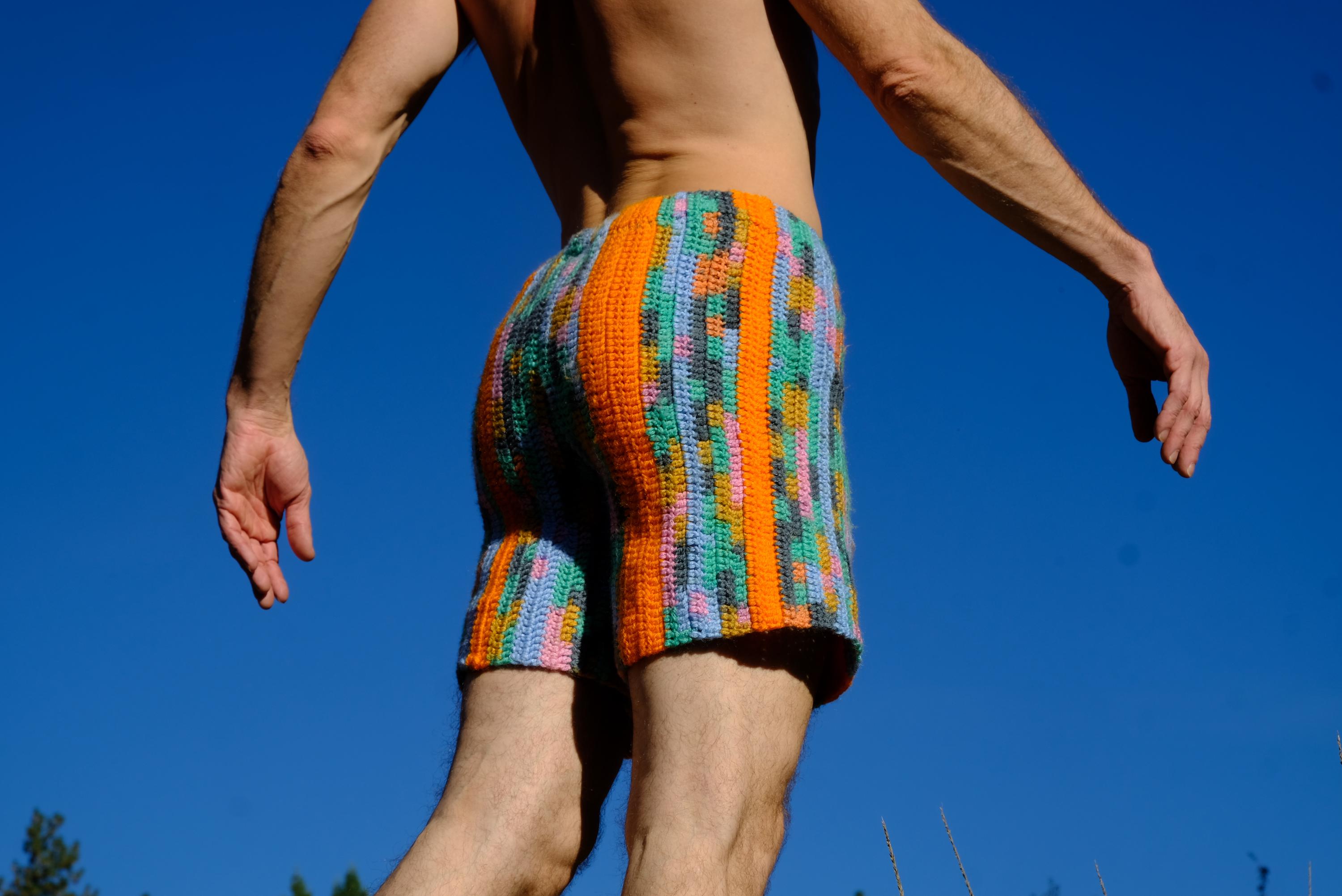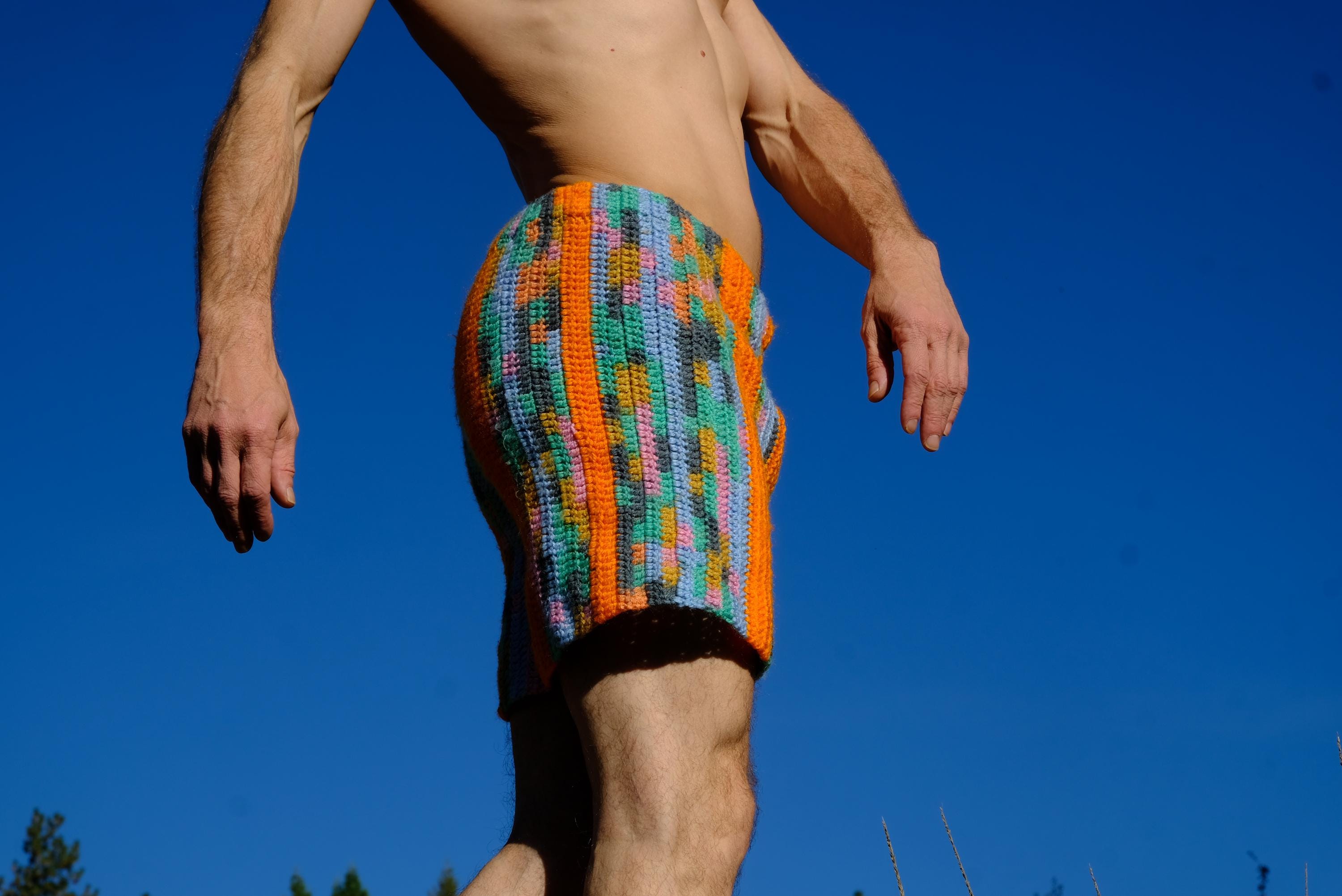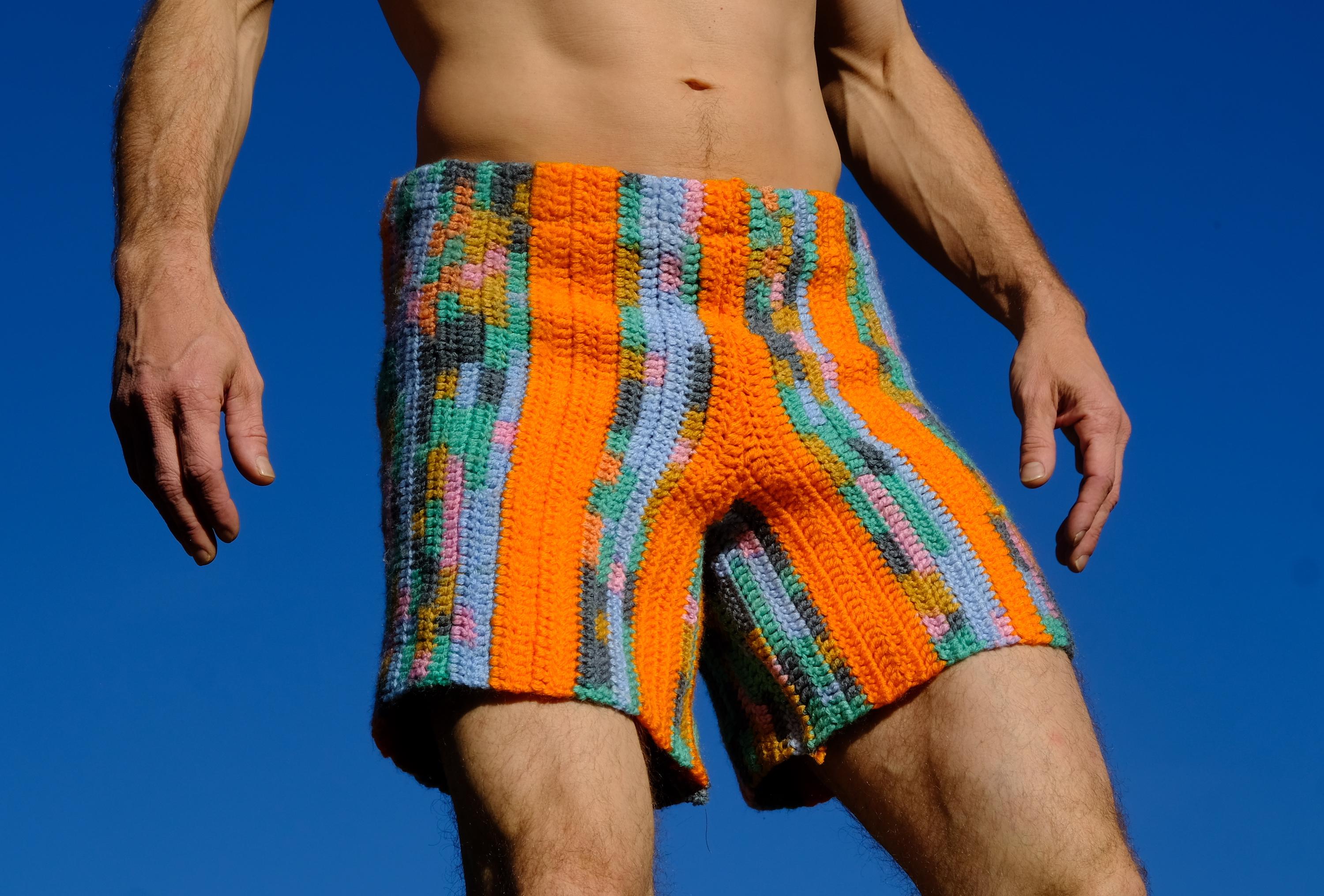 These are crochet shorts with orange stripes. Repurposed from a vintage afghan blanket crocheted in 100% acrylic yarn.
