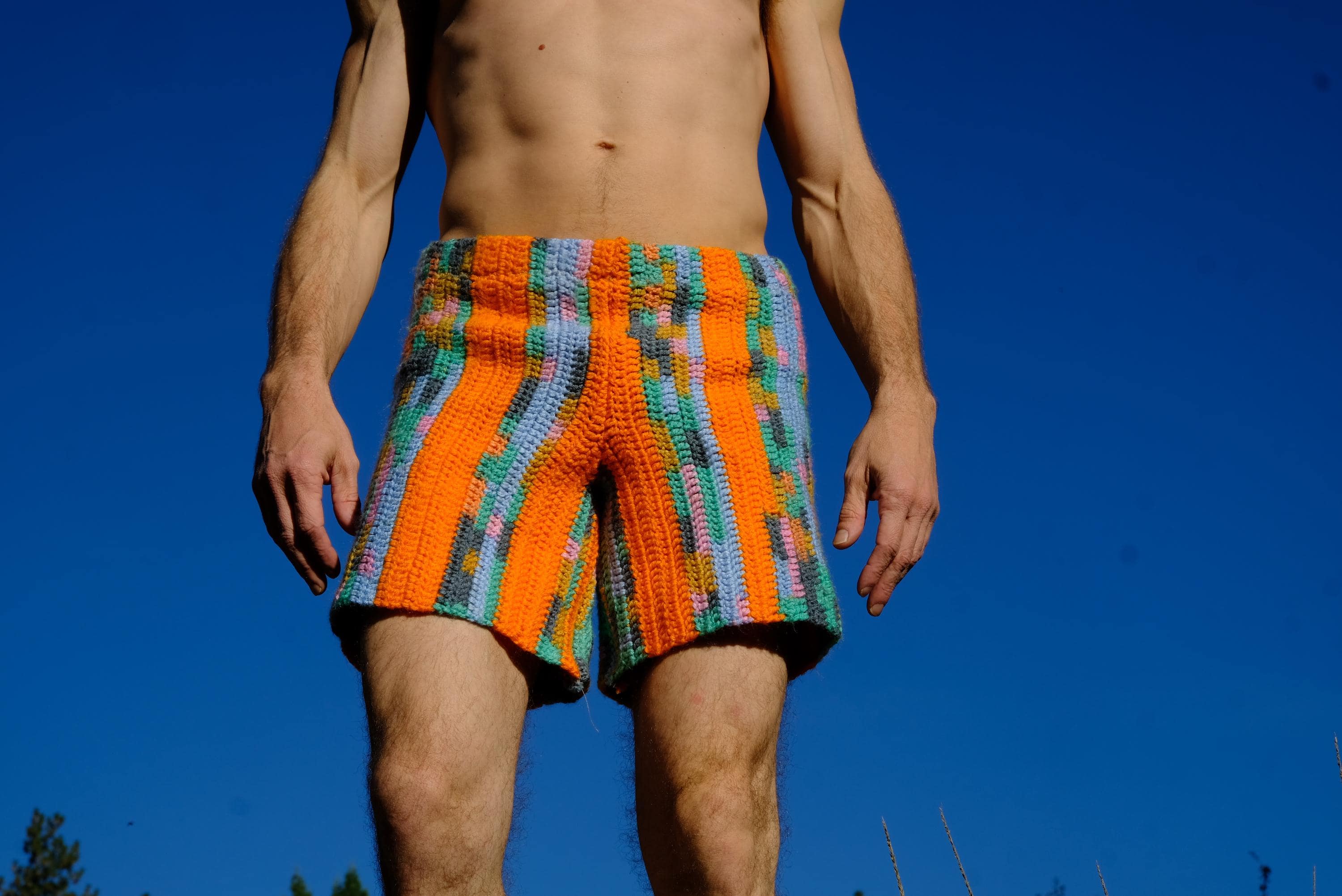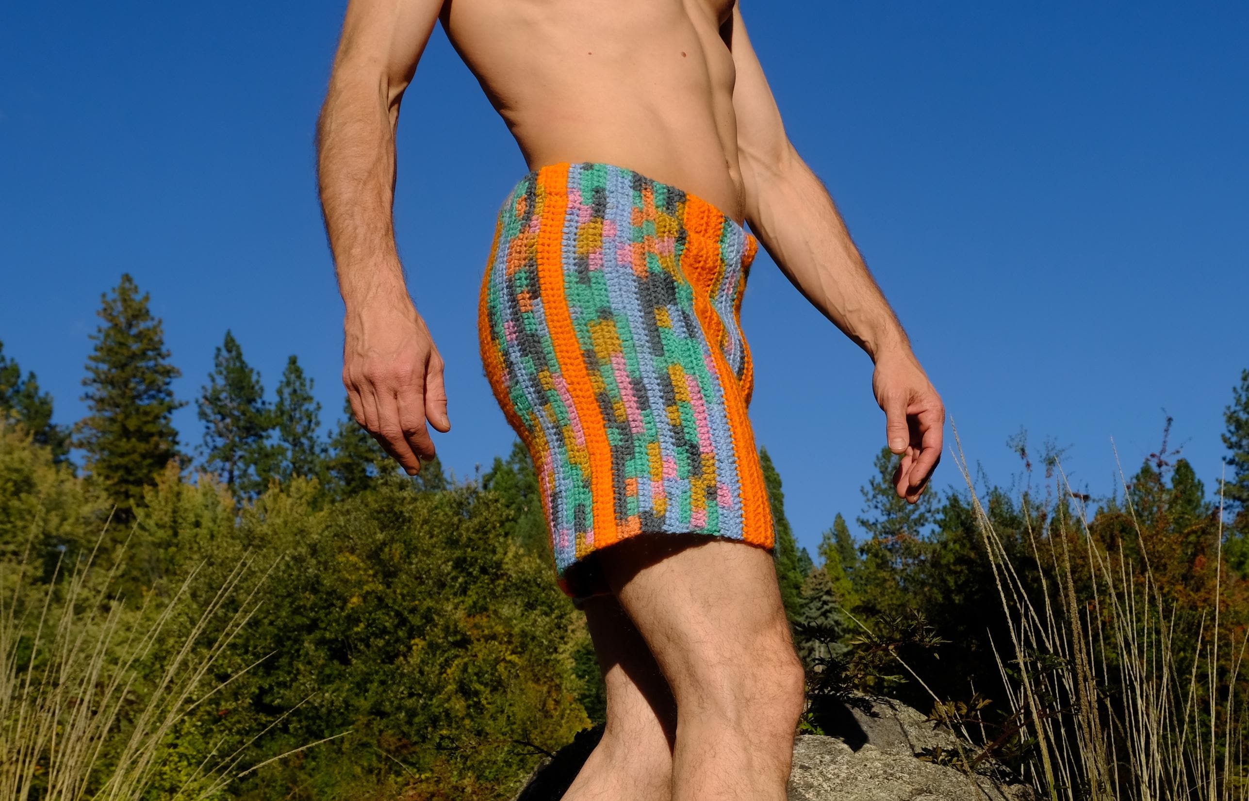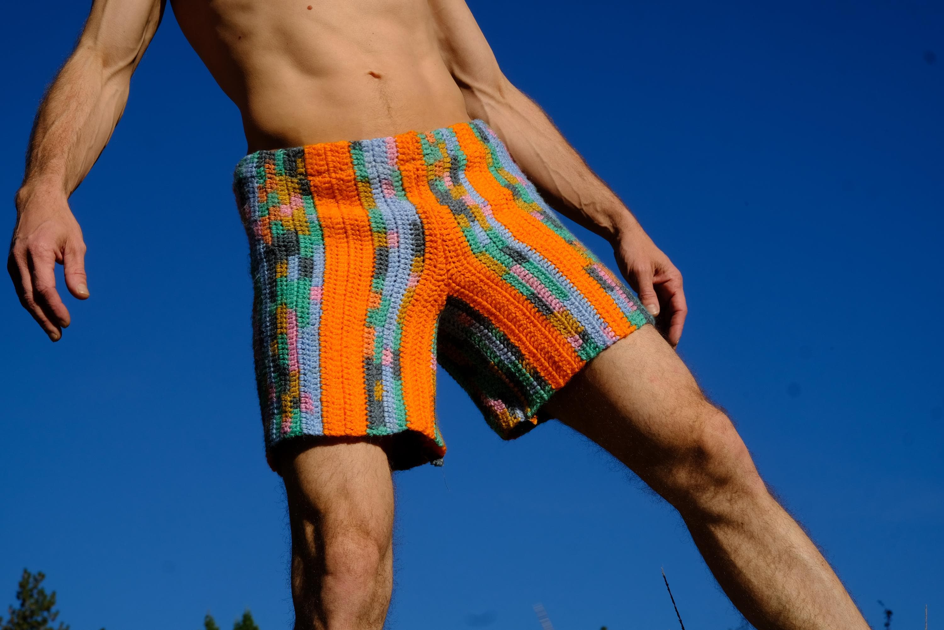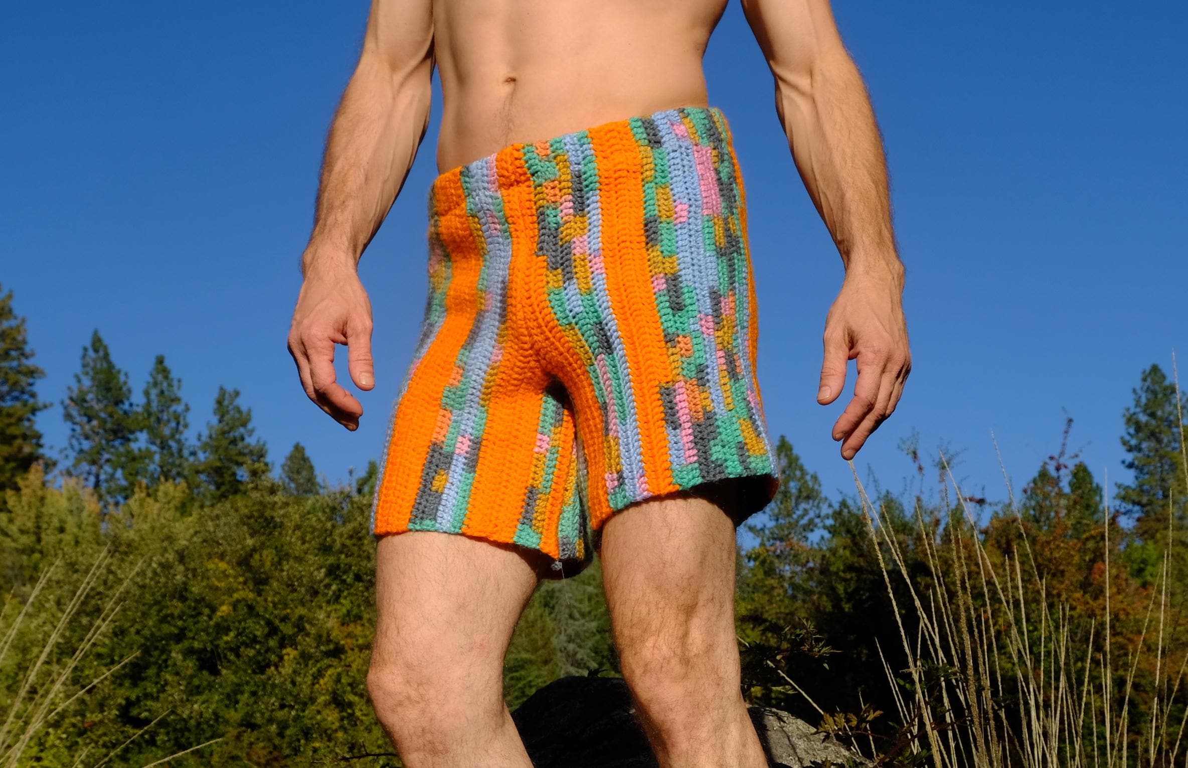 These are crochet shorts with orange stripes. Repurposed from a vintage afghan blanket crocheted in 100% acrylic yarn.