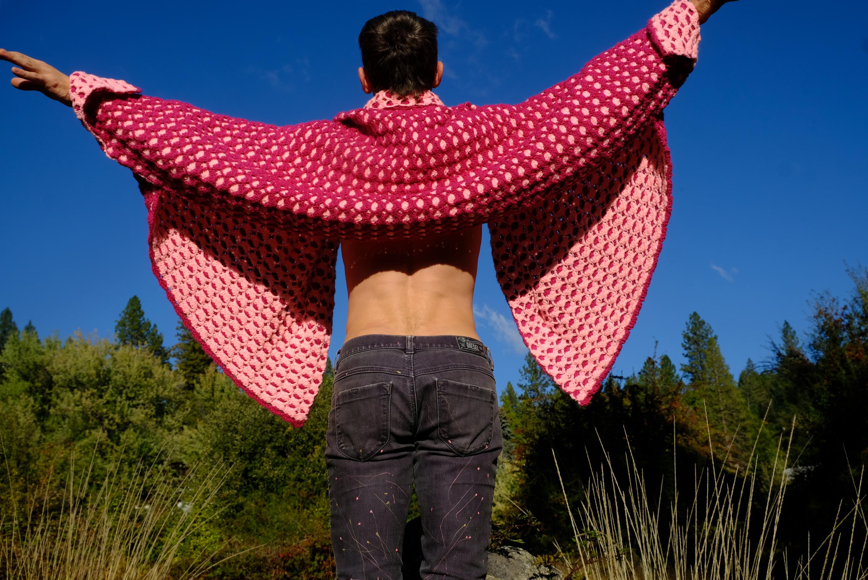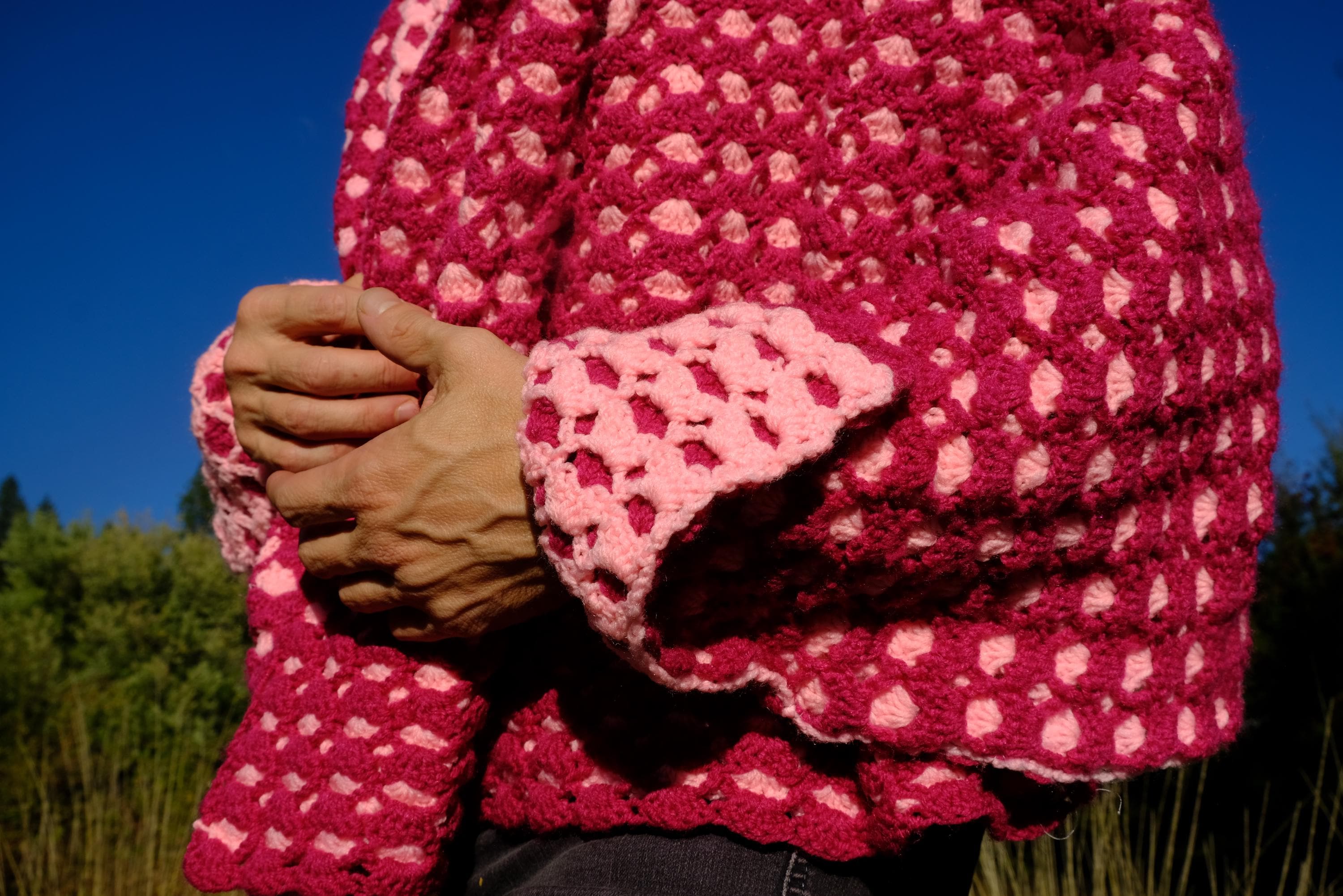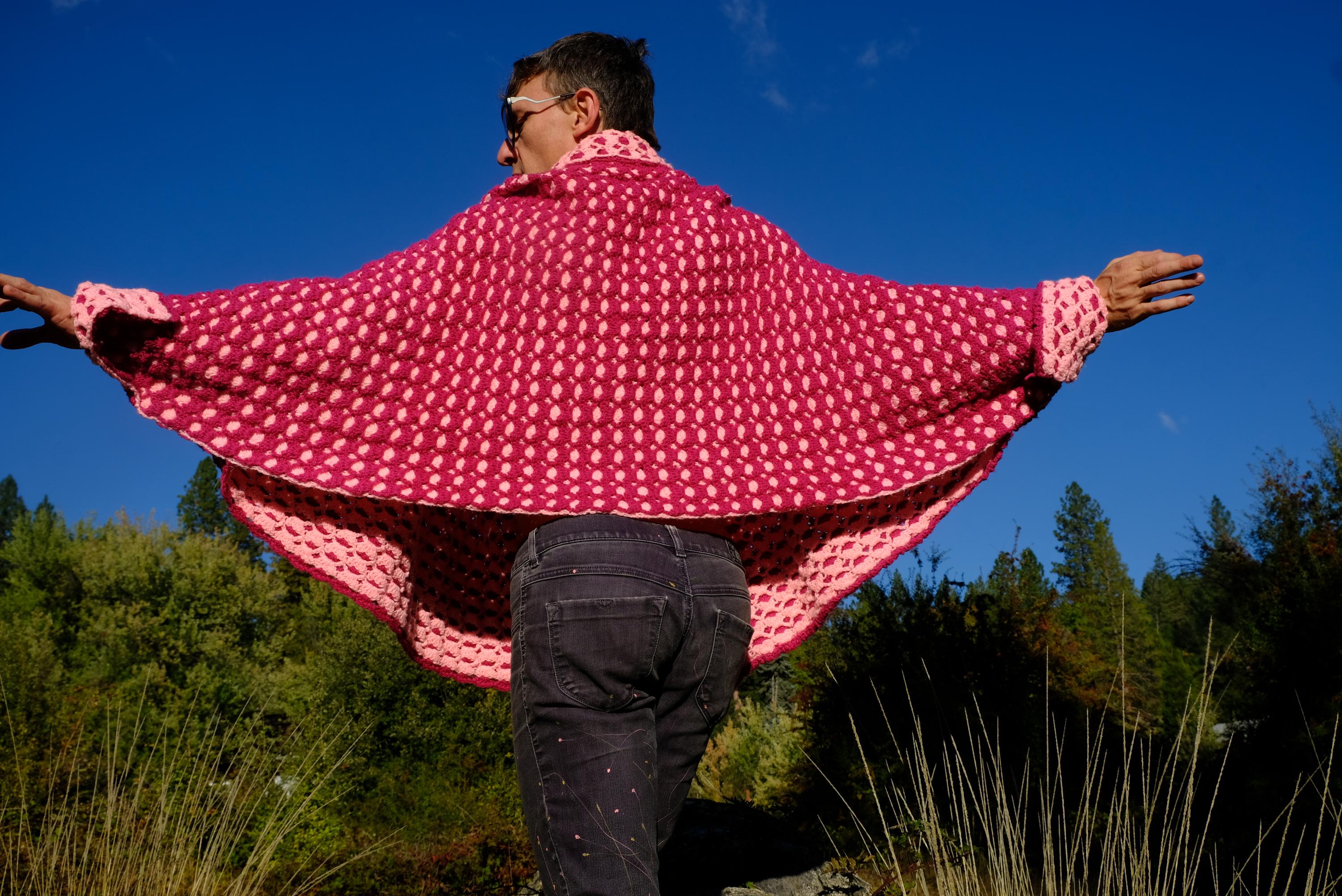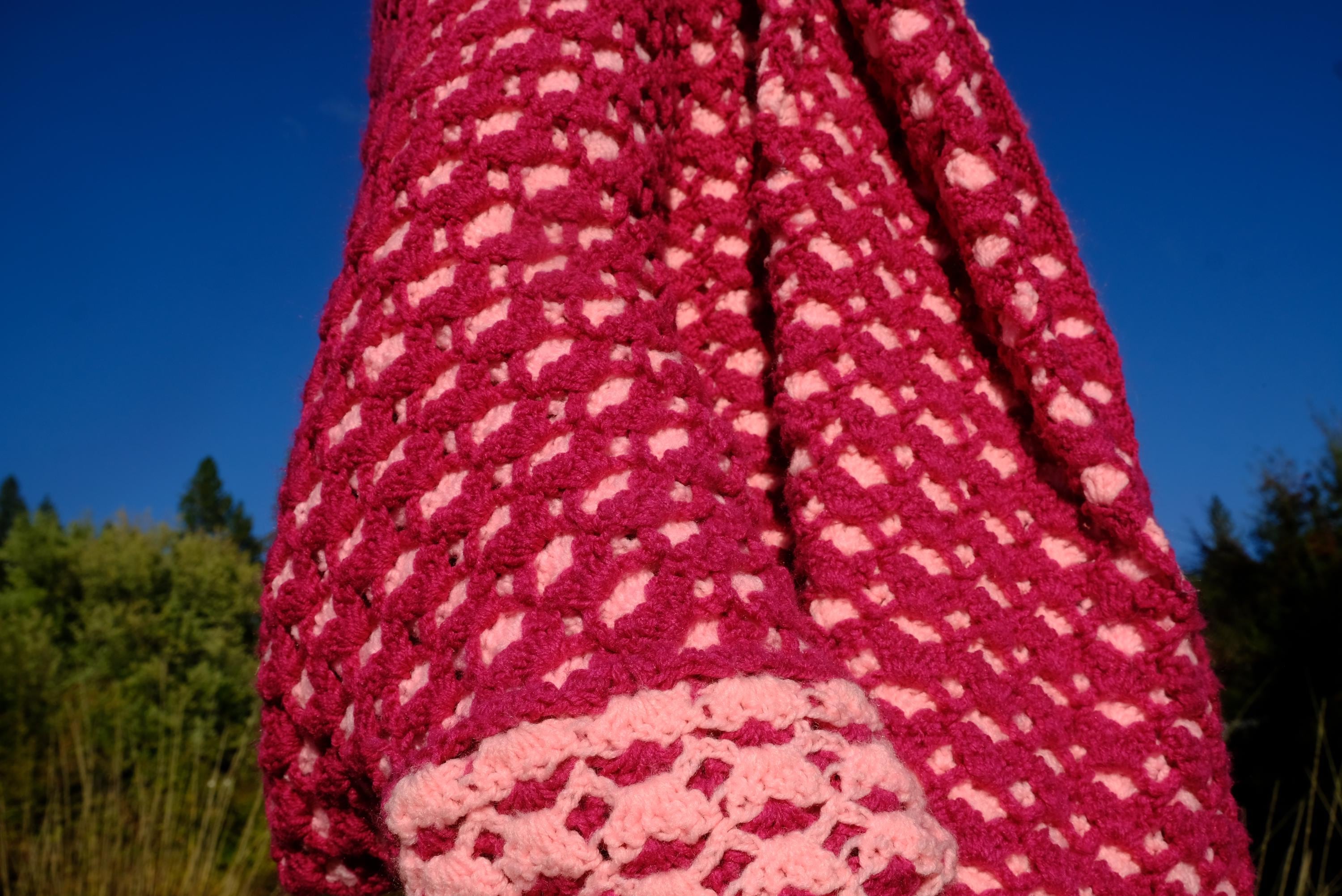 This is a crochet "cape-shrug" in 2 tones of pink. Beautifully up-cycled from a crocheted afghan blanket in 100% soft acrylic yarn and exquisitely tailored by yours truly, Lord von Schmitt.