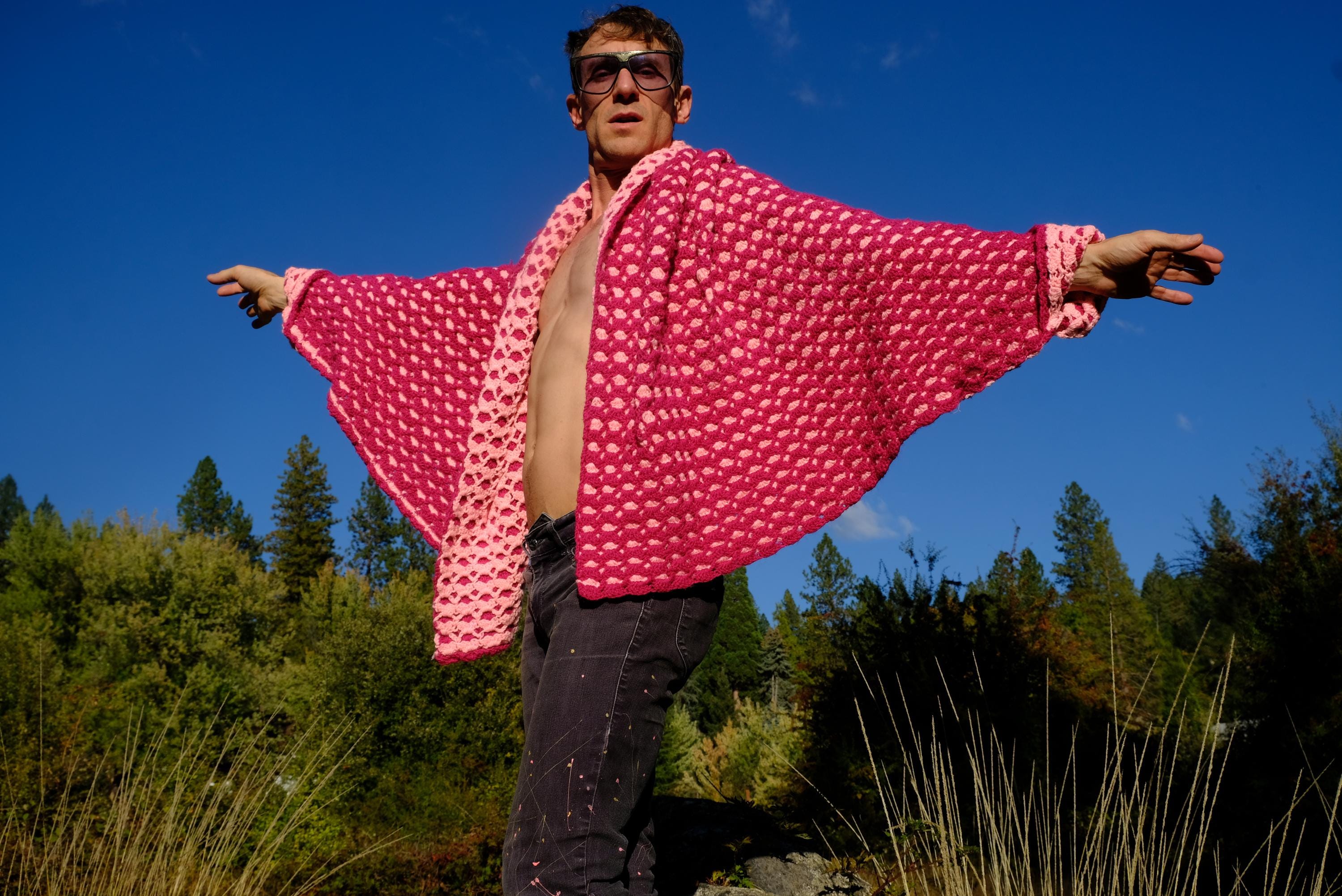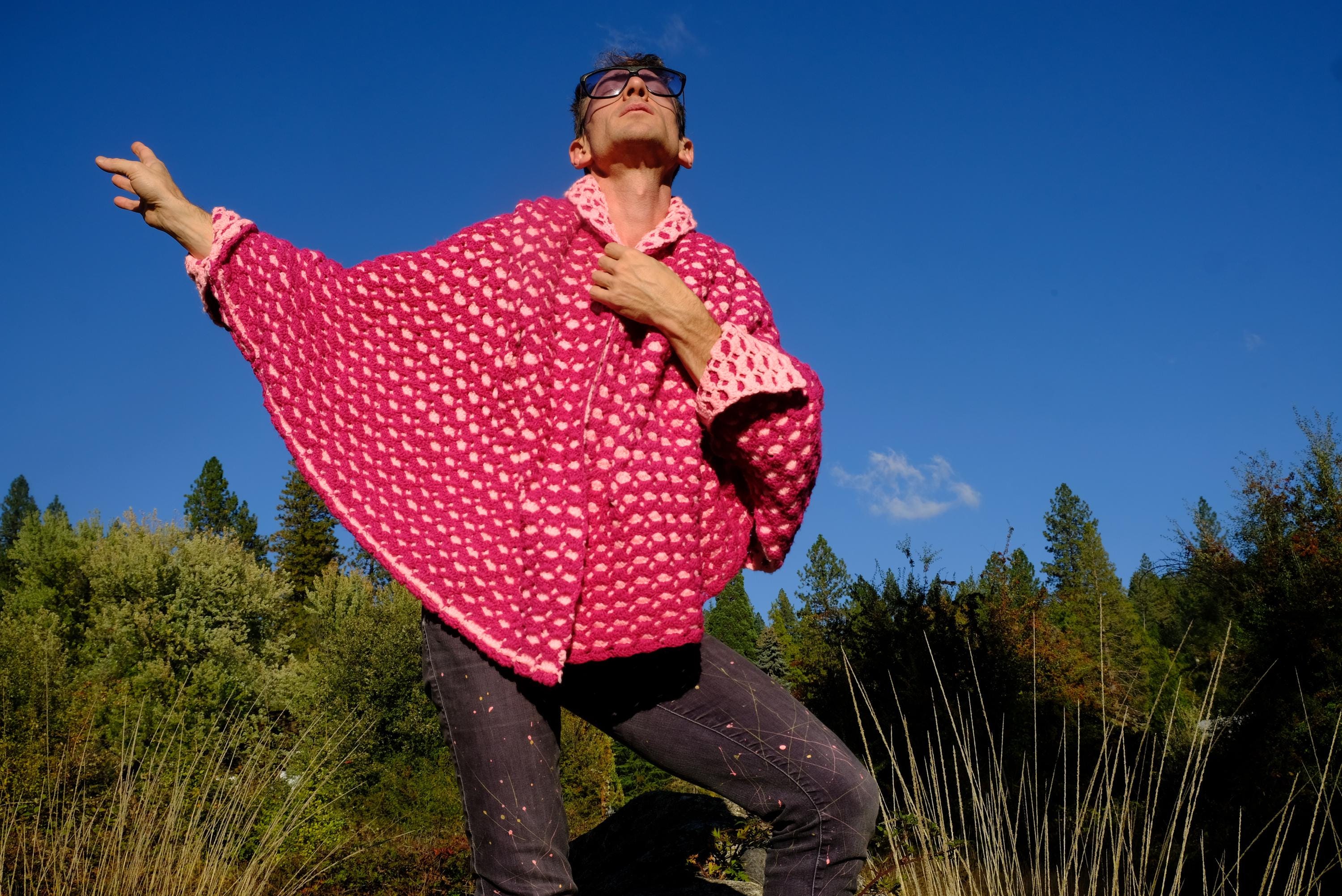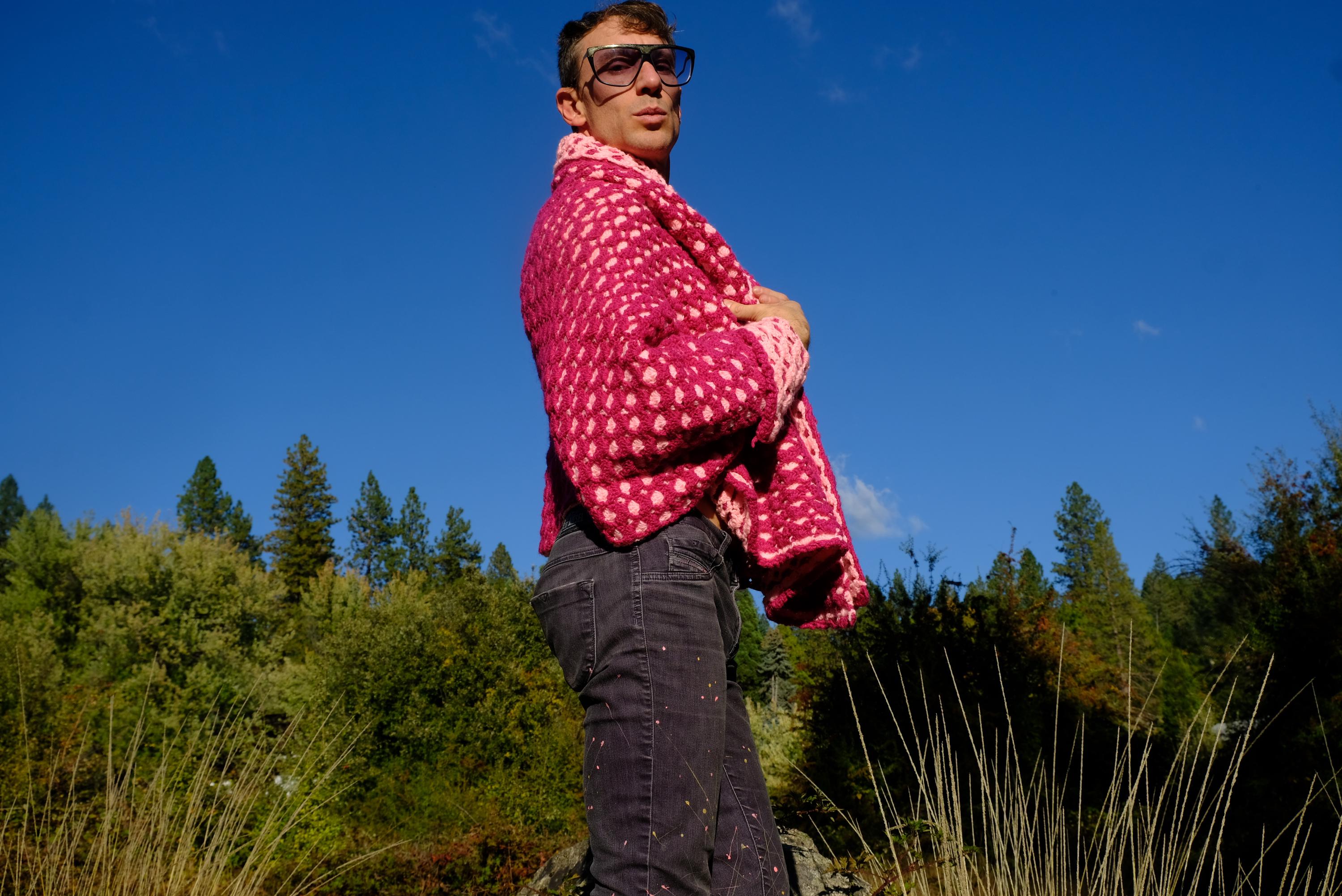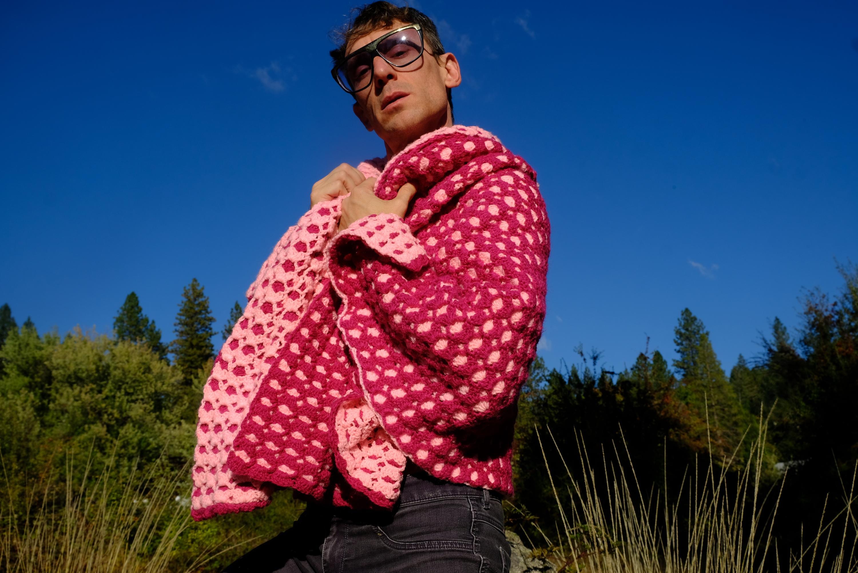 This is a crochet "cape-shrug" in 2 tones of pink. Beautifully up-cycled from a crocheted afghan blanket in 100% soft acrylic yarn and exquisitely tailored by yours truly, Lord von Schmitt.