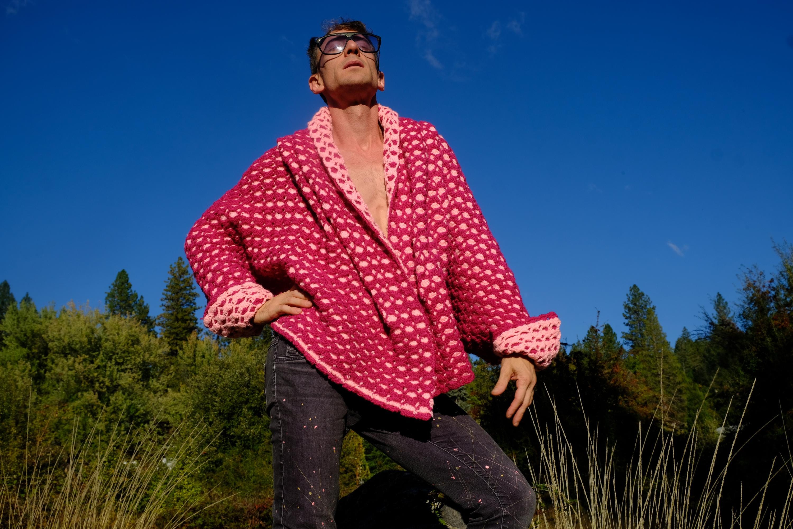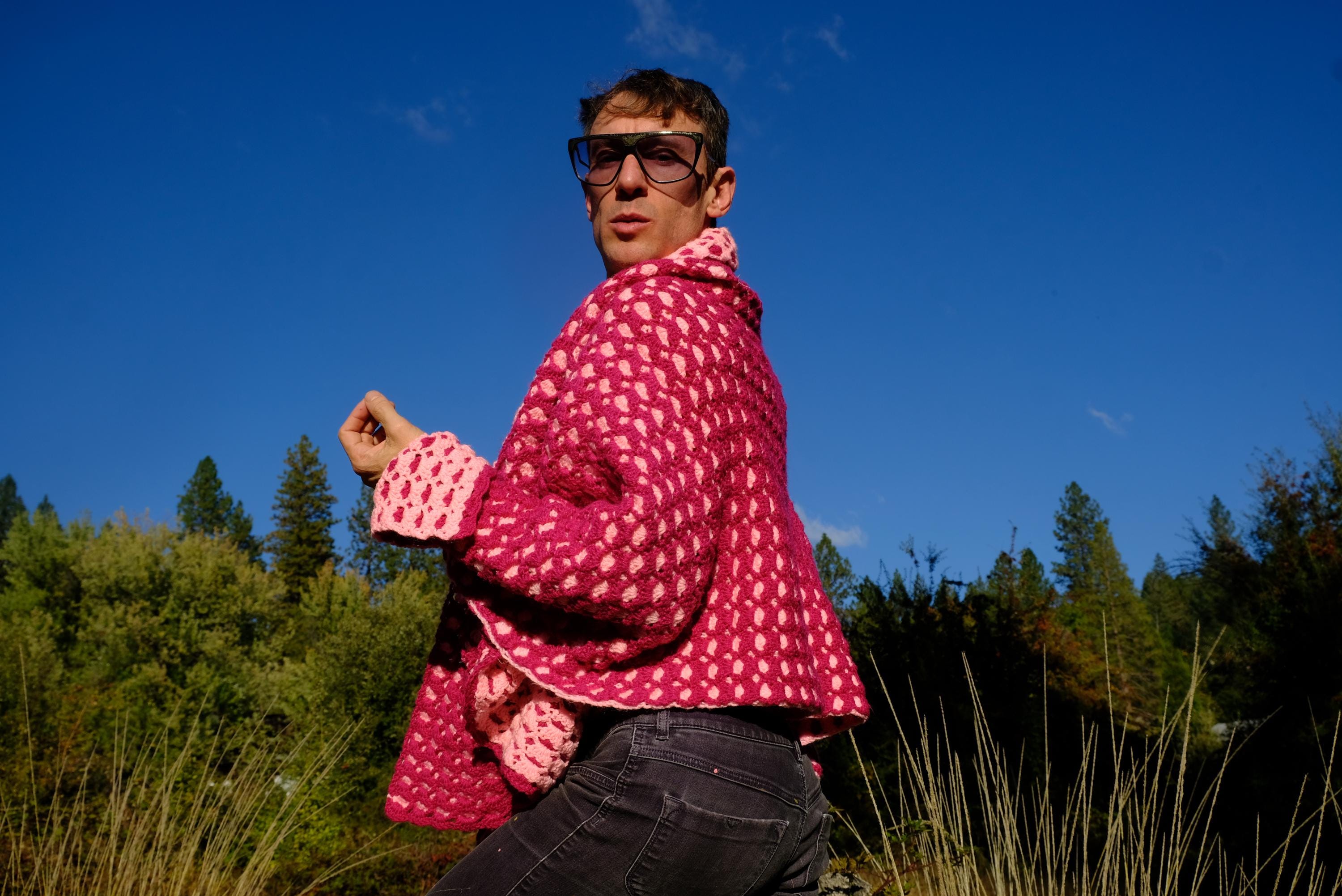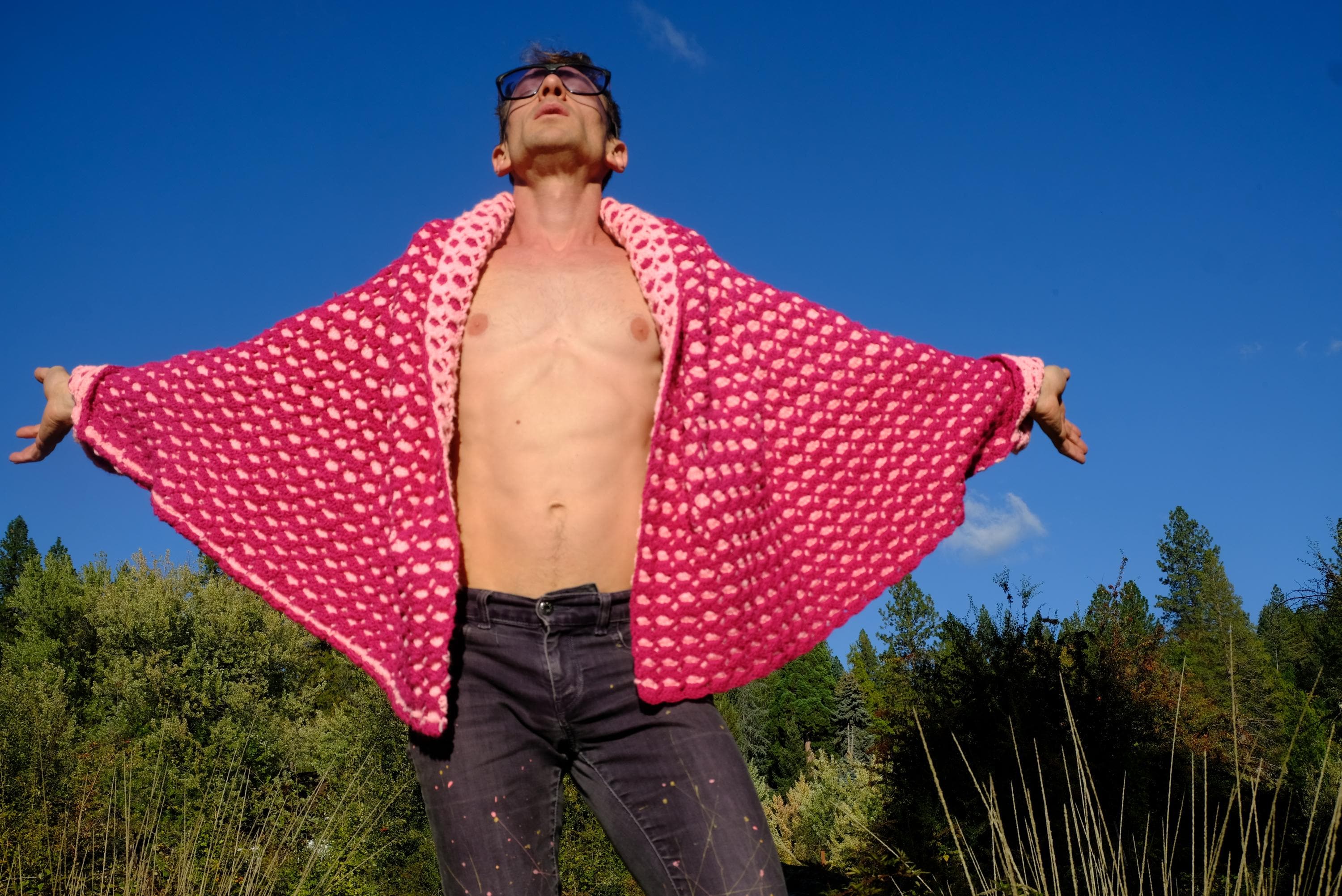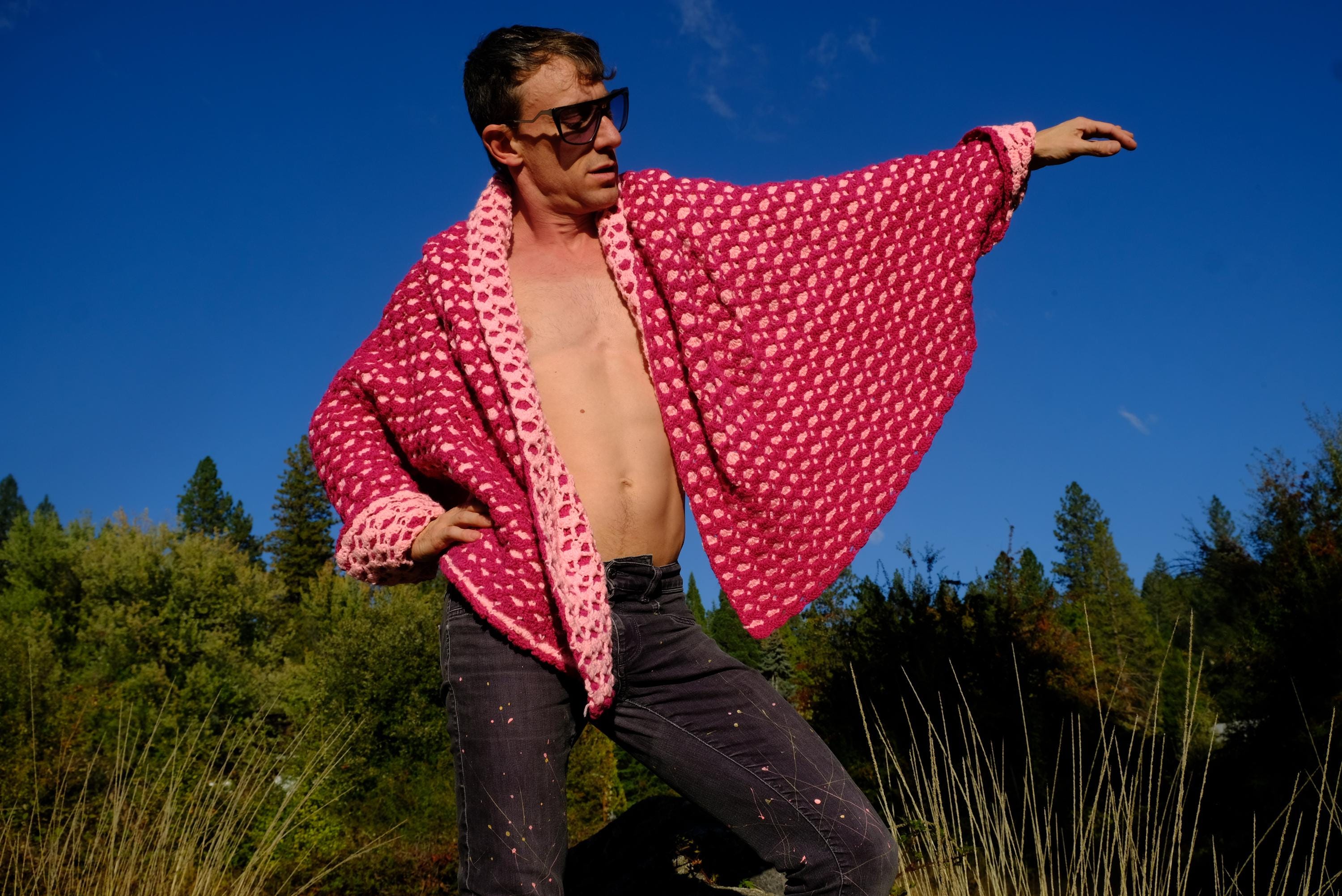 This is a crochet "cape-shrug" in 2 tones of pink. Beautifully up-cycled from a crocheted afghan blanket in 100% soft acrylic yarn and exquisitely tailored by yours truly, Lord von Schmitt.