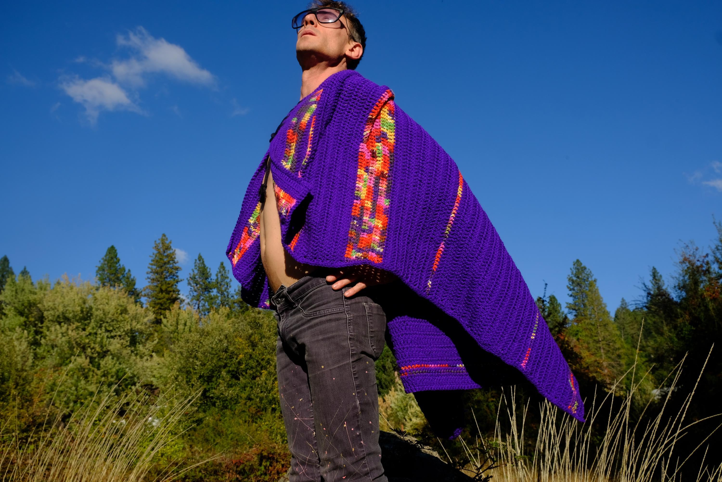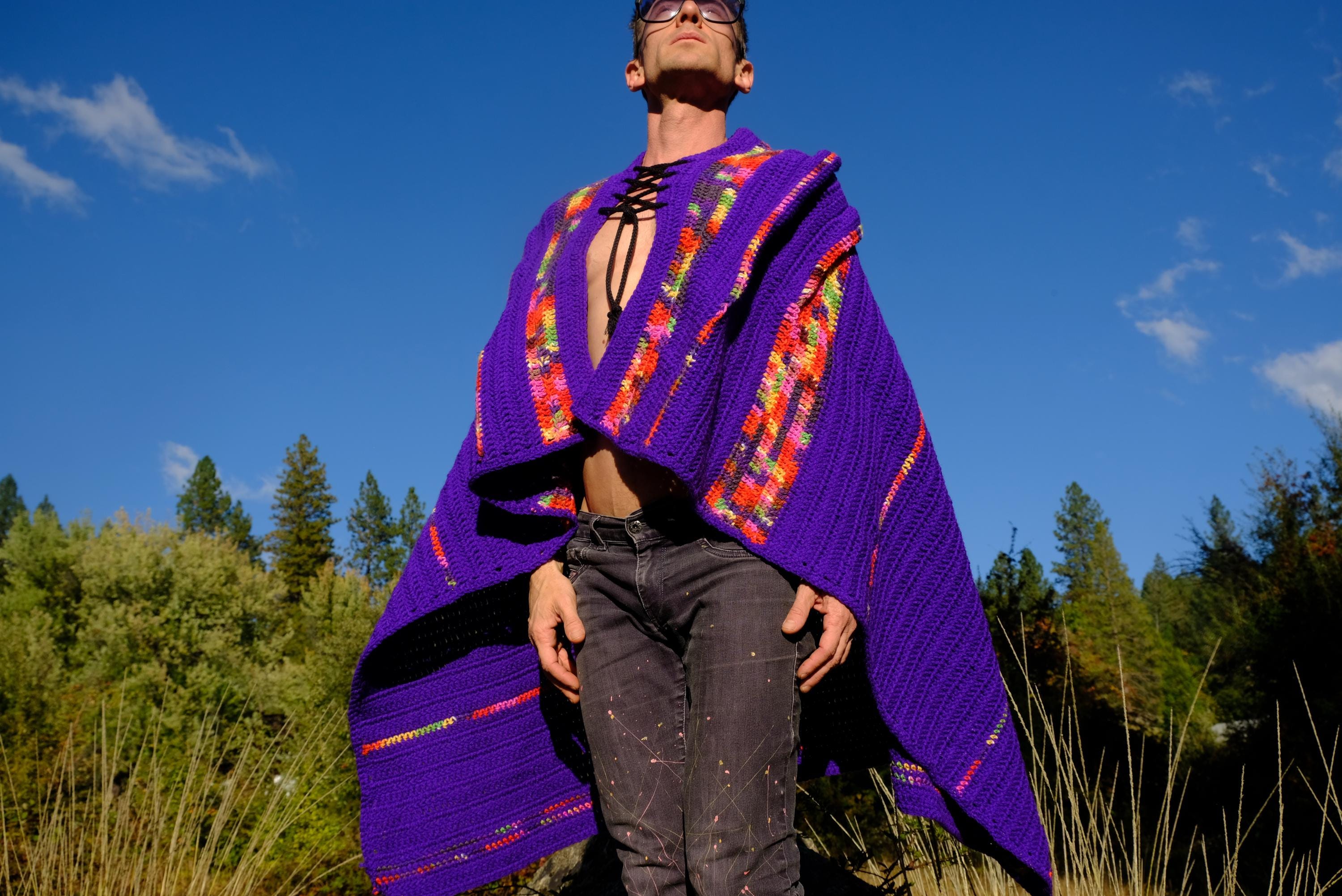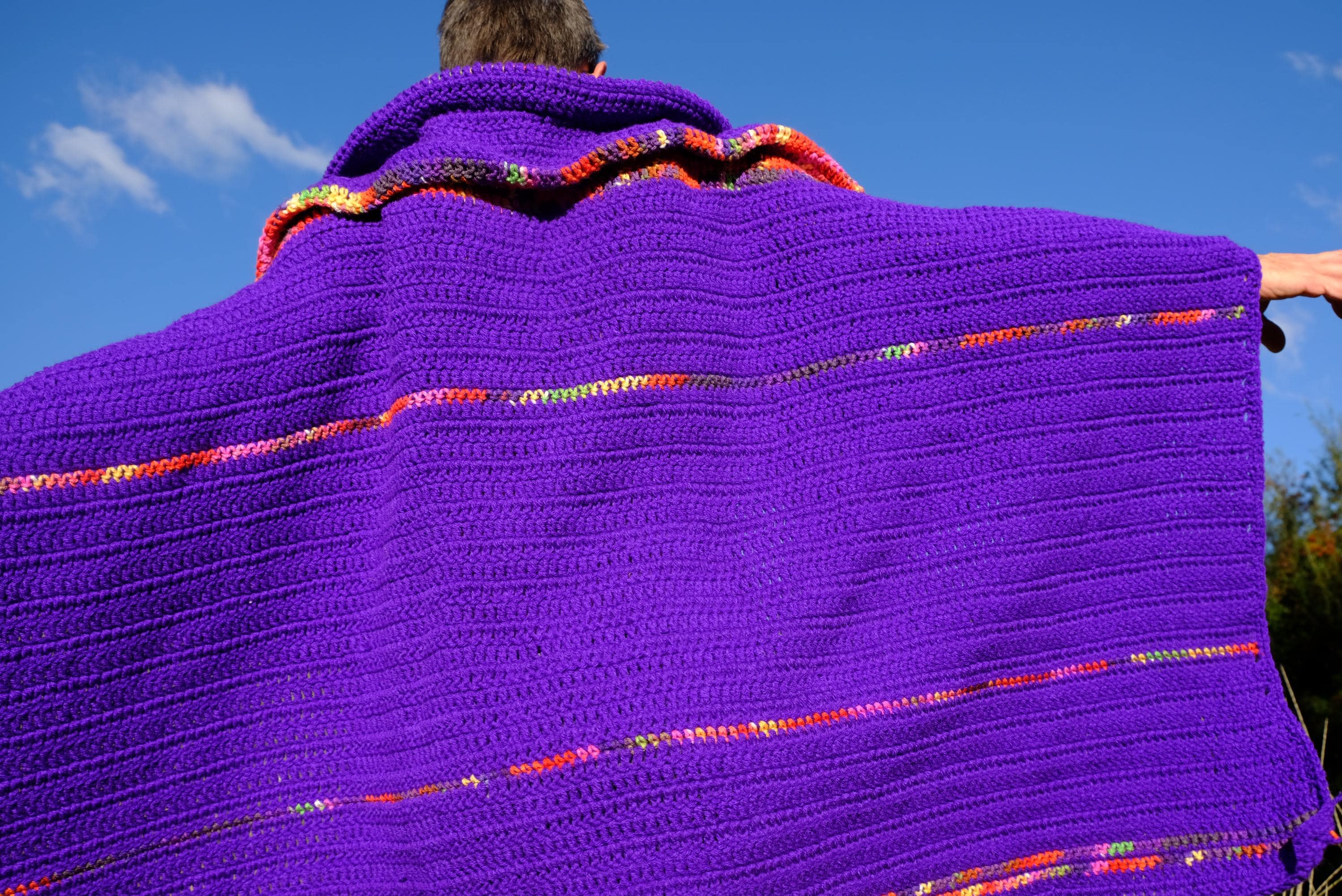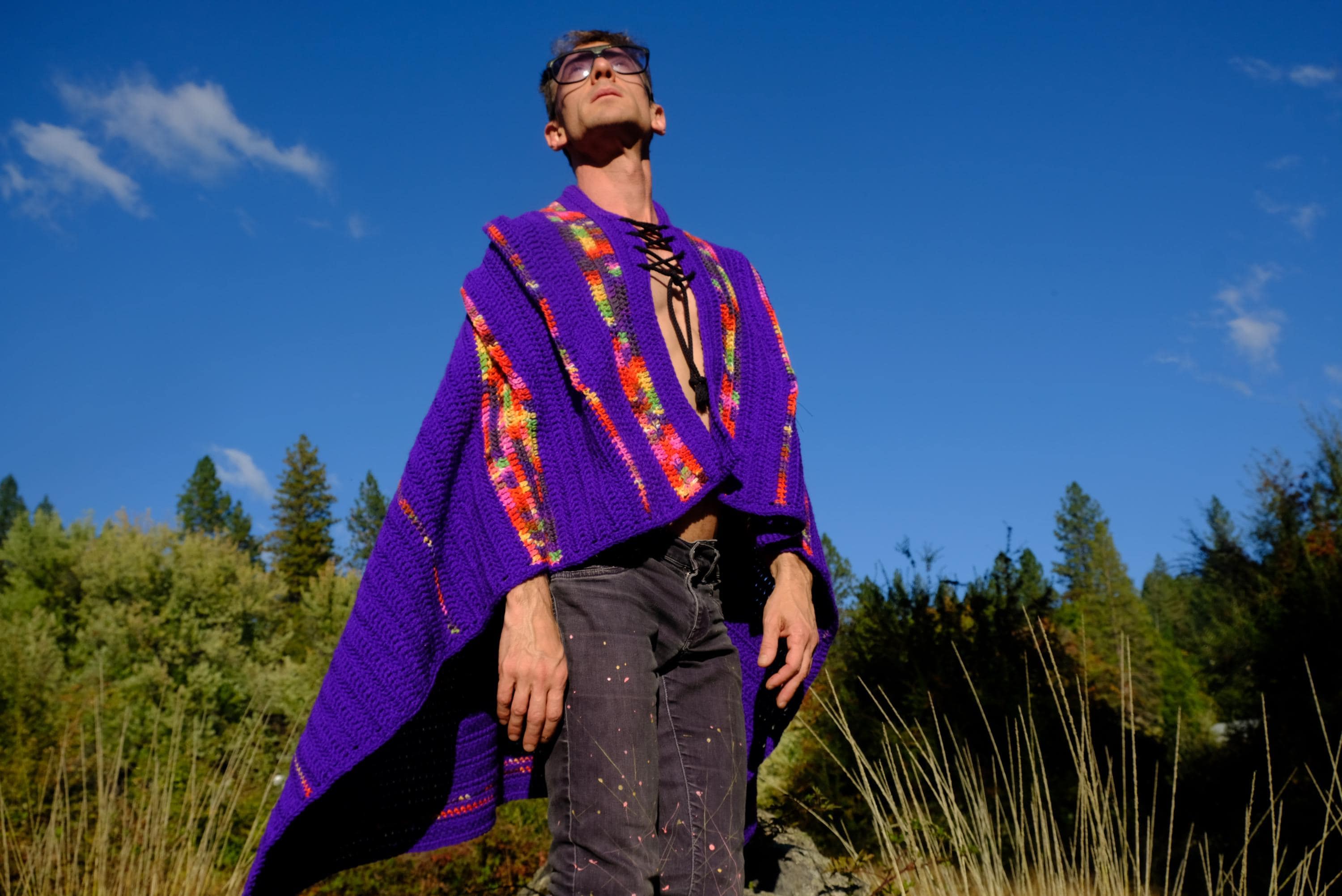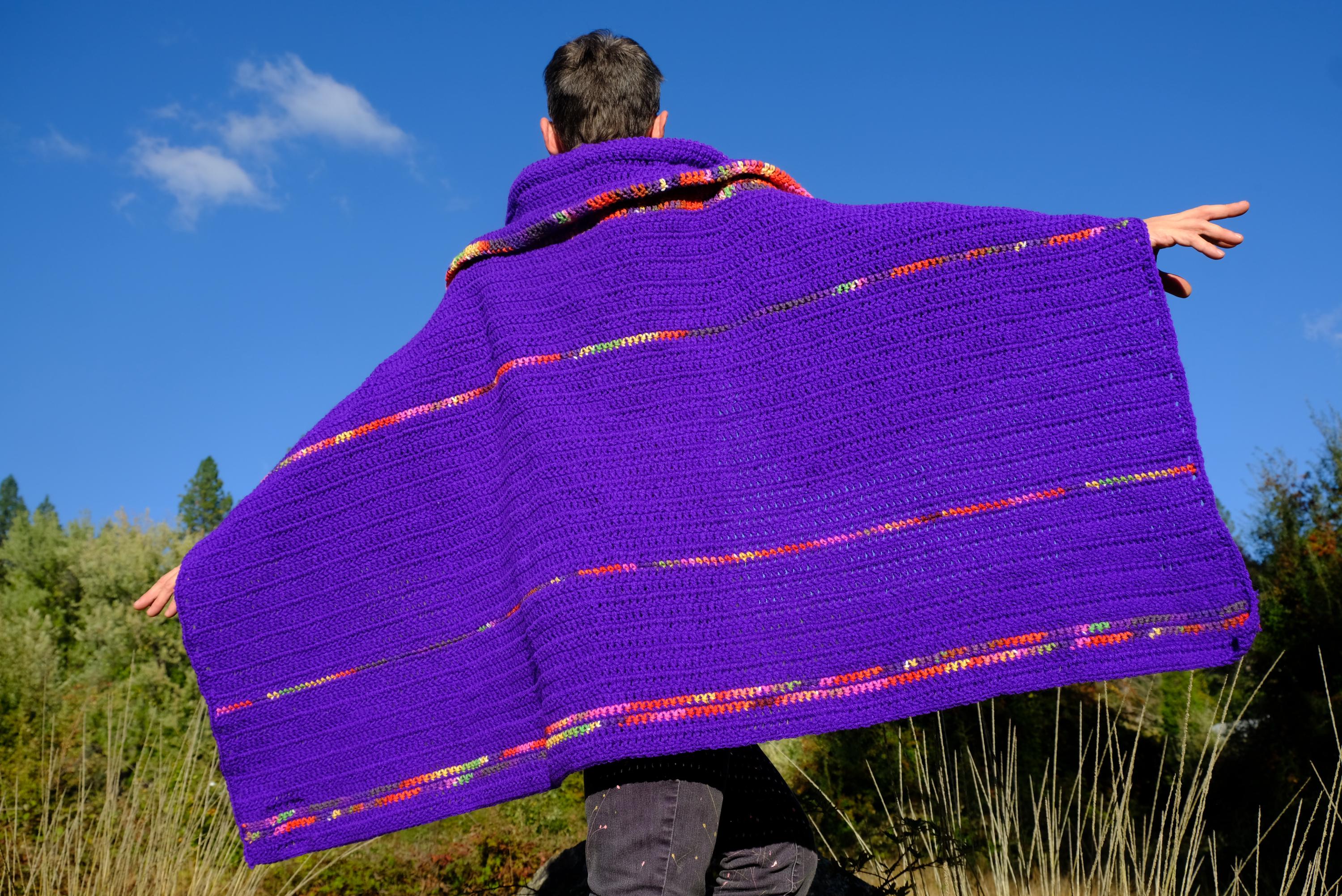 This is a crochet cape with candy colored variegated stripes on purple. Beautifully up-cycled from a crocheted afghan blanket in 100% soft acrylic yarn and exquisitely tailored by yours truly, Lord von Schmitt.