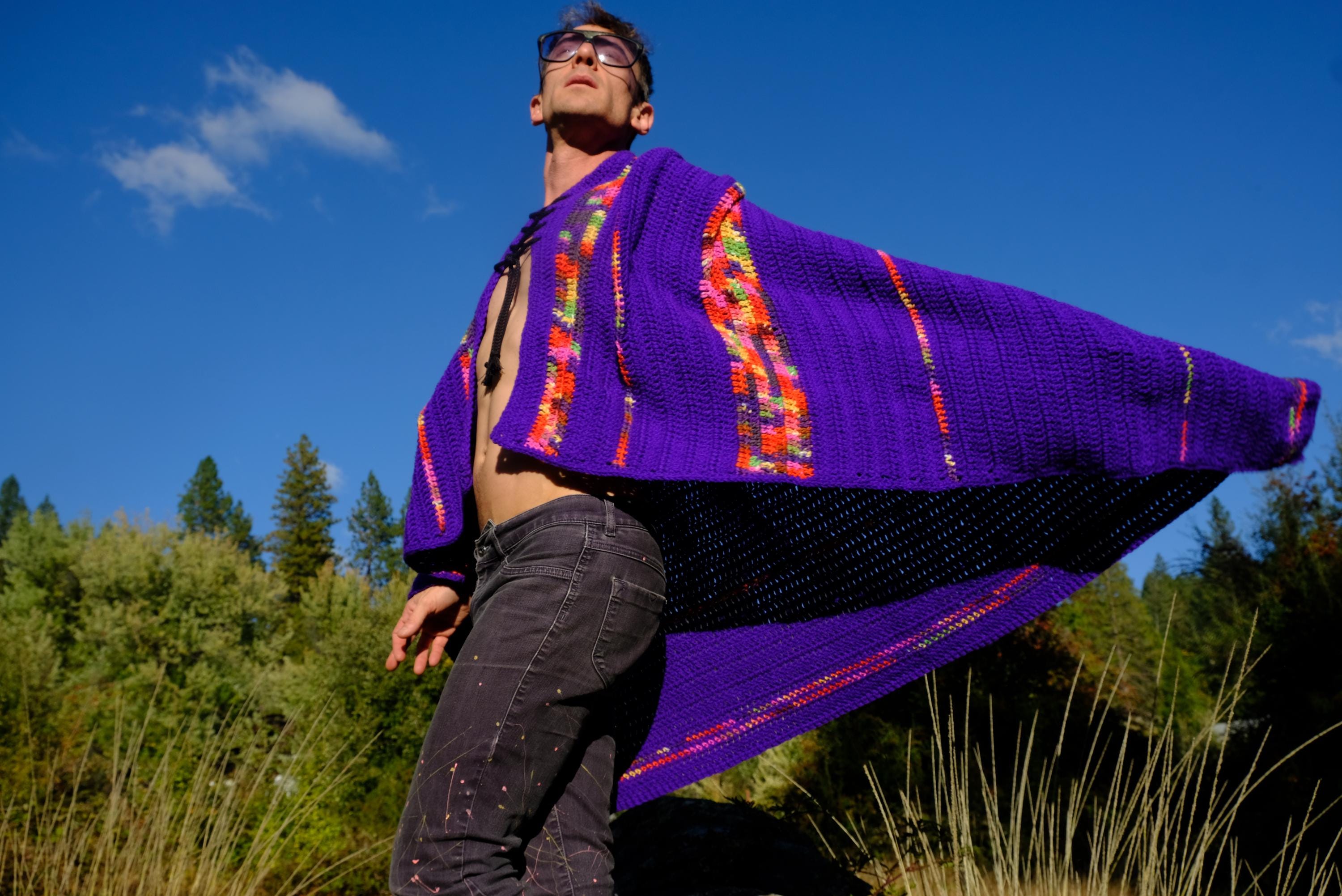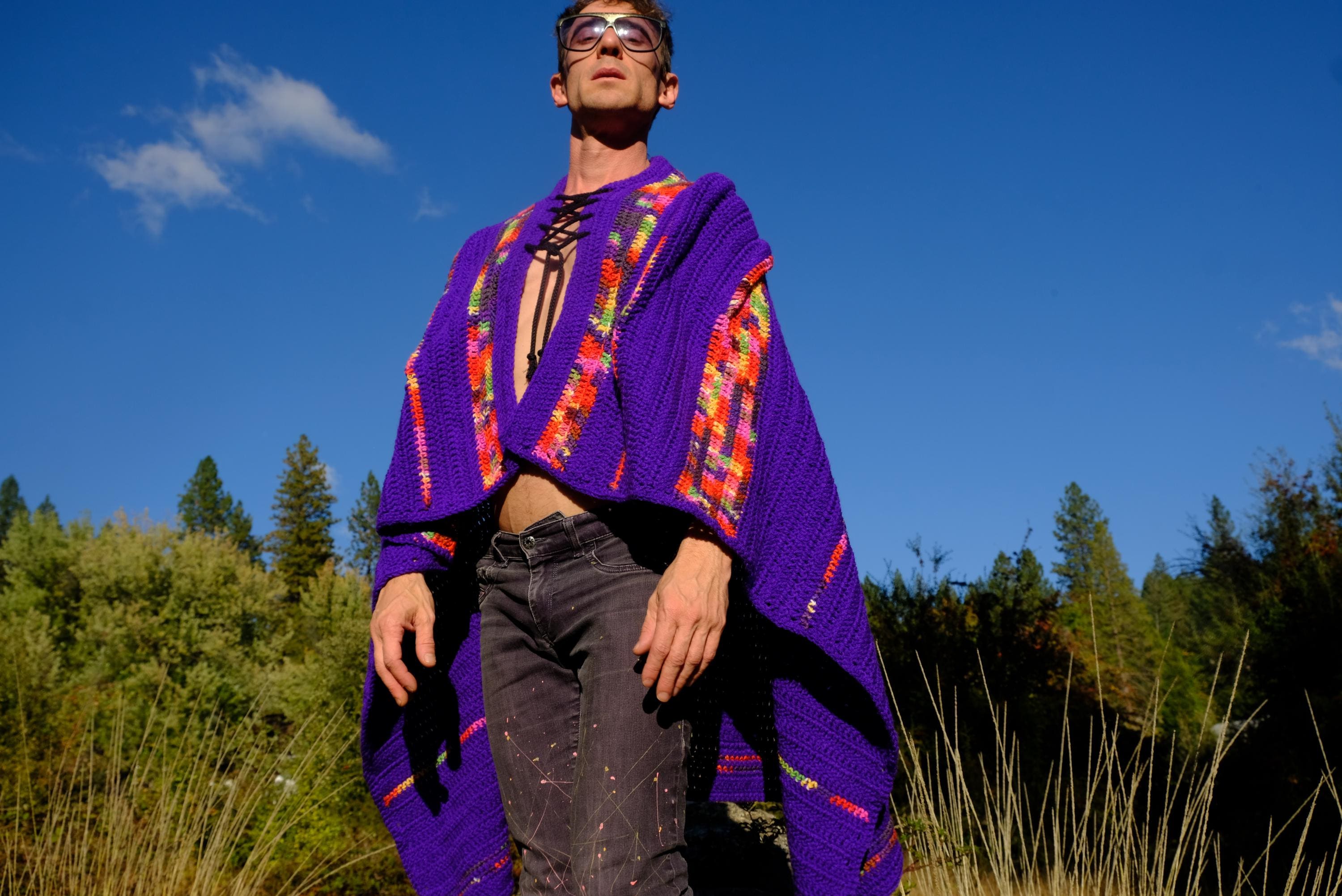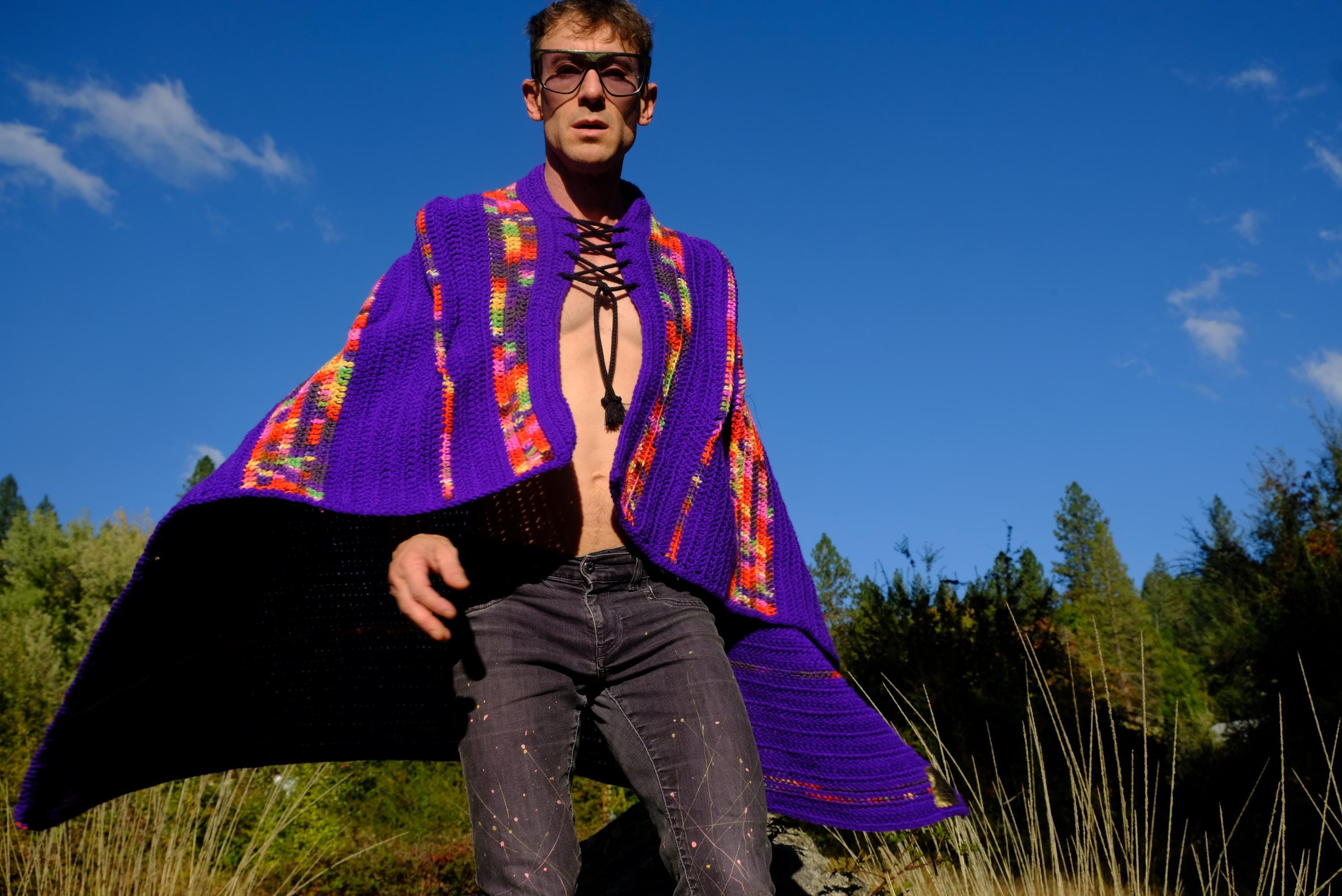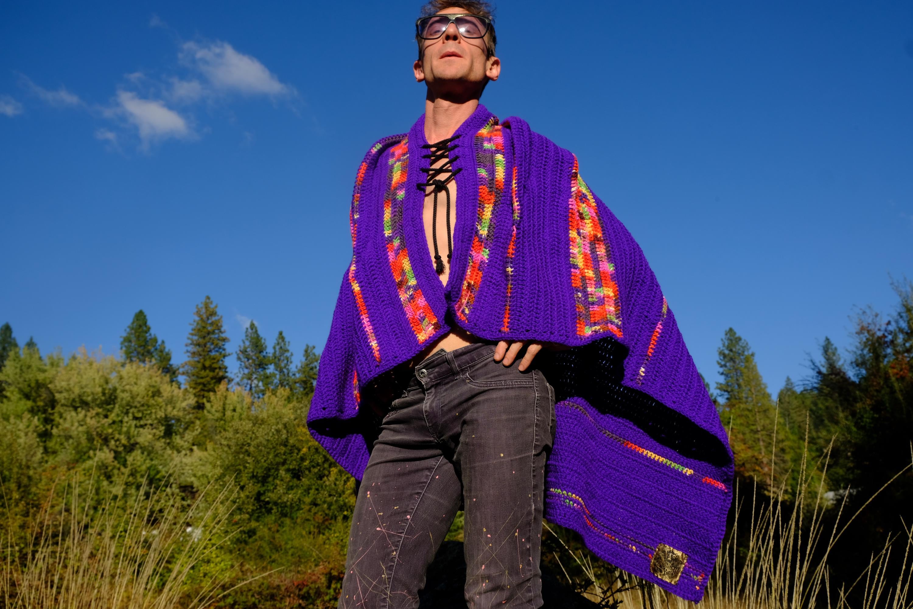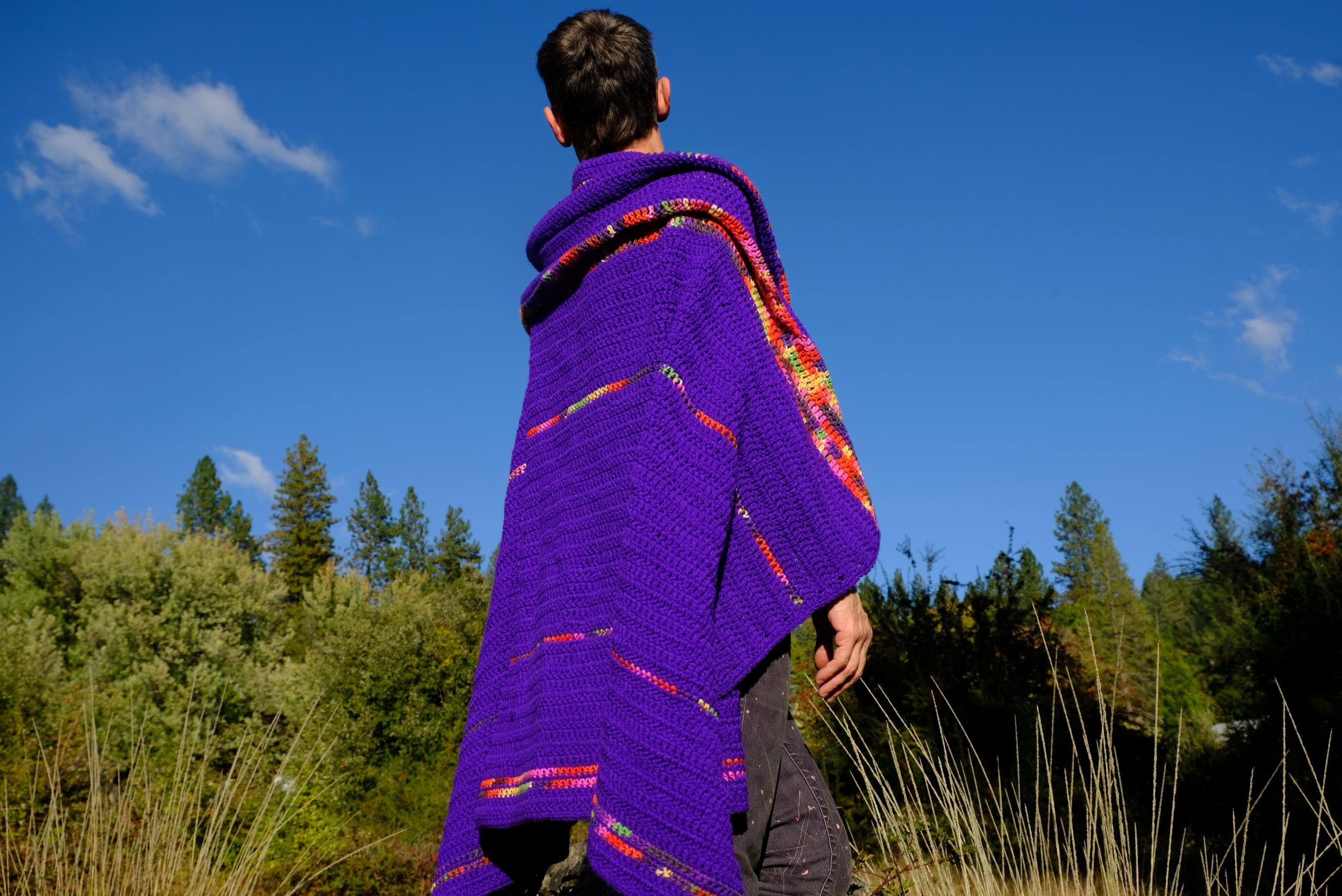 This is a crochet cape with candy colored variegated stripes on purple. Beautifully up-cycled from a crocheted afghan blanket in 100% soft acrylic yarn and exquisitely tailored by yours truly, Lord von Schmitt.