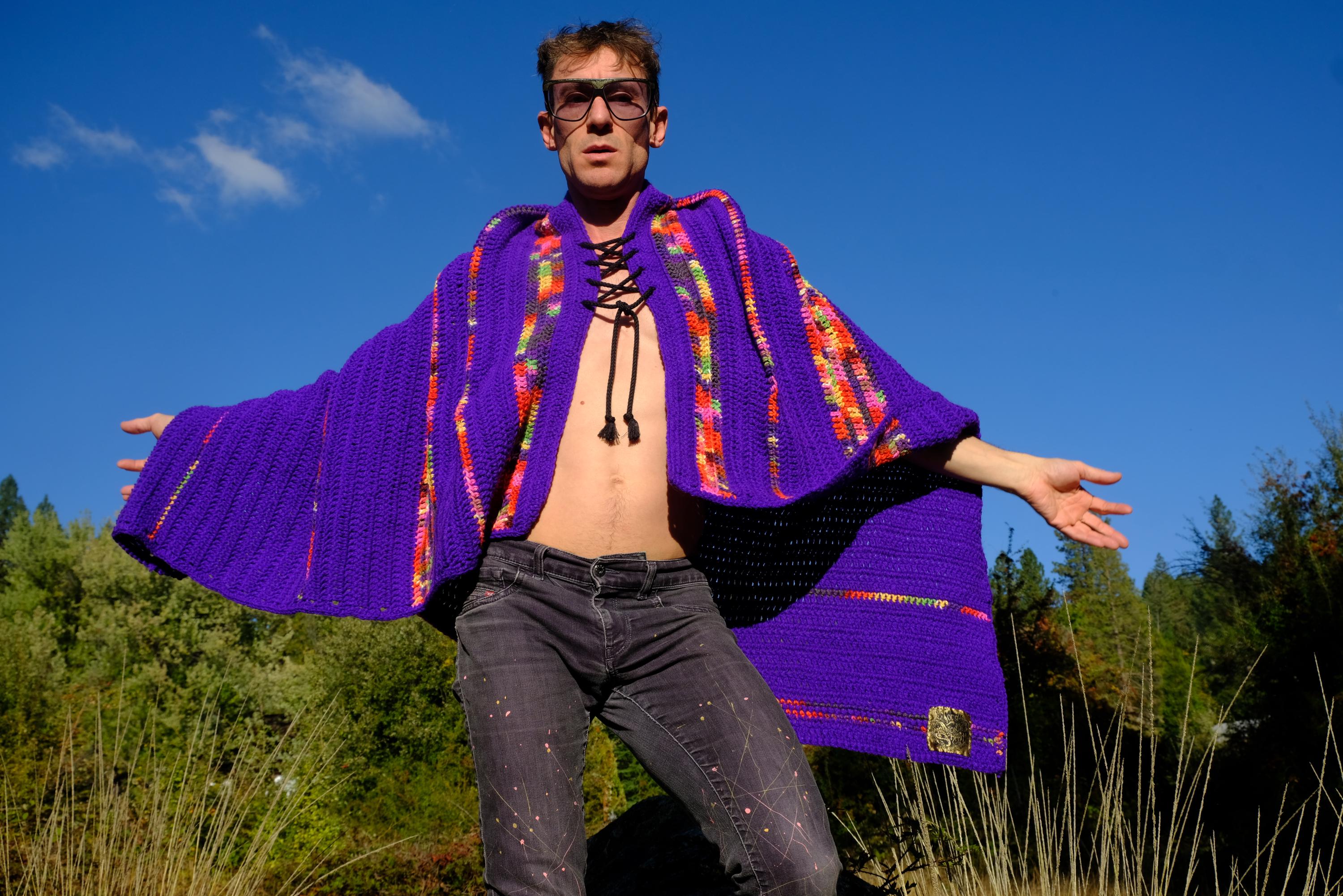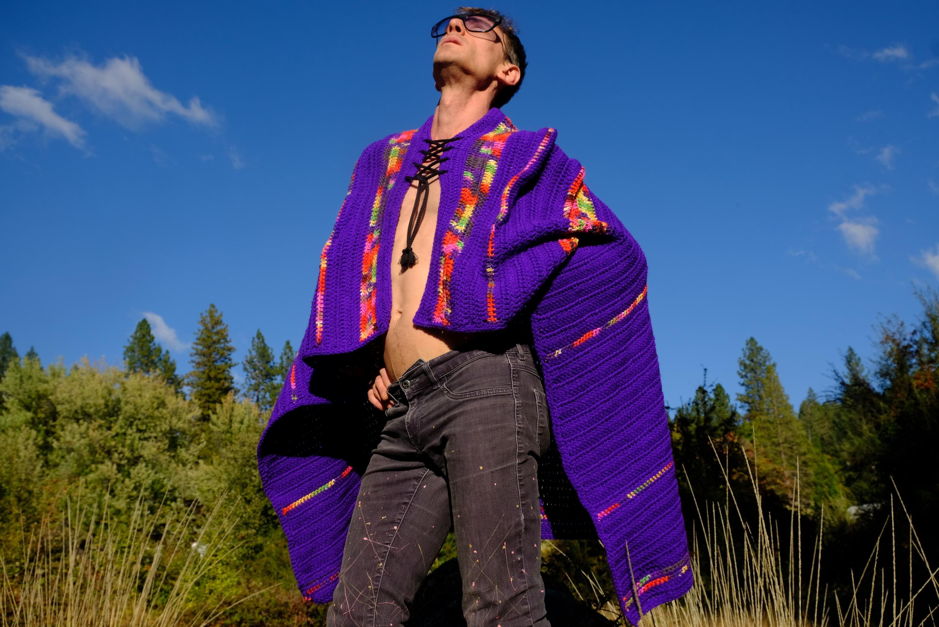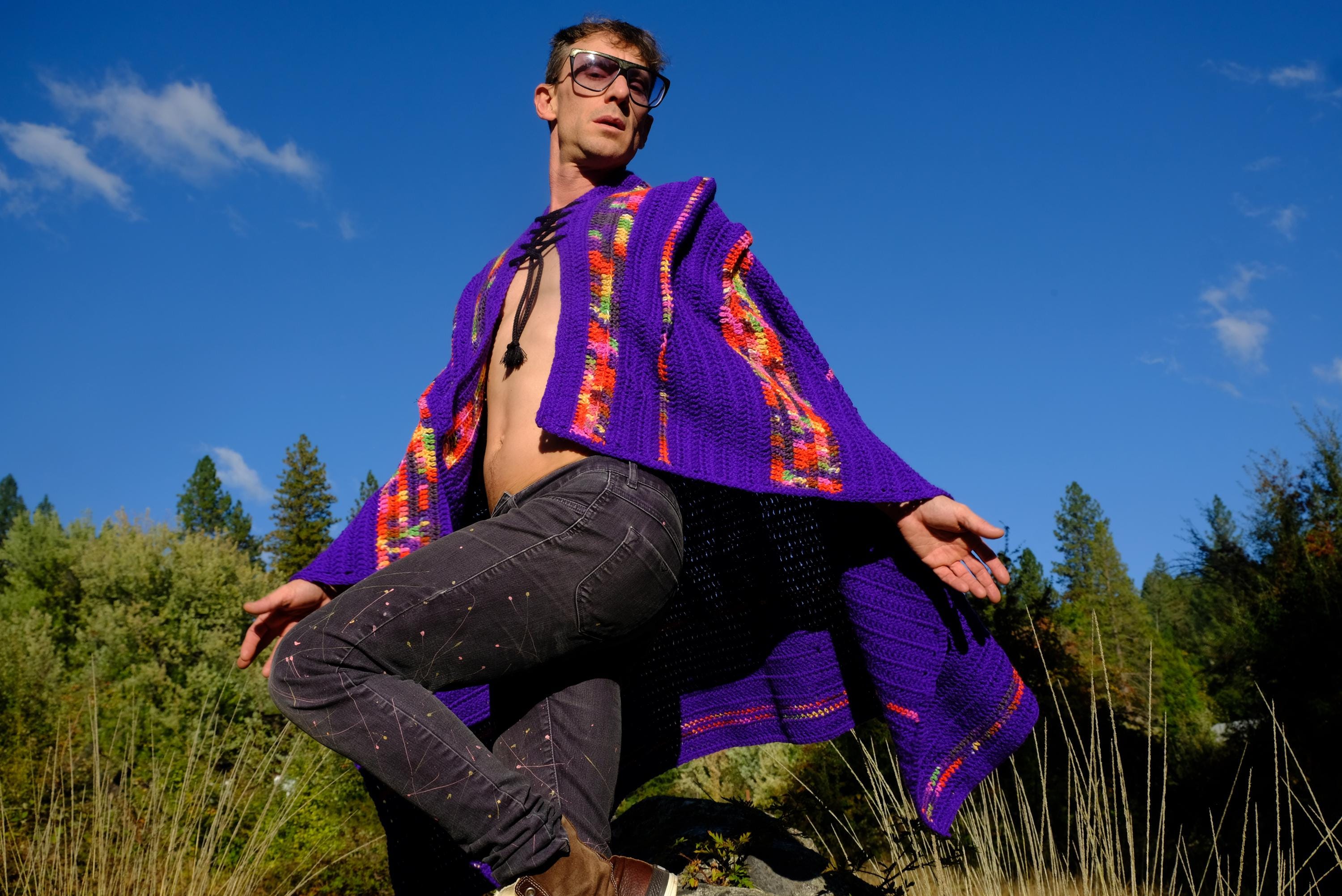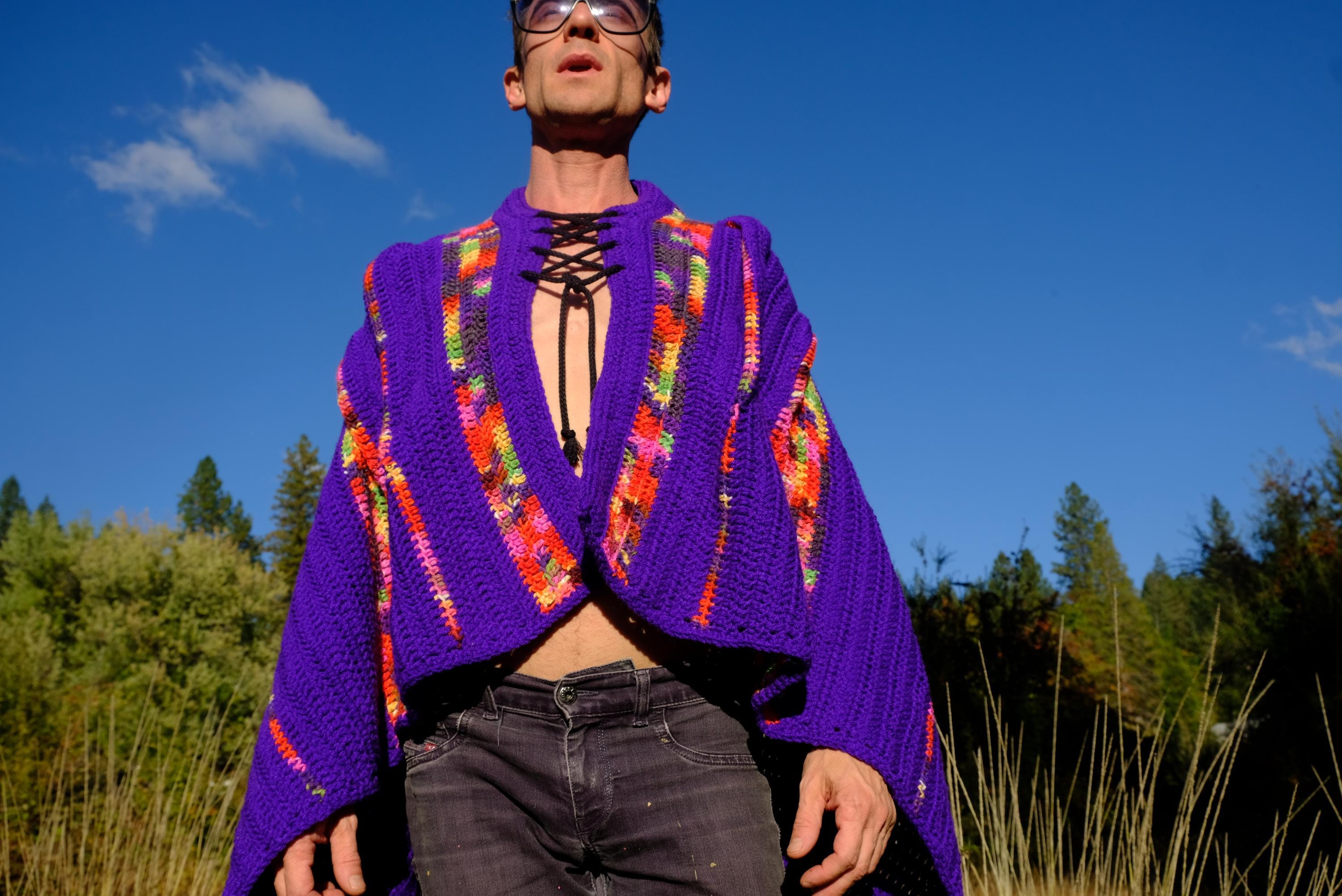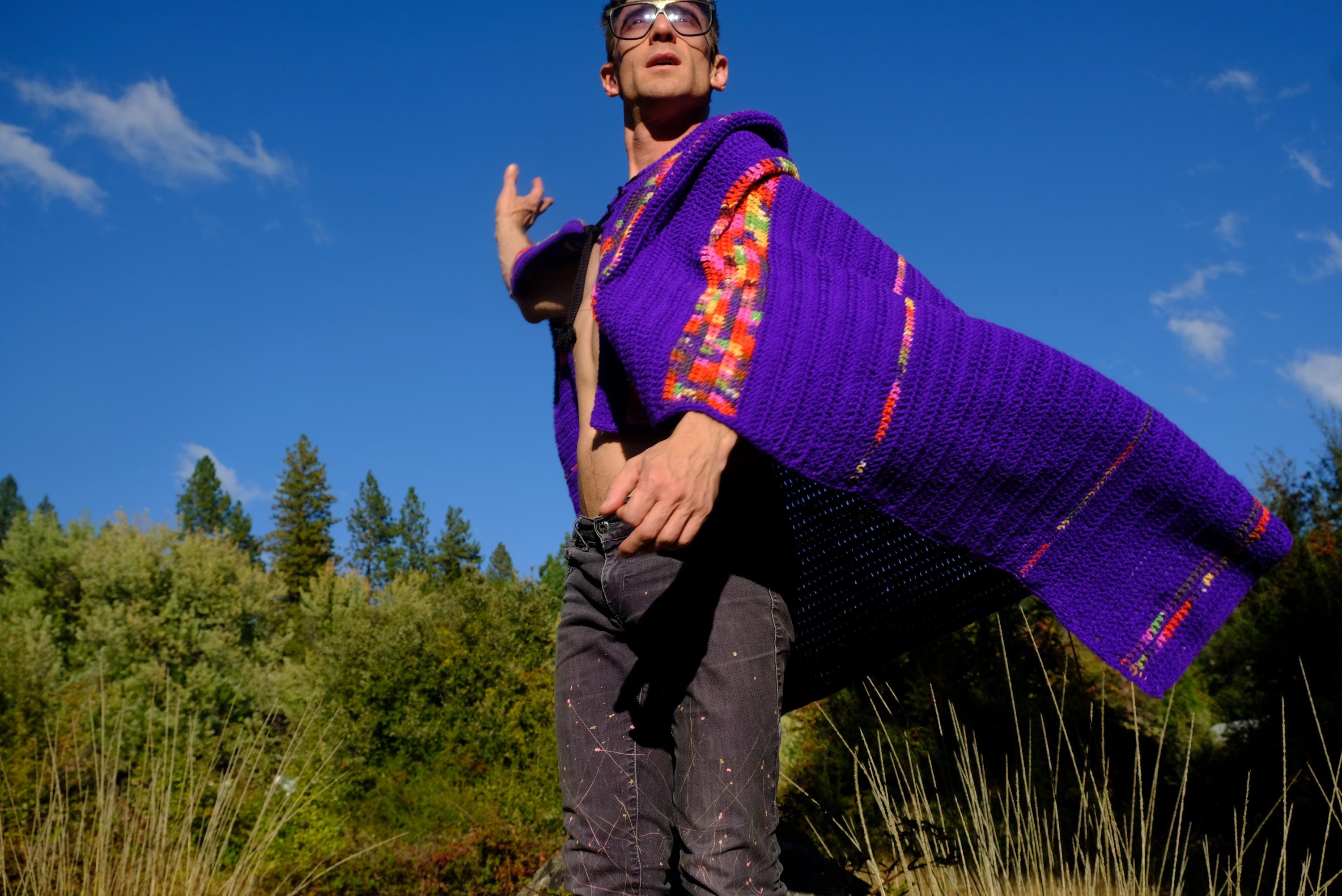 This is a crochet cape with candy colored variegated stripes on purple. Beautifully up-cycled from a crocheted afghan blanket in 100% soft acrylic yarn and exquisitely tailored by yours truly, Lord von Schmitt.