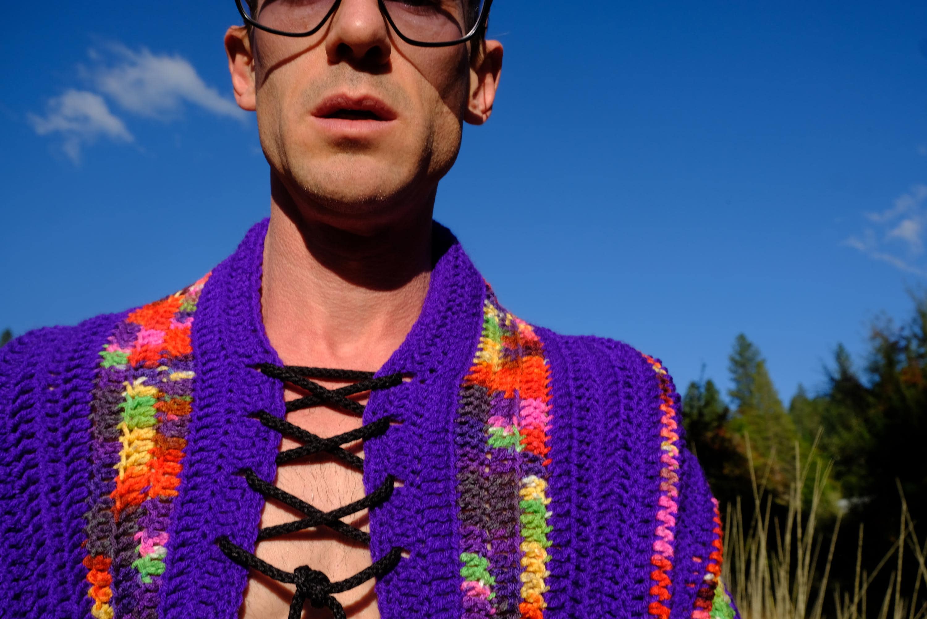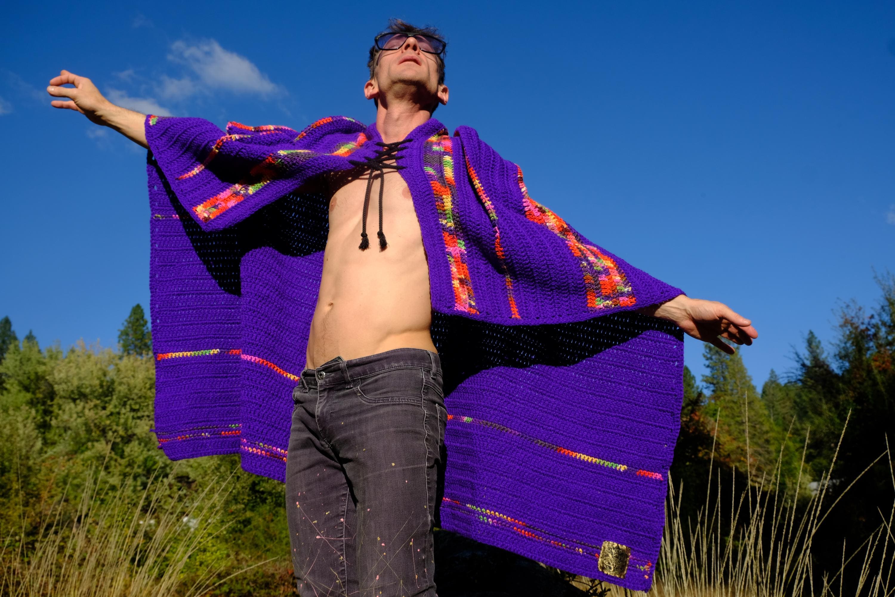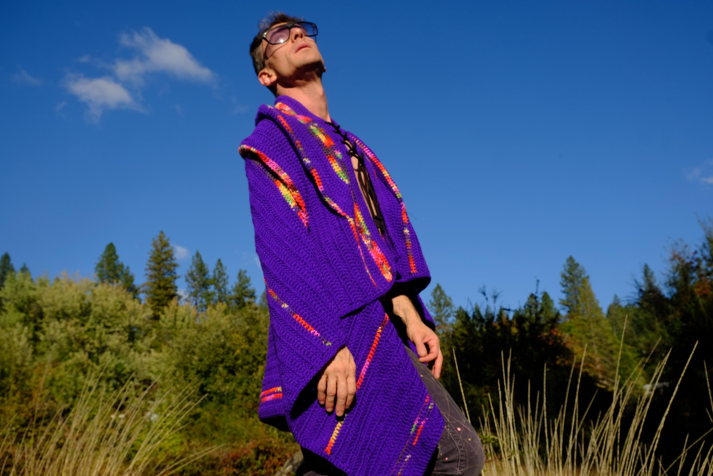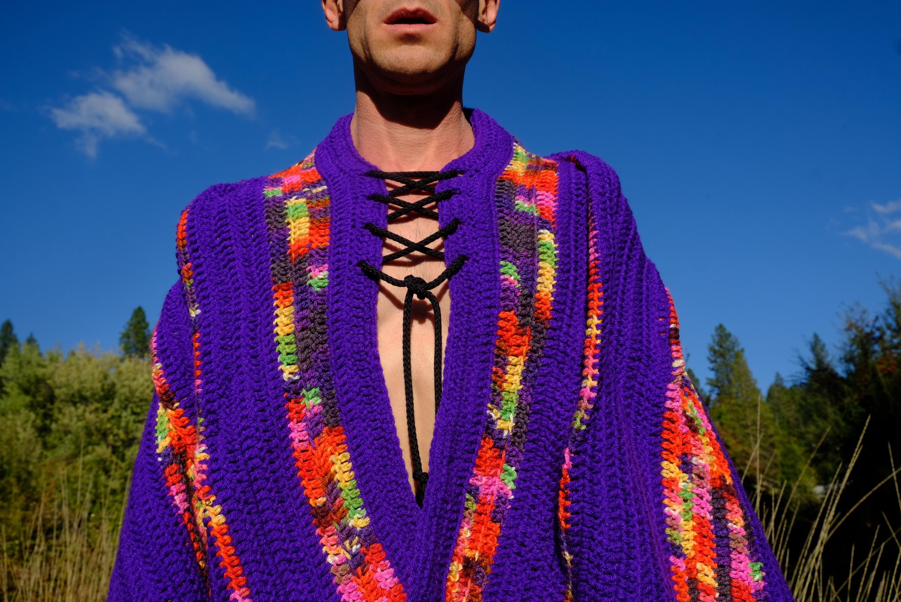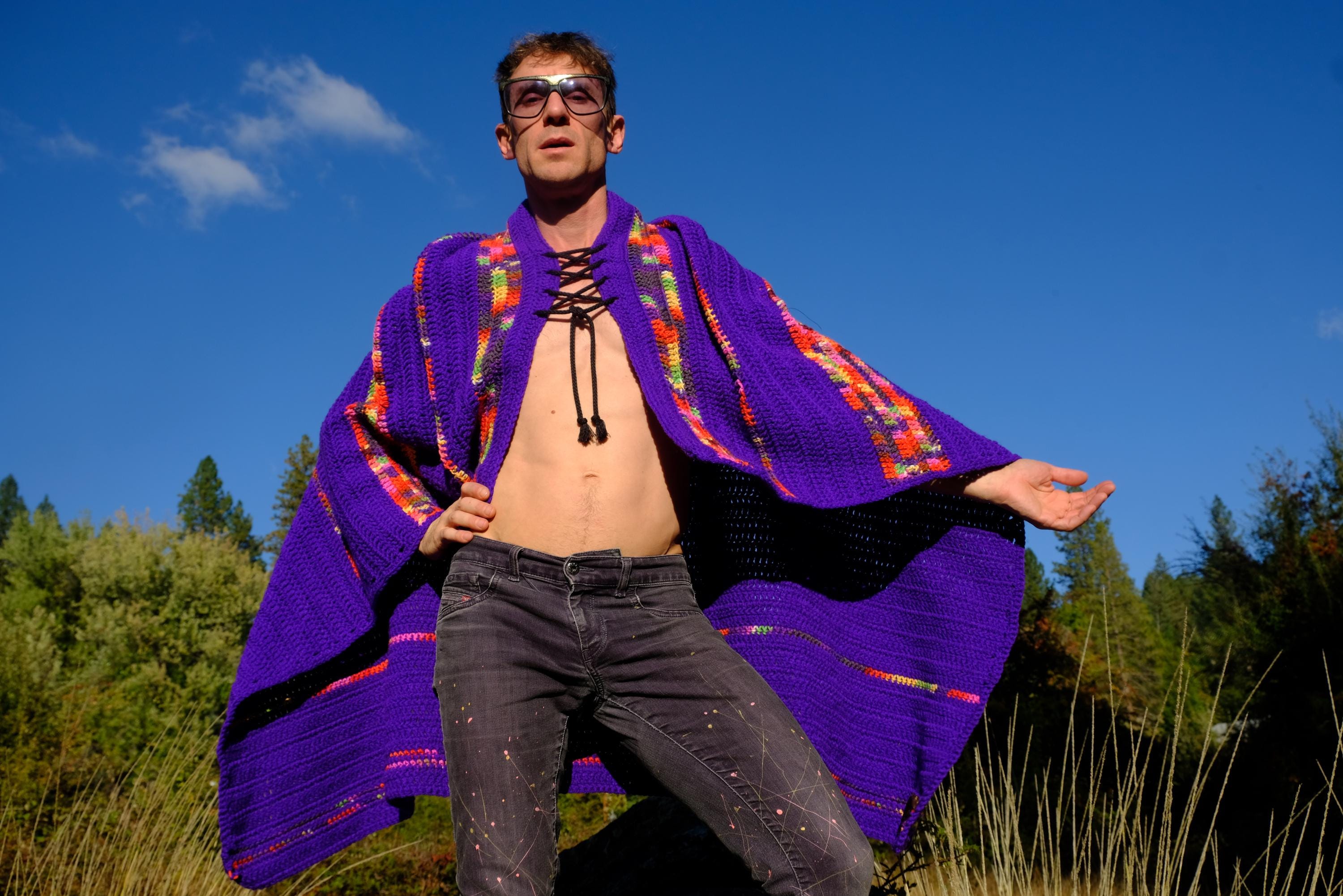 This is a crochet cape with candy colored variegated stripes on purple. Beautifully up-cycled from a crocheted afghan blanket in 100% soft acrylic yarn and exquisitely tailored by yours truly, Lord von Schmitt.