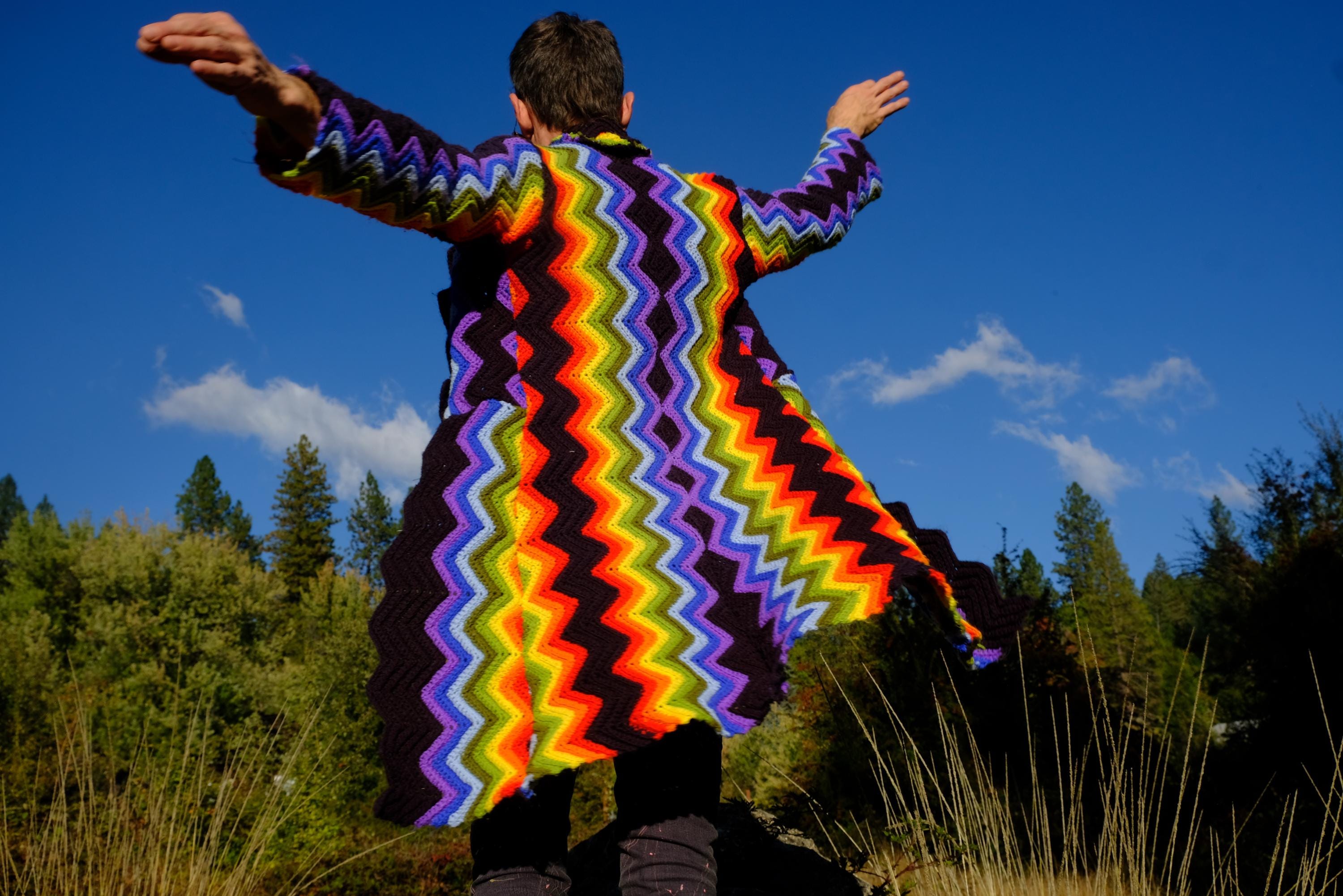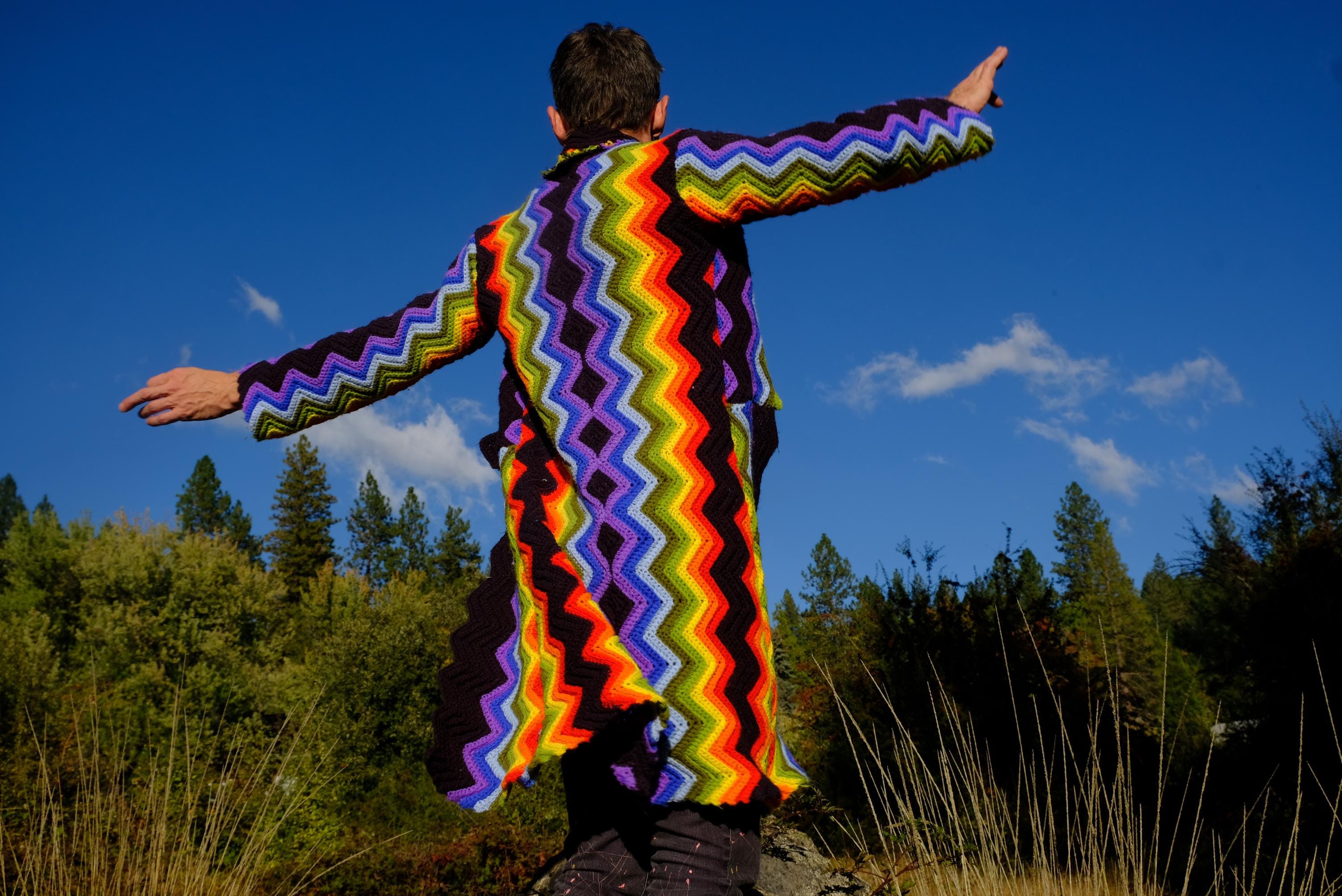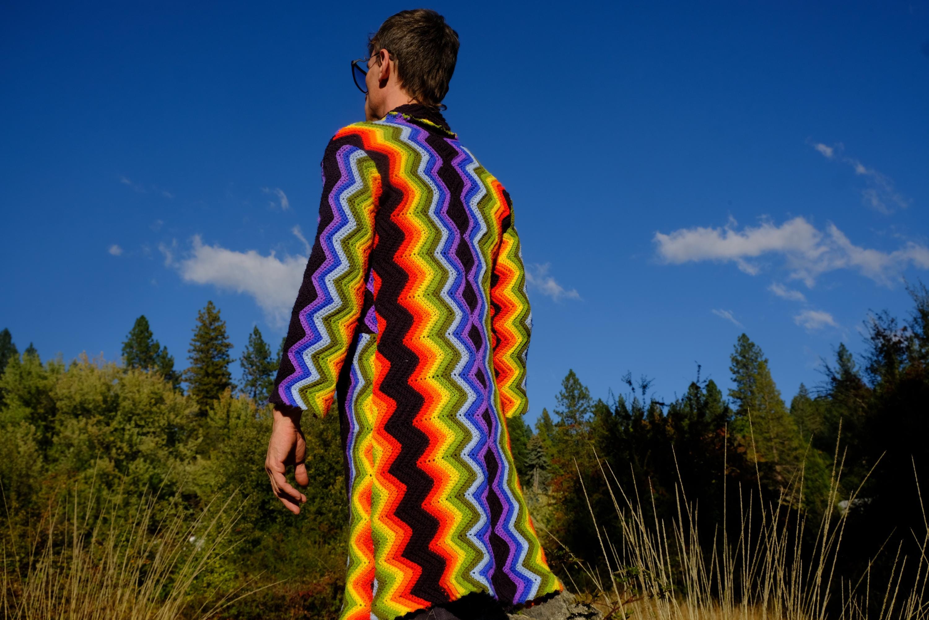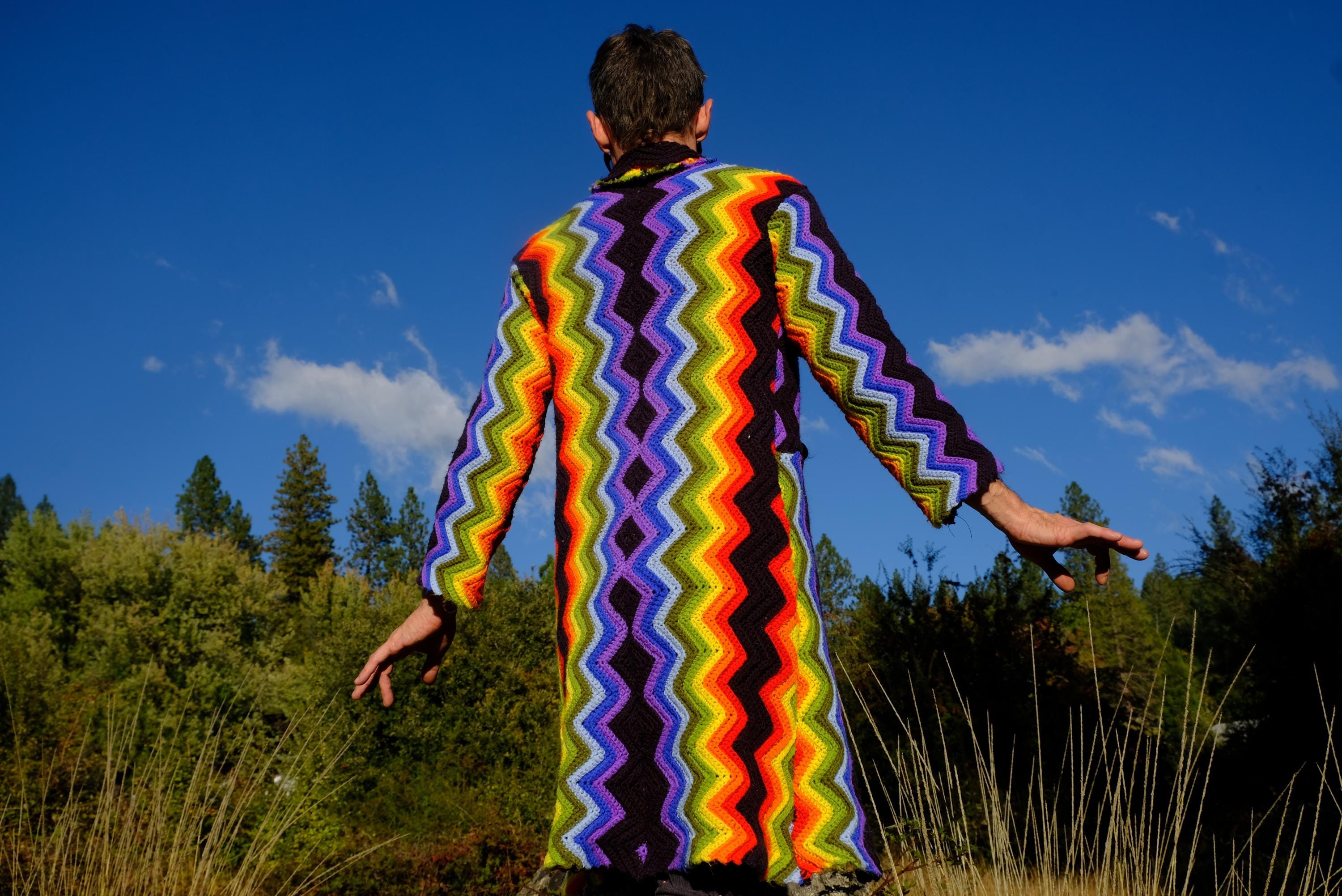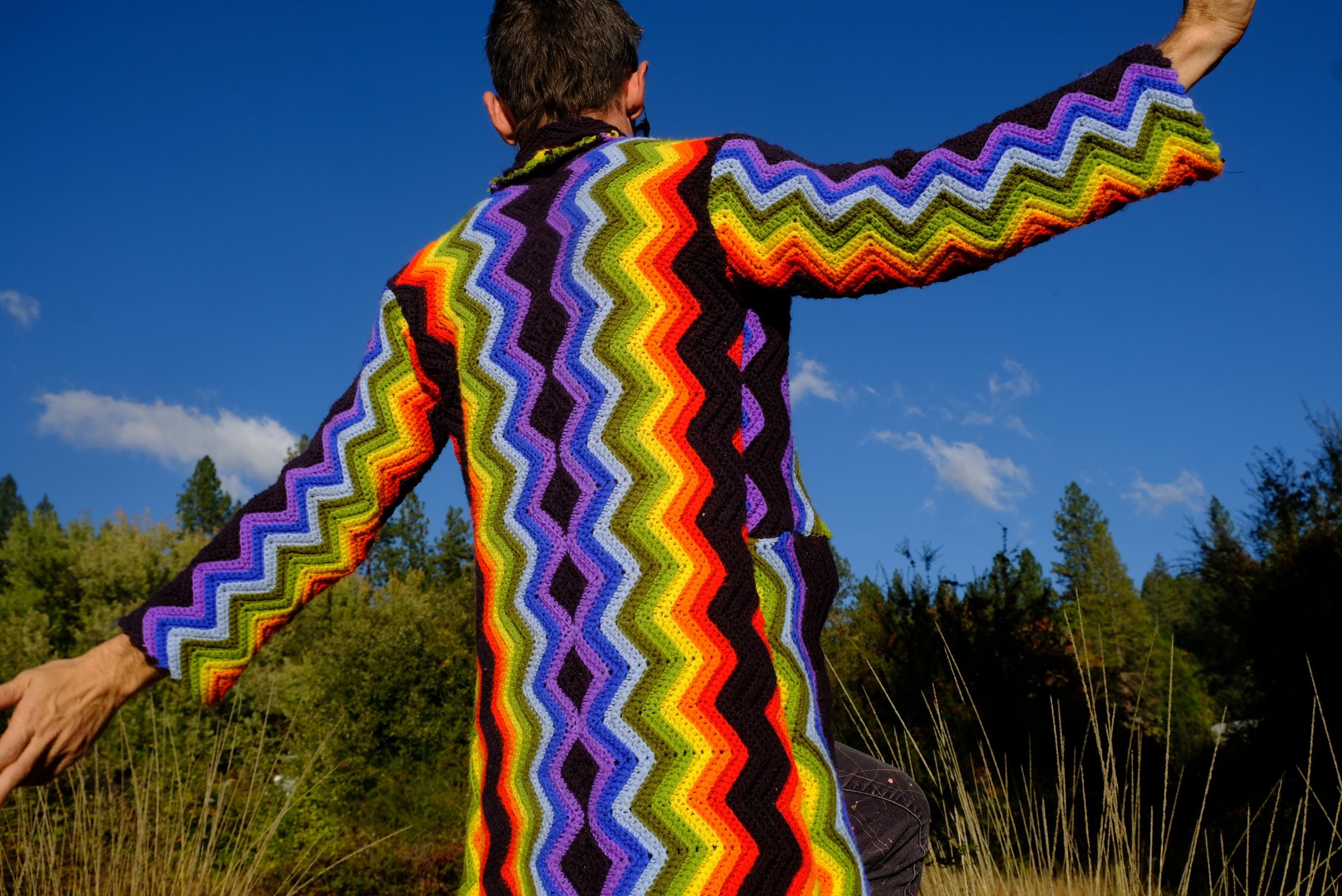 This is a crochet cutaway coat in rainbow stripes on black. Beautifully up-cycled from a vintage afghan blanket originally crocheted in a 100% acrylic yarn, and exquisitely tailored by yours truly, Lord von Schmitt.