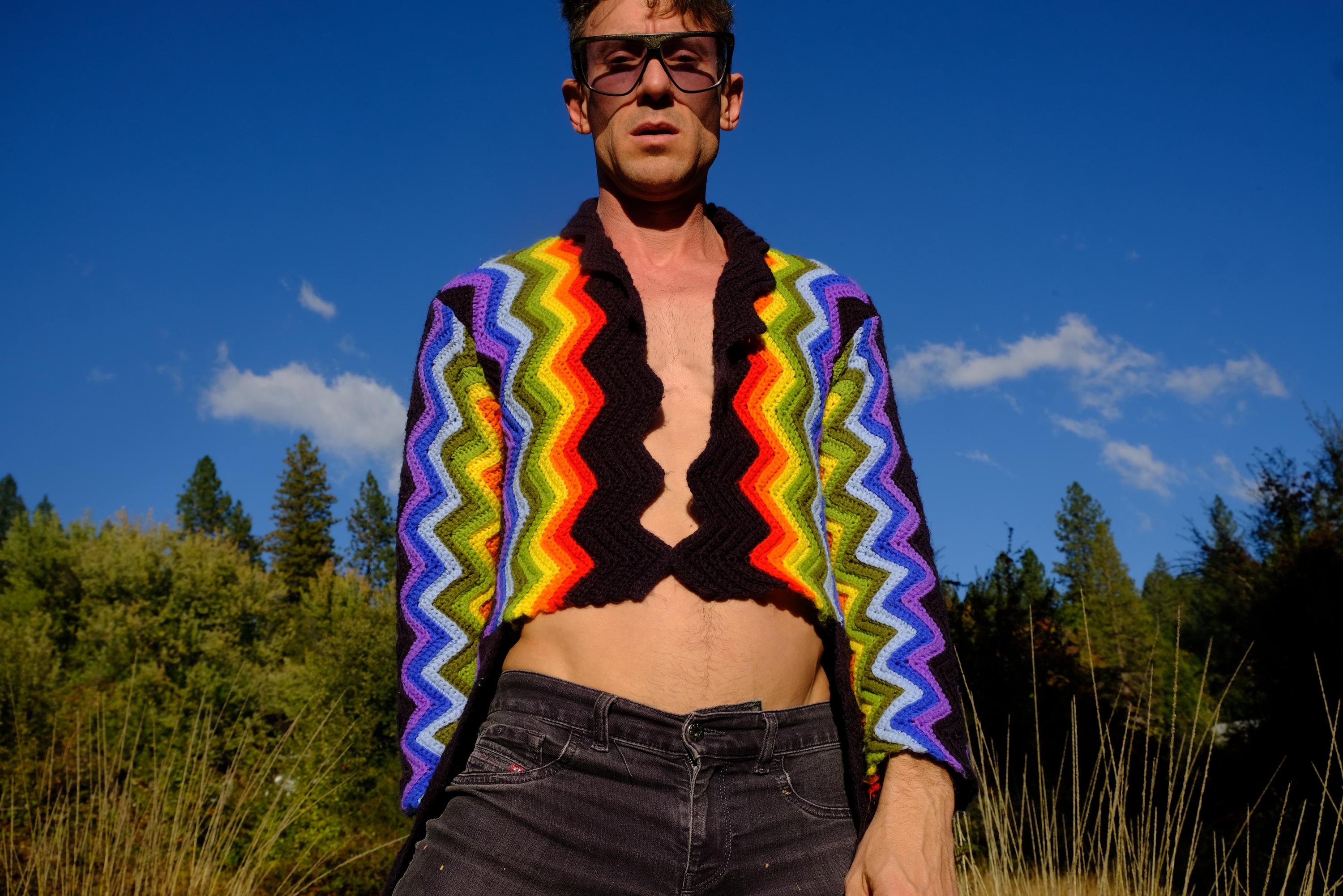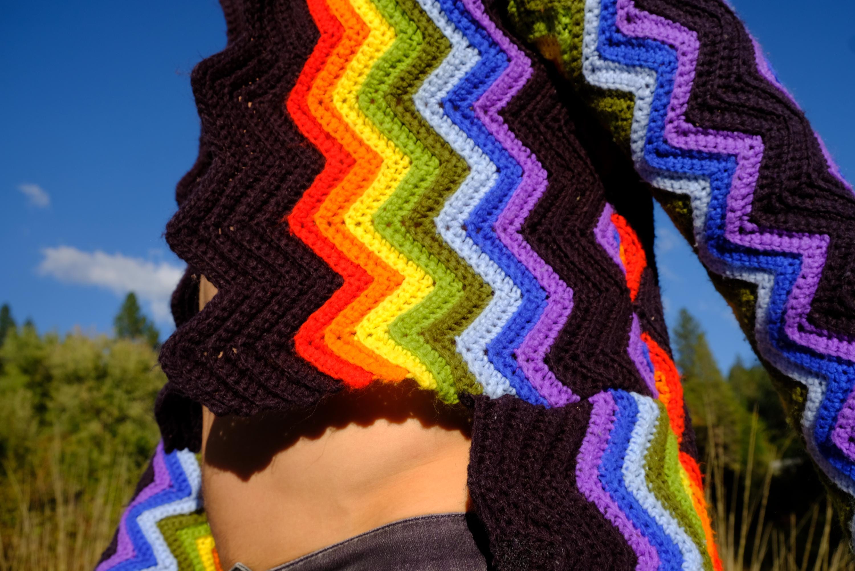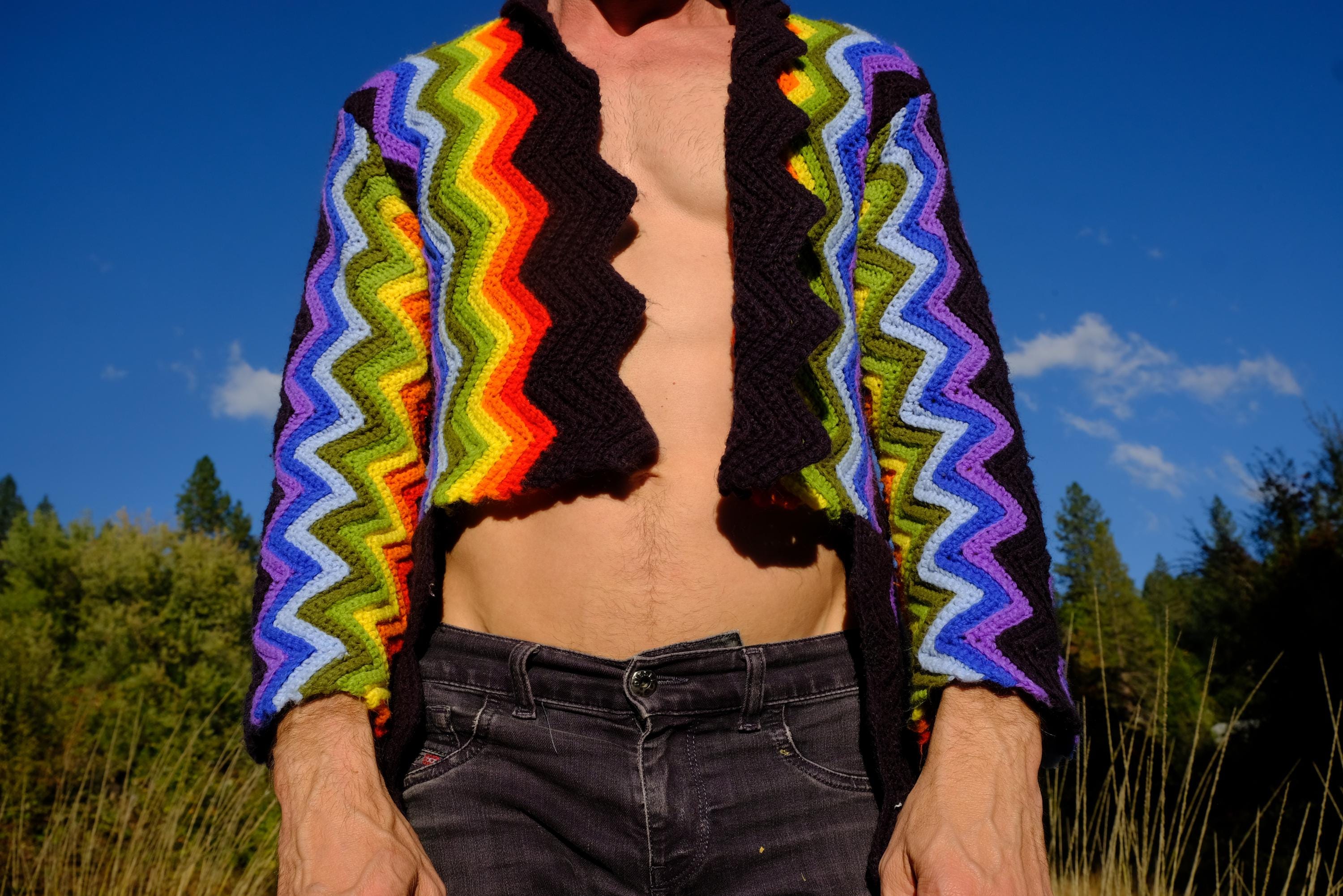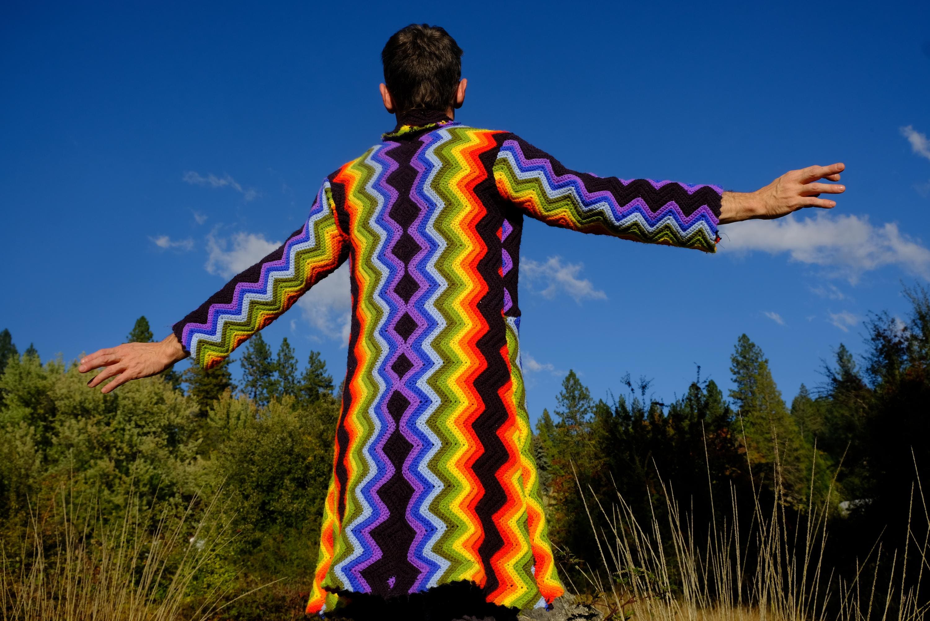 This is a crochet cutaway coat in rainbow stripes on black. Beautifully up-cycled from a vintage afghan blanket originally crocheted in a 100% acrylic yarn, and exquisitely tailored by yours truly, Lord von Schmitt.
