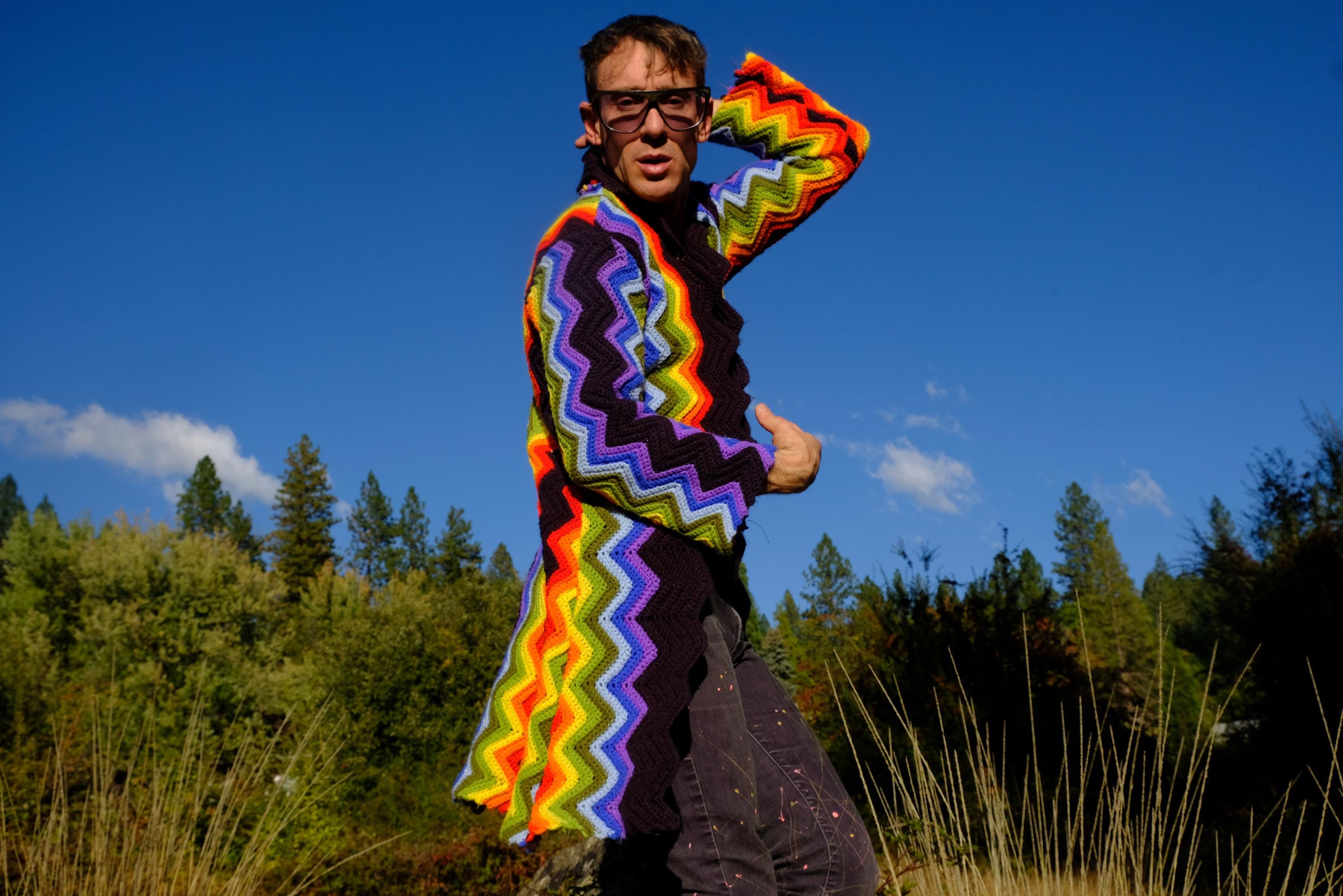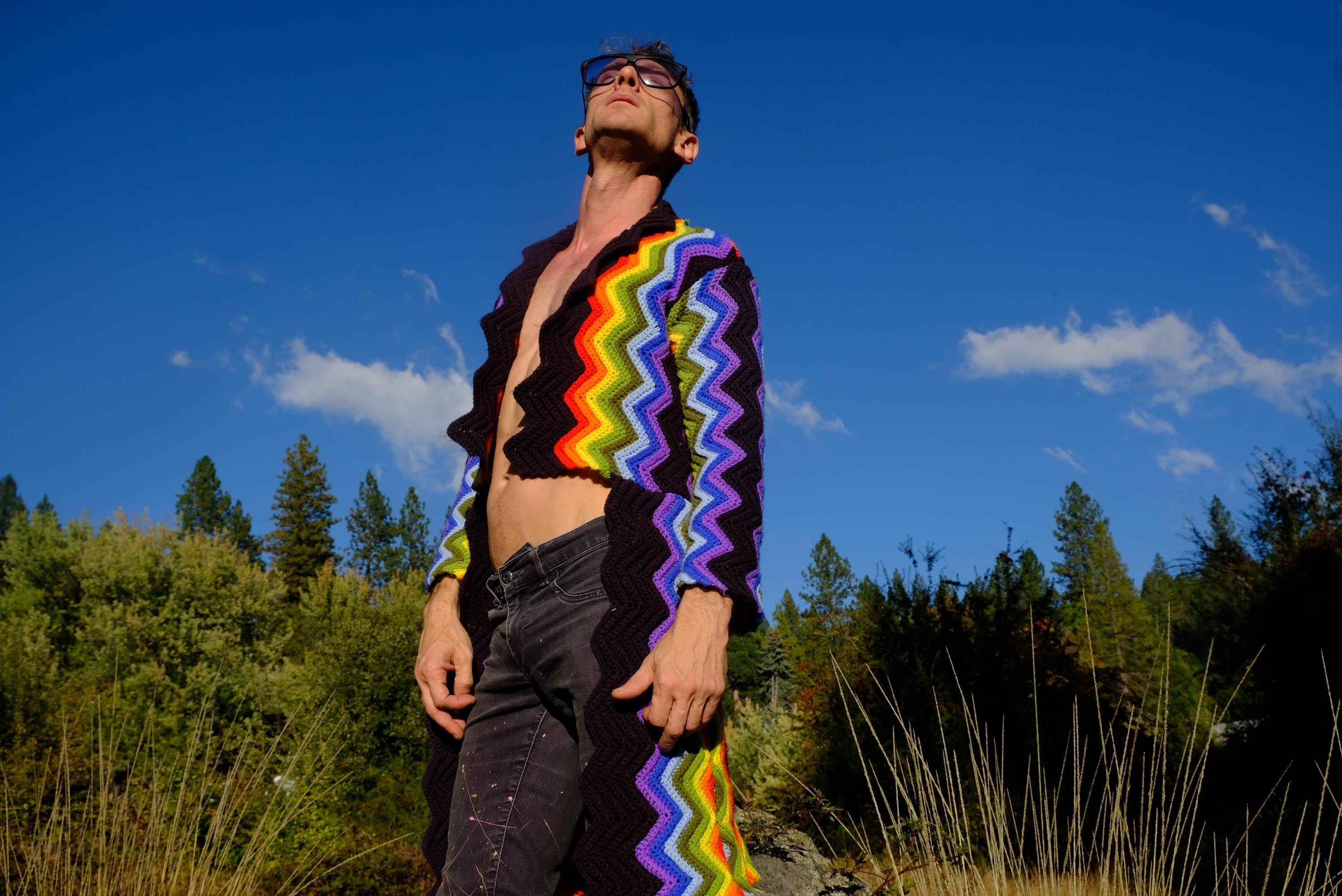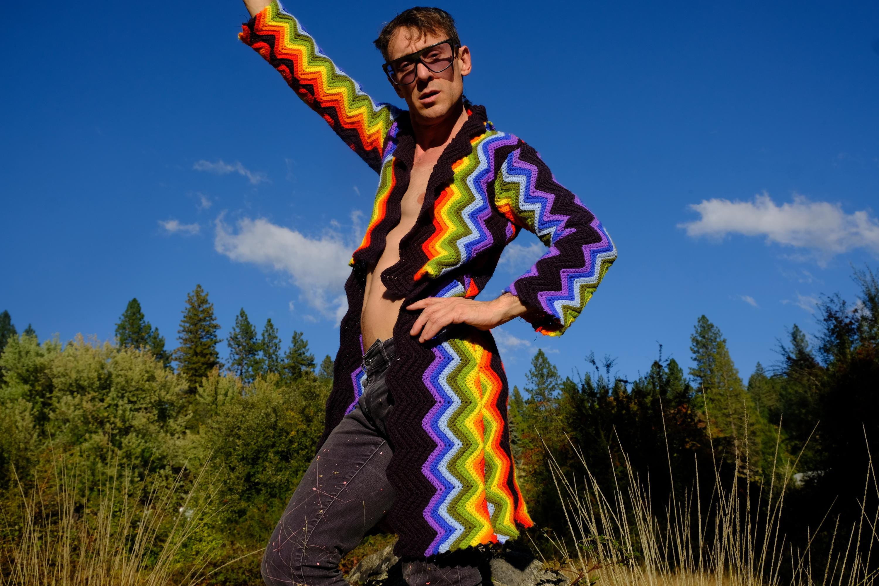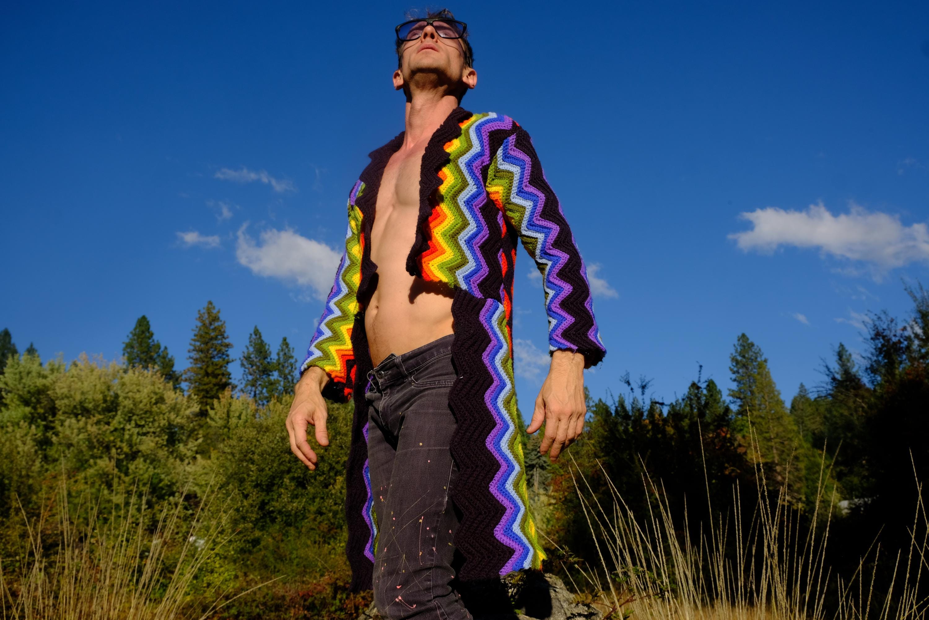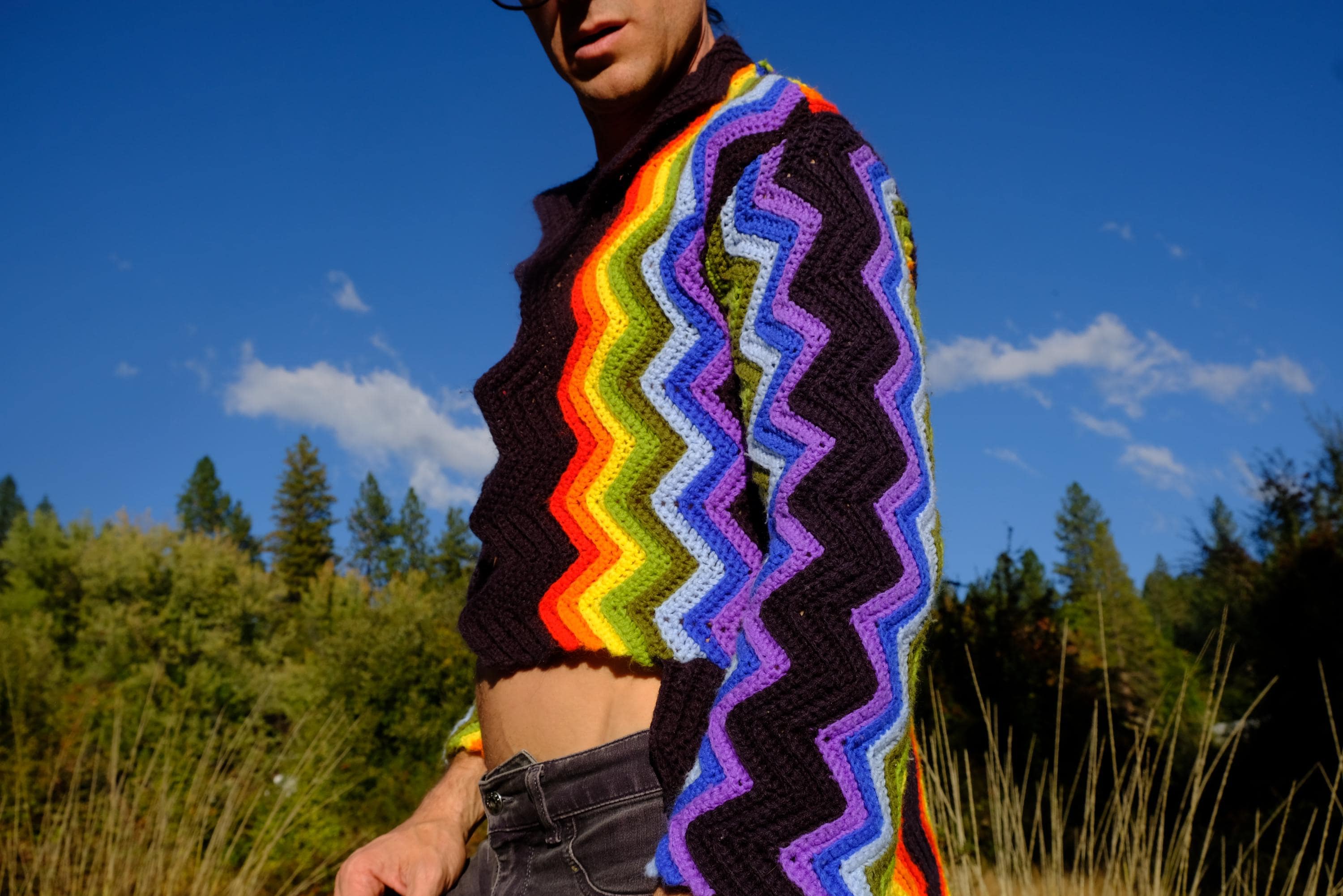 This is a crochet cutaway coat in rainbow stripes on black. Beautifully up-cycled from a vintage afghan blanket originally crocheted in a 100% acrylic yarn, and exquisitely tailored by yours truly, Lord von Schmitt.