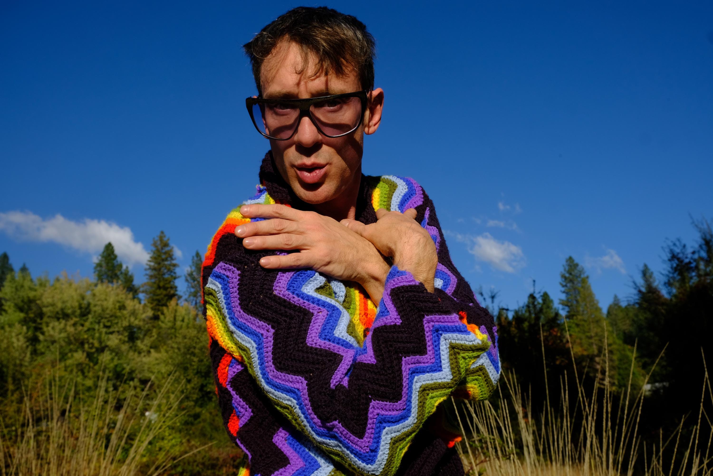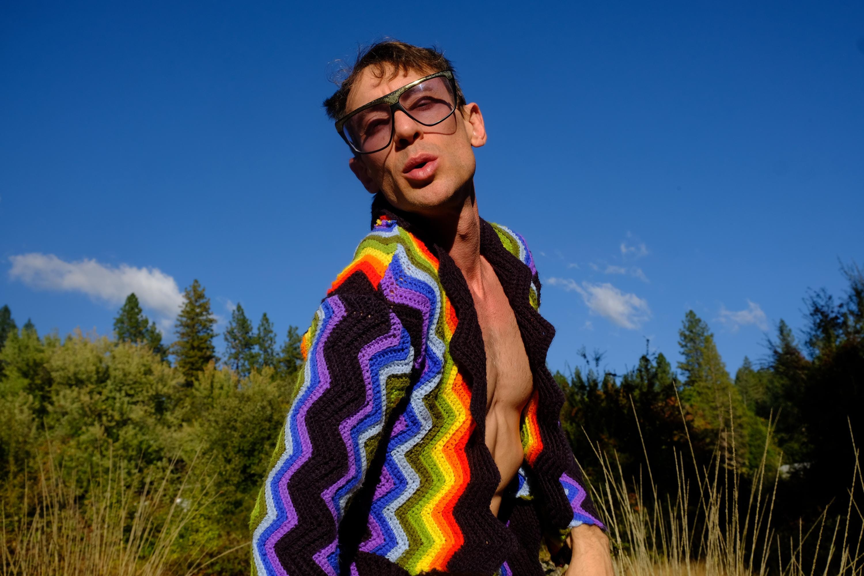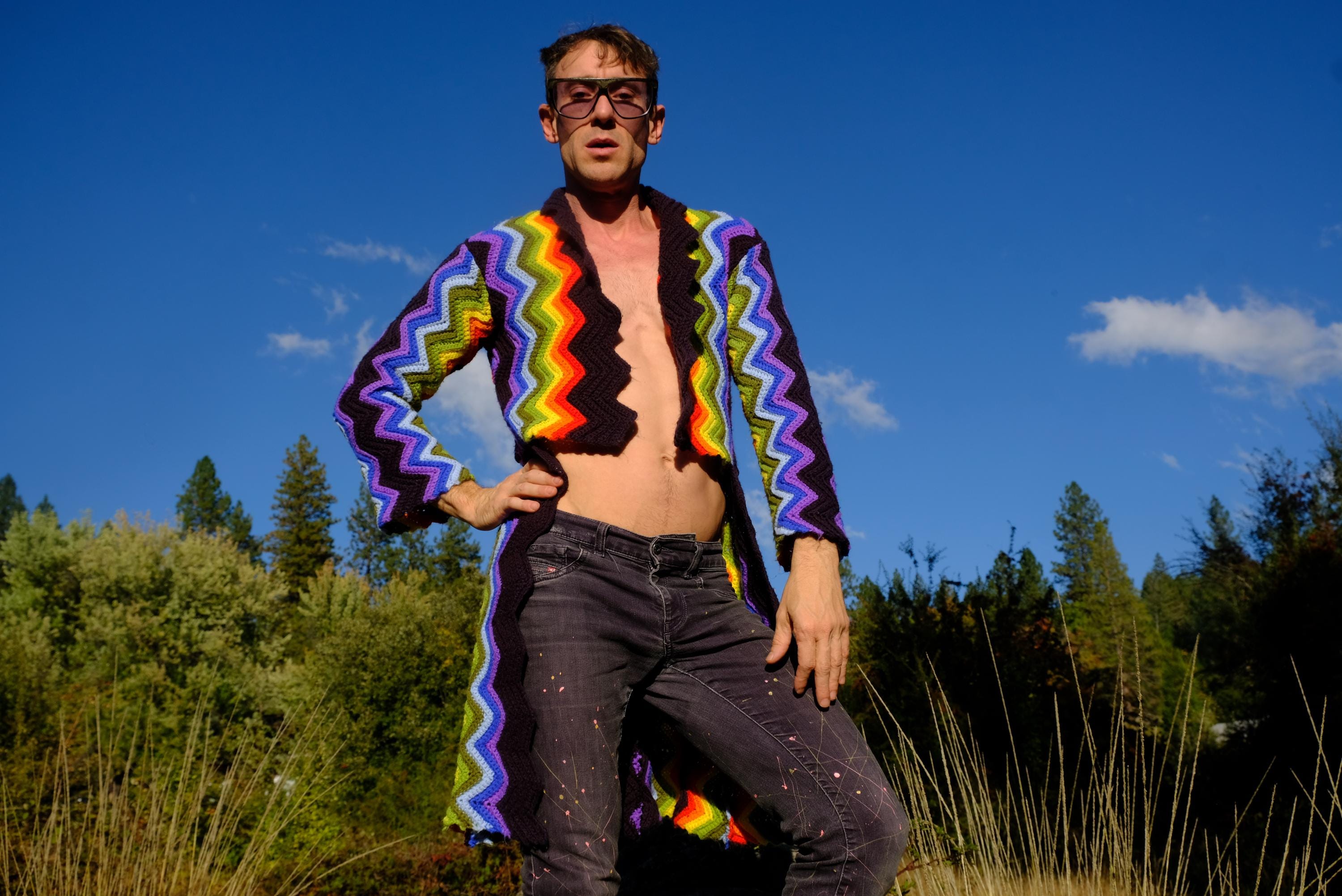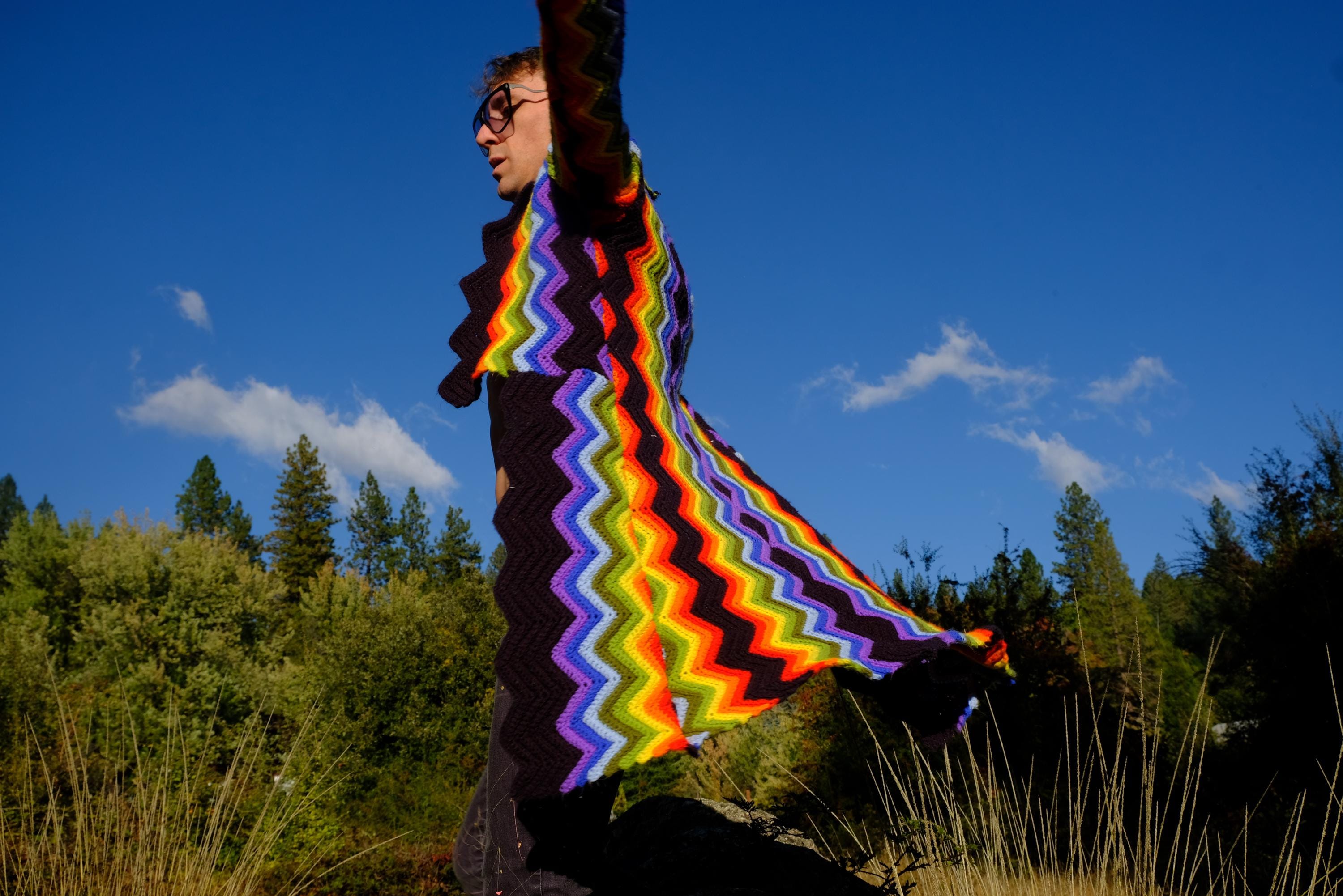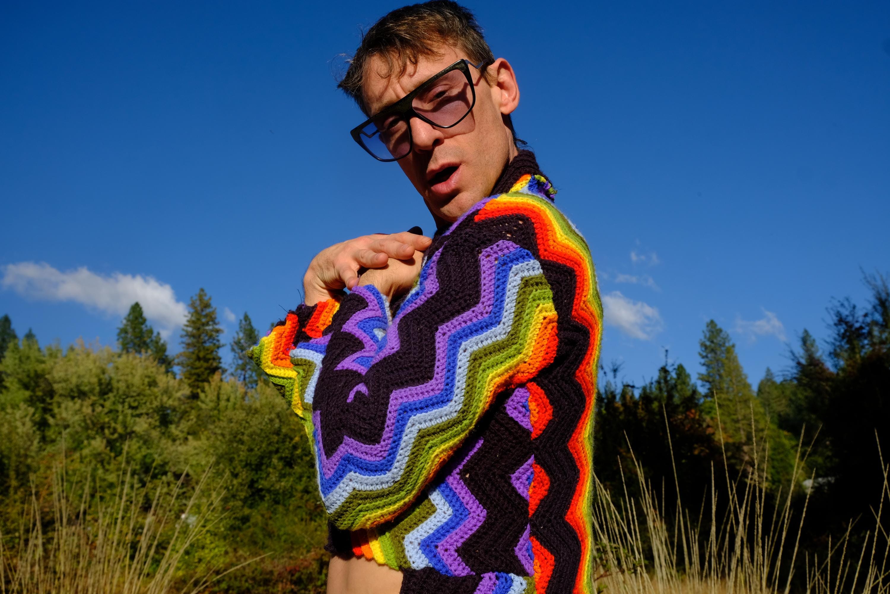 This is a crochet cutaway coat in rainbow stripes on black. Beautifully up-cycled from a vintage afghan blanket originally crocheted in a 100% acrylic yarn, and exquisitely tailored by yours truly, Lord von Schmitt.
