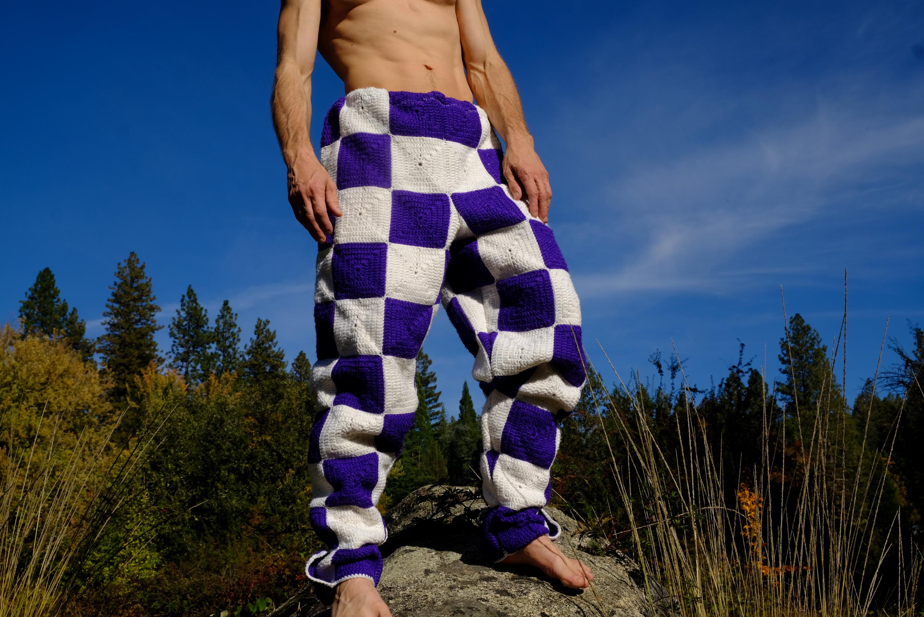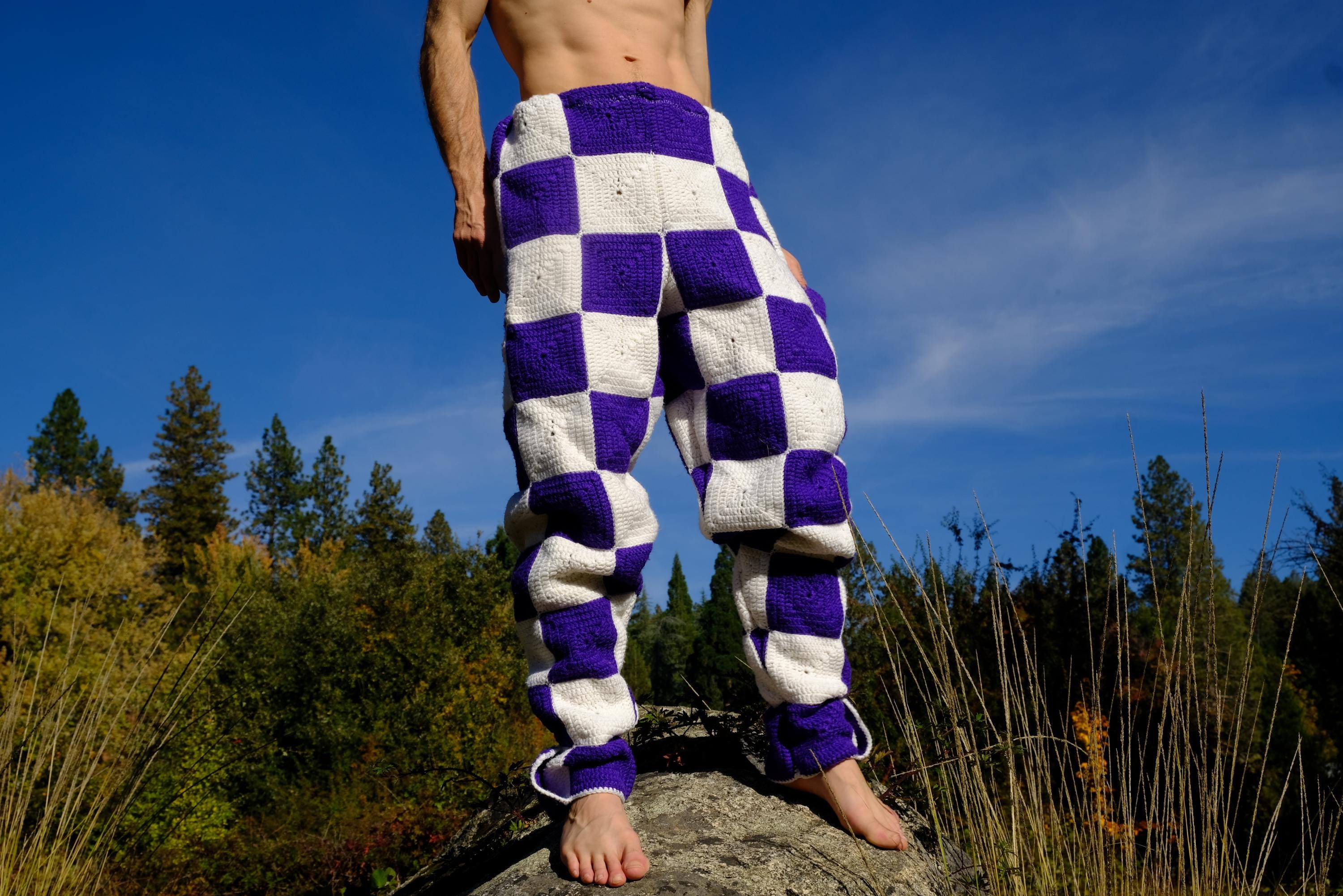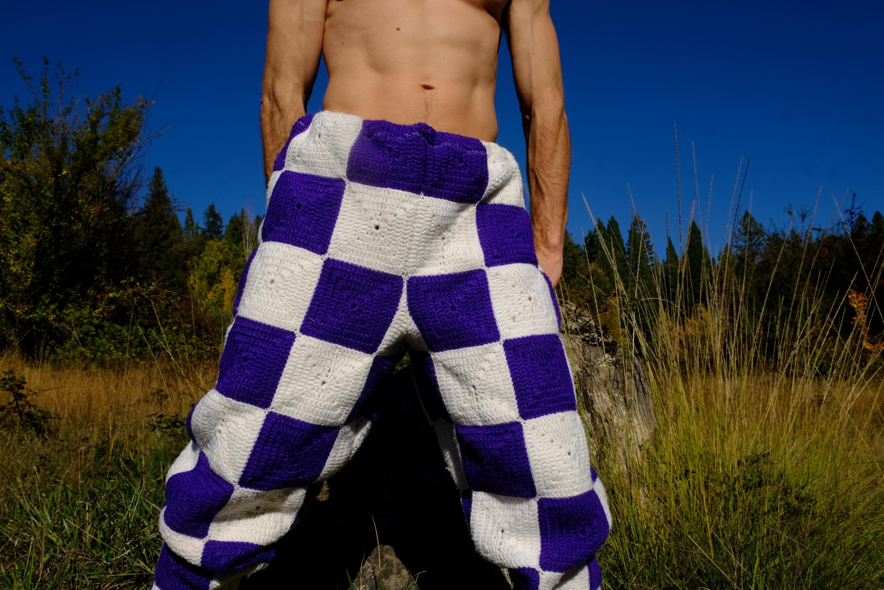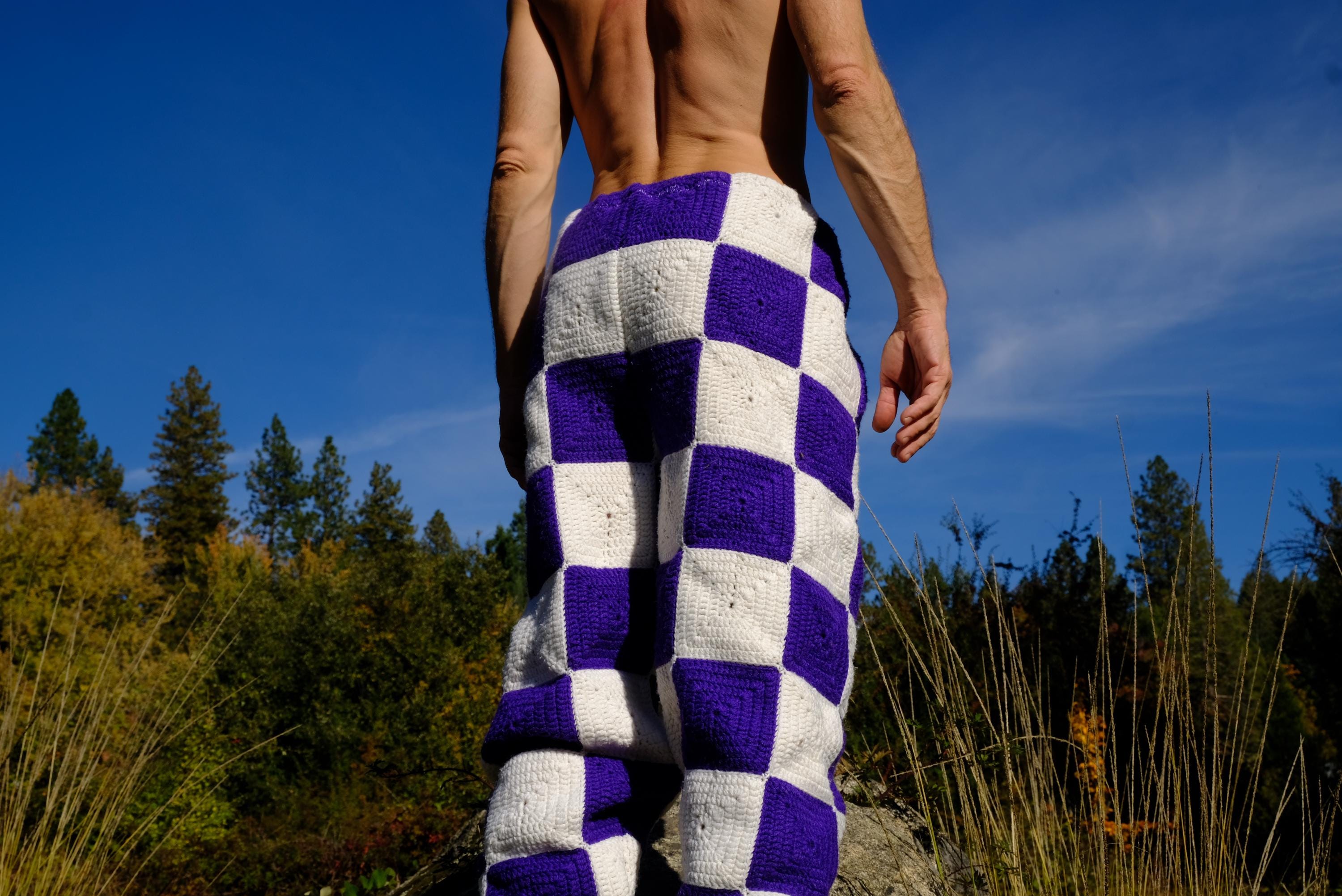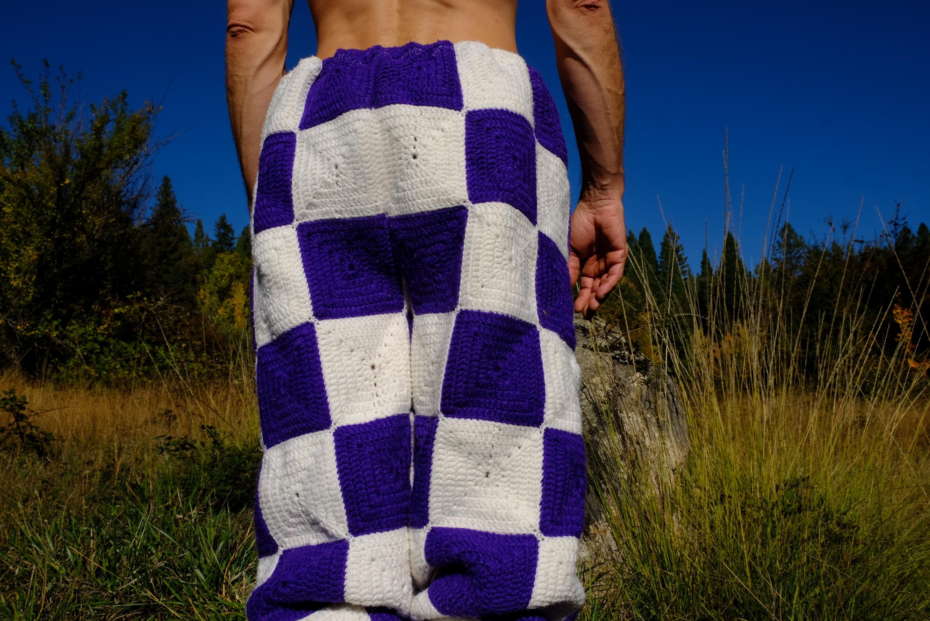 These are crochet pants with purple and white squares in a checkerboard pattern. Fashioned from a vintage afghan blanket crocheted in 100% acrylic yarn.