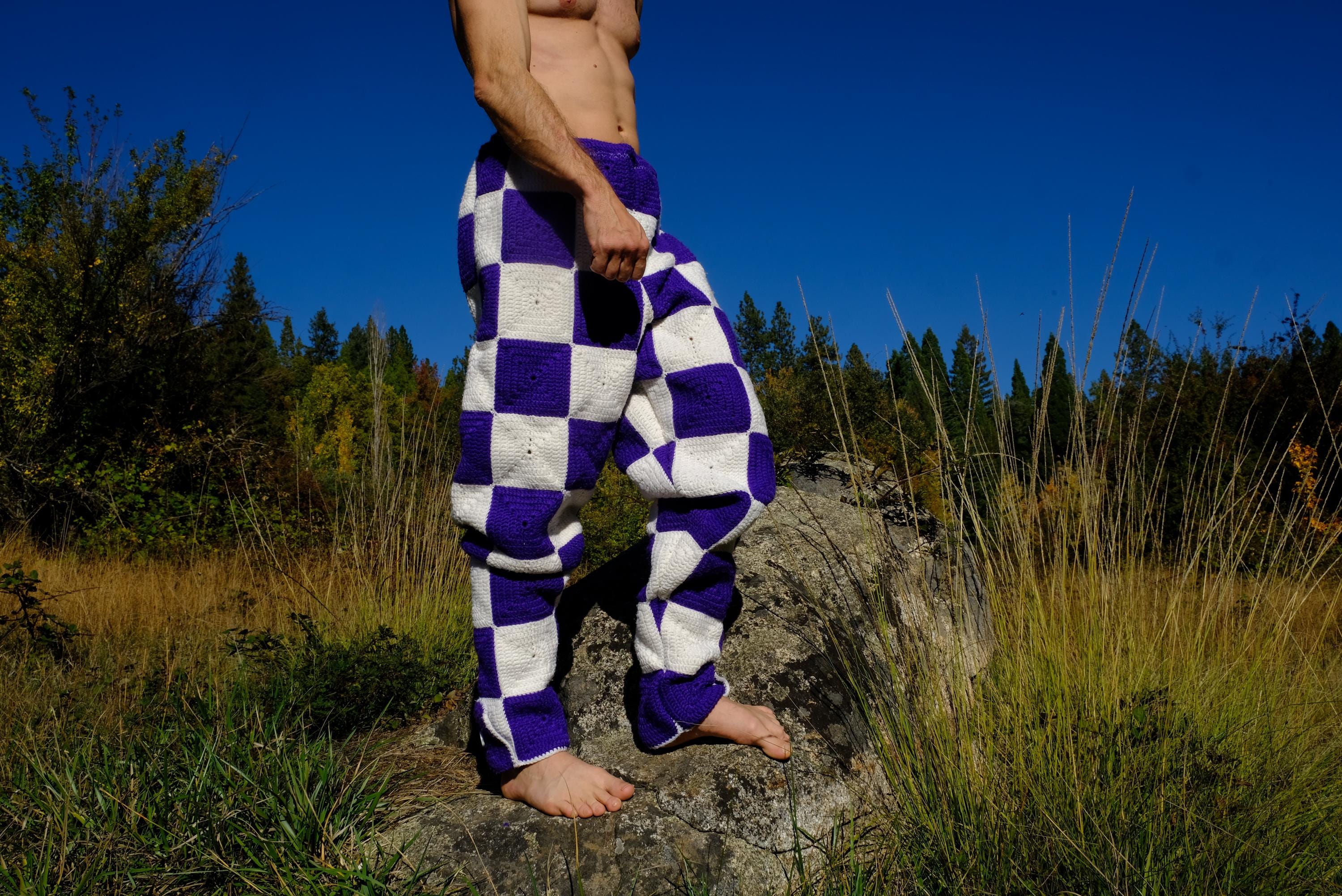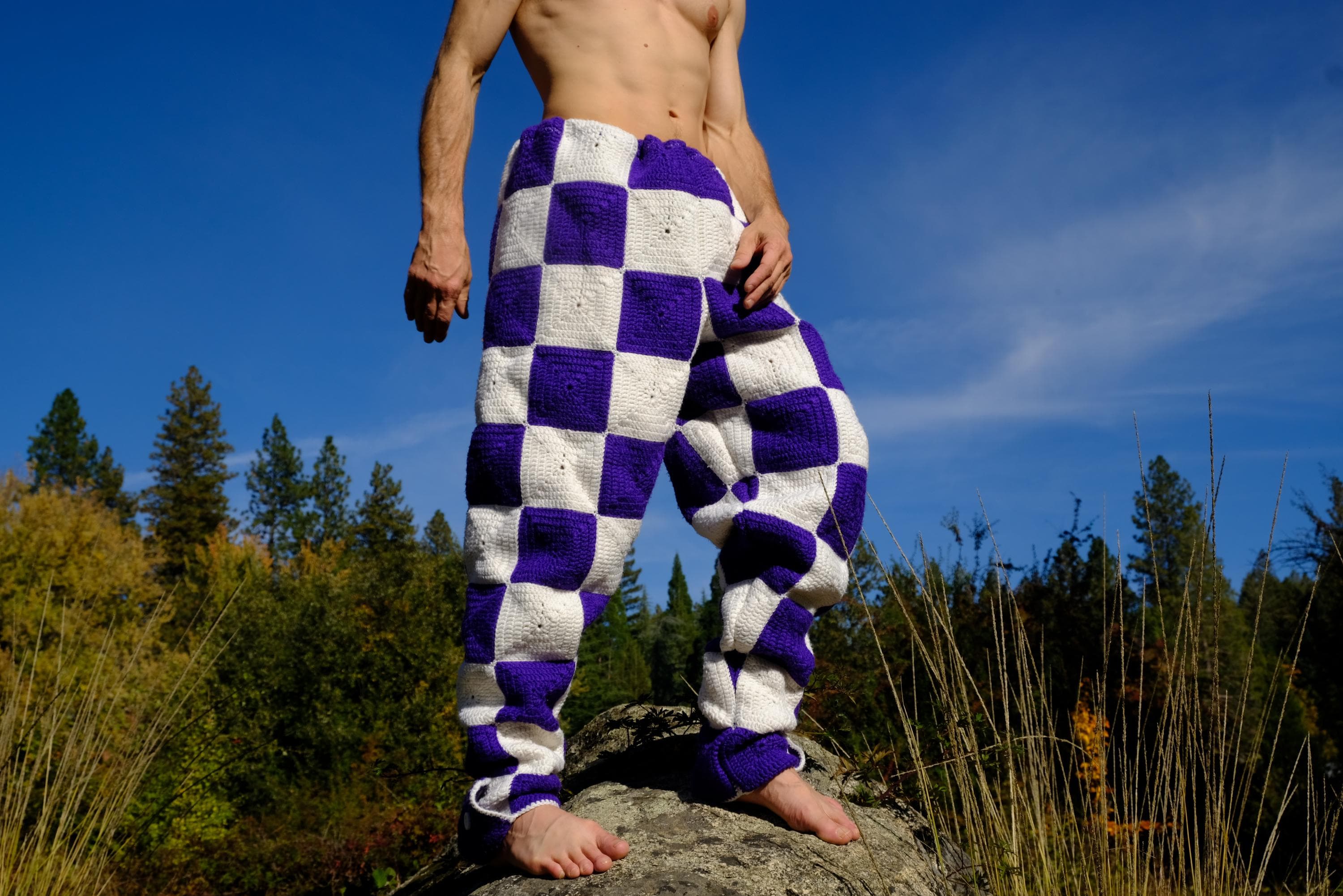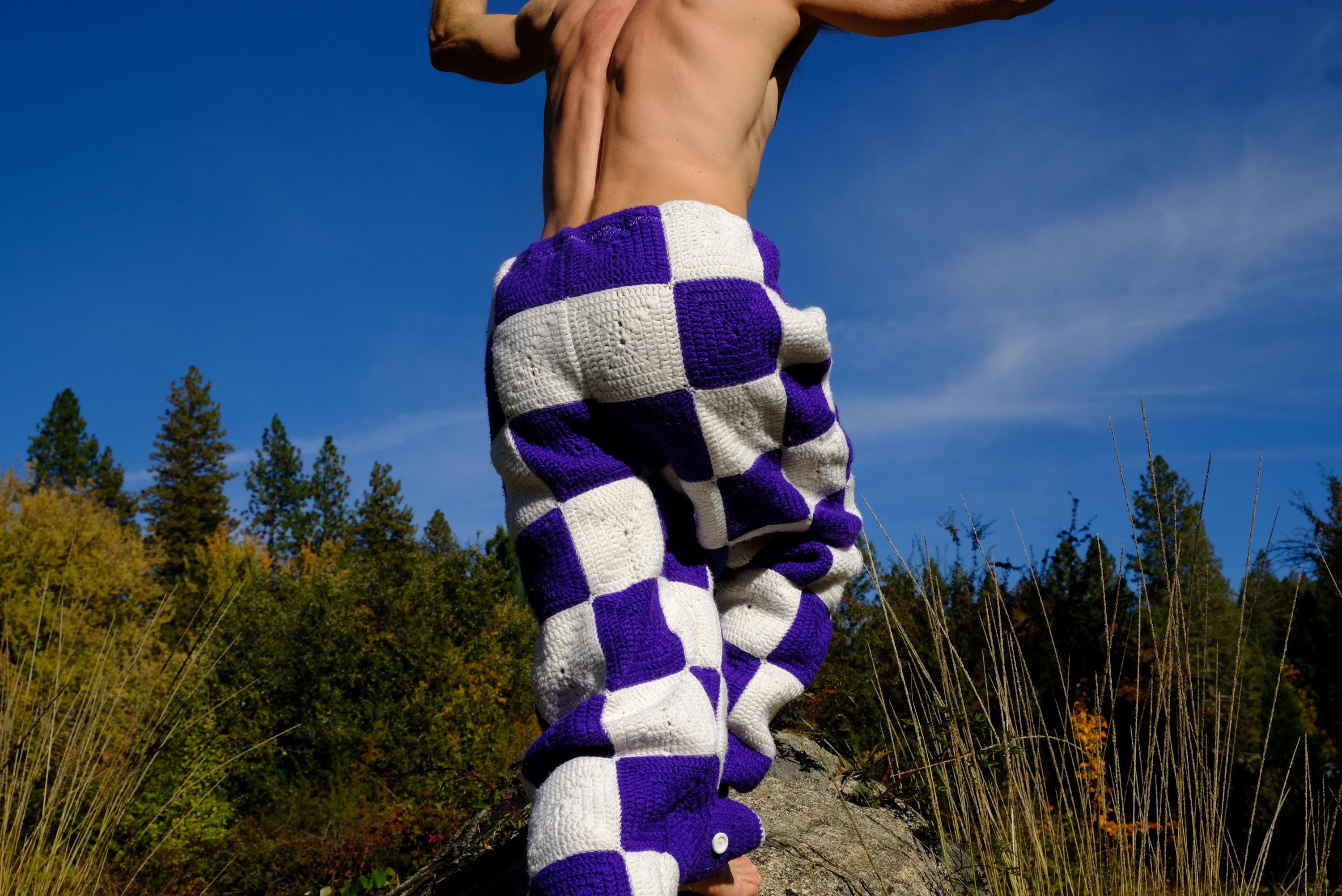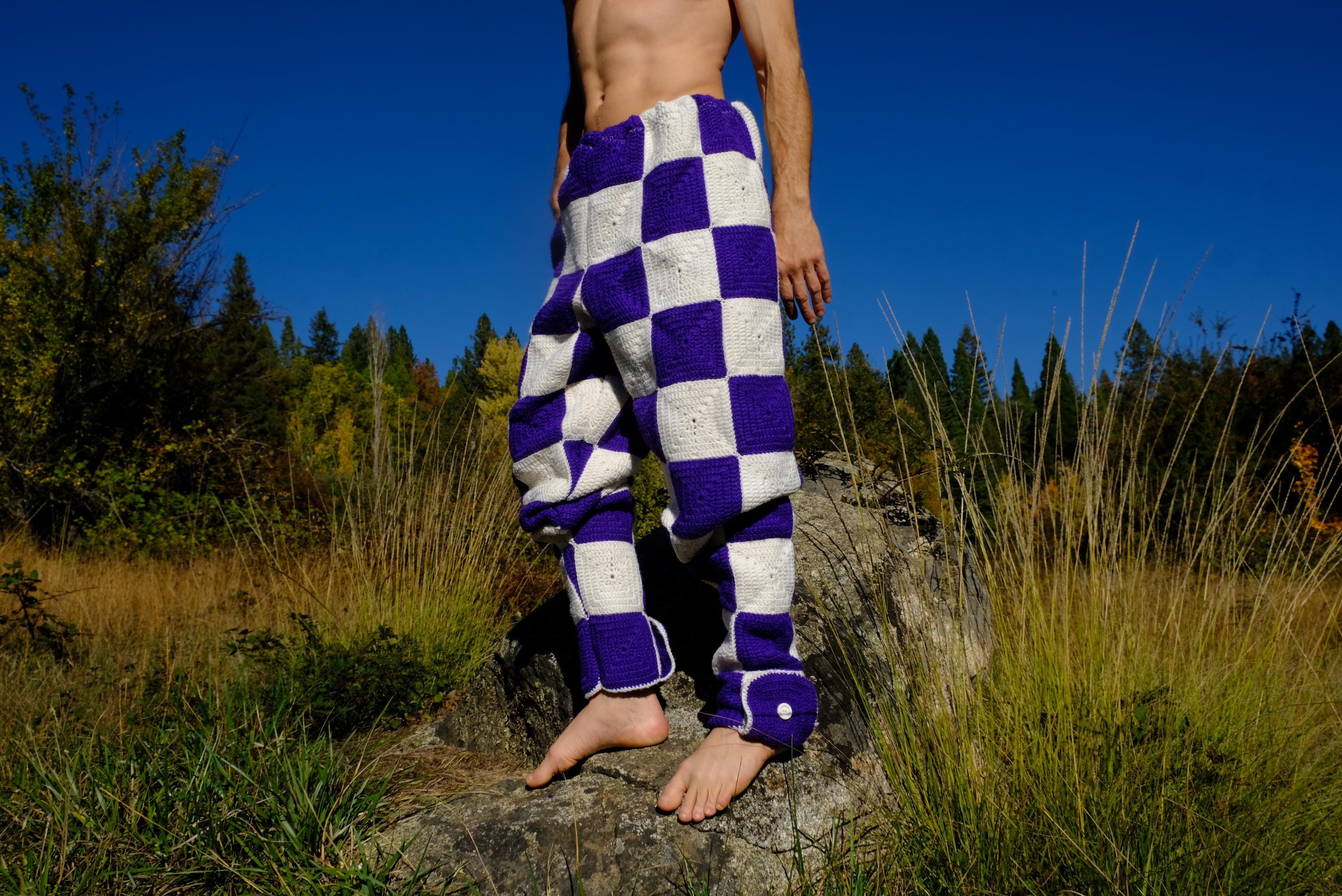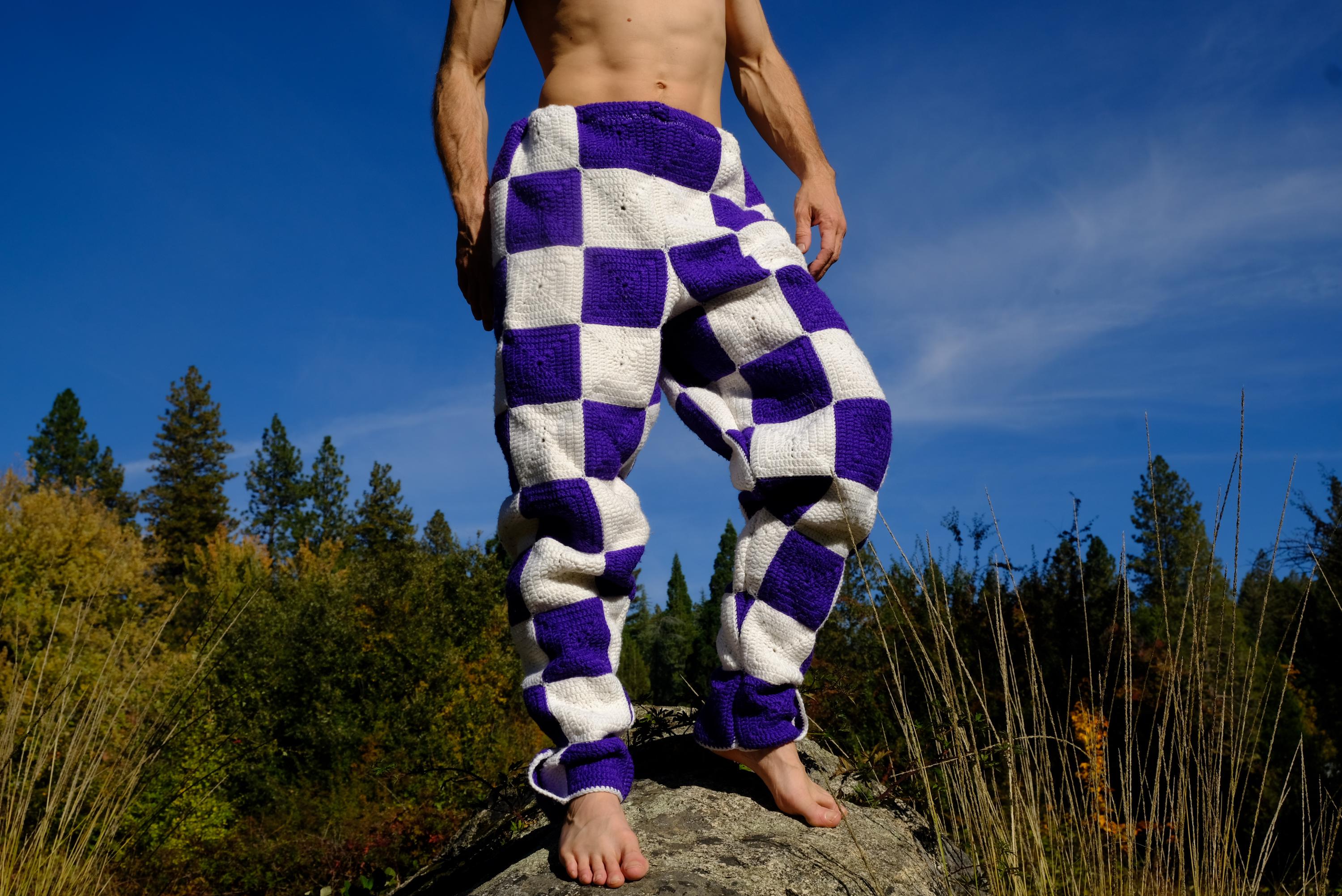 These are crochet pants with purple and white squares in a checkerboard pattern. Fashioned from a vintage afghan blanket crocheted in 100% acrylic yarn.