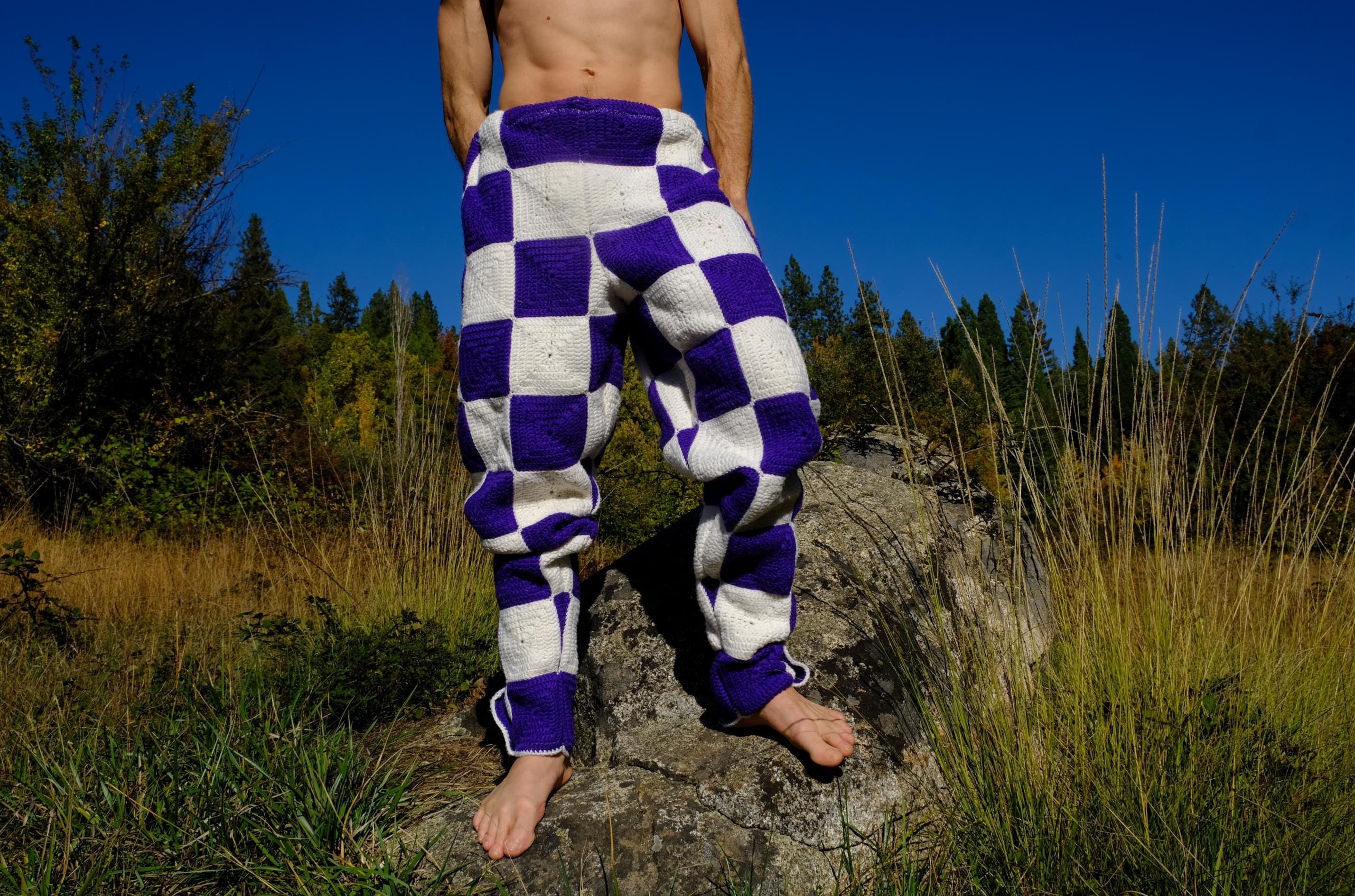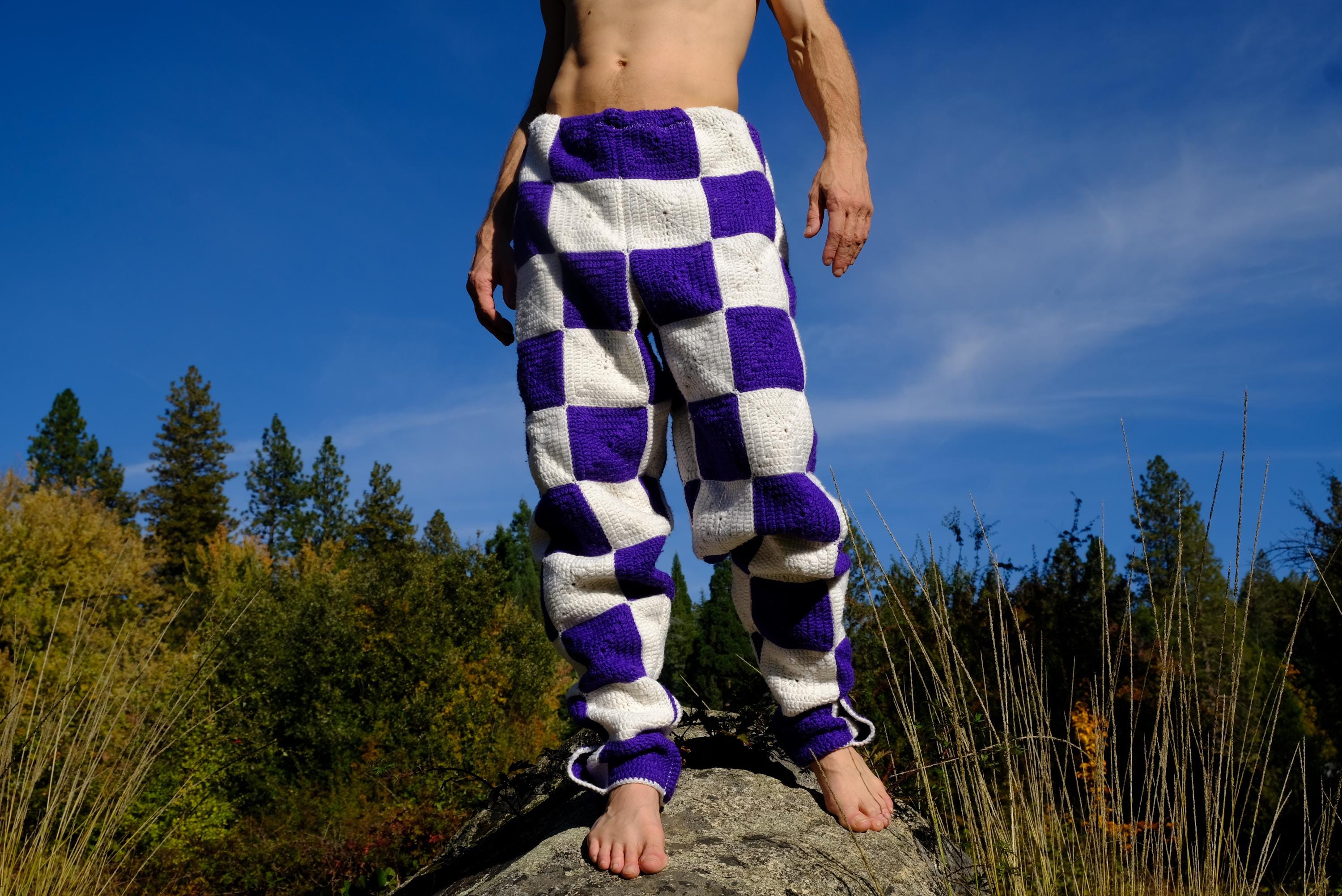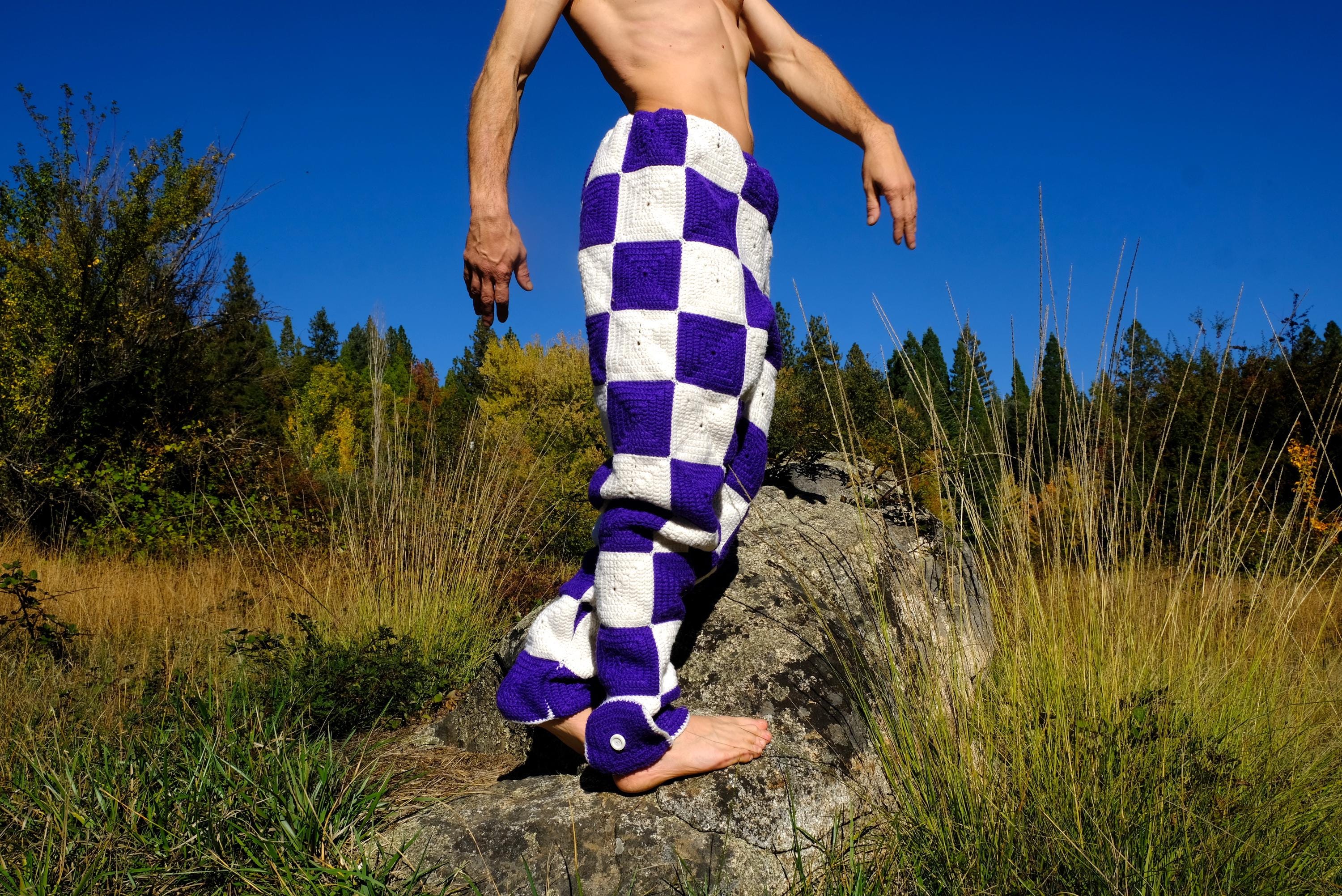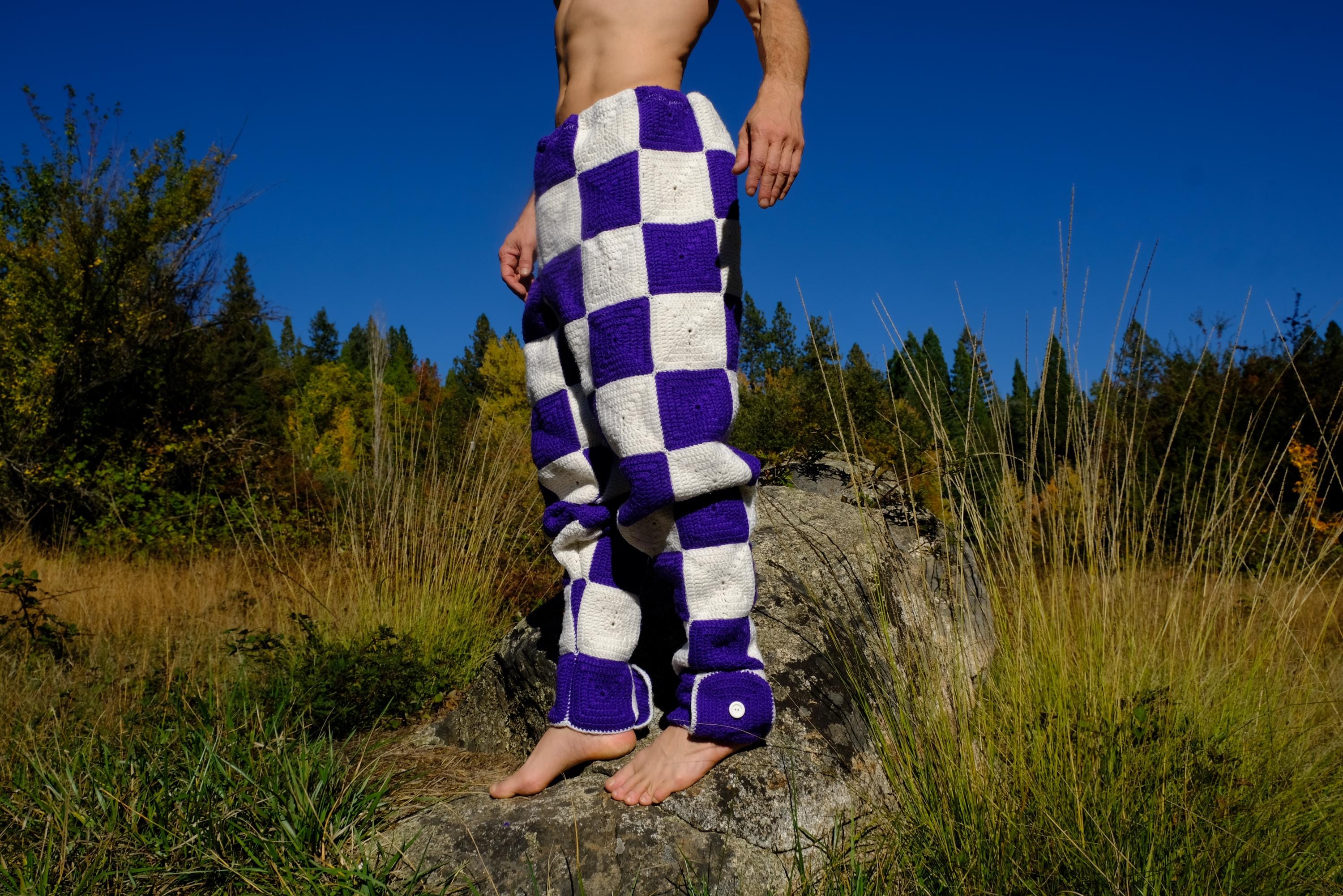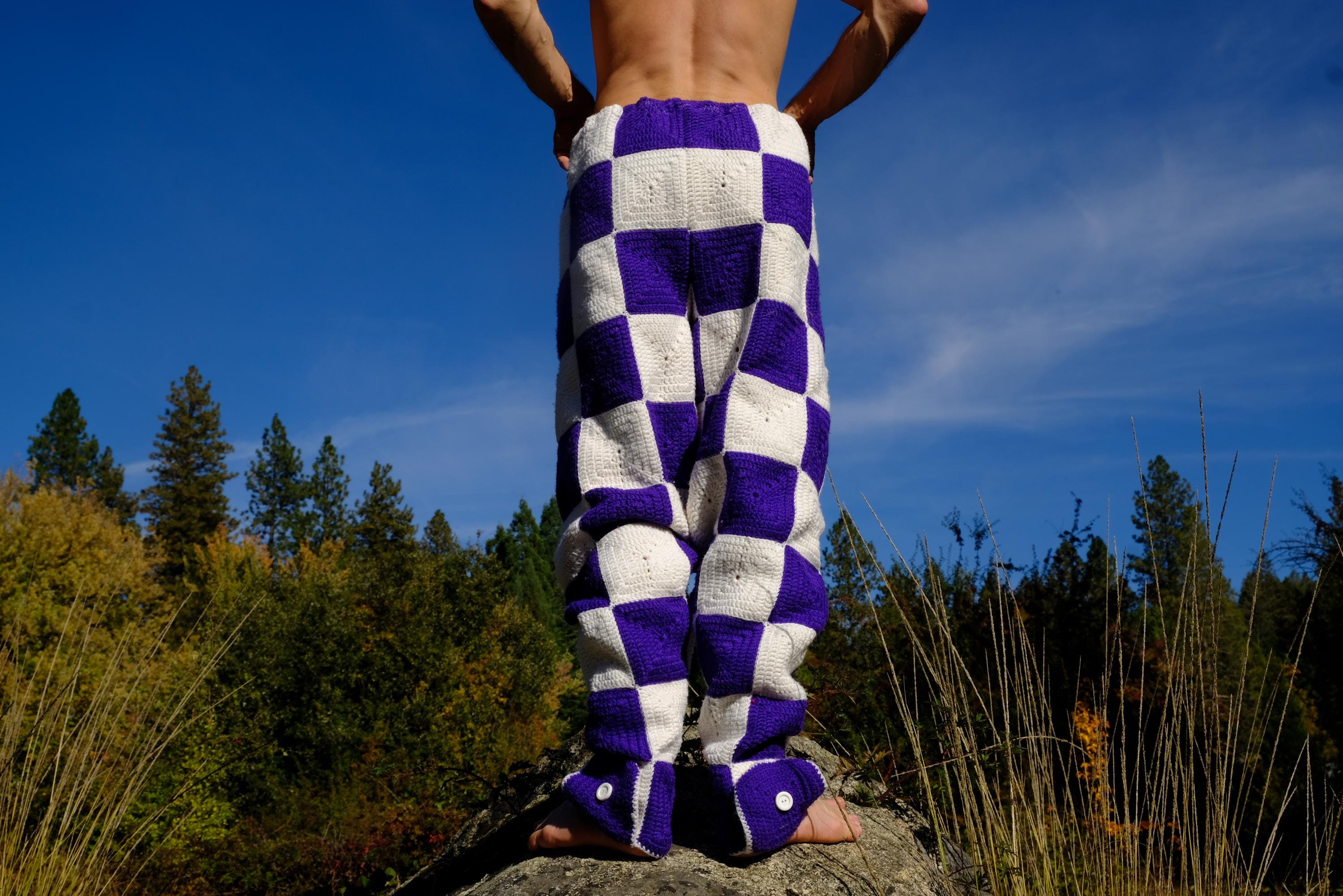 These are crochet pants with purple and white squares in a checkerboard pattern. Fashioned from a vintage afghan blanket crocheted in 100% acrylic yarn.